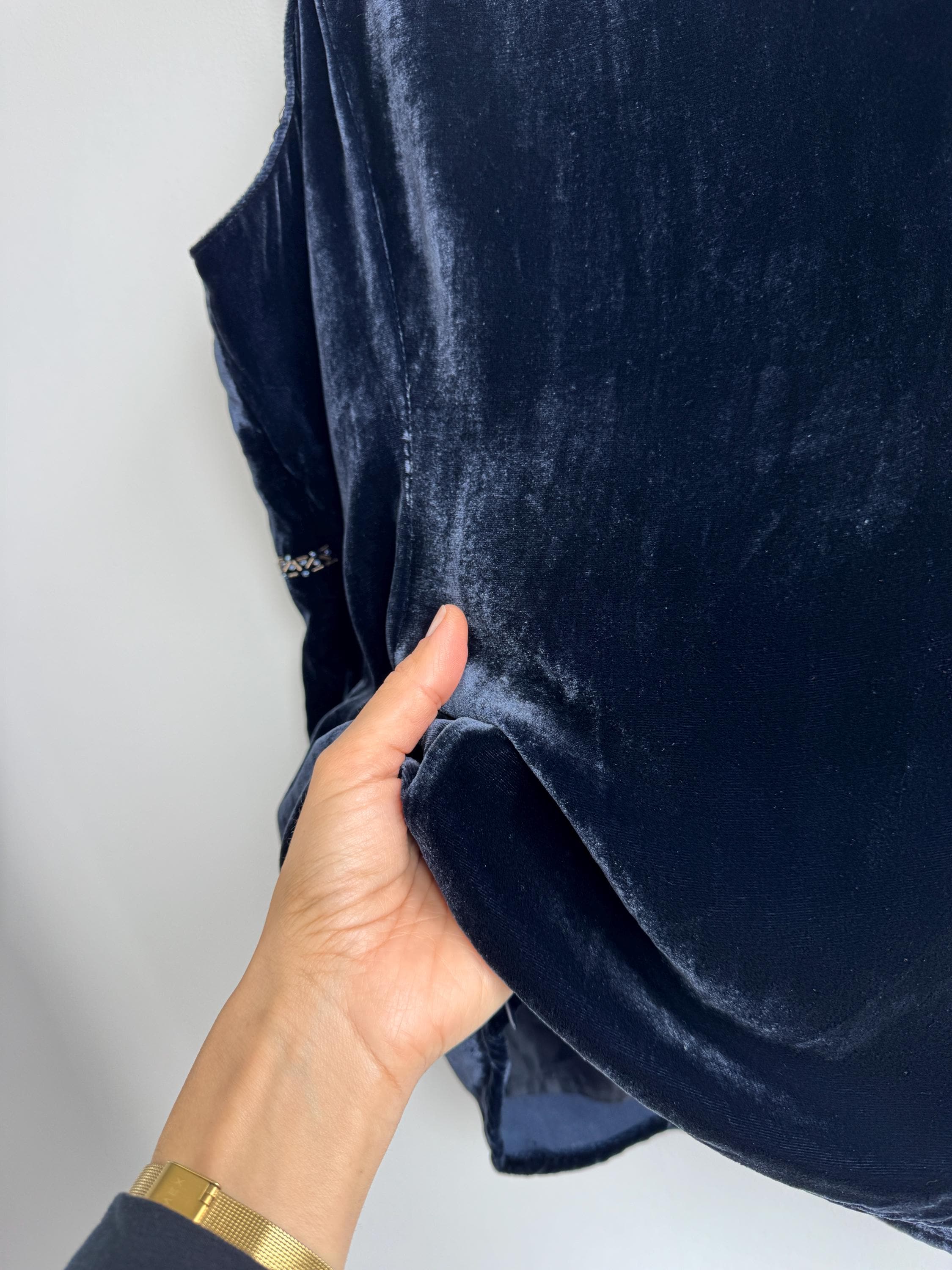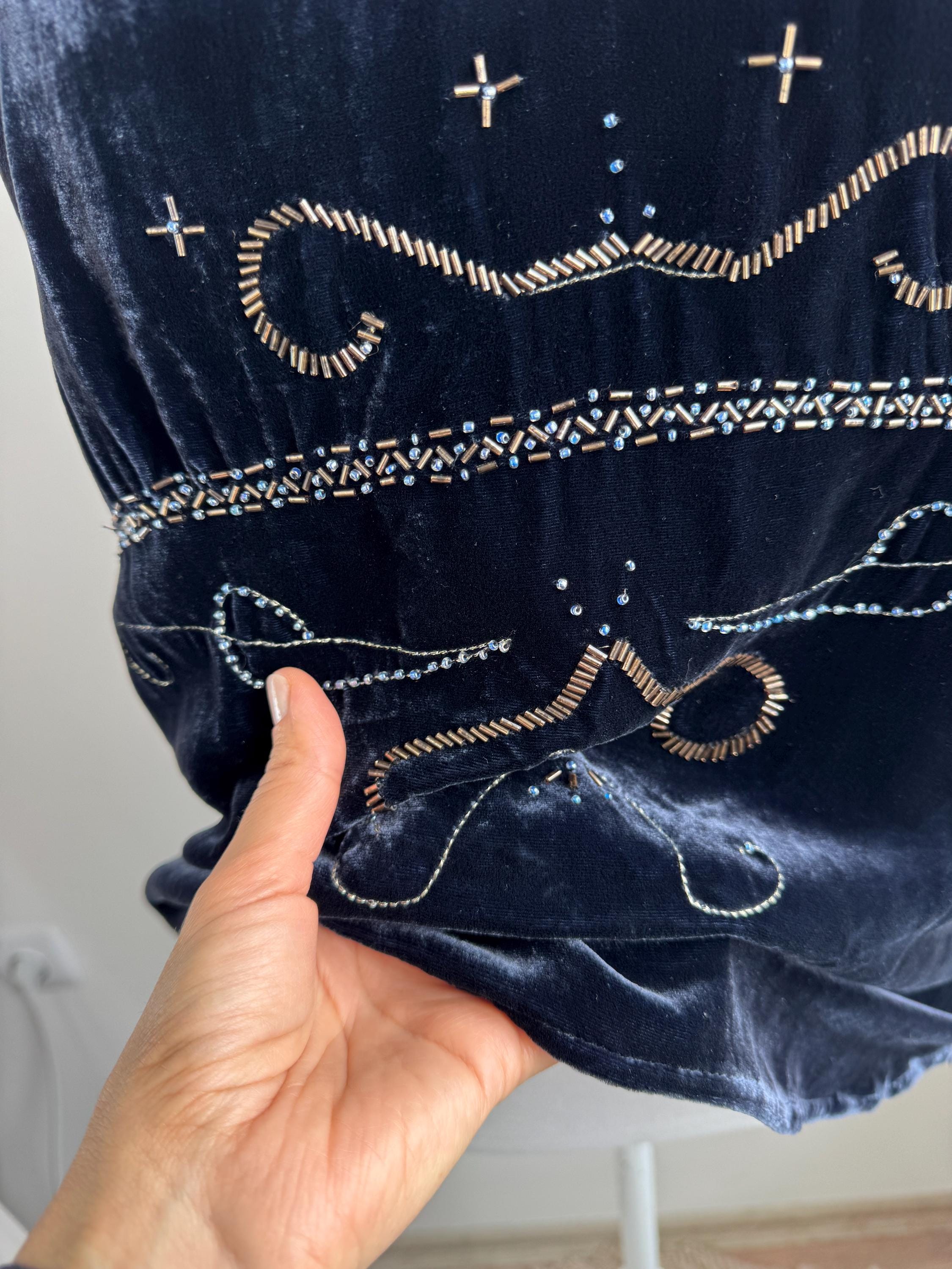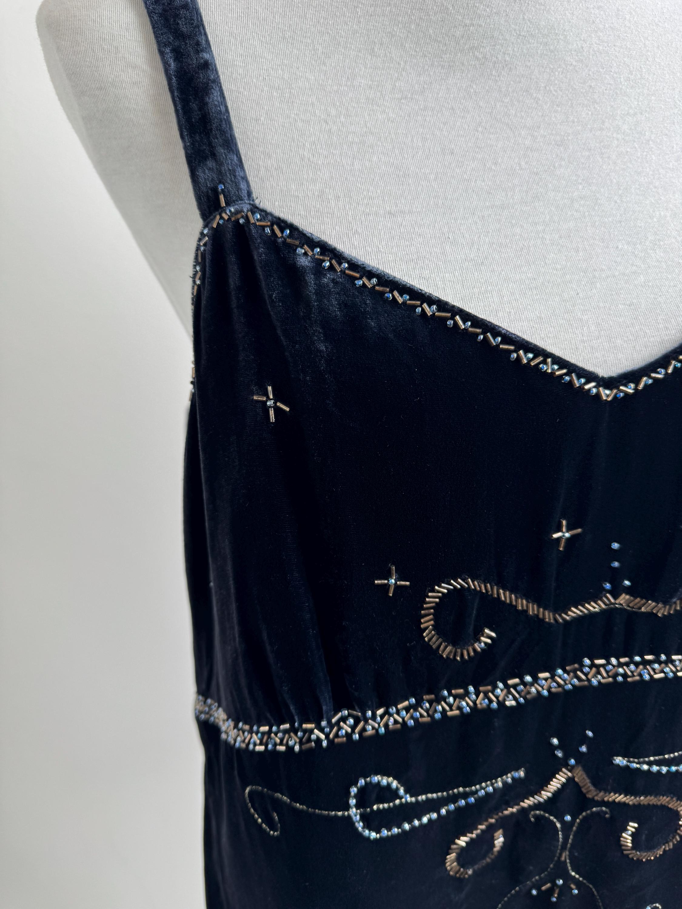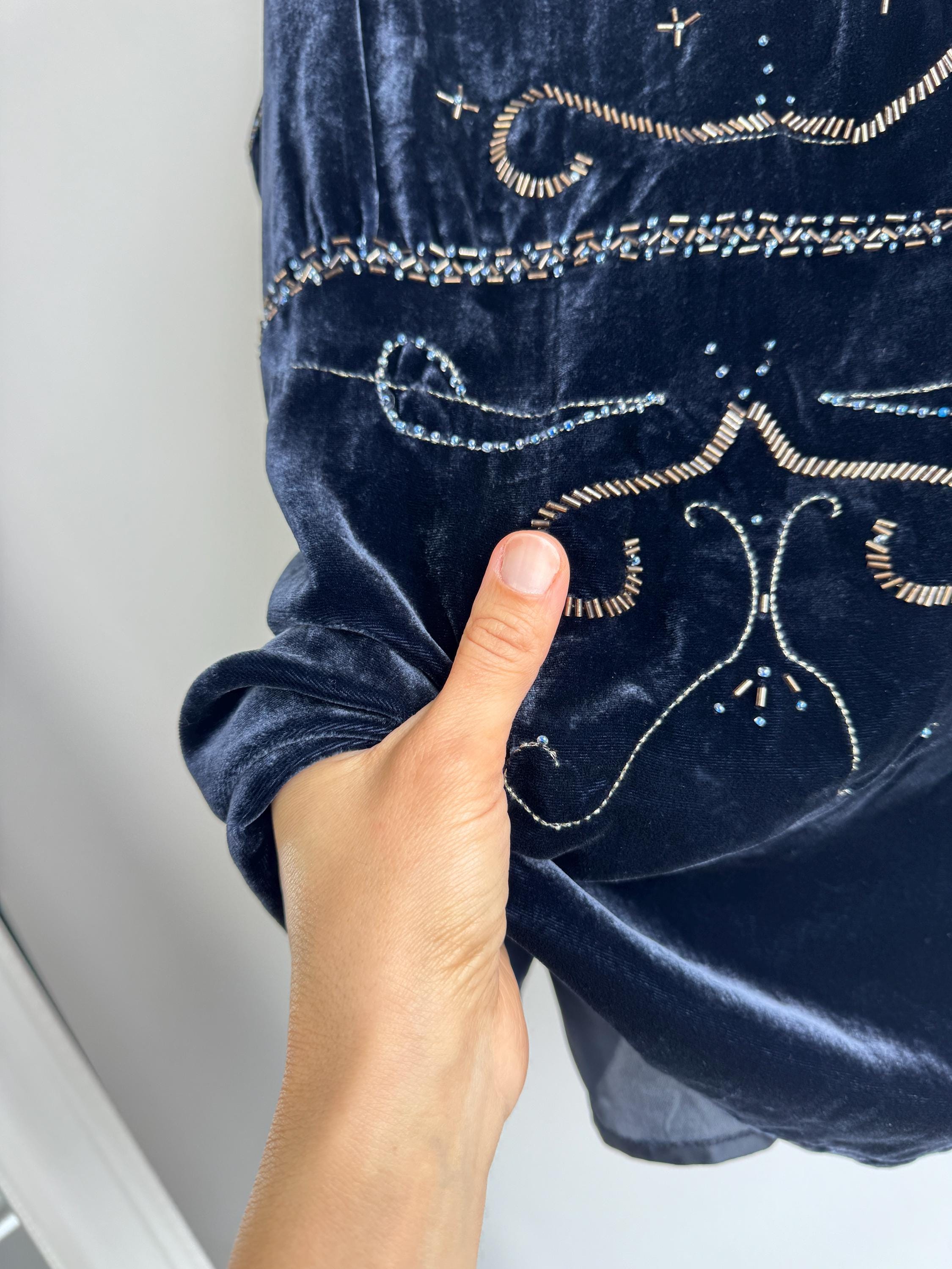 This is a vintage Y2K navy blue silk velvet beaded camisole from Jensen Women in size EU 44 which fits like XL. The deep midnight navy velvet is soft and lustrous, made from an 82% viscose and 18% silk blend that gives it a genuinely luxurious feel against the skin. But it's the embellishment that really sets it apart. Across the front, an intricate pattern of beads, tiny blue crystal beads, and cross-shaped metallic studs creates swirling Art Nouveau-inspired motifs.