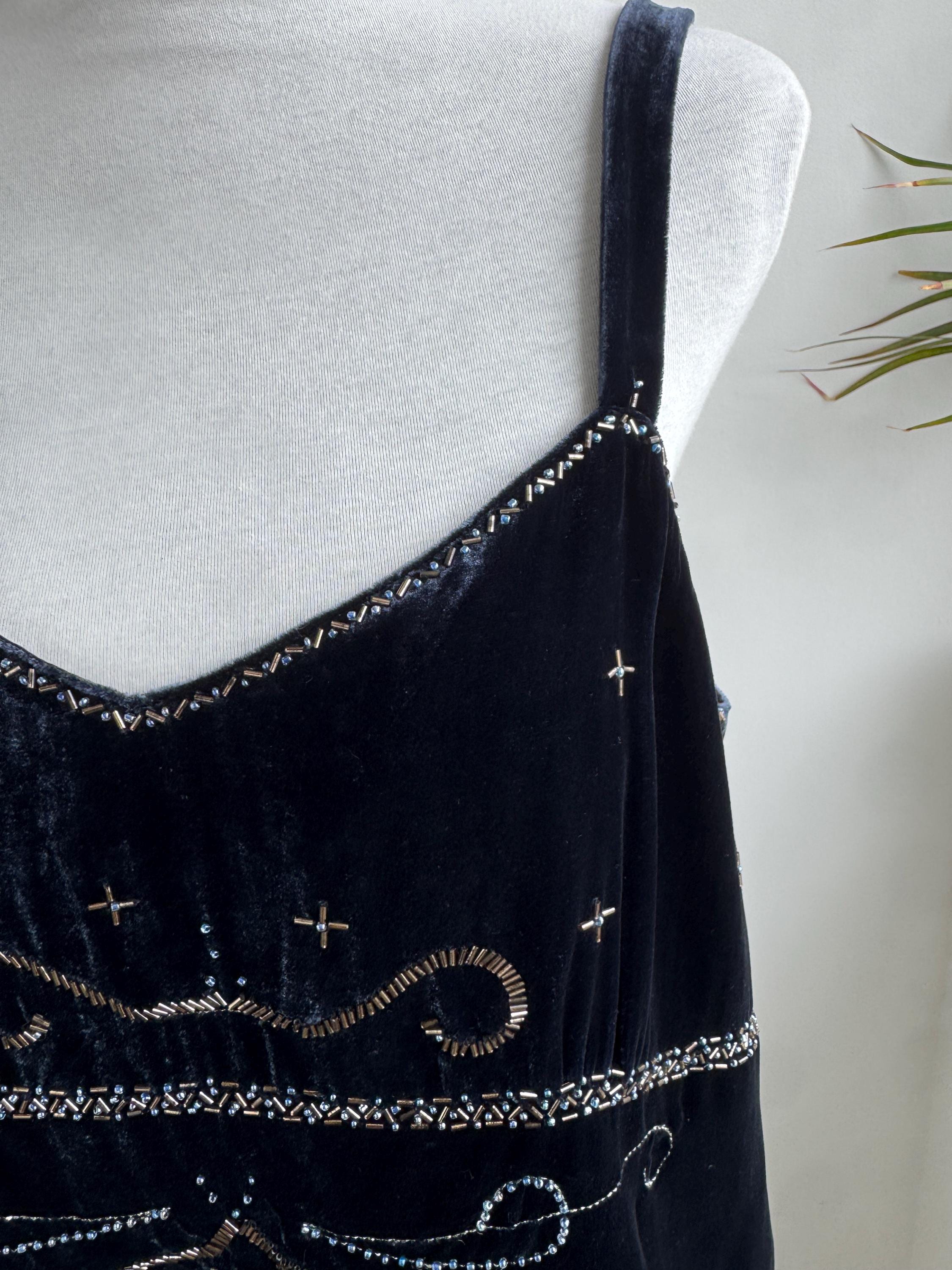 The silhouette of this silk velvet top is a classic wide-strap camisole with a sweetheart-inspired neckline and a gently flared hem. A horizontal beaded band across the waist divides the bodice into two decorative panels, each filled with its own elaborate scrollwork design. The top is fully lined in polyester satin for a comfortable, smooth finish against the body. A small zip closure sits at the side seam for easy on and off.