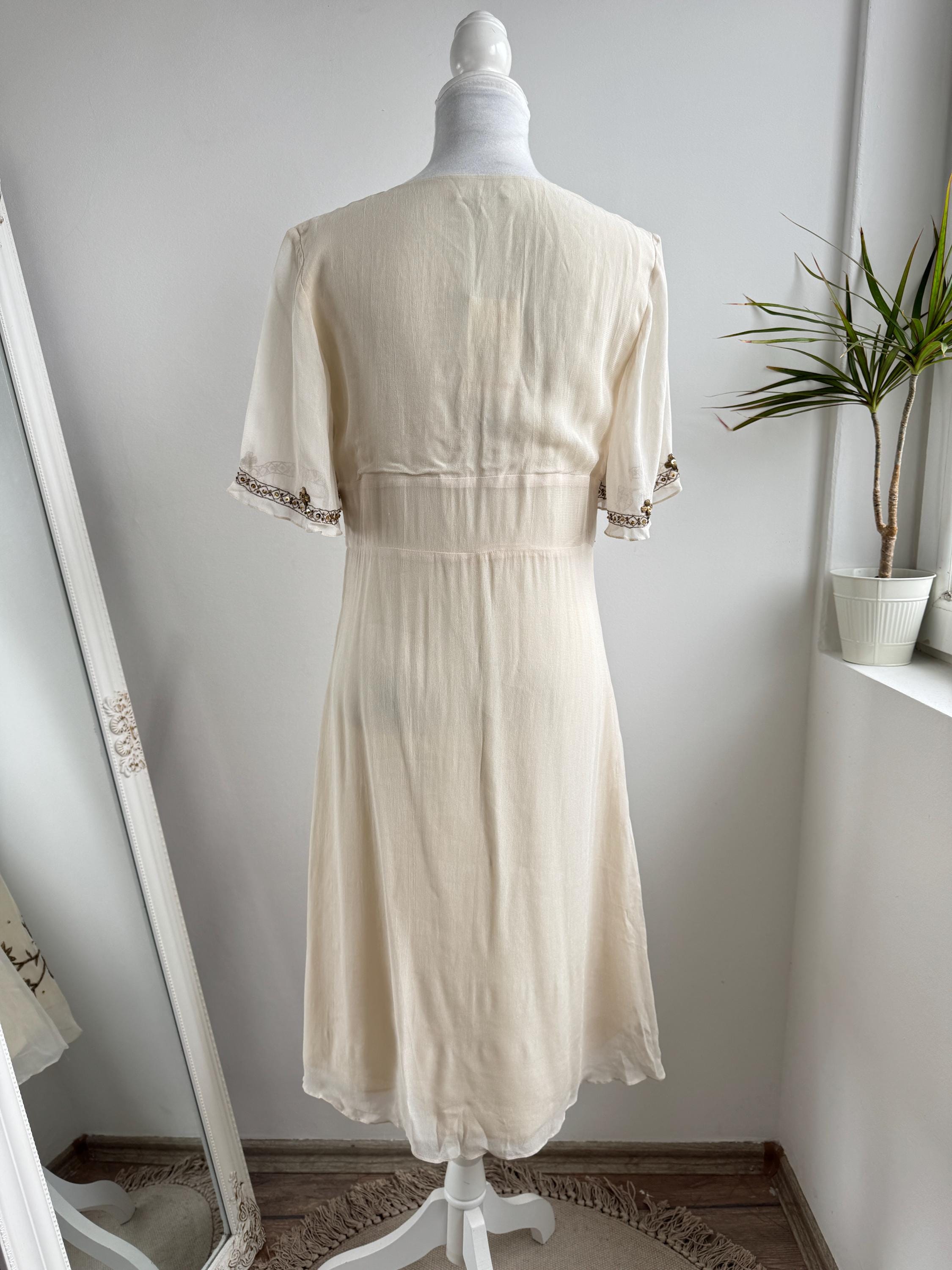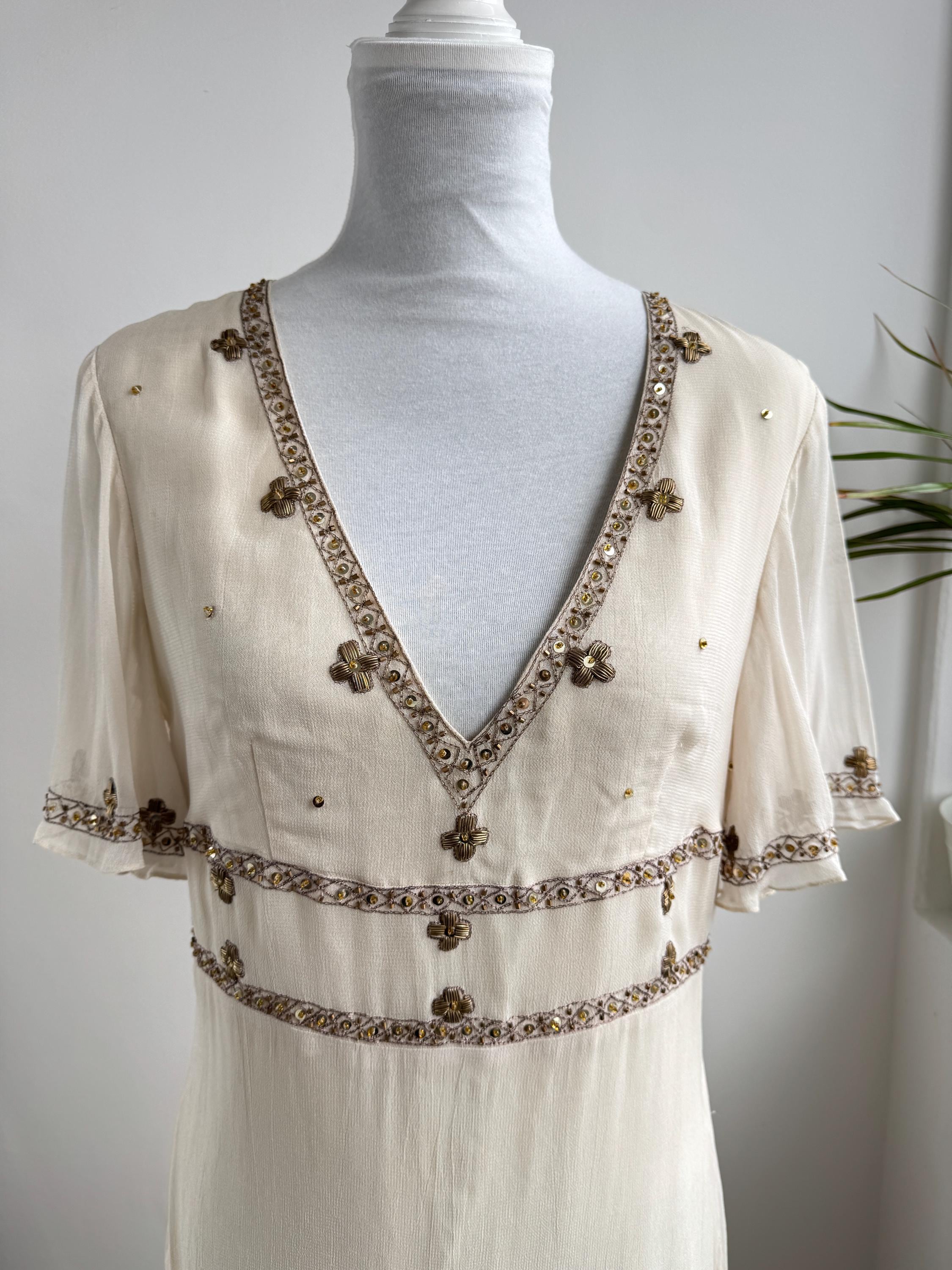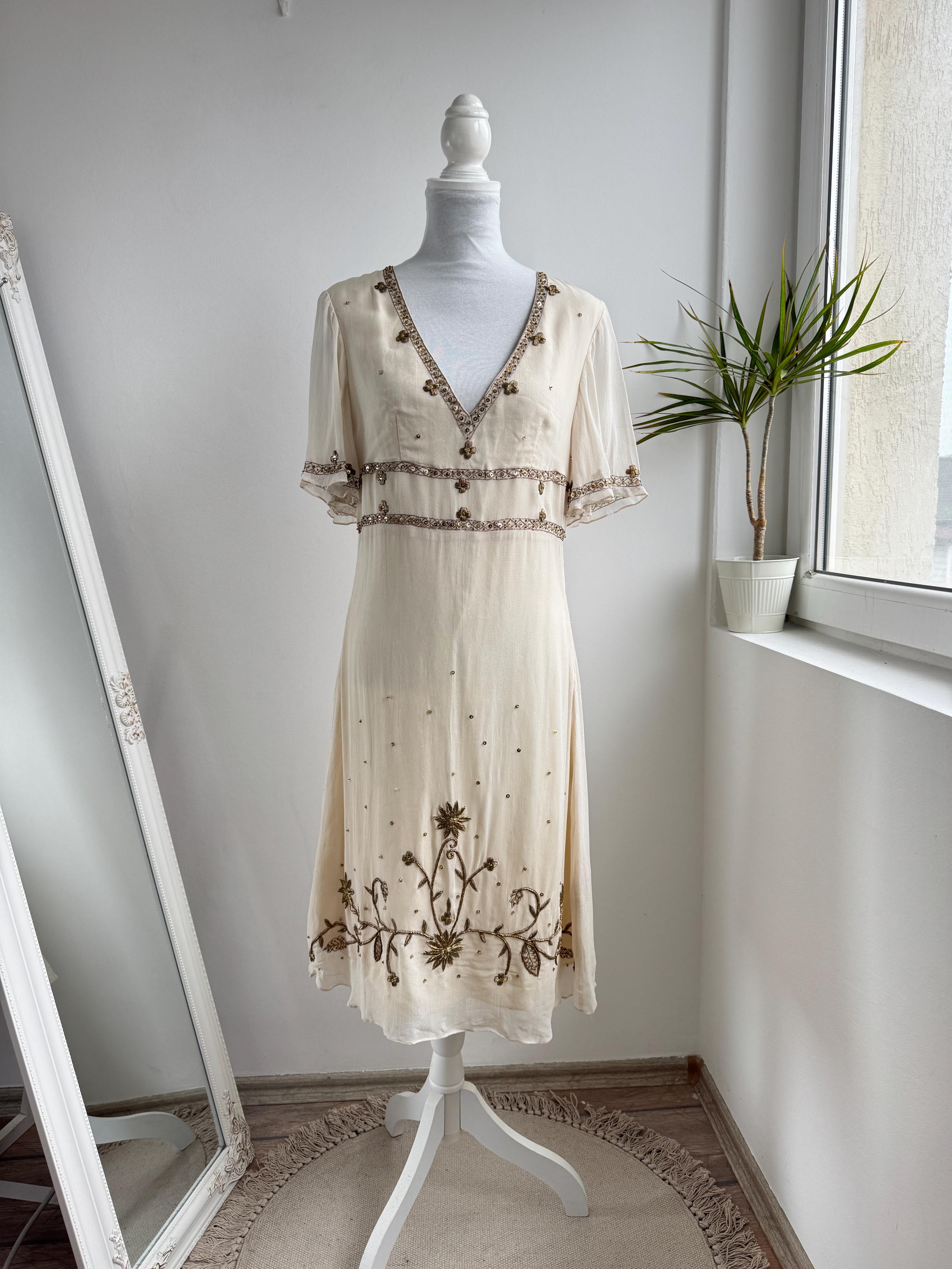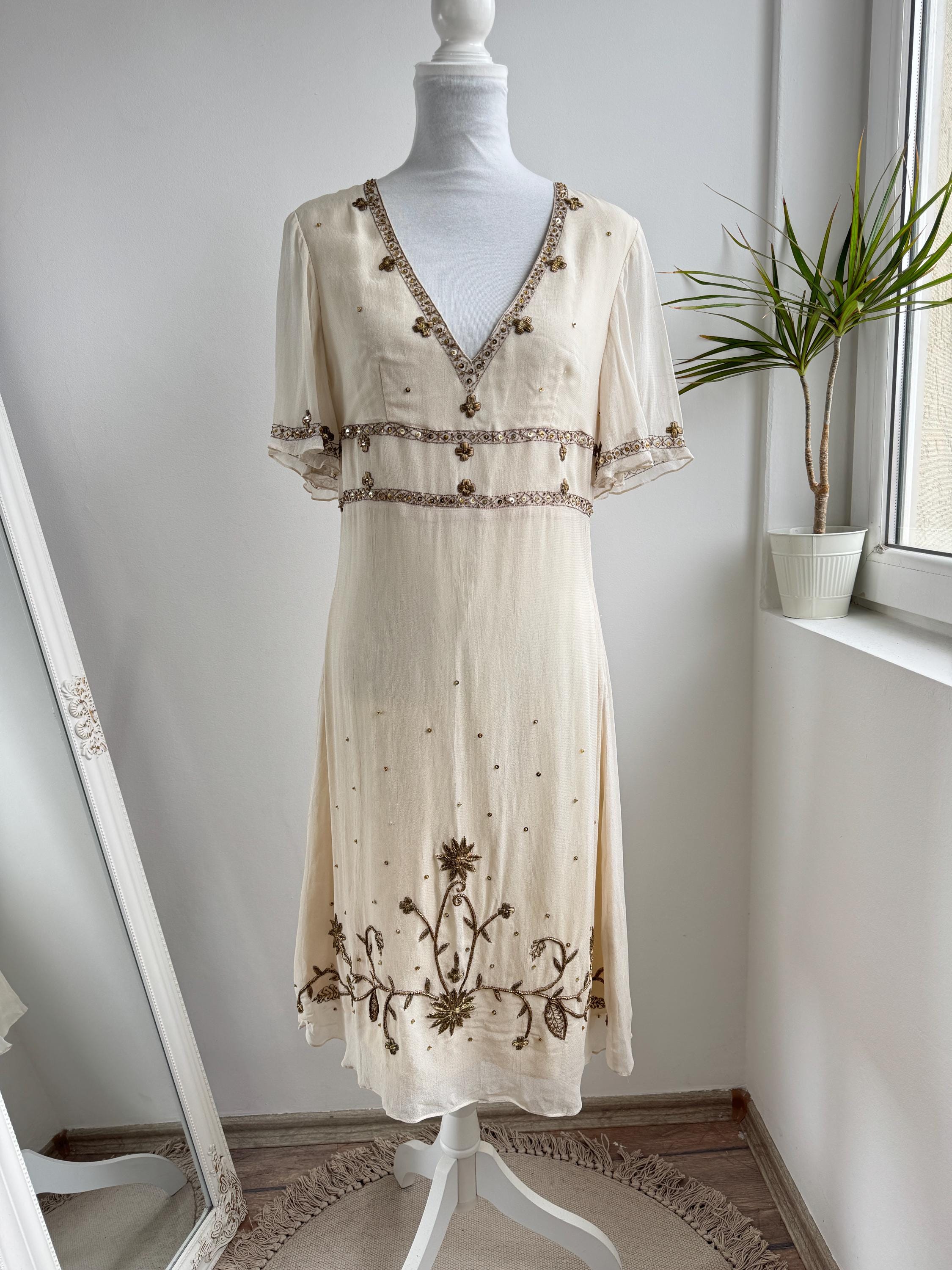 The design draws inspiration from the Art Deco era, with a flattering V-neckline, fluttery short sleeves, and an empire waist that flows into a graceful midi-length skirt. The hemline and bodice are adorned with stunning floral and sunburst beaded motifs, making it an ideal choice for a sophisticated boho wedding guest, a garden party, or a special vintage-inspired evening event. Its neutral beige/cream tone ensures it pairs beautifully with gold accessories for a truly luminous look.