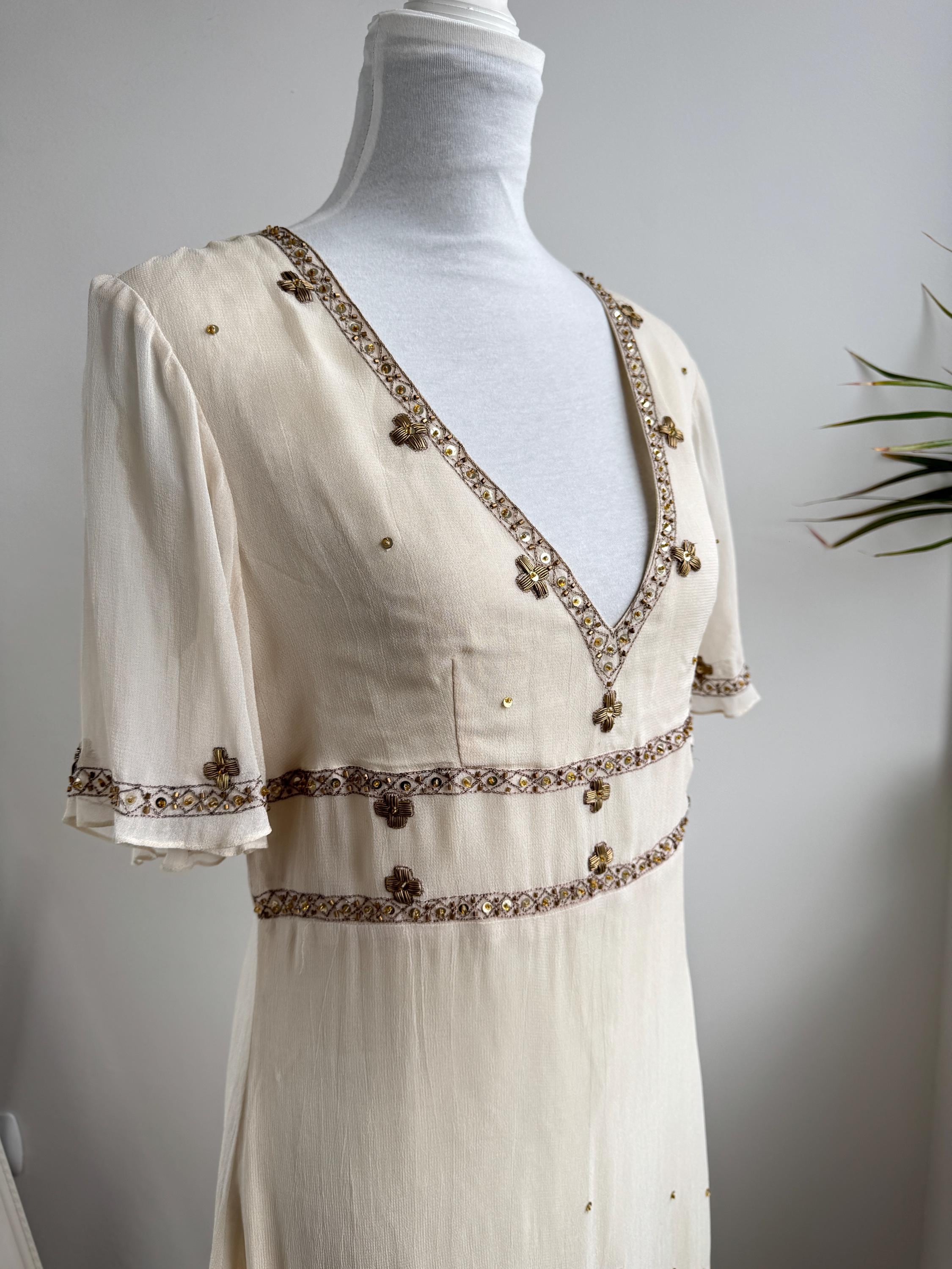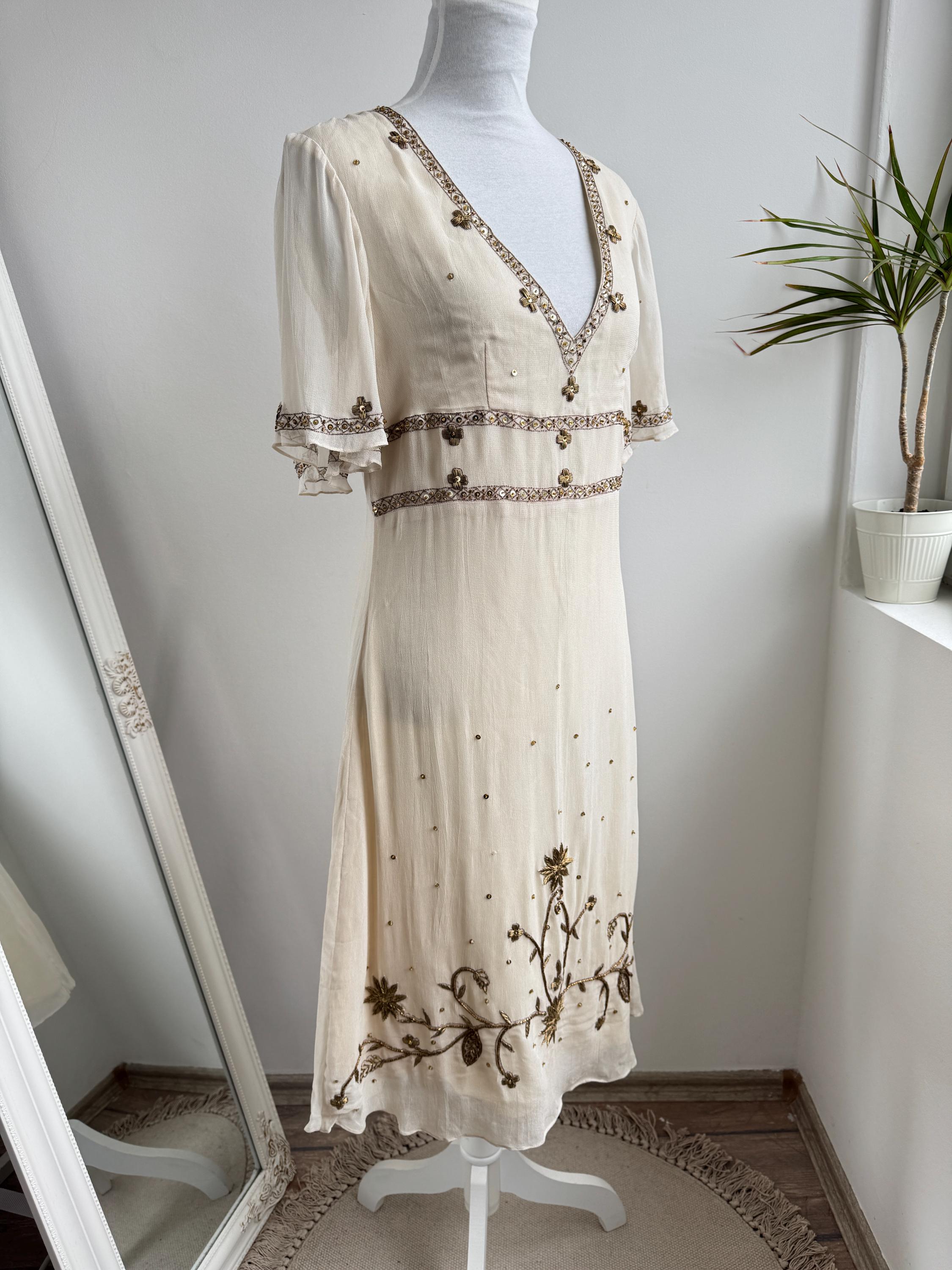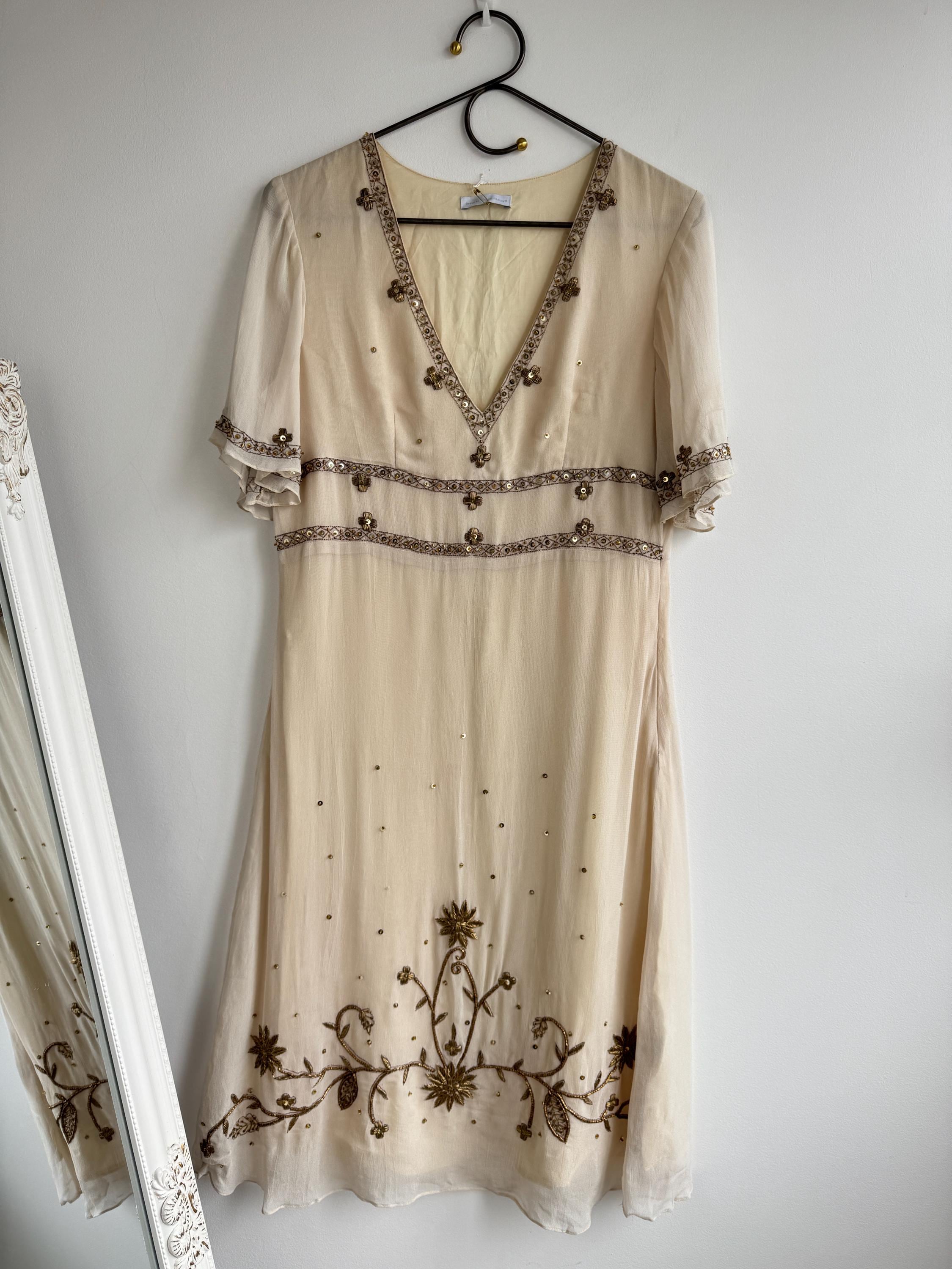 The design draws inspiration from the Art Deco era, with a flattering V-neckline, fluttery short sleeves, and an empire waist that flows into a graceful midi-length skirt. The hemline and bodice are adorned with stunning floral and sunburst beaded motifs, making it an ideal choice for a sophisticated boho wedding guest, a garden party, or a special vintage-inspired evening event. Its neutral beige/cream tone ensures it pairs beautifully with gold accessories for a truly luminous look.