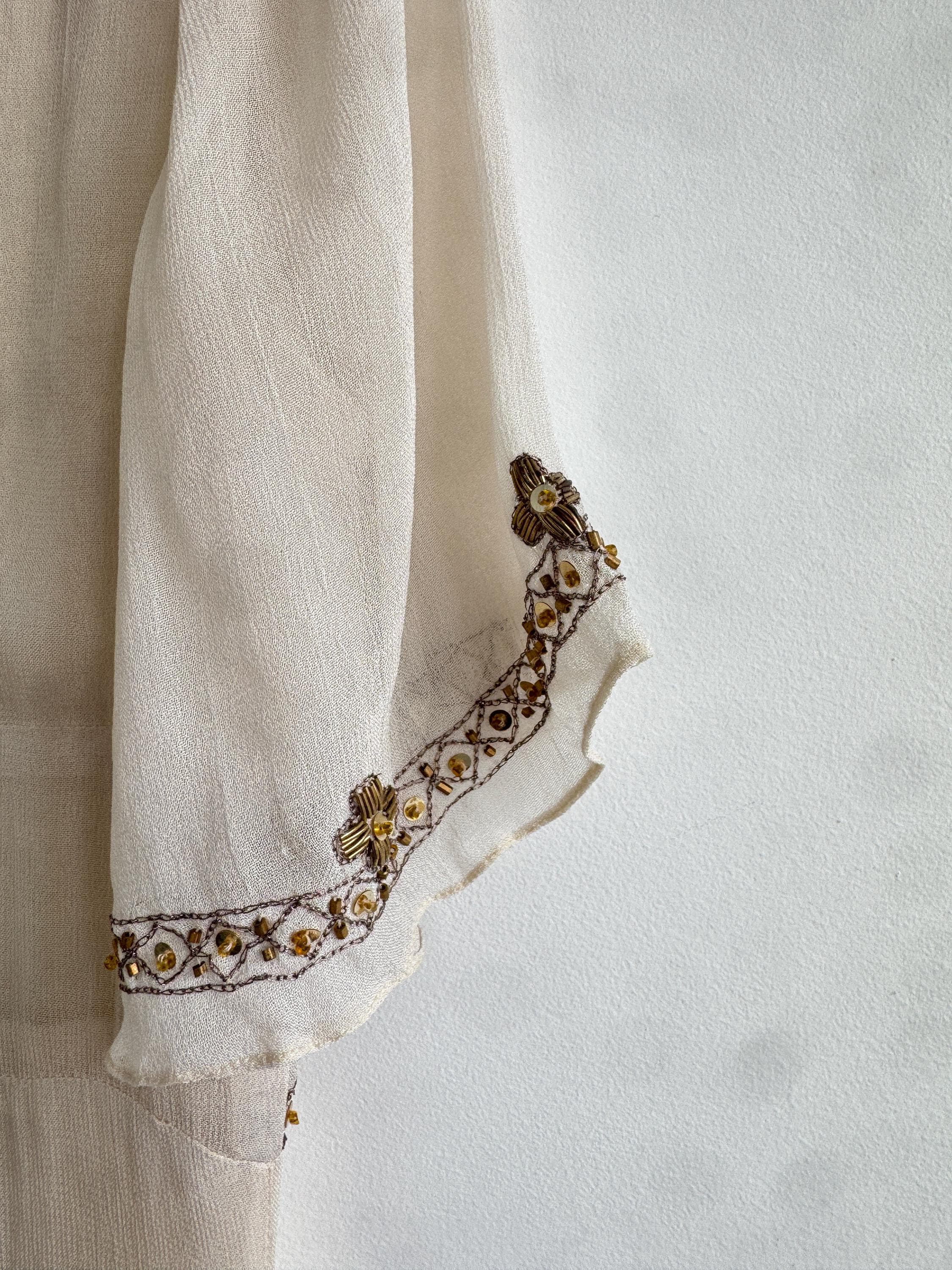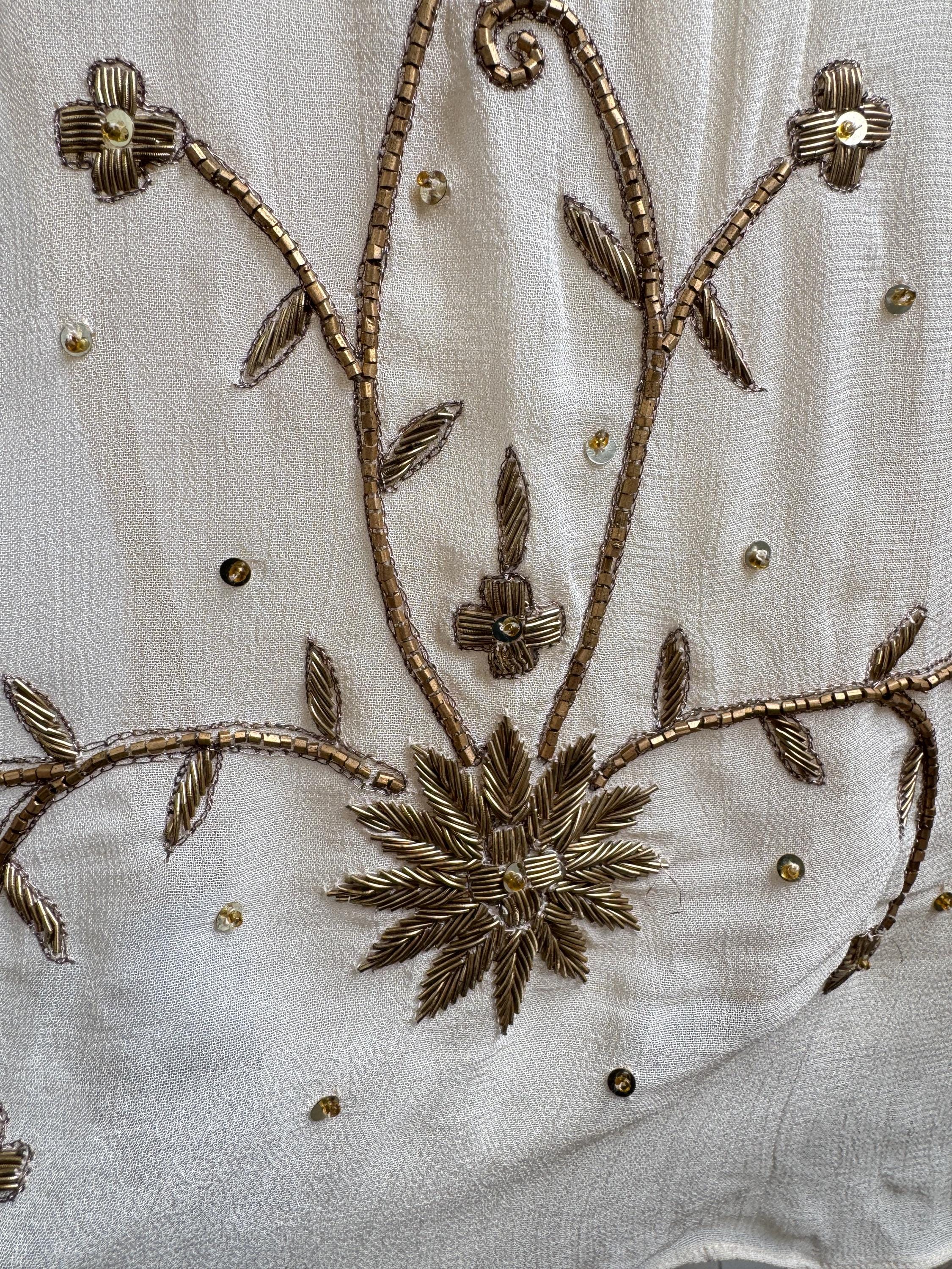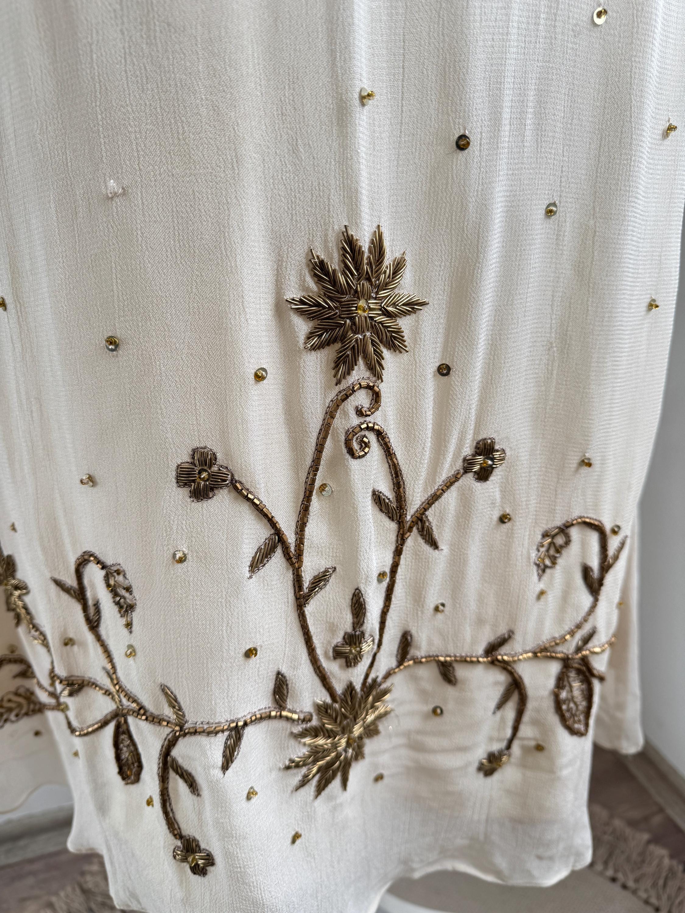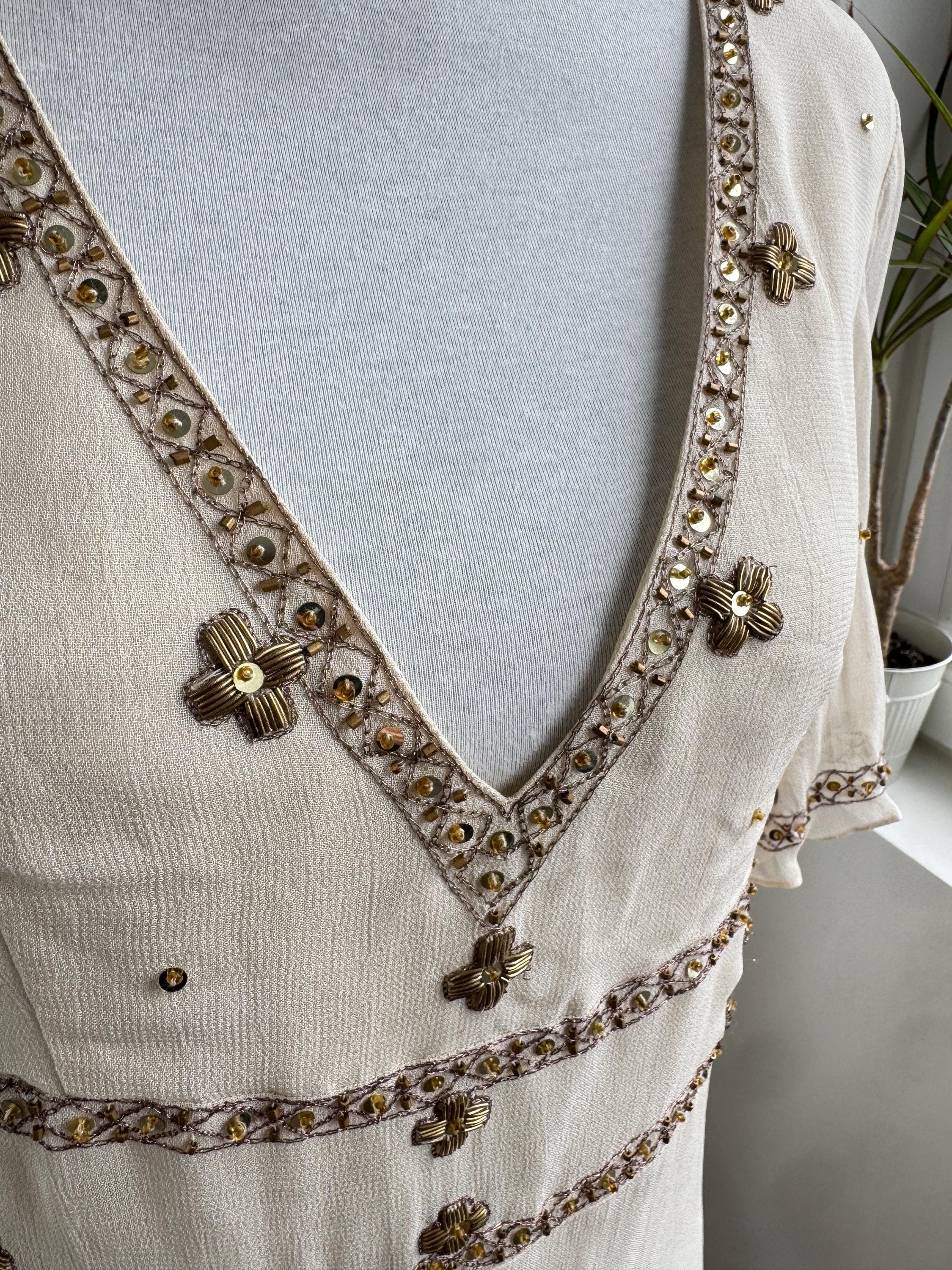 The design draws inspiration from the Art Deco era, with a flattering V-neckline, fluttery short sleeves, and an empire waist that flows into a graceful midi-length skirt. The hemline and bodice are adorned with stunning floral and sunburst beaded motifs, making it an ideal choice for a sophisticated boho wedding guest, a garden party, or a special vintage-inspired evening event. Its neutral beige/cream tone ensures it pairs beautifully with gold accessories for a truly luminous look.