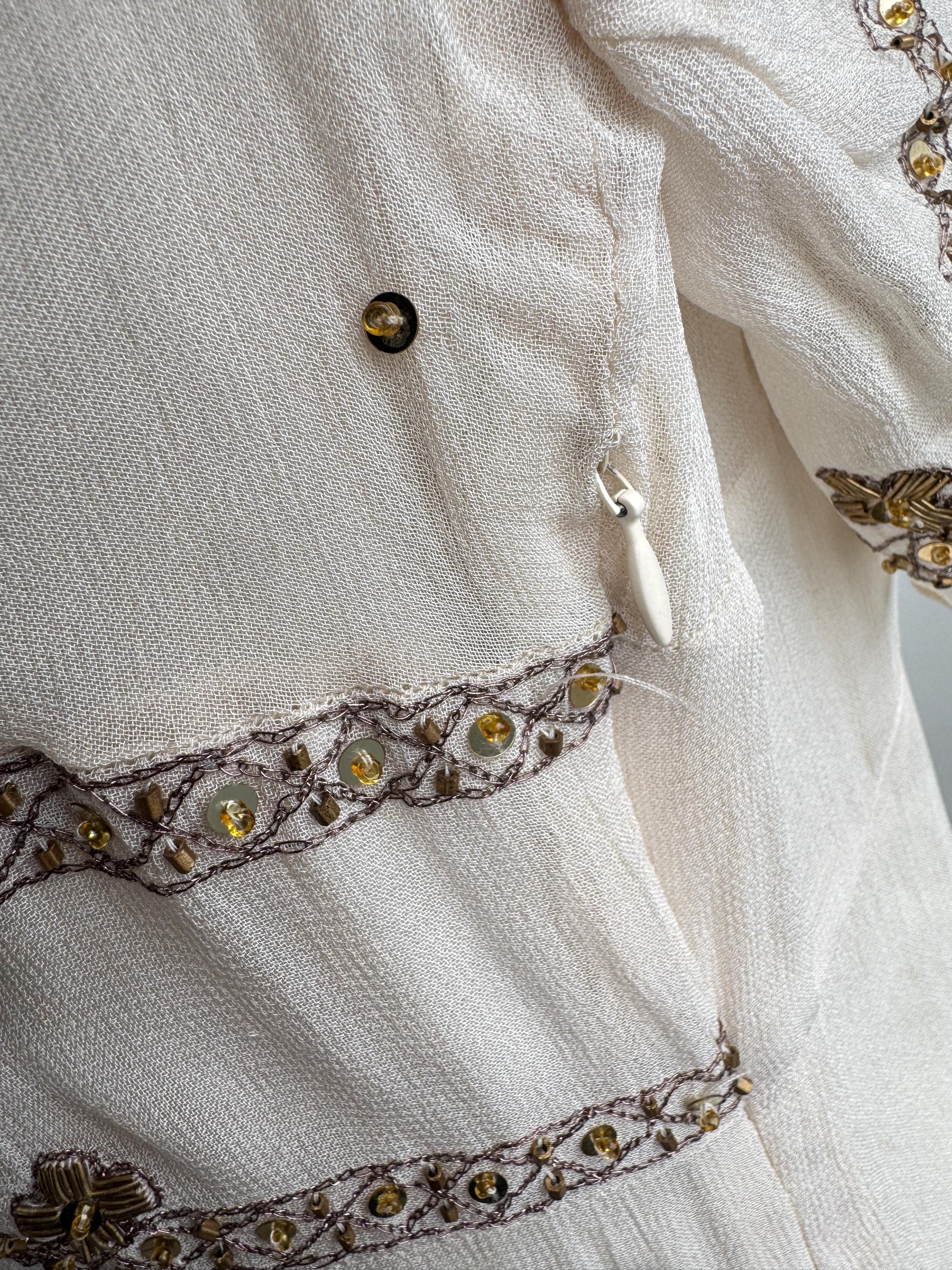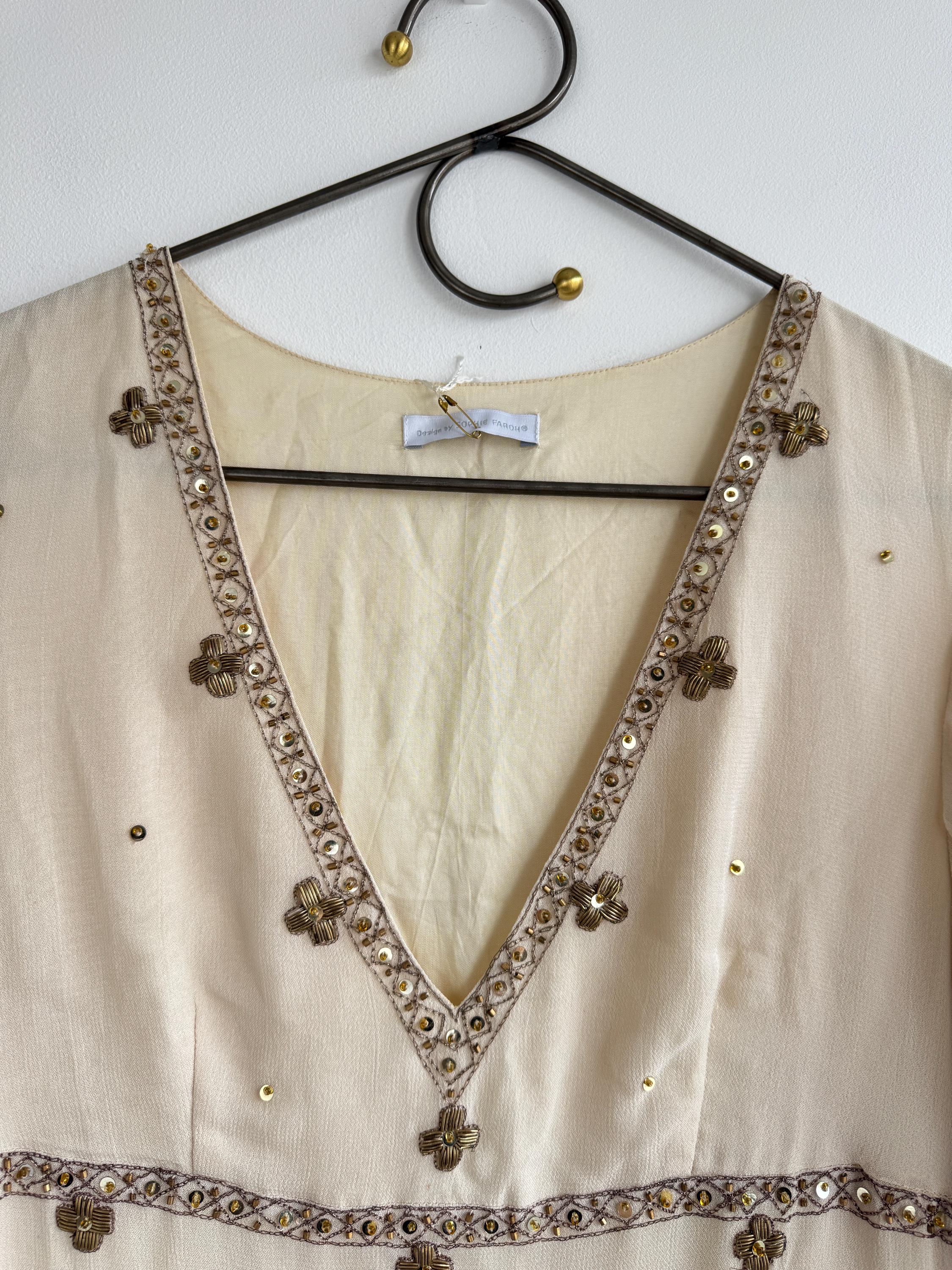 Elevate your wardrobe with this breathtaking Sophie Faroh beaded midi dress, a piece that perfectly marries timeless elegance with bohemian charm. Crafted from high-quality 100% viscose that mimics the delicate drape and soft sheen of sand-washed silk, this dress features intricate hand-applied bronze beadwork and shimmering sequins.