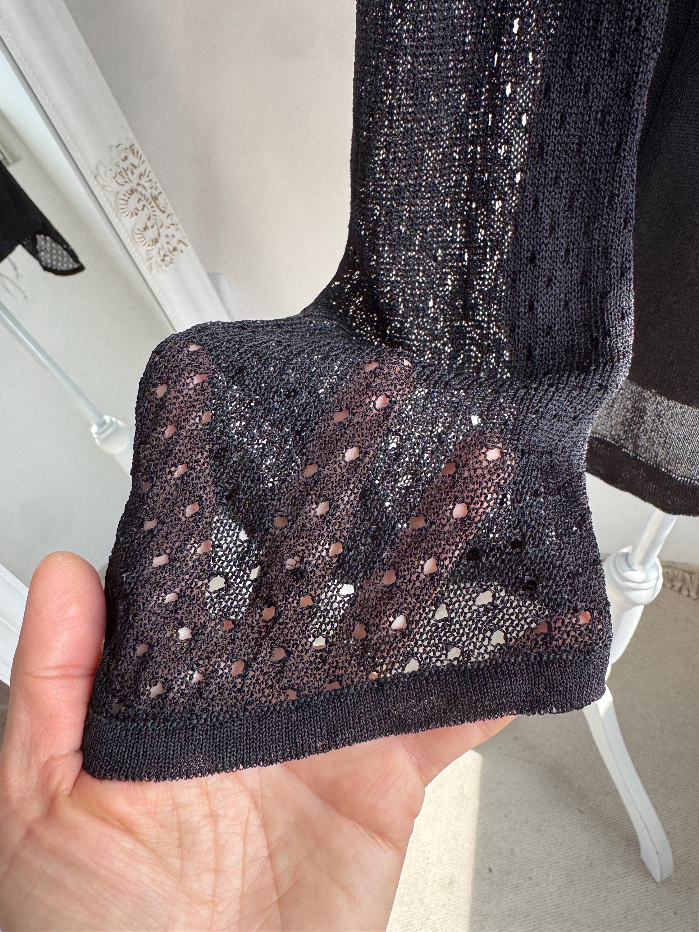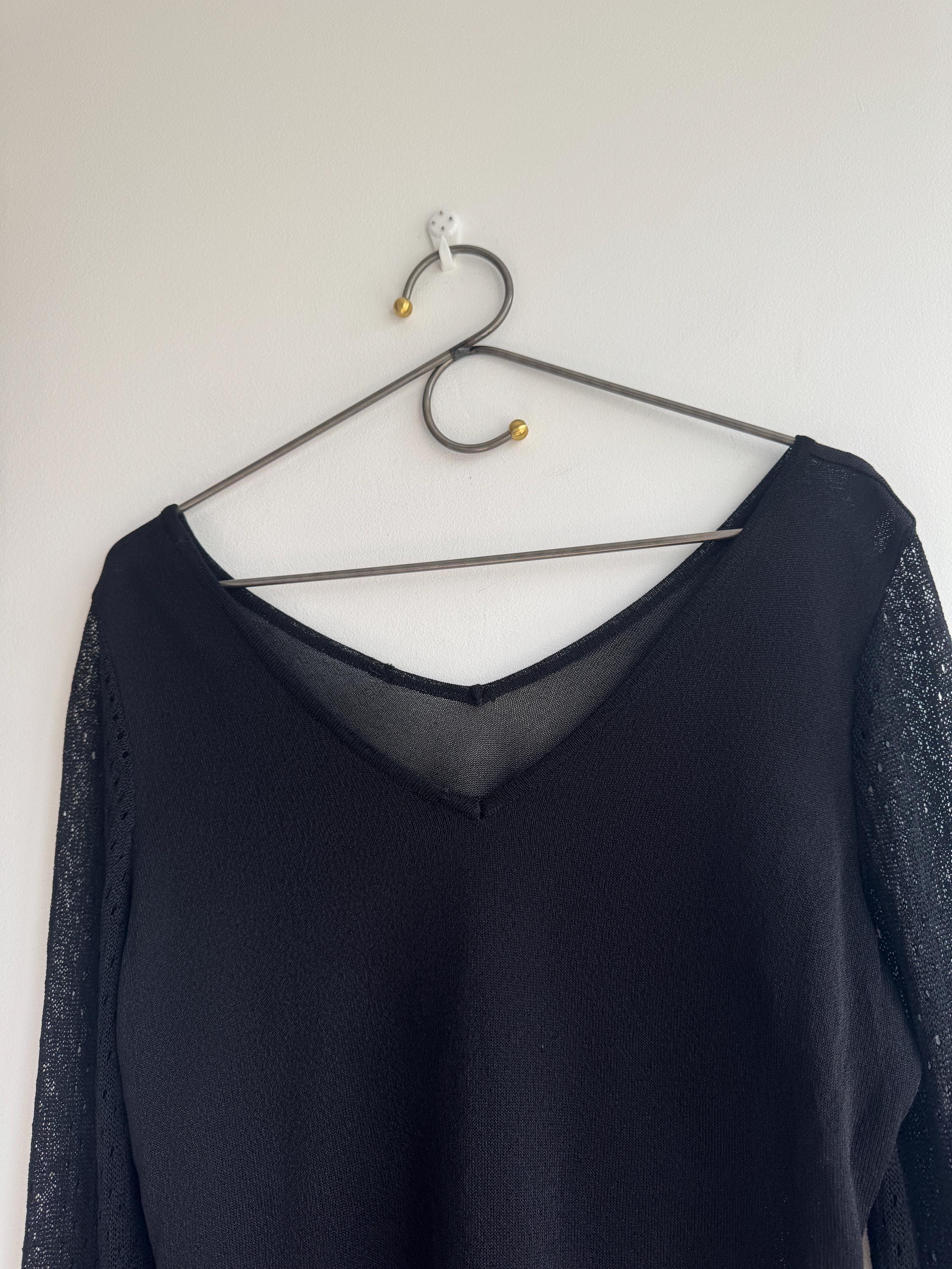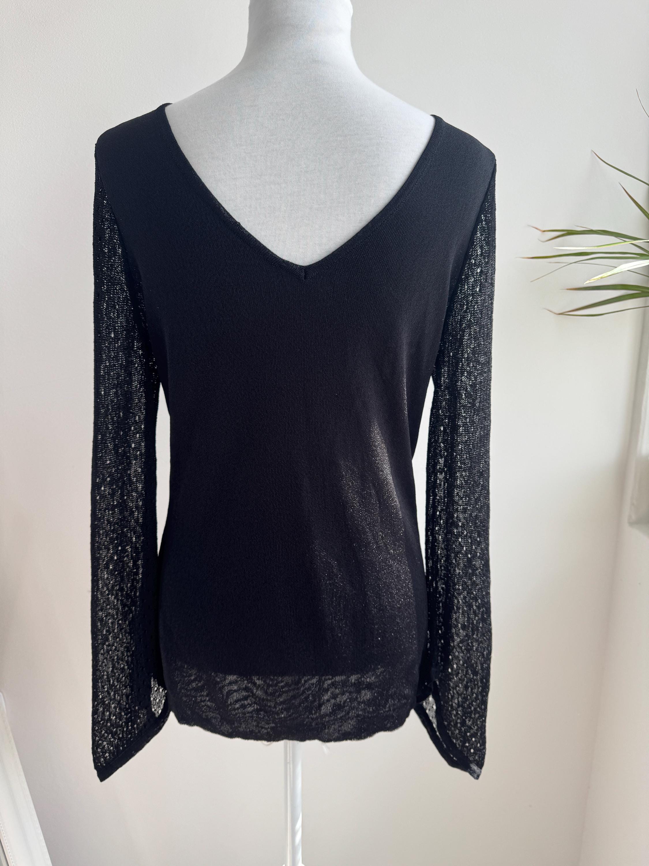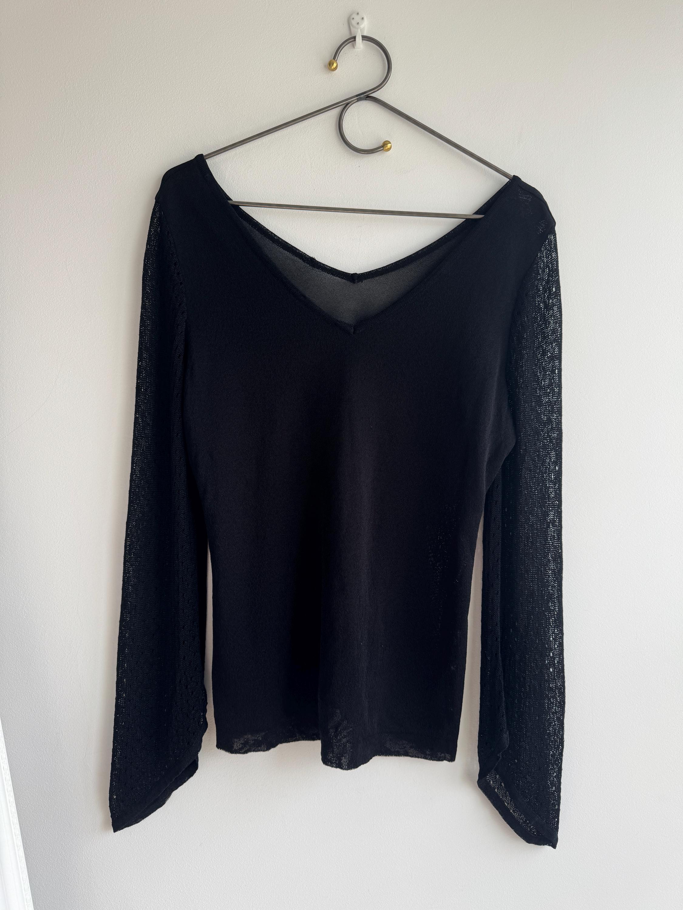 Elevate your wardrobe with this effortlessly chic vintage black sheer knit top — a timeless piece that blends minimalist elegance with subtle Y2K vibes. Crafted from a lightweight, semi-transparent knit, this lightweight sweater top features a flattering V neckline and long mesh flare sleeves with a delicate open-knit texture that adds depth and visual interest.