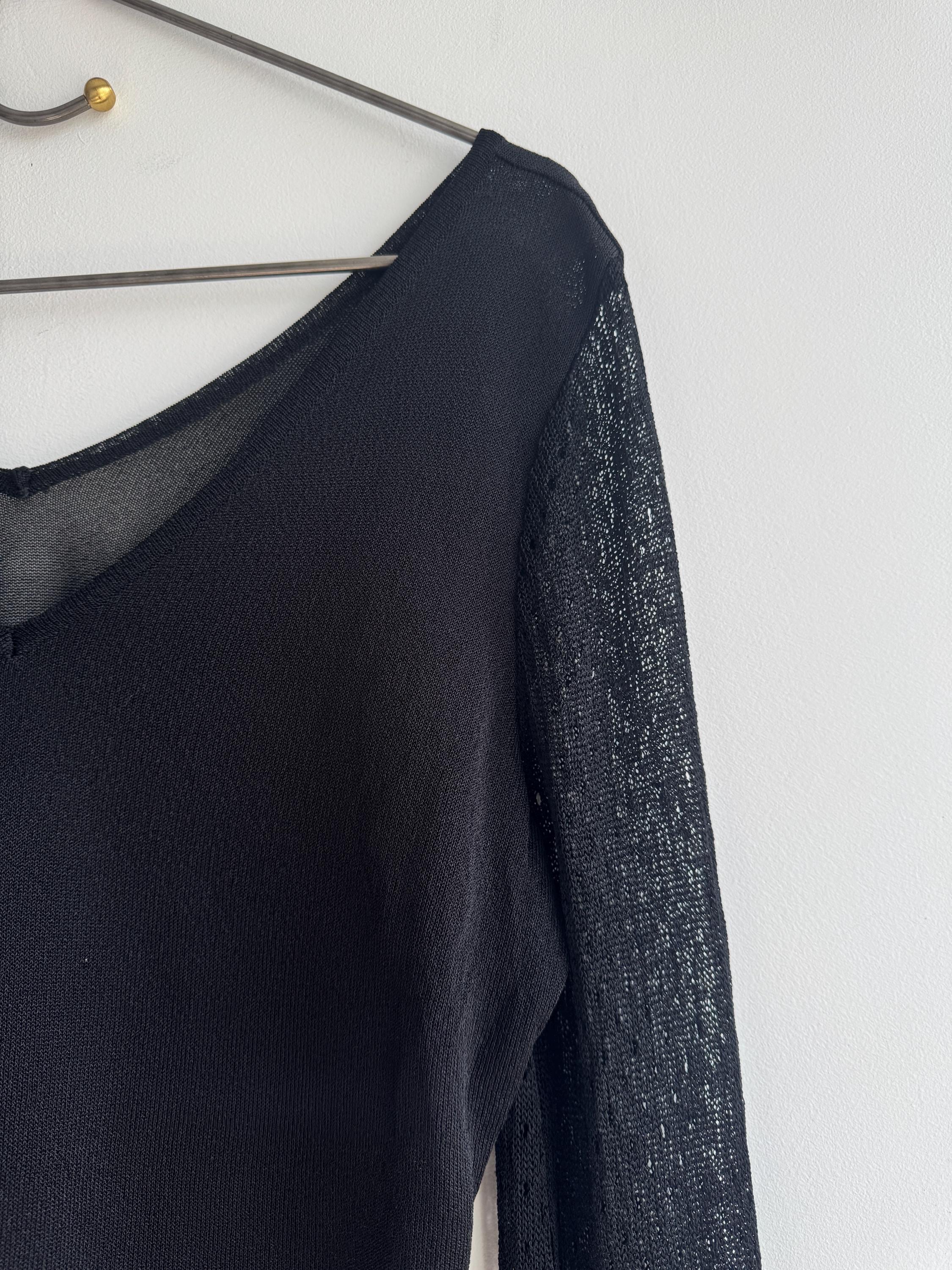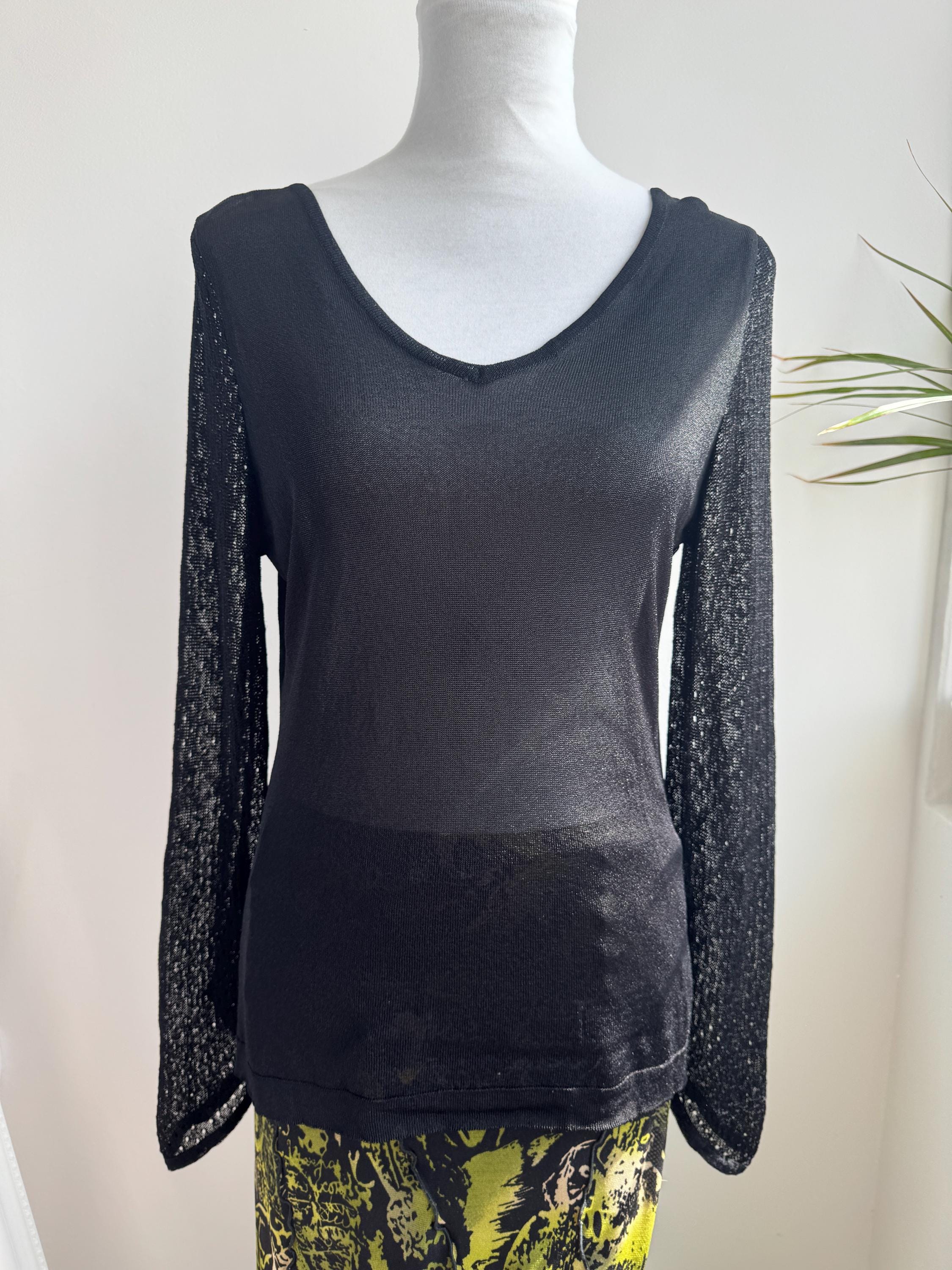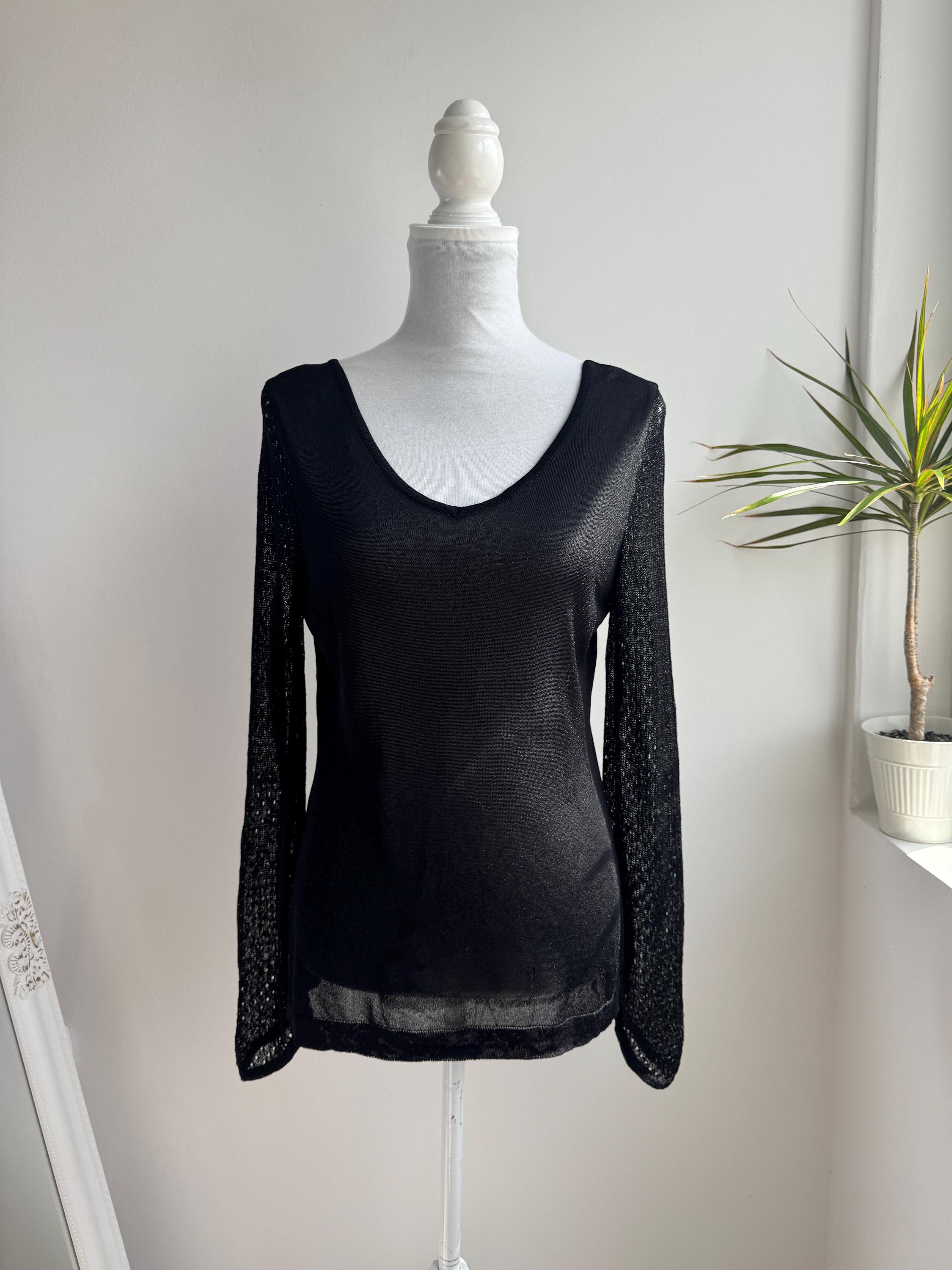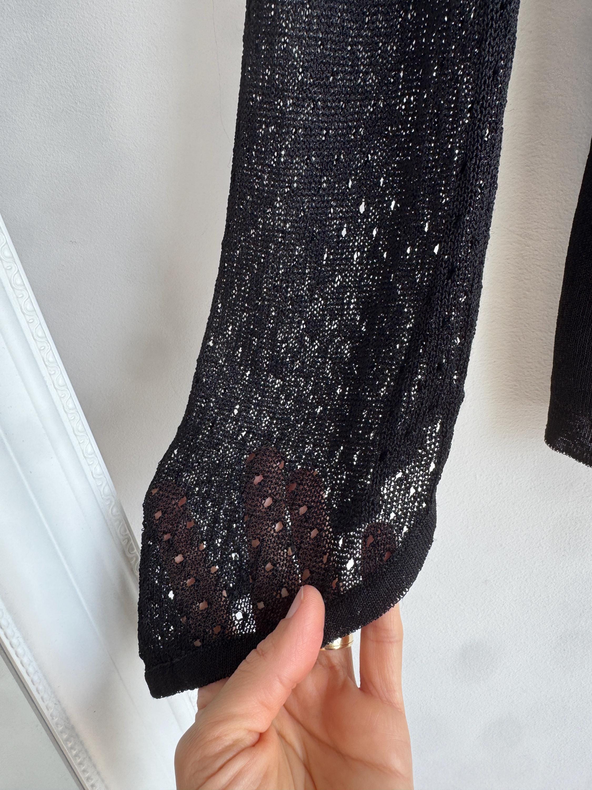 Elevate your wardrobe with this effortlessly chic vintage black sheer knit top — a timeless piece that blends minimalist elegance with subtle Y2K vibes. Crafted from a lightweight, semi-transparent knit, this lightweight sweater top features a flattering V neckline and long mesh flare sleeves with a delicate open-knit texture that adds depth and visual interest.