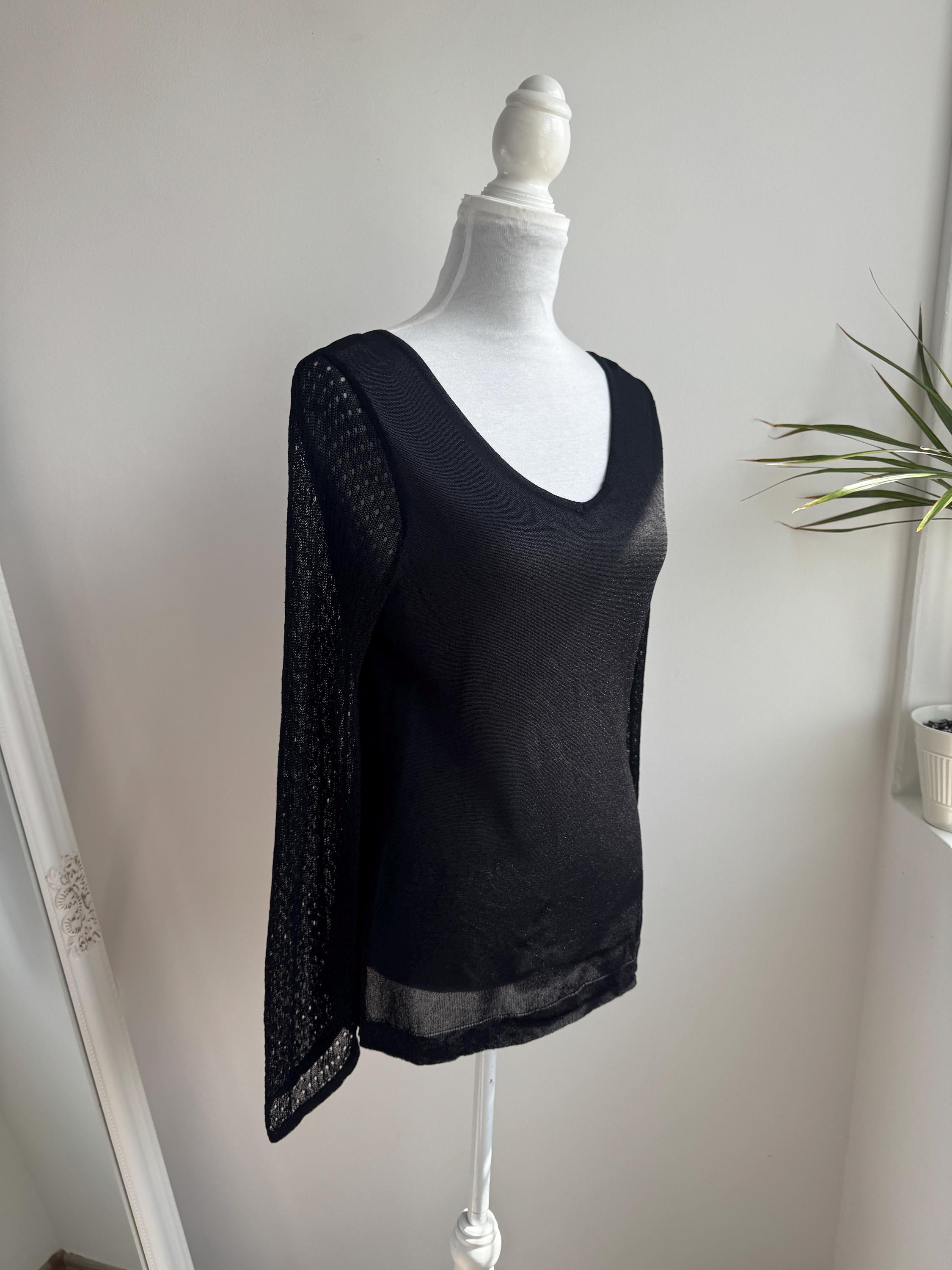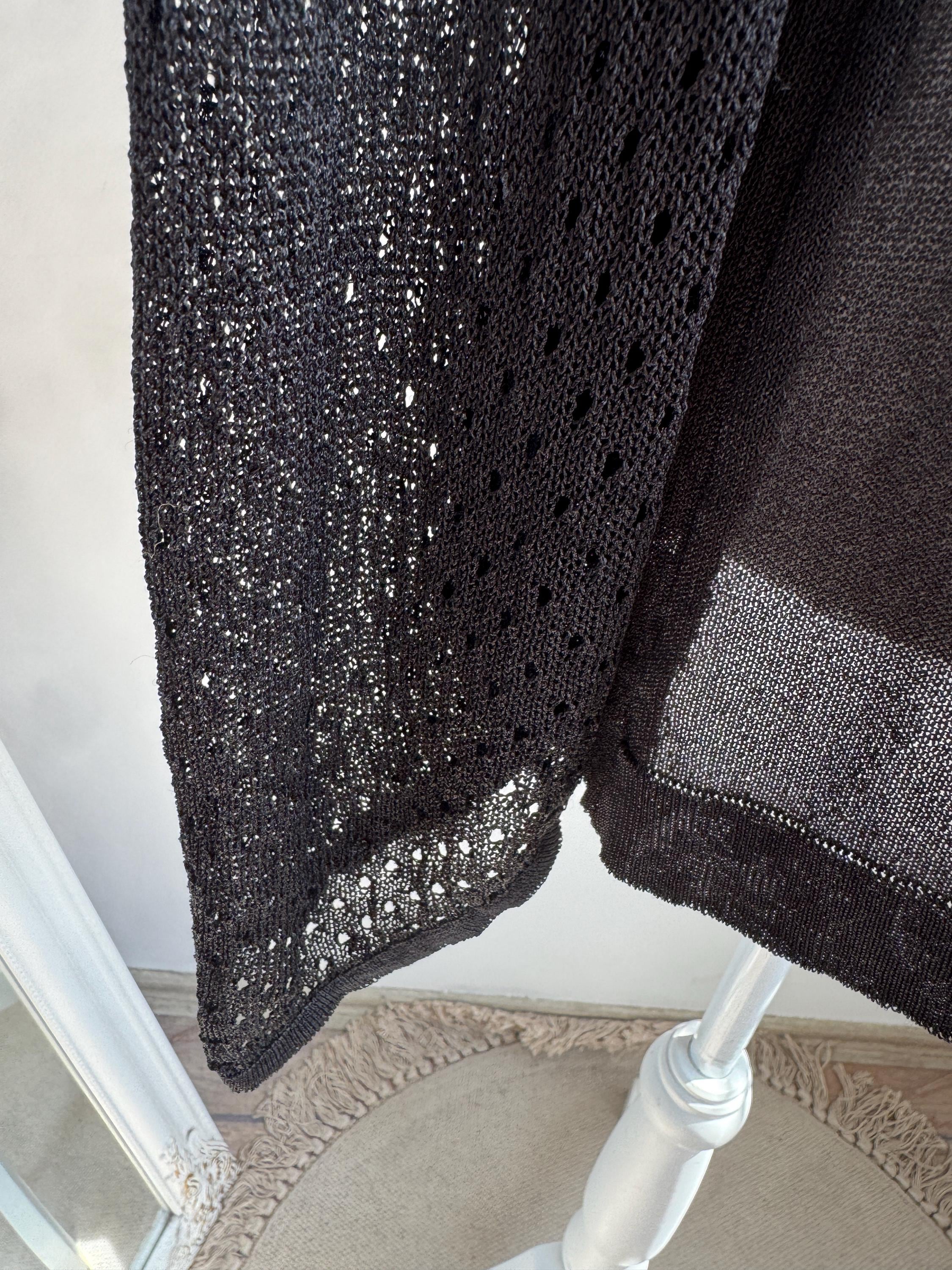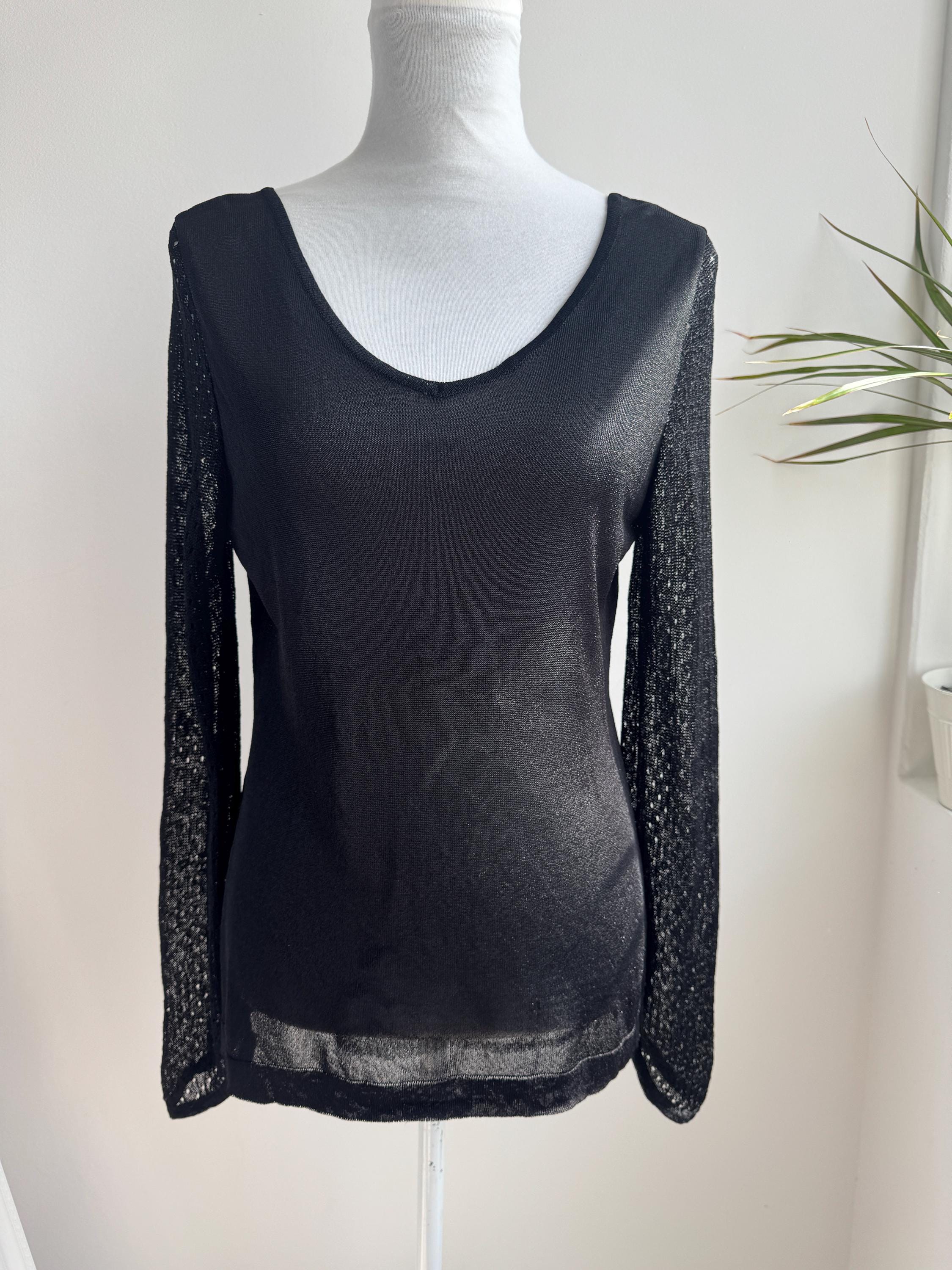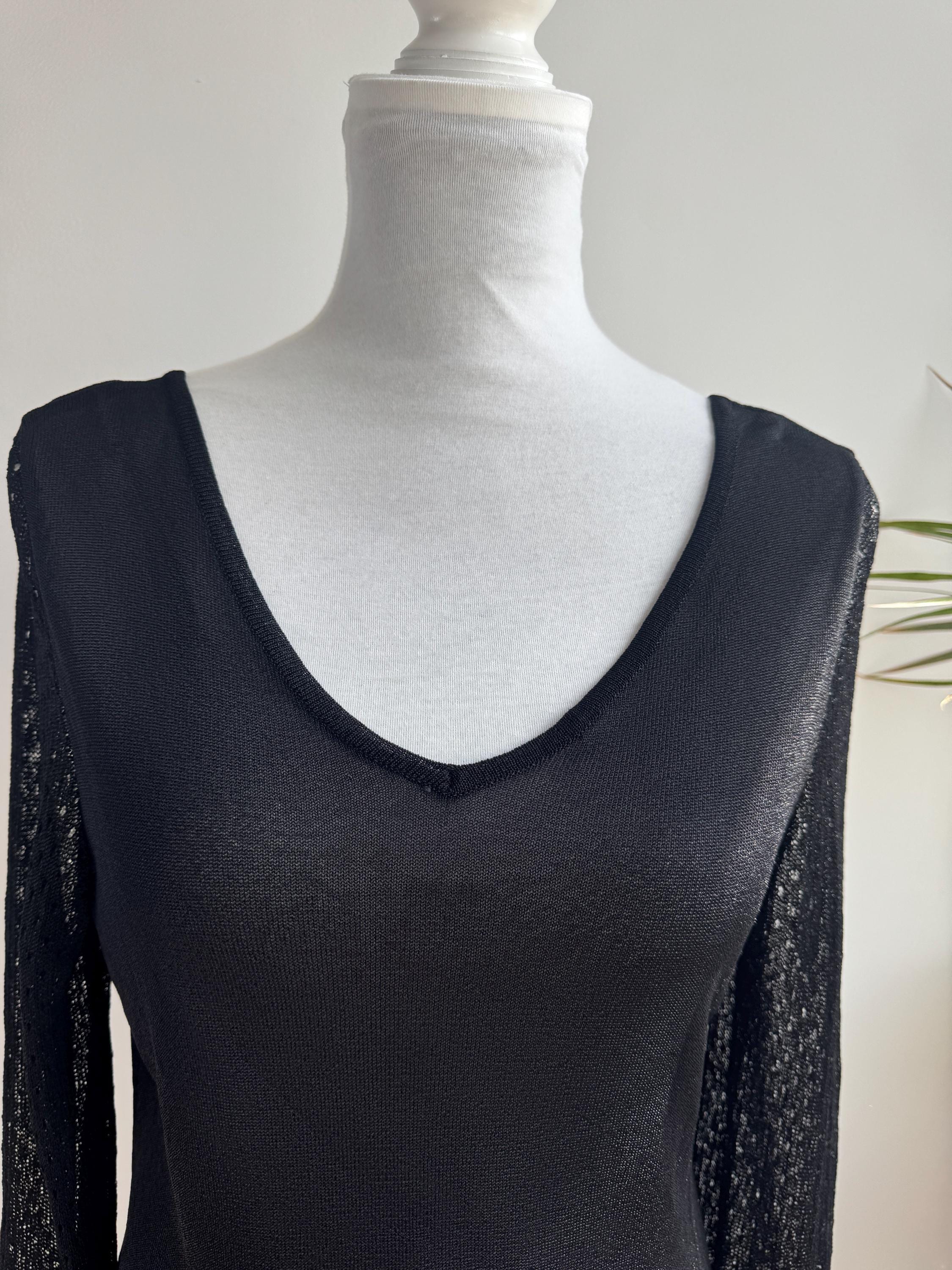 Elevate your wardrobe with this effortlessly chic vintage black sheer knit top — a timeless piece that blends minimalist elegance with subtle Y2K vibes. Crafted from a lightweight, semi-transparent knit, this lightweight sweater top features a flattering V neckline and long mesh flare sleeves with a delicate open-knit texture that adds depth and visual interest.