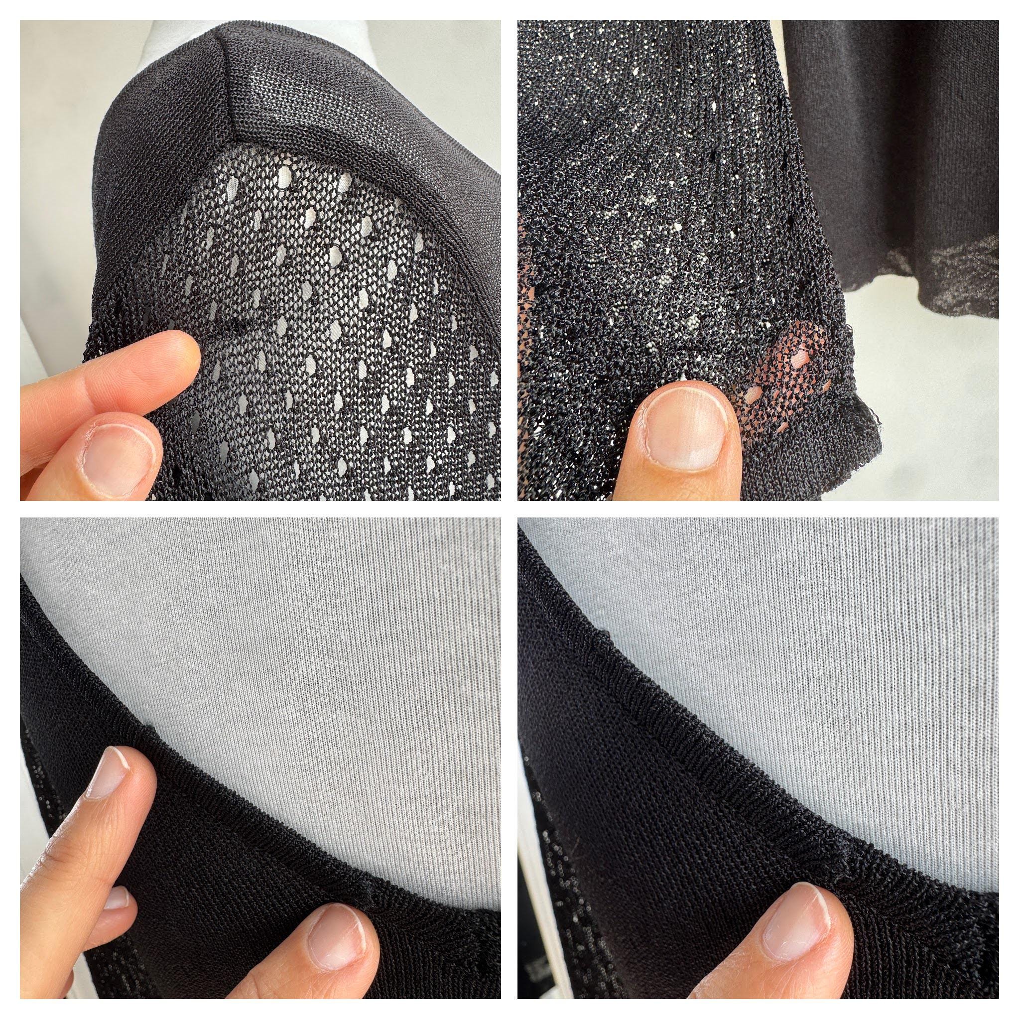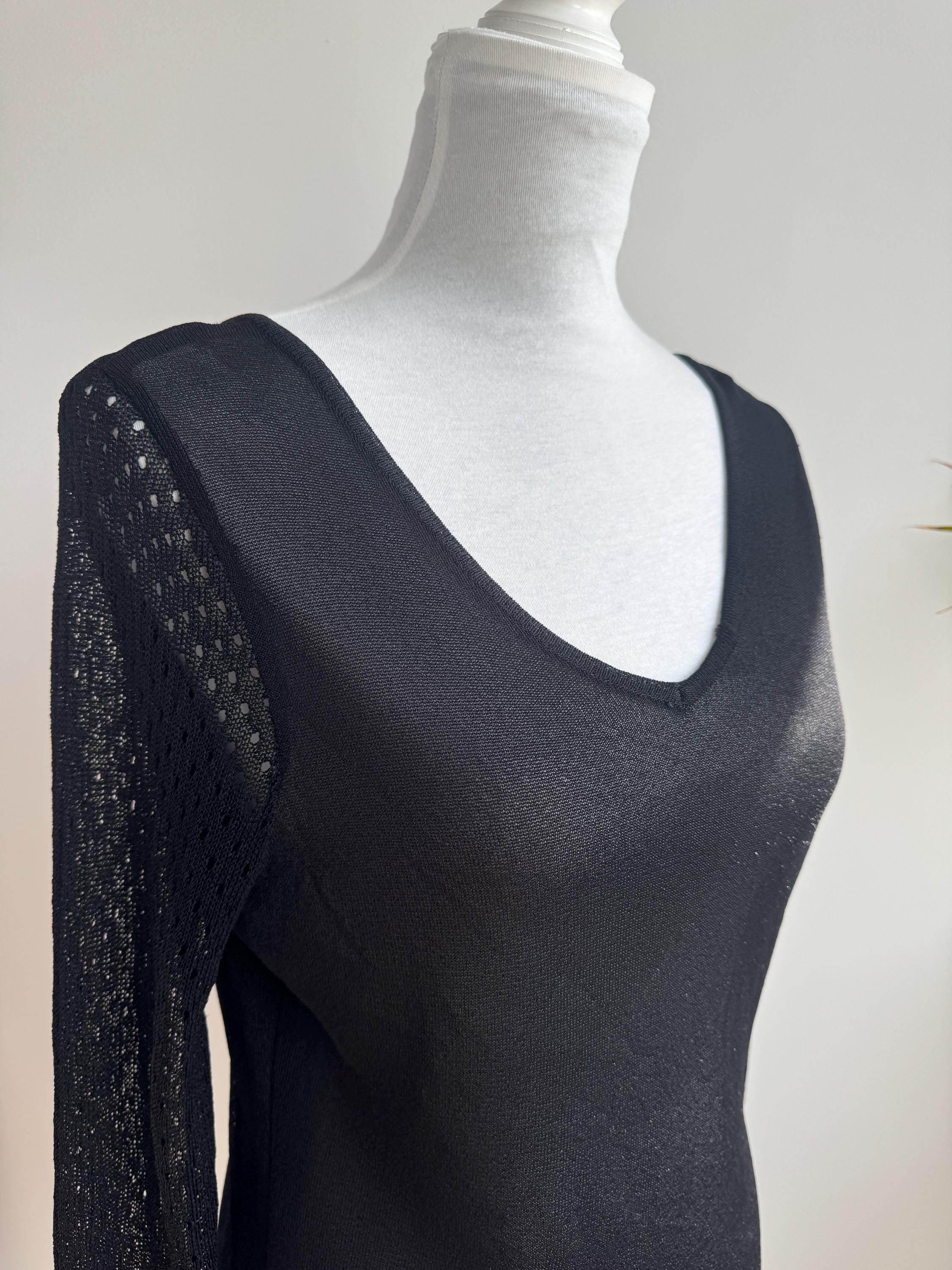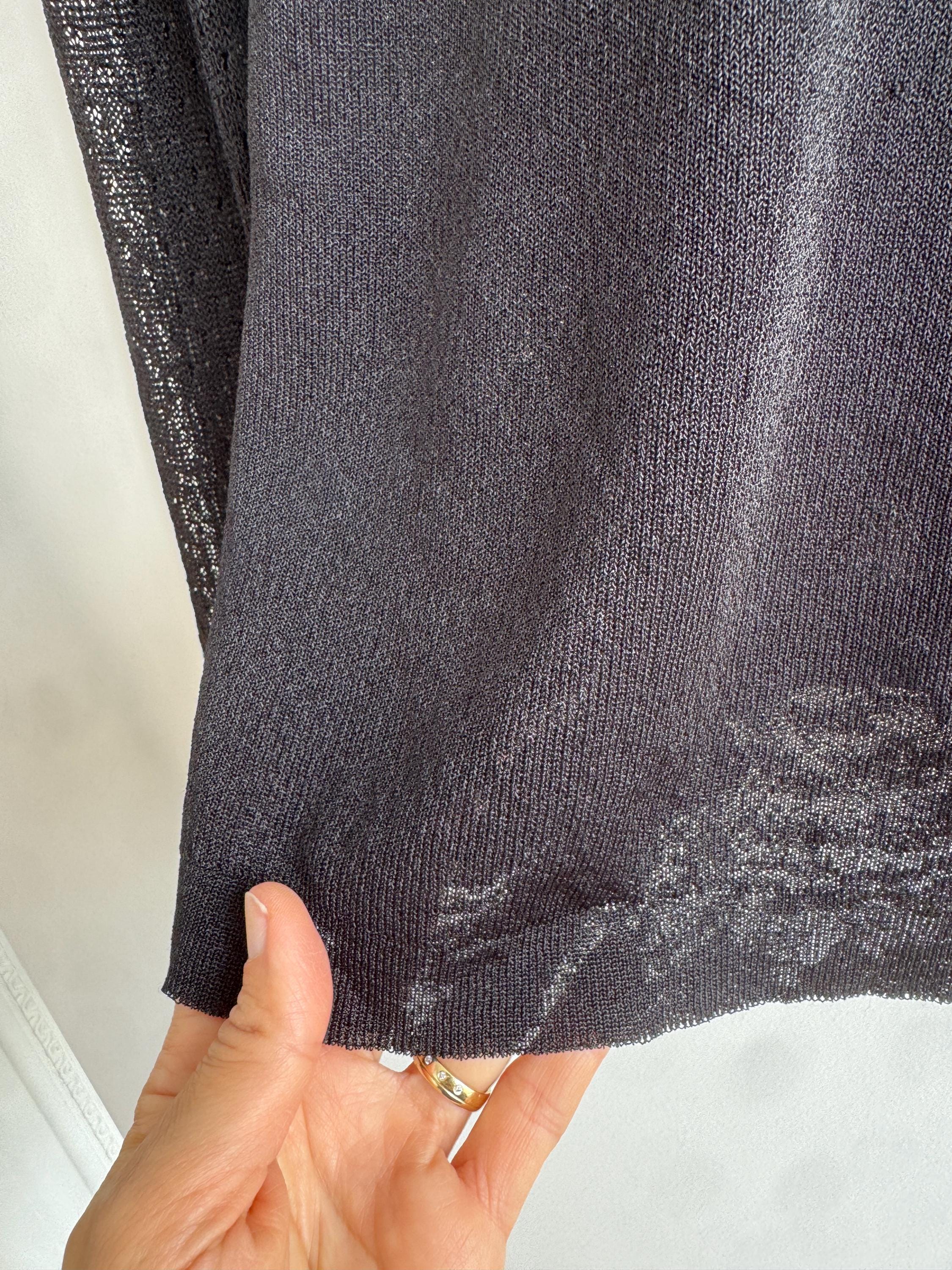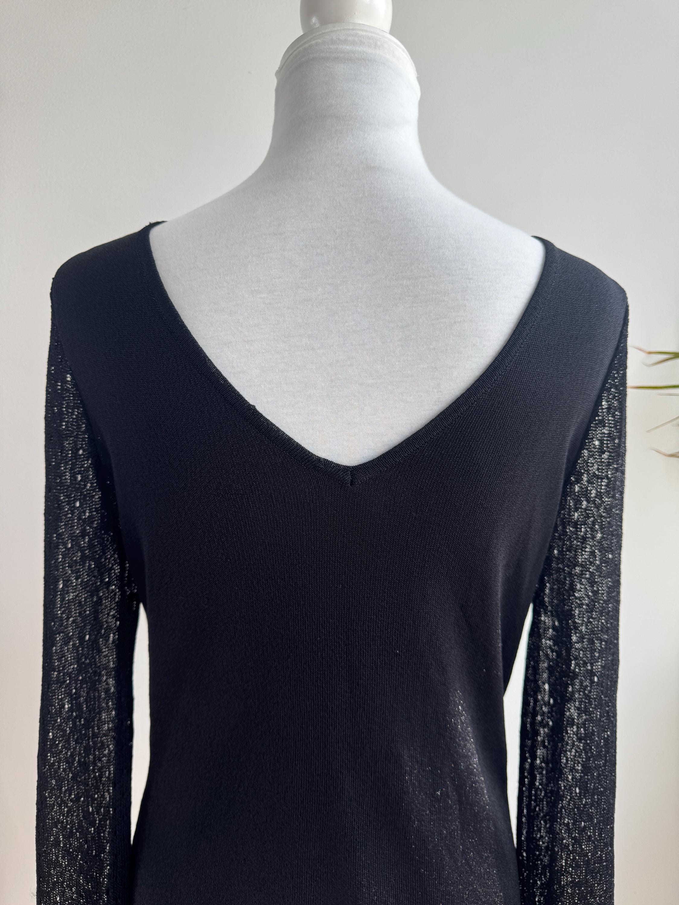 Elevate your wardrobe with this effortlessly chic vintage black sheer knit top — a timeless piece that blends minimalist elegance with subtle Y2K vibes. Crafted from a lightweight, semi-transparent knit, this lightweight sweater top features a flattering V neckline and long mesh flare sleeves with a delicate open-knit texture that adds depth and visual interest.