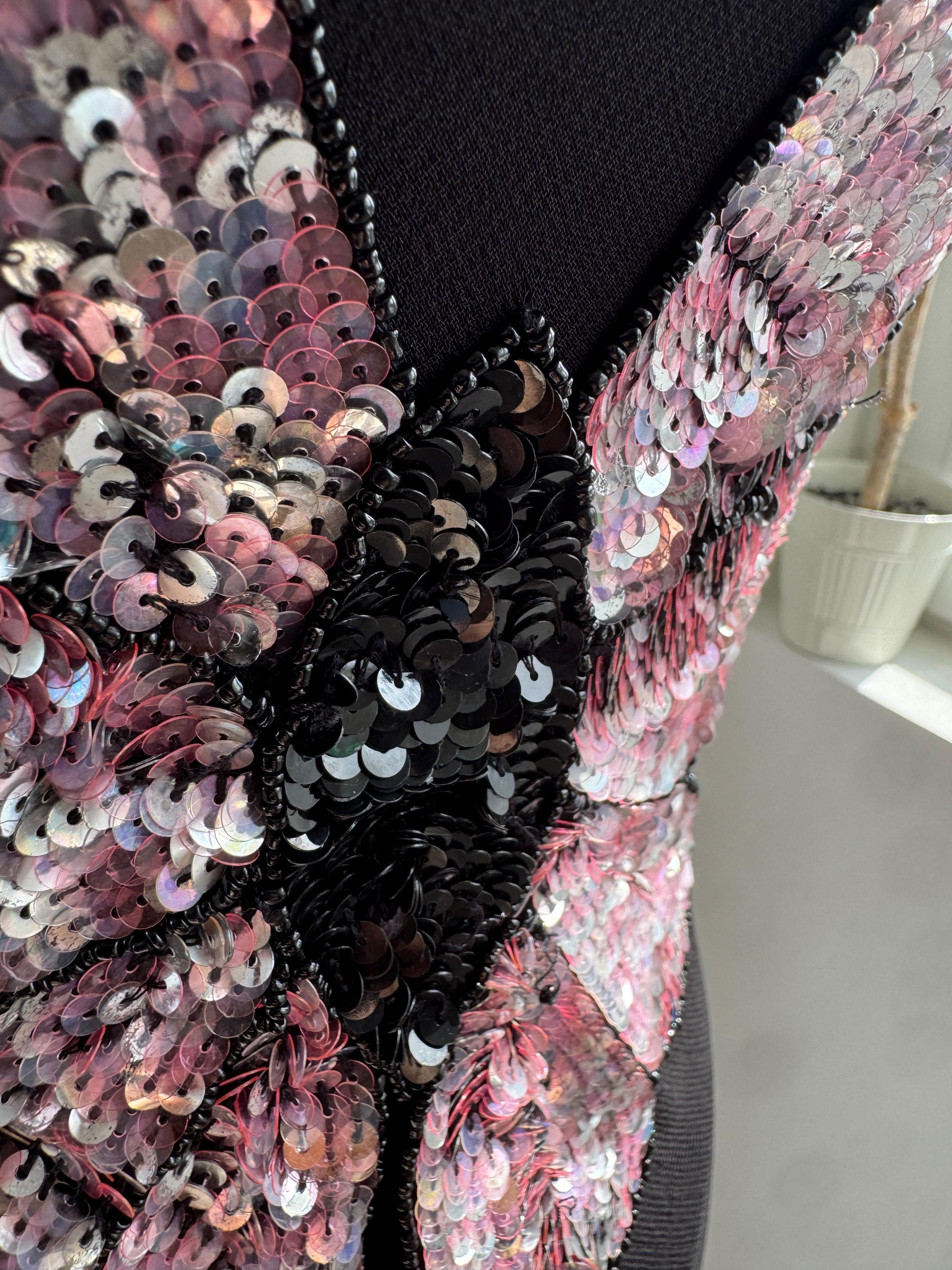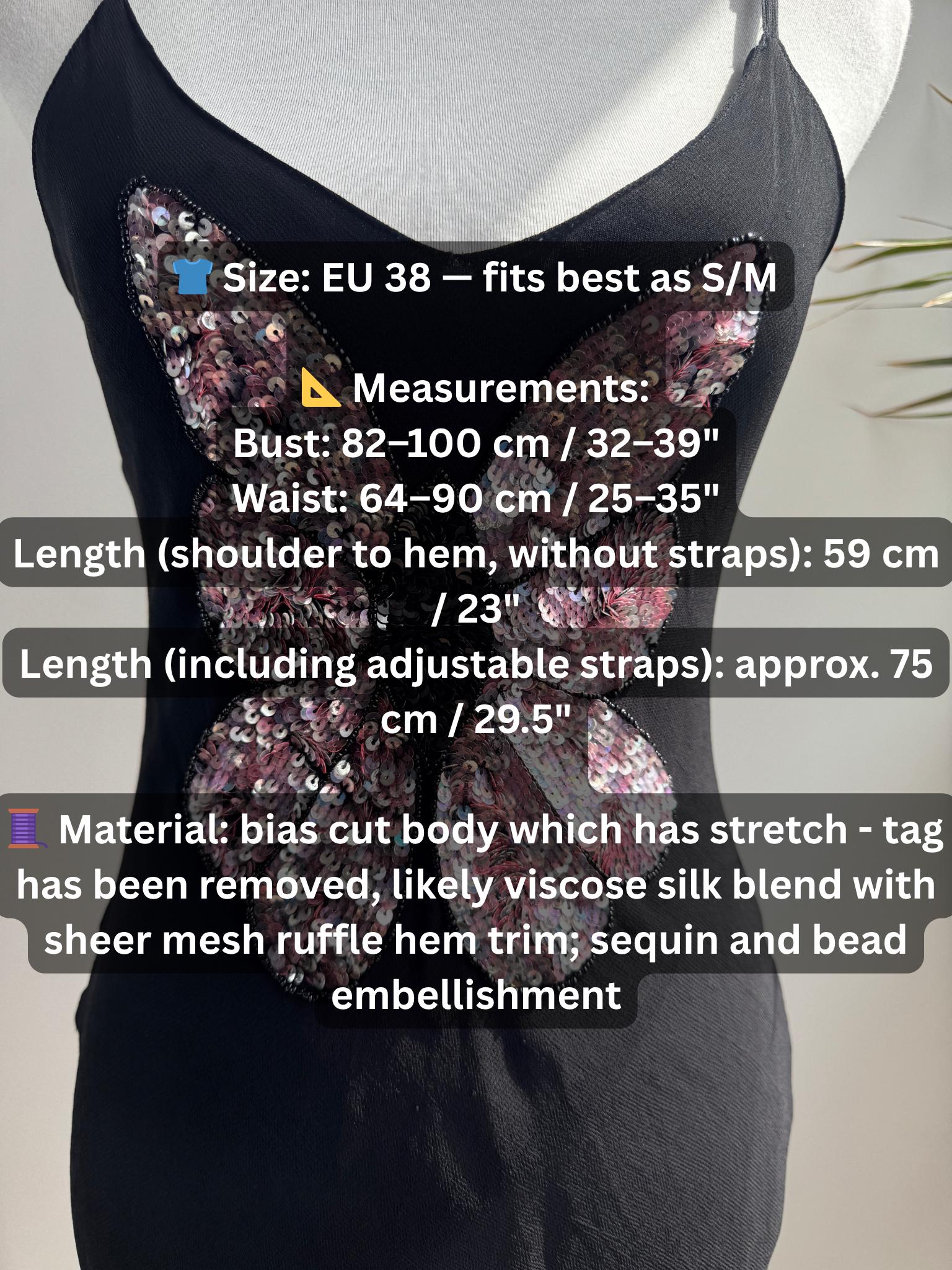 Cut in a fitted silhouette with adjustable spaghetti straps and a flattering v-neckline, the bottom edge features a delicate sheer mesh ruffle trim that adds a romantic, feminine touch. The sequin butterfly is intricately worked with beaded black edging and multi-tonal iridescent sequins that shift between pink, silver, and lilac depending on the light — absolutely mesmerising under event or club lighting.