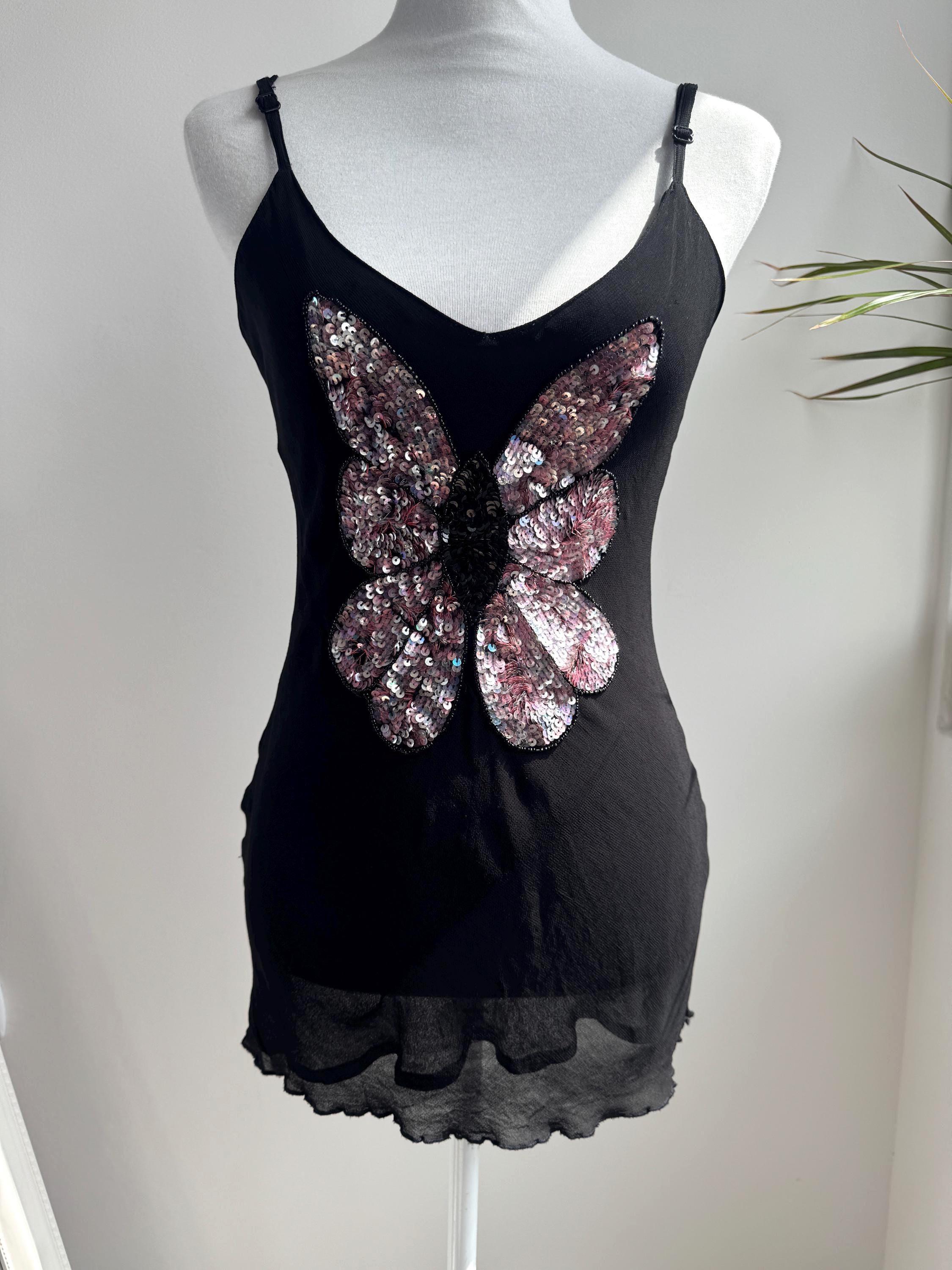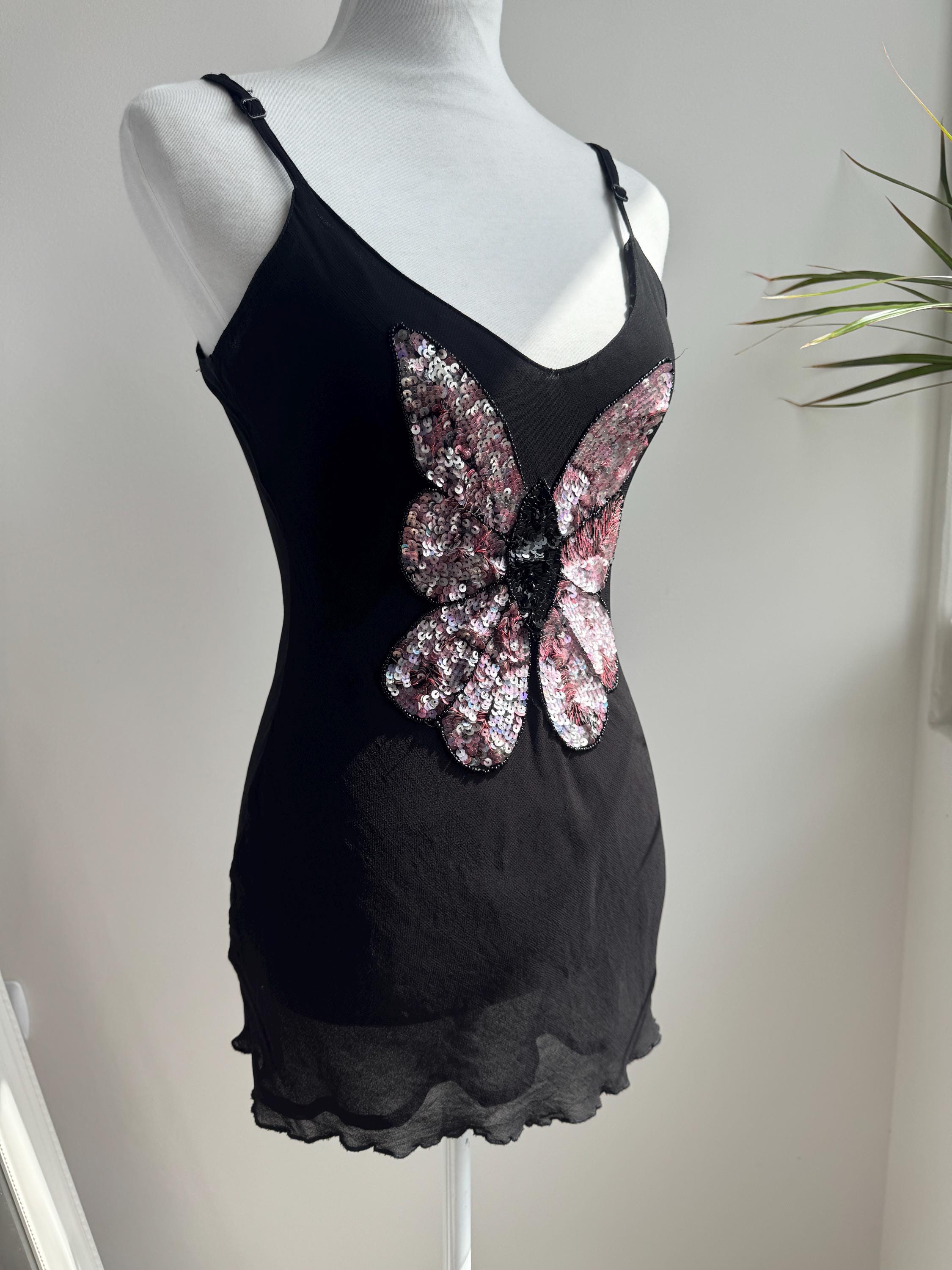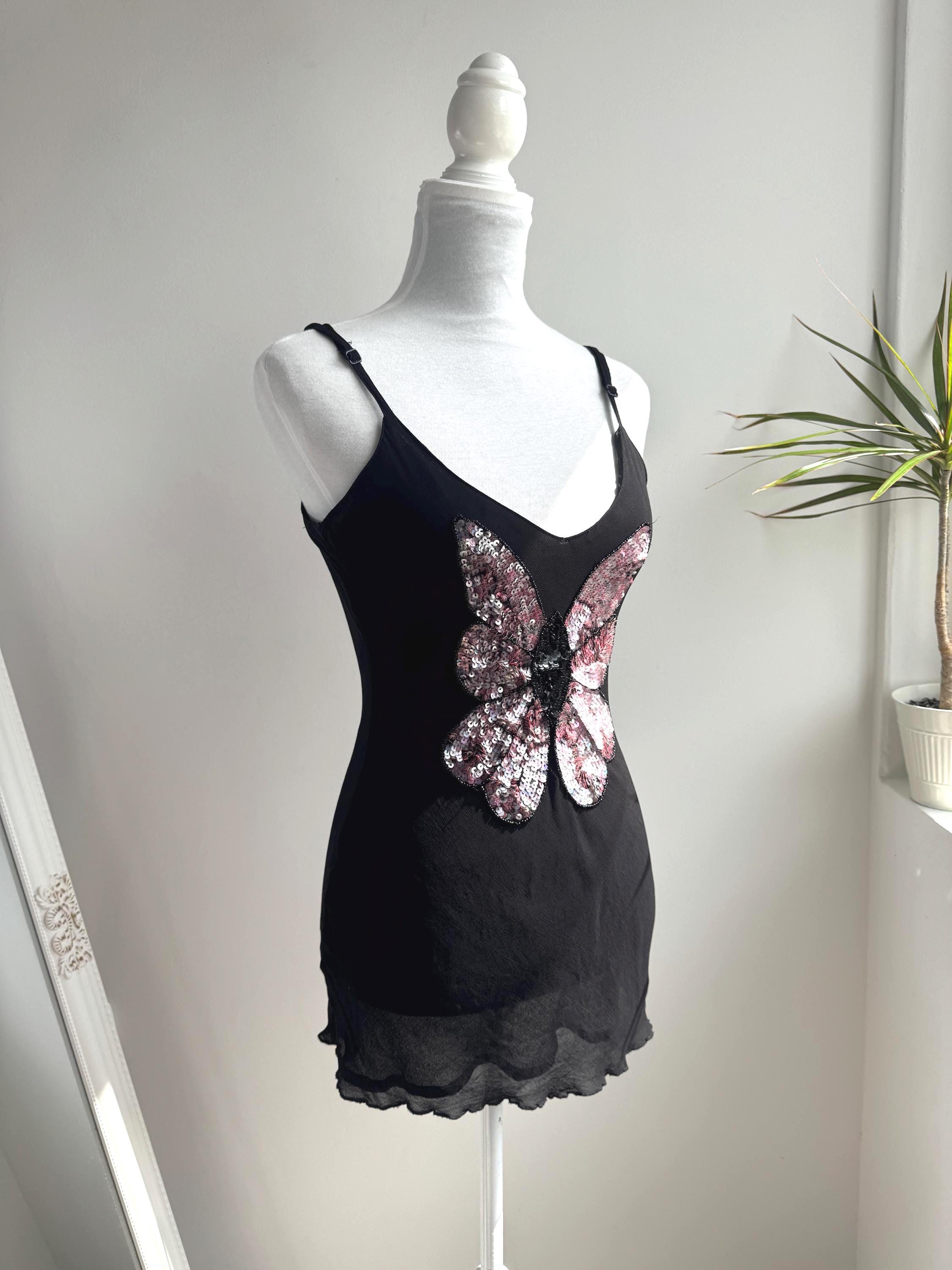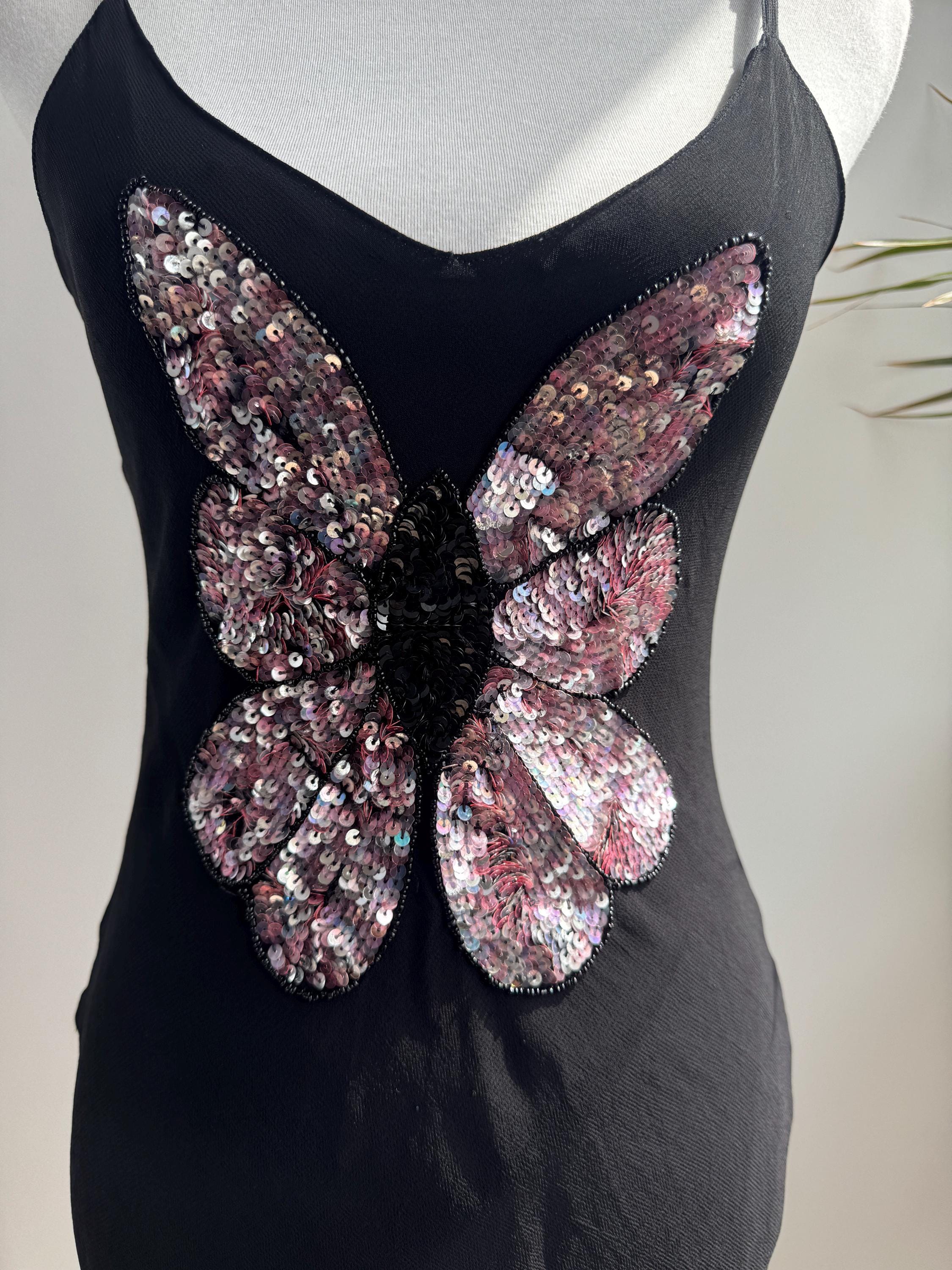 A beautiful late 90s to early 2000s piece that captures everything we love about Y2K fashion — maximalist embellishment, slip-inspired silhouettes, and that unmistakable butterfly motif that defined an era.