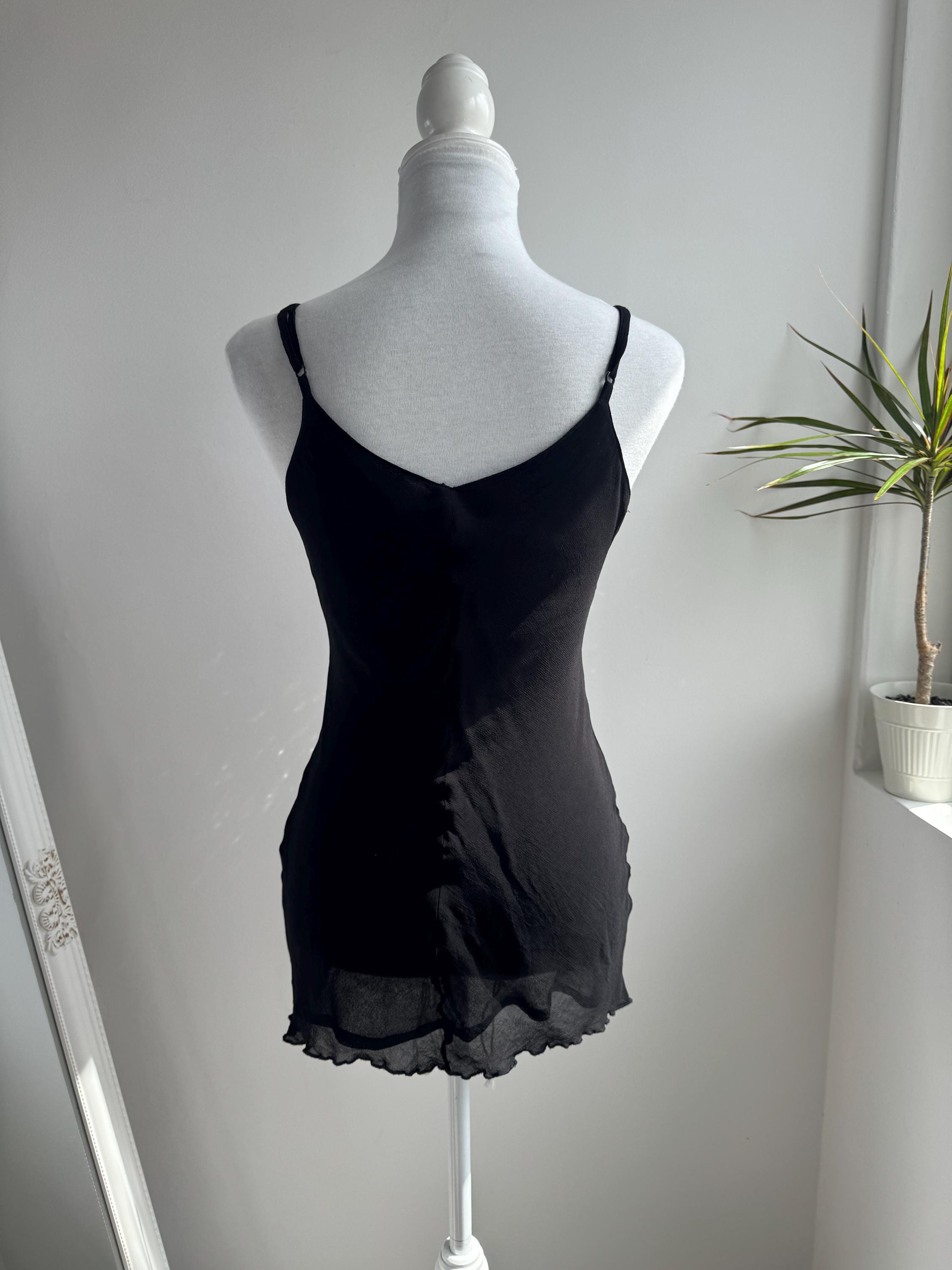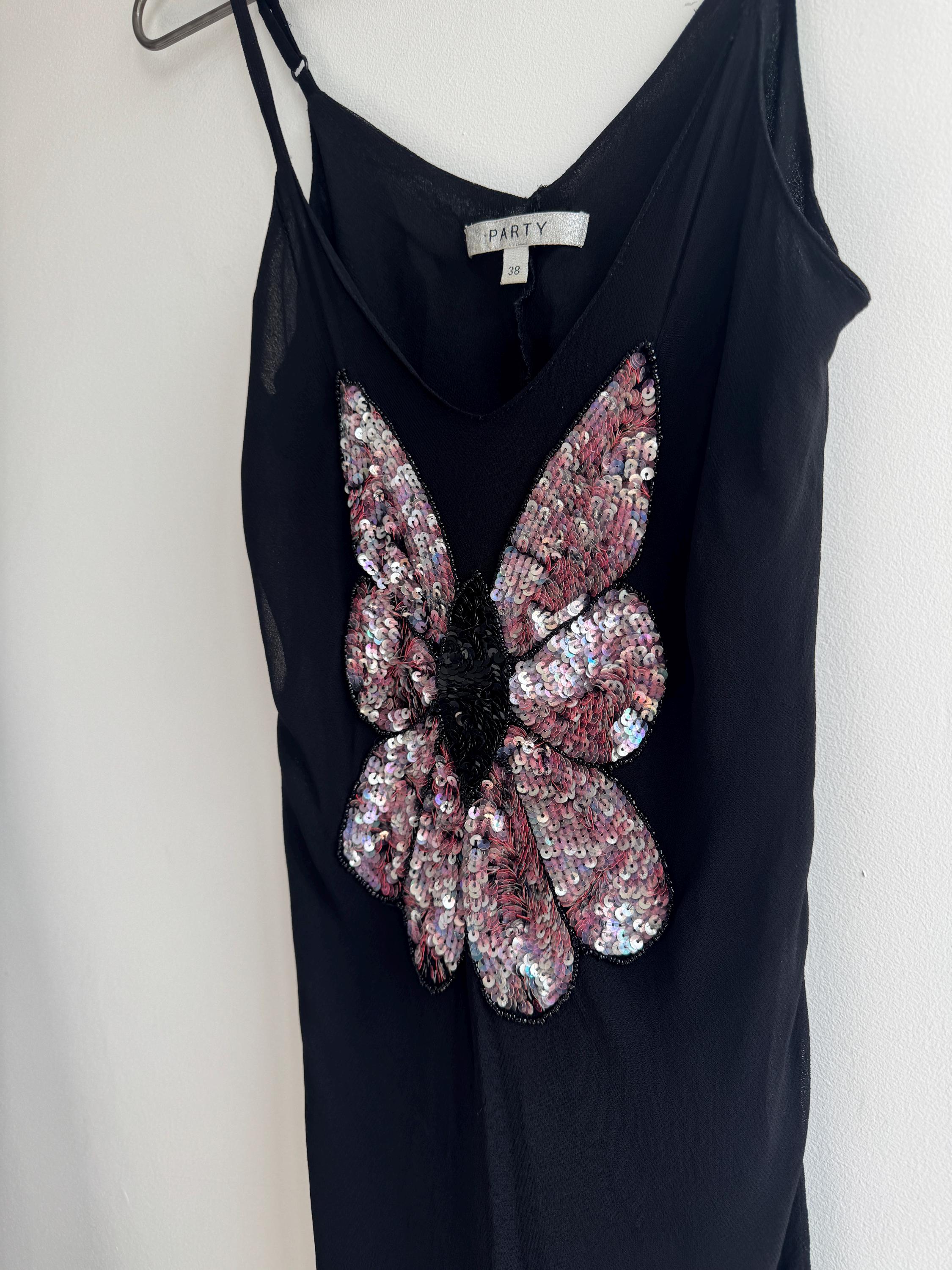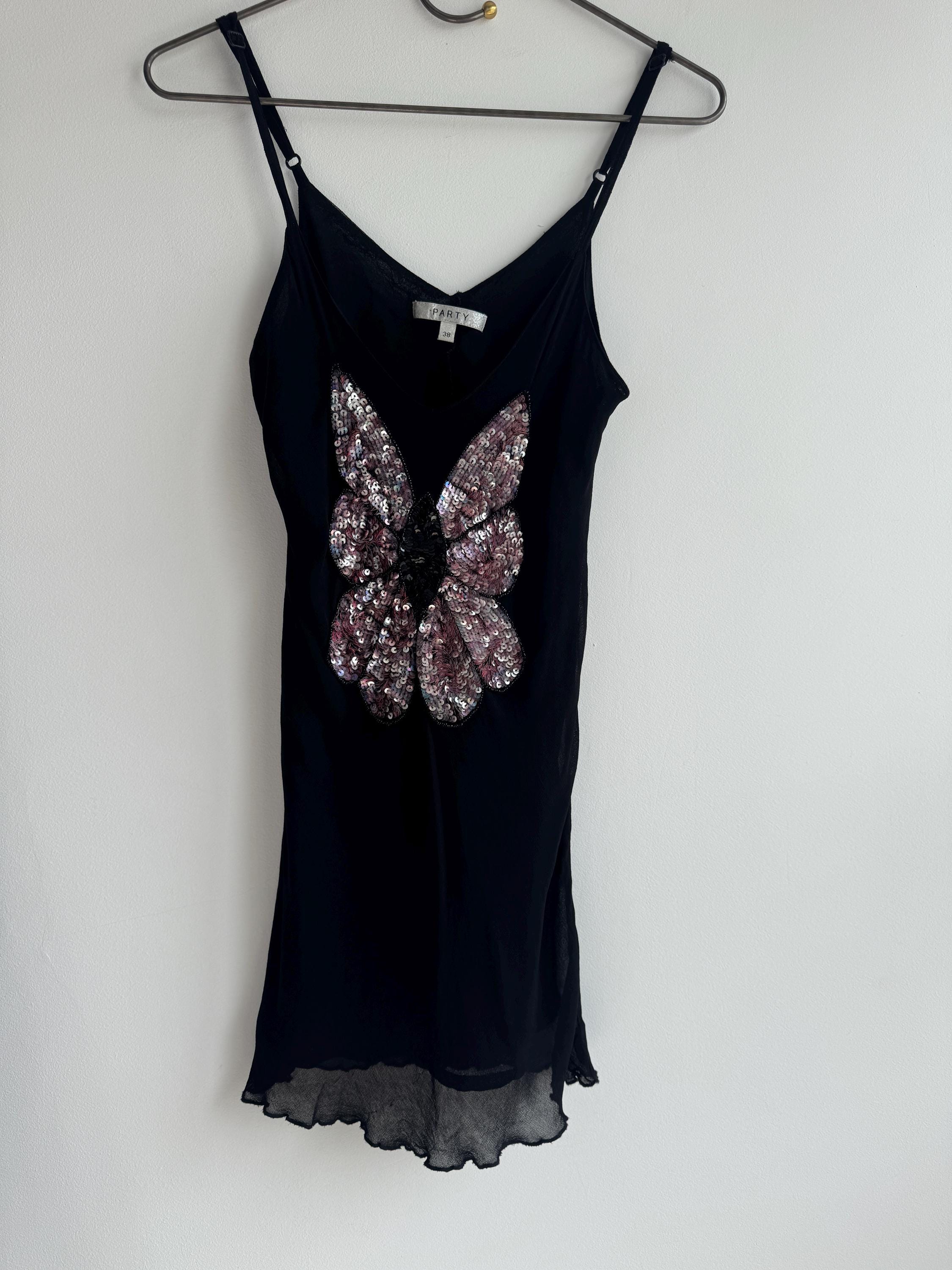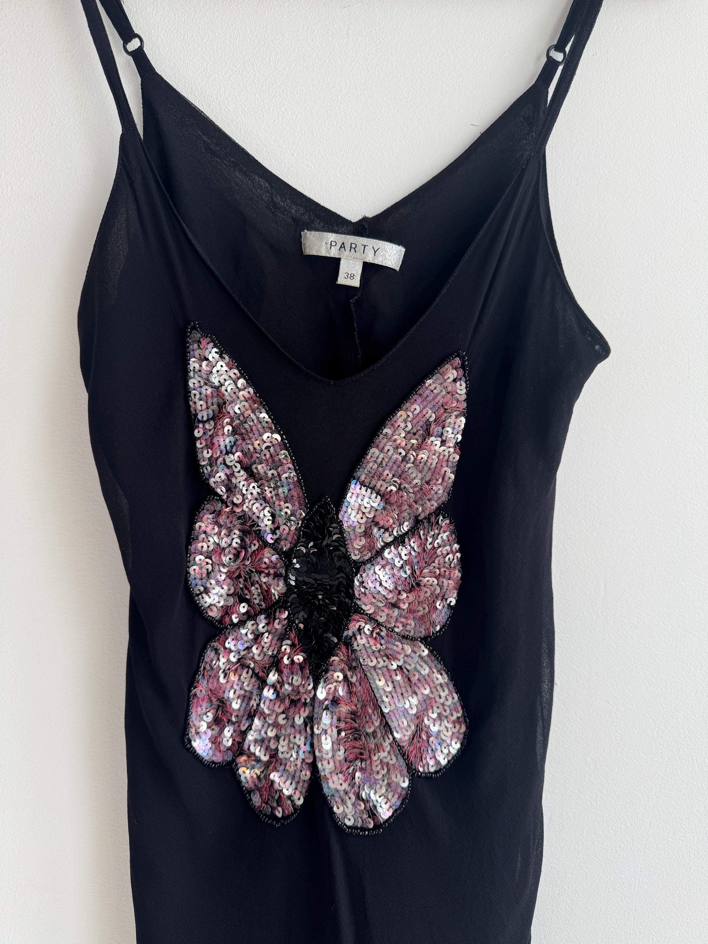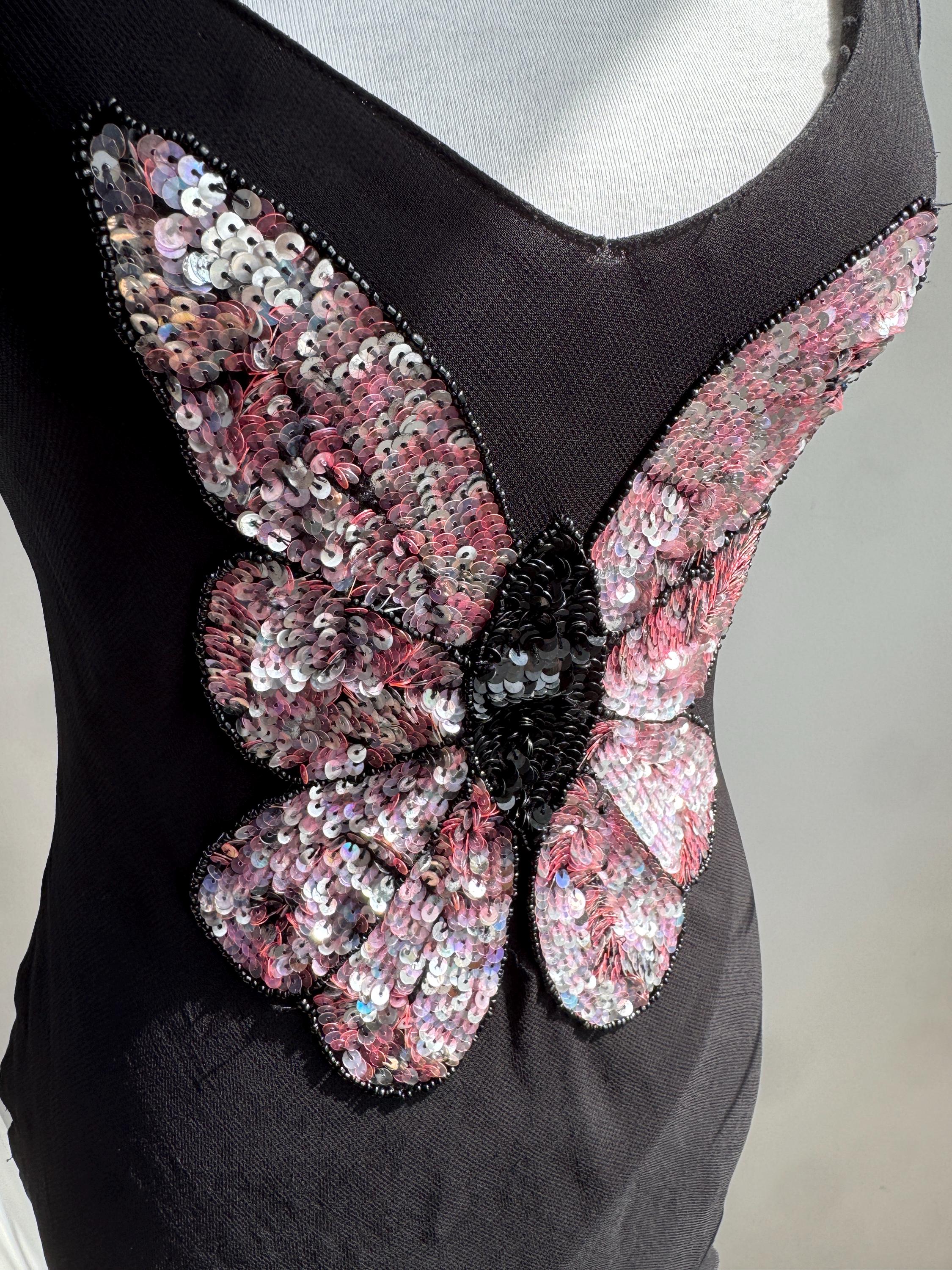 A beautiful late 90s to early 2000s piece that captures everything we love about Y2K fashion — maximalist embellishment, slip-inspired silhouettes, and that unmistakable butterfly motif that defined an era.
