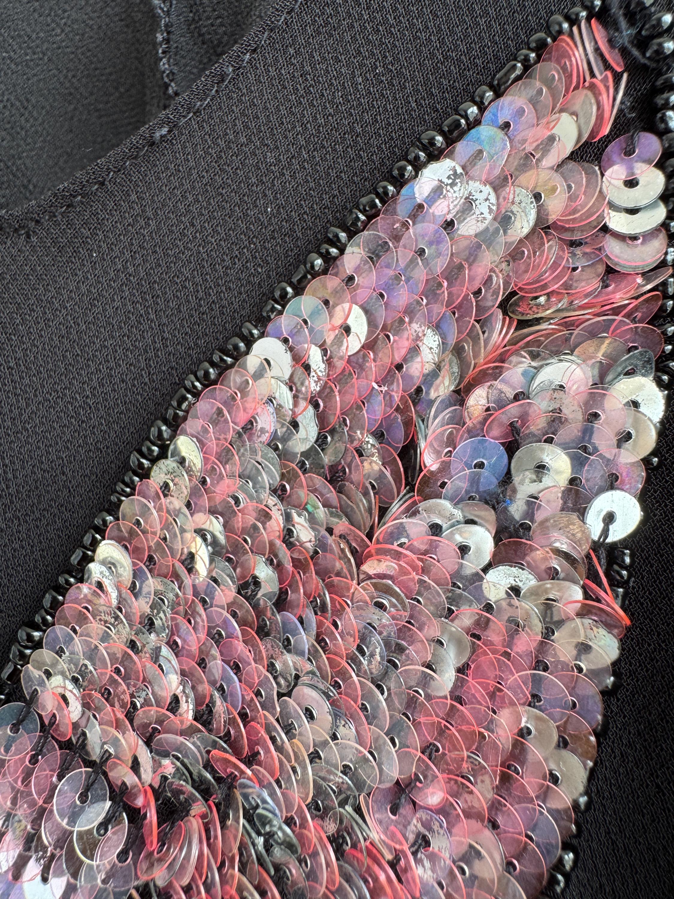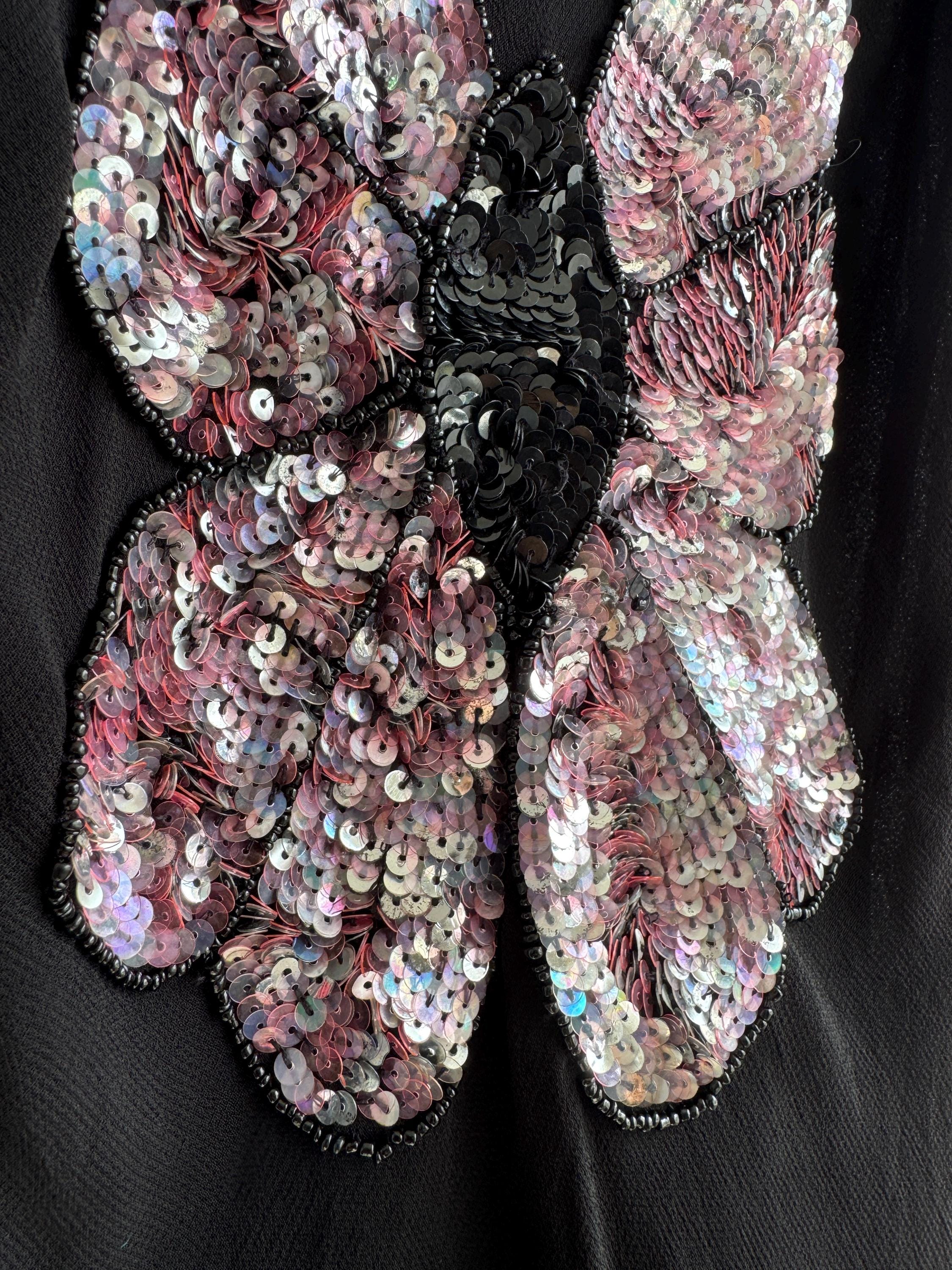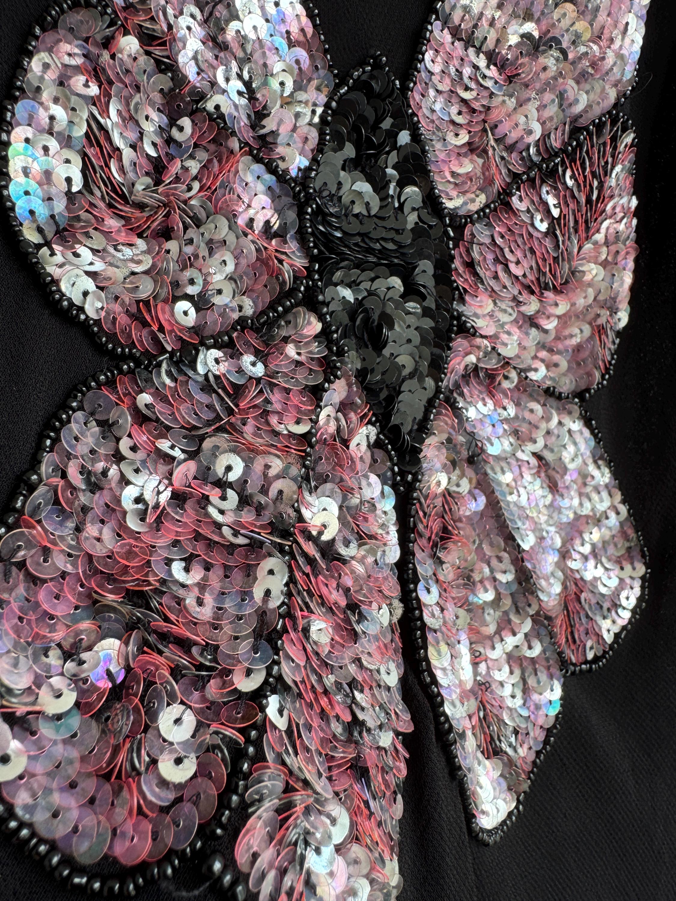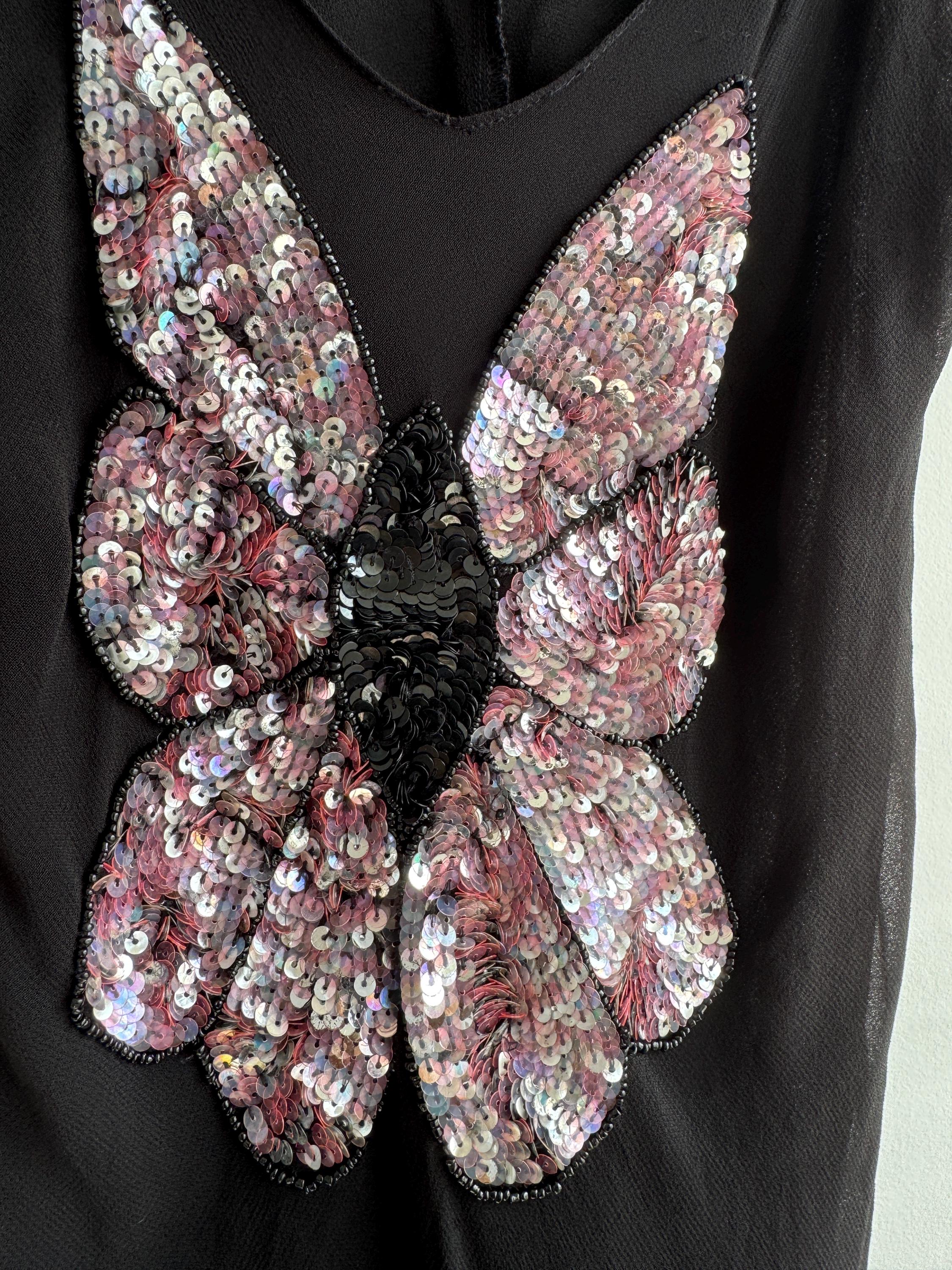 ✨ Condition: Very good pre-loved vintage condition. There are a couple of tiny pulled threads which look like fine bumps on the fabric at the front close to the bottom hemline and some minor scratches on the sequins only visible when you take a closer look - visible in close up photos — minor and barely noticeable when worn. All sequins are intact and the butterfly appliqué is in excellent condition.