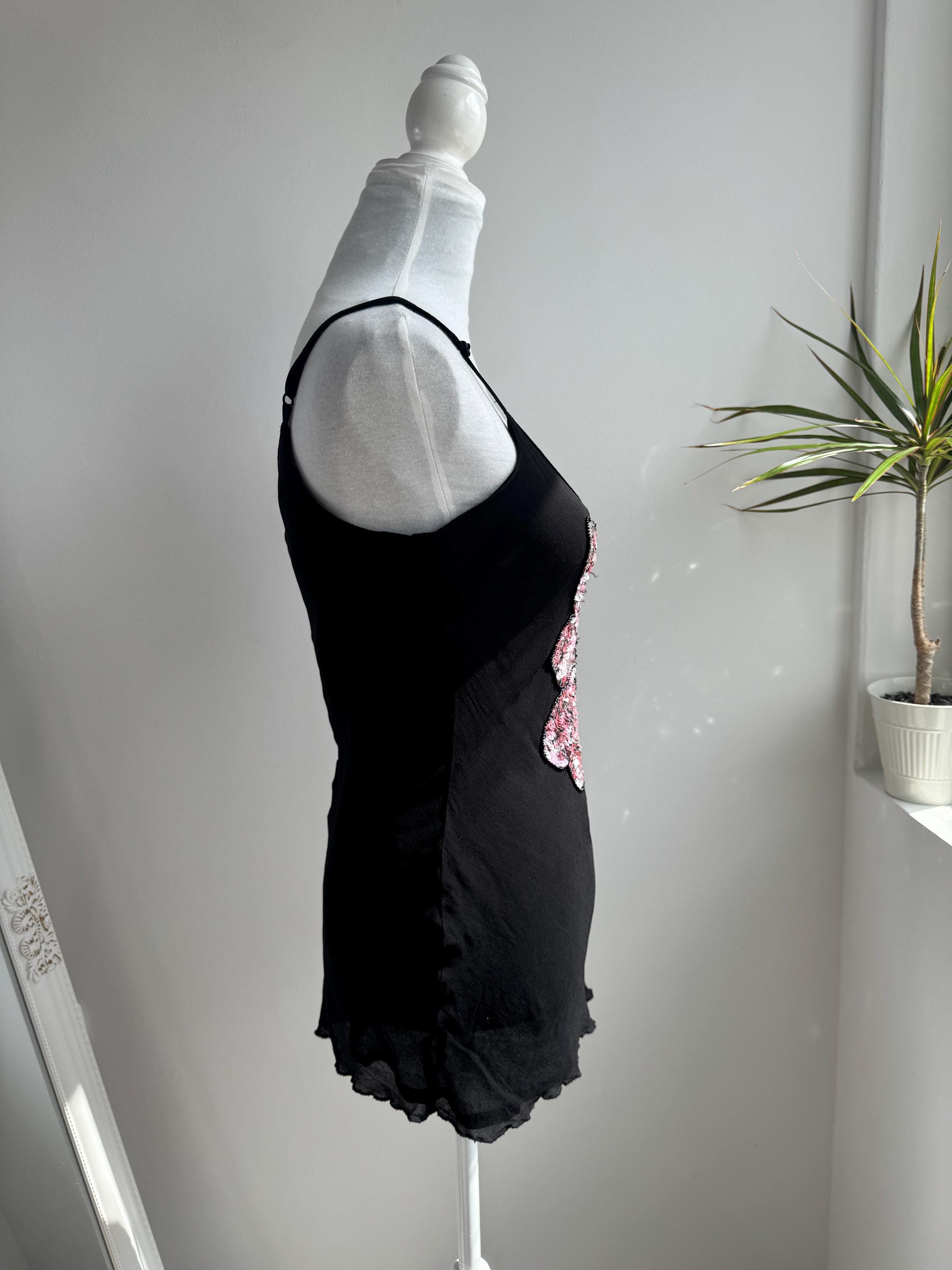 This striking black cami top is the kind of vintage find you just don't come across every day. Featuring a large iridescent pink and black sequin butterfly appliqué across the chest, it's bold, glamorous and effortlessly Y2K. Style it tucked into high-waisted jeans, layered under a blazer, or worn out on its own for a night out — this beaded cami top does all the talking.