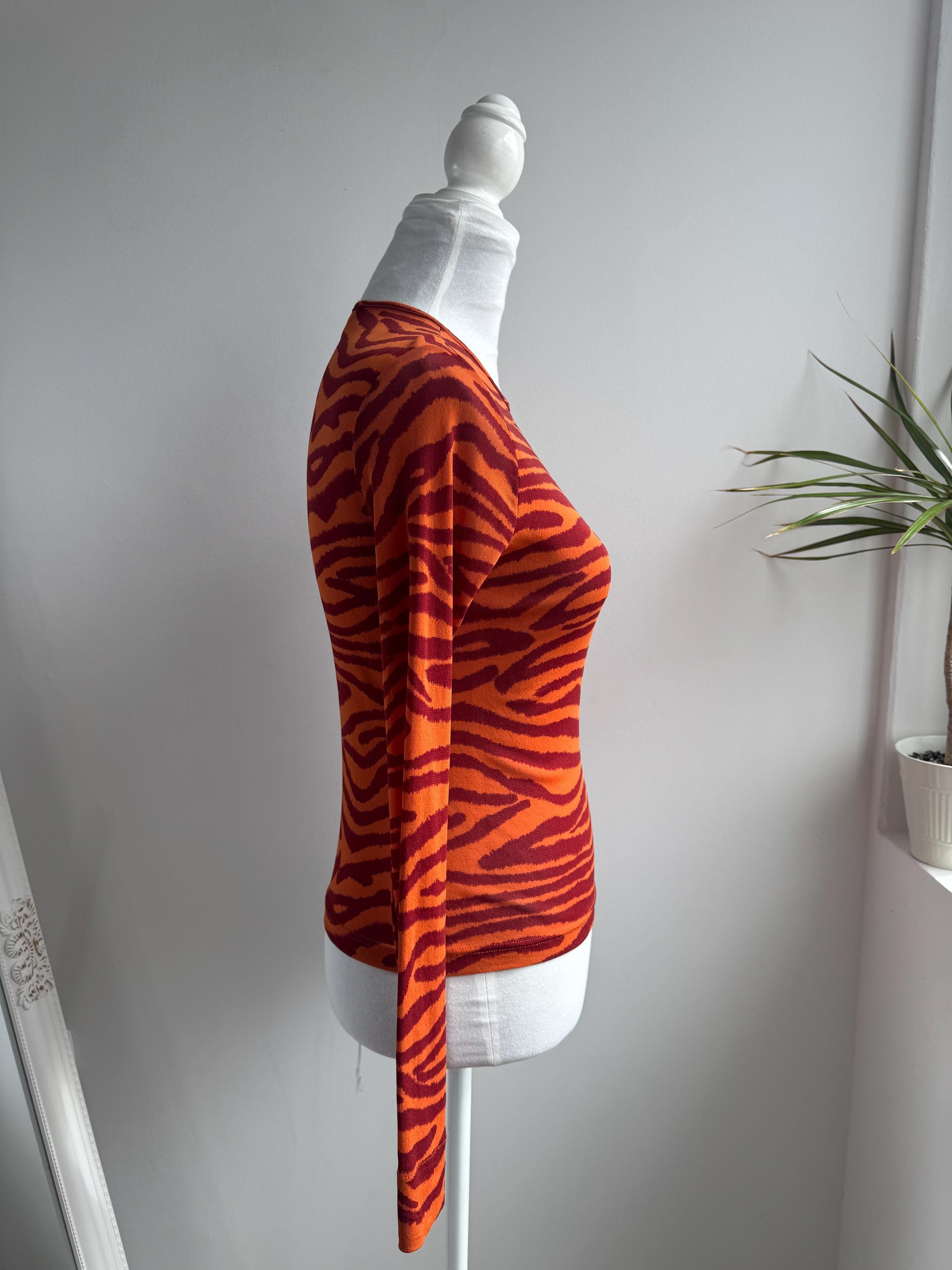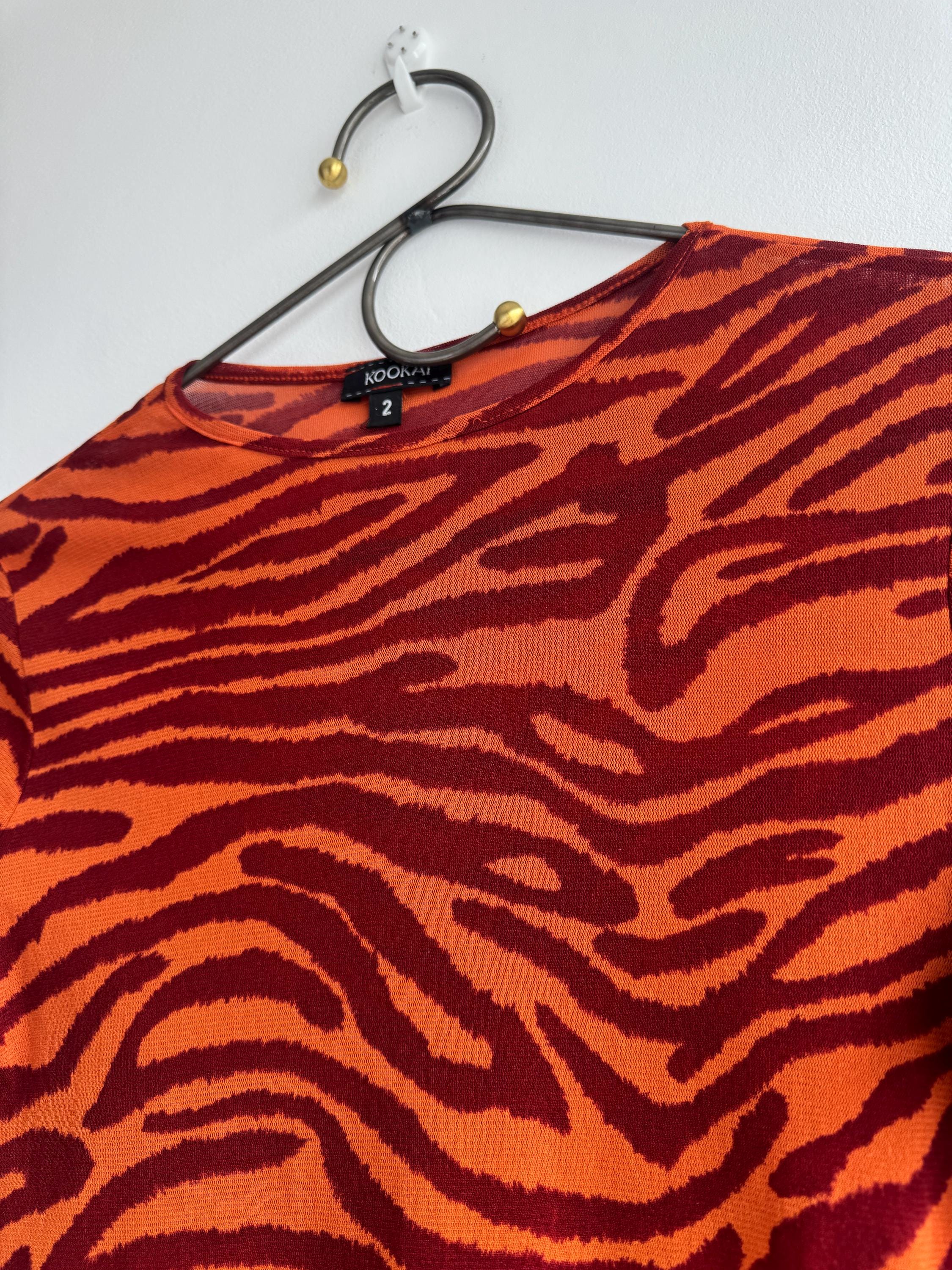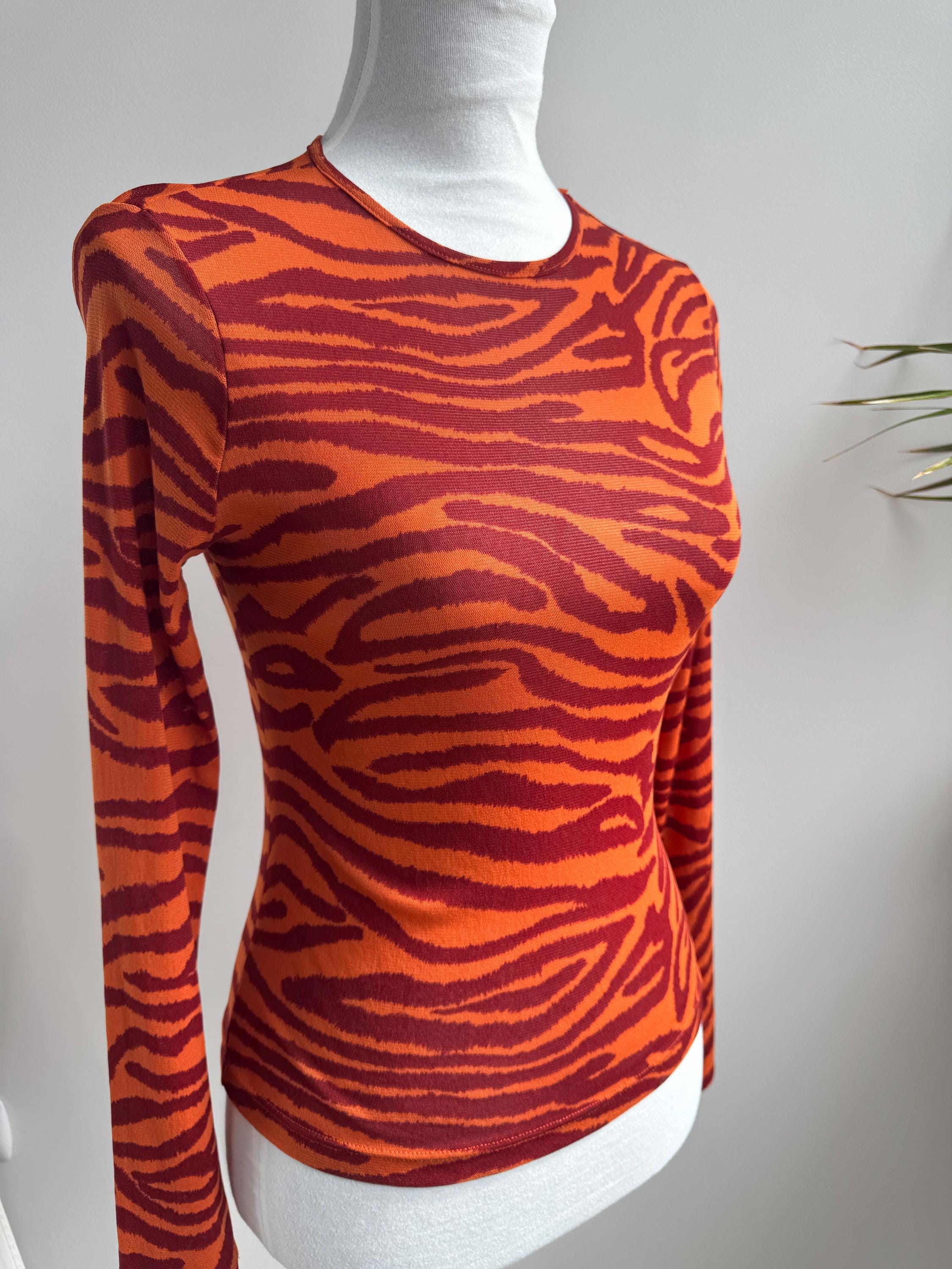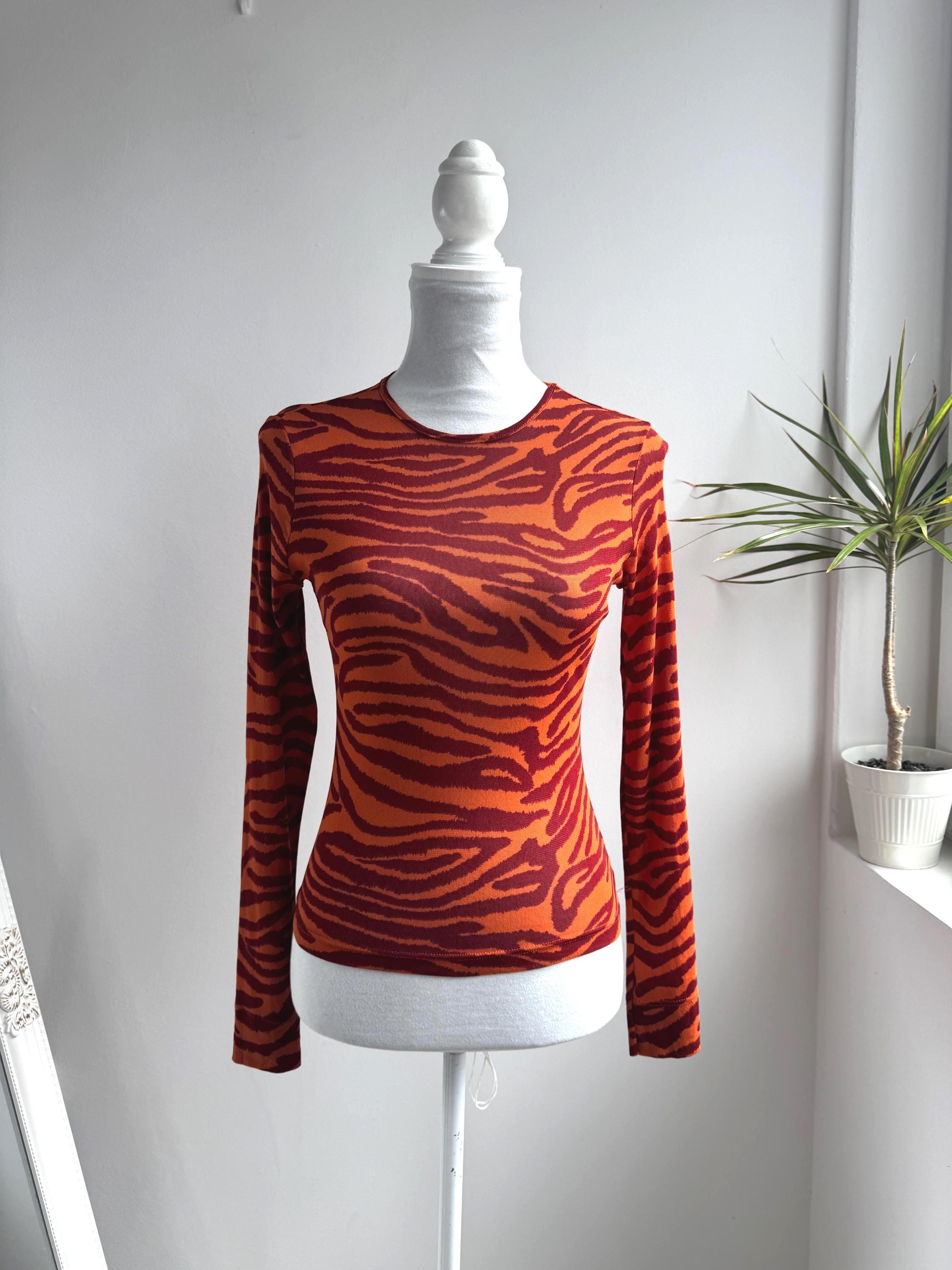 Step into the wild side of 90s and Y2K fashion with this striking Kookaï tiger print long sleeve top. Rendered in a vivid orange and deep burgundy red zebra-tiger stripe pattern, this eye-catching stretch mesh top is a true statement maker. The fabric hugs the body beautifully thanks to its stretchy 100% polyamide construction, making it ideal for tucking into high-waisted jeans, pairing with a tailored blazer, or layering under a slip dress for that classic Y2K aesthetic. Whether you're building a retro-inspired wardrobe or hunting for a rare French designer vintage find, this Kookaï top delivers on all fronts — bold colour, form-flattering silhouette, and that undeniable early 2000s energy that is very much back in style.
