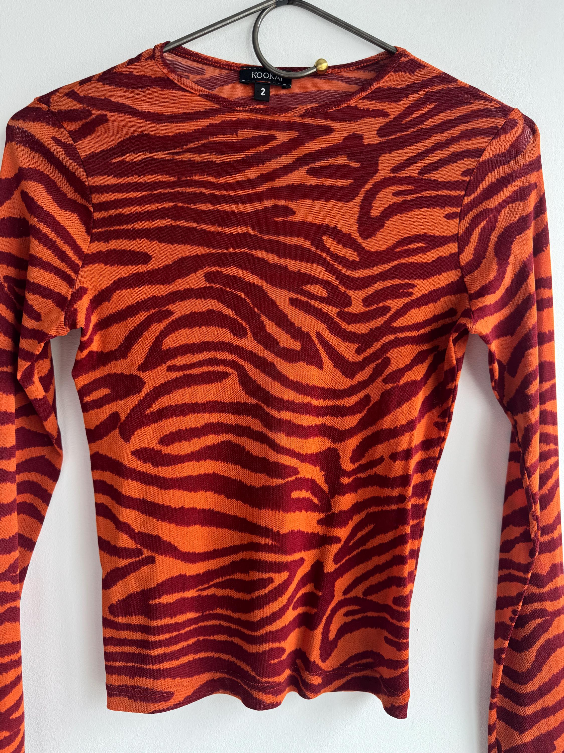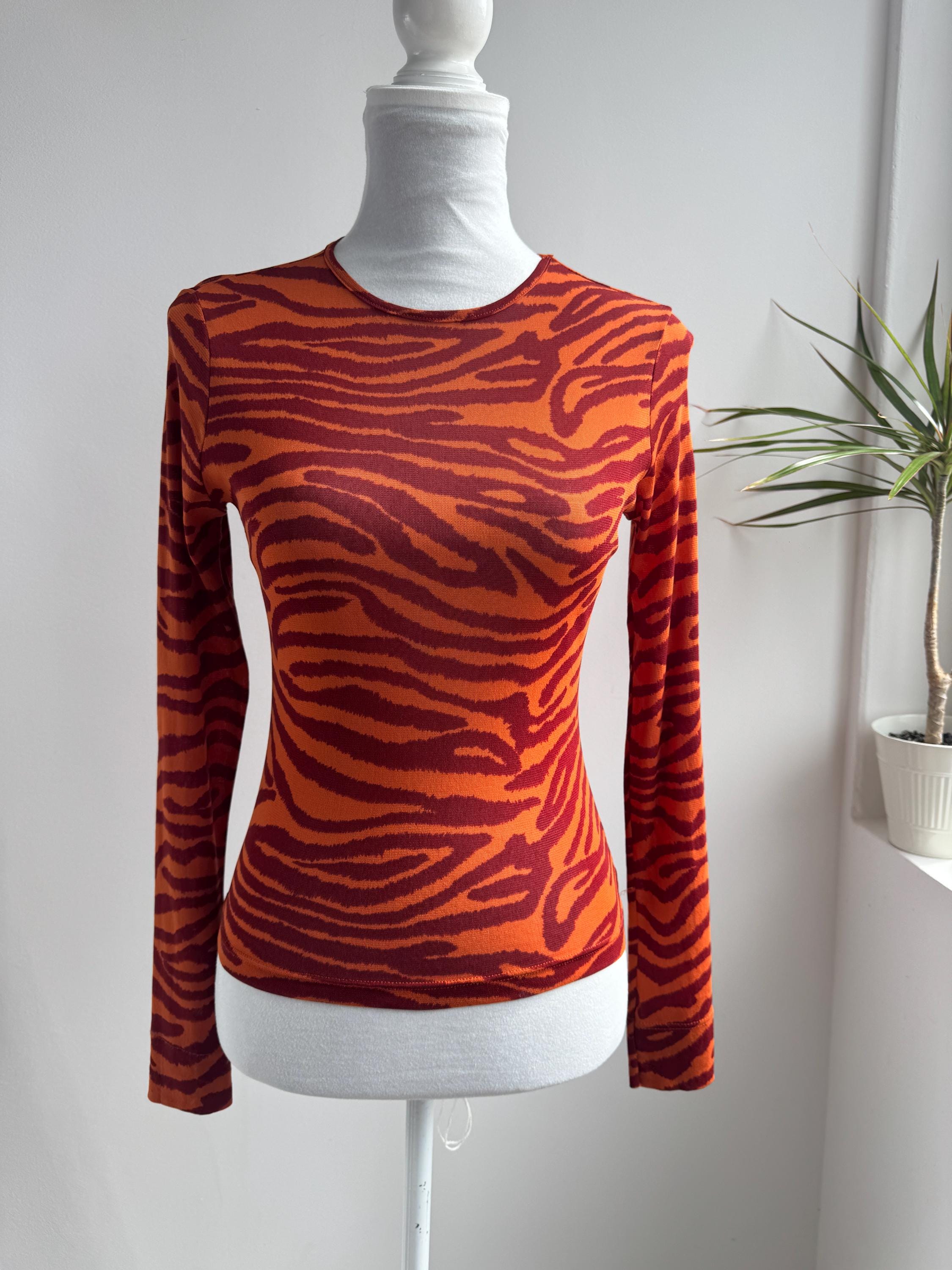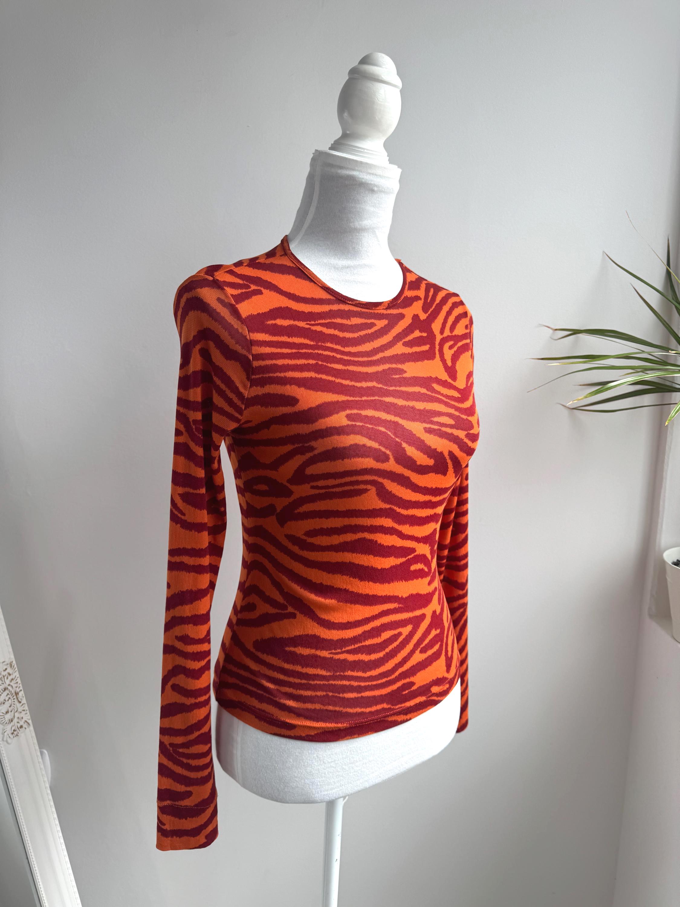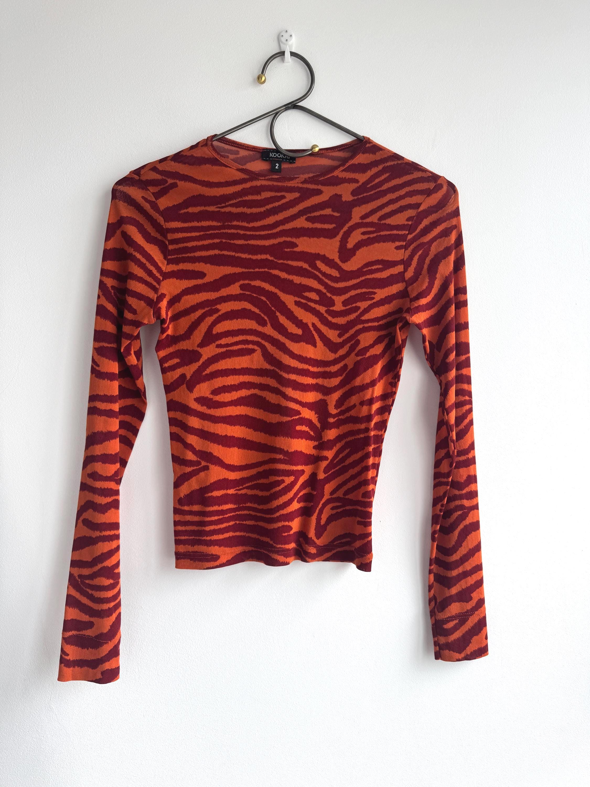 Step into the wild side of 90s and Y2K fashion with this striking Kookaï tiger print long sleeve top. Rendered in a vivid orange and deep burgundy red zebra-tiger stripe pattern, this eye-catching stretch mesh top is a true statement maker. The fabric hugs the body beautifully thanks to its stretchy 100% polyamide construction, making it ideal for tucking into high-waisted jeans, pairing with a tailored blazer, or layering under a slip dress for that classic Y2K aesthetic. Whether you're building a retro-inspired wardrobe or hunting for a rare French designer vintage find, this Kookaï top delivers on all fronts — bold colour, form-flattering silhouette, and that undeniable early 2000s energy that is very much back in style.