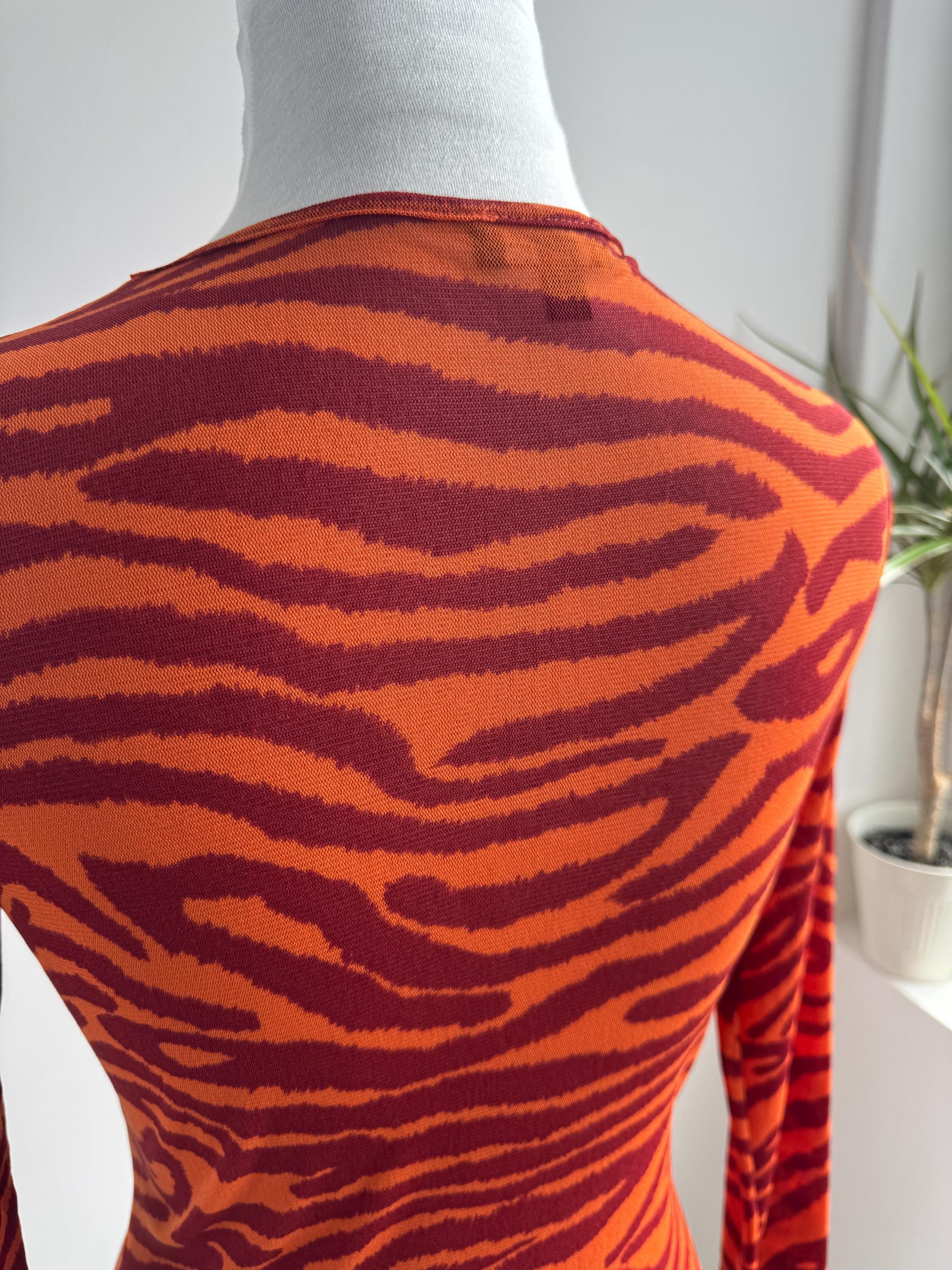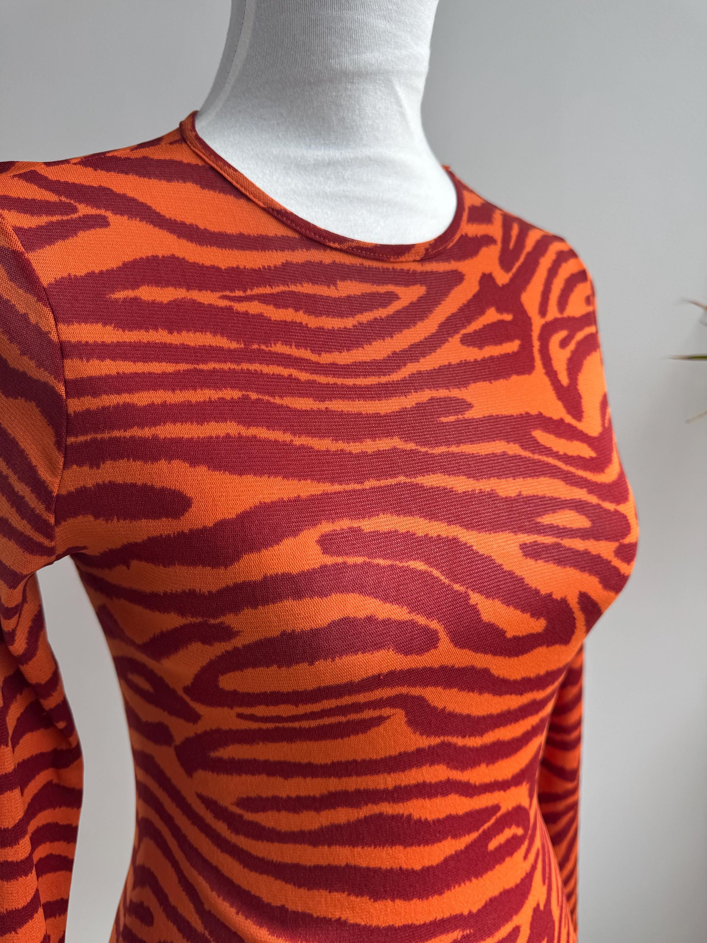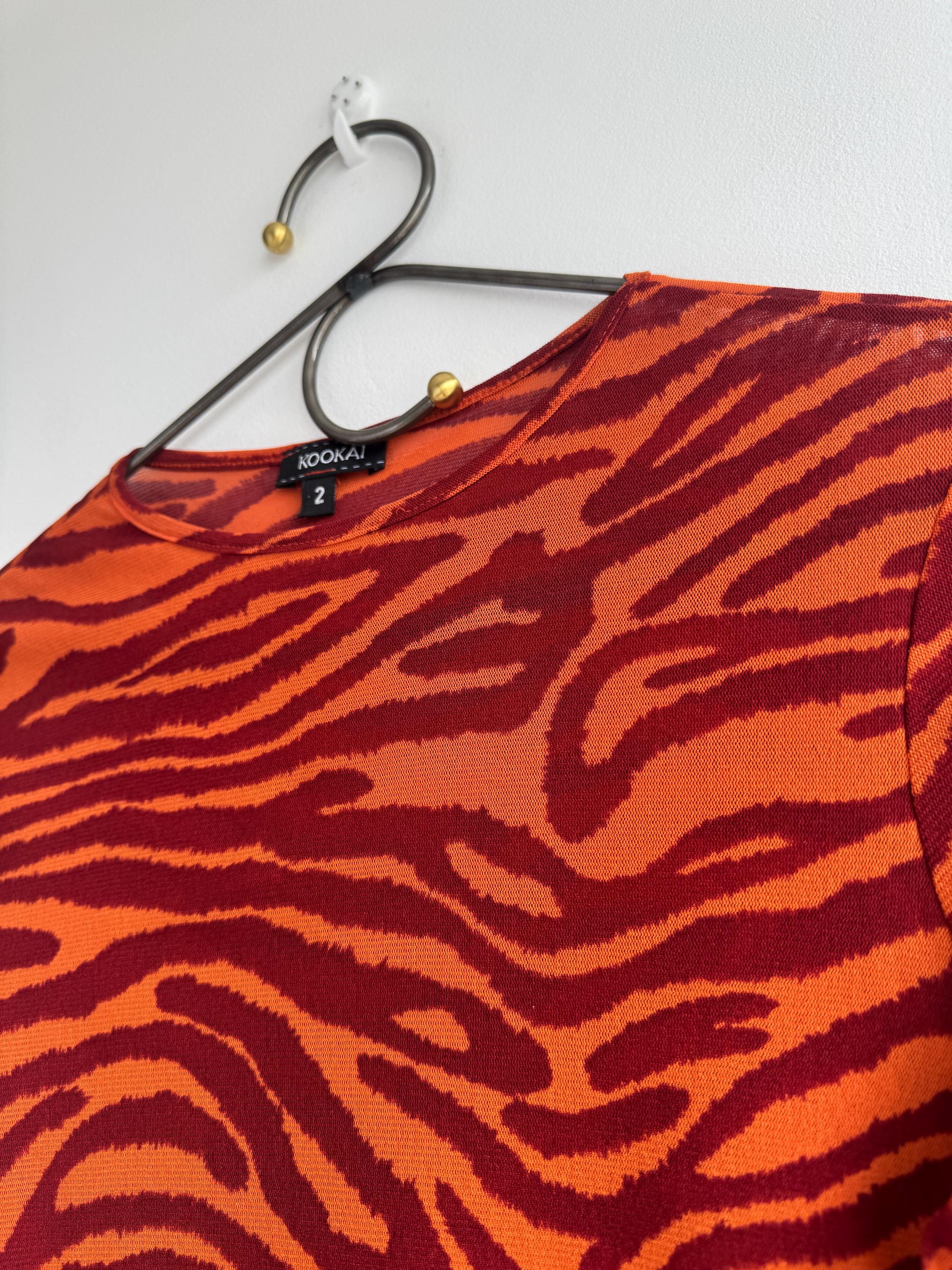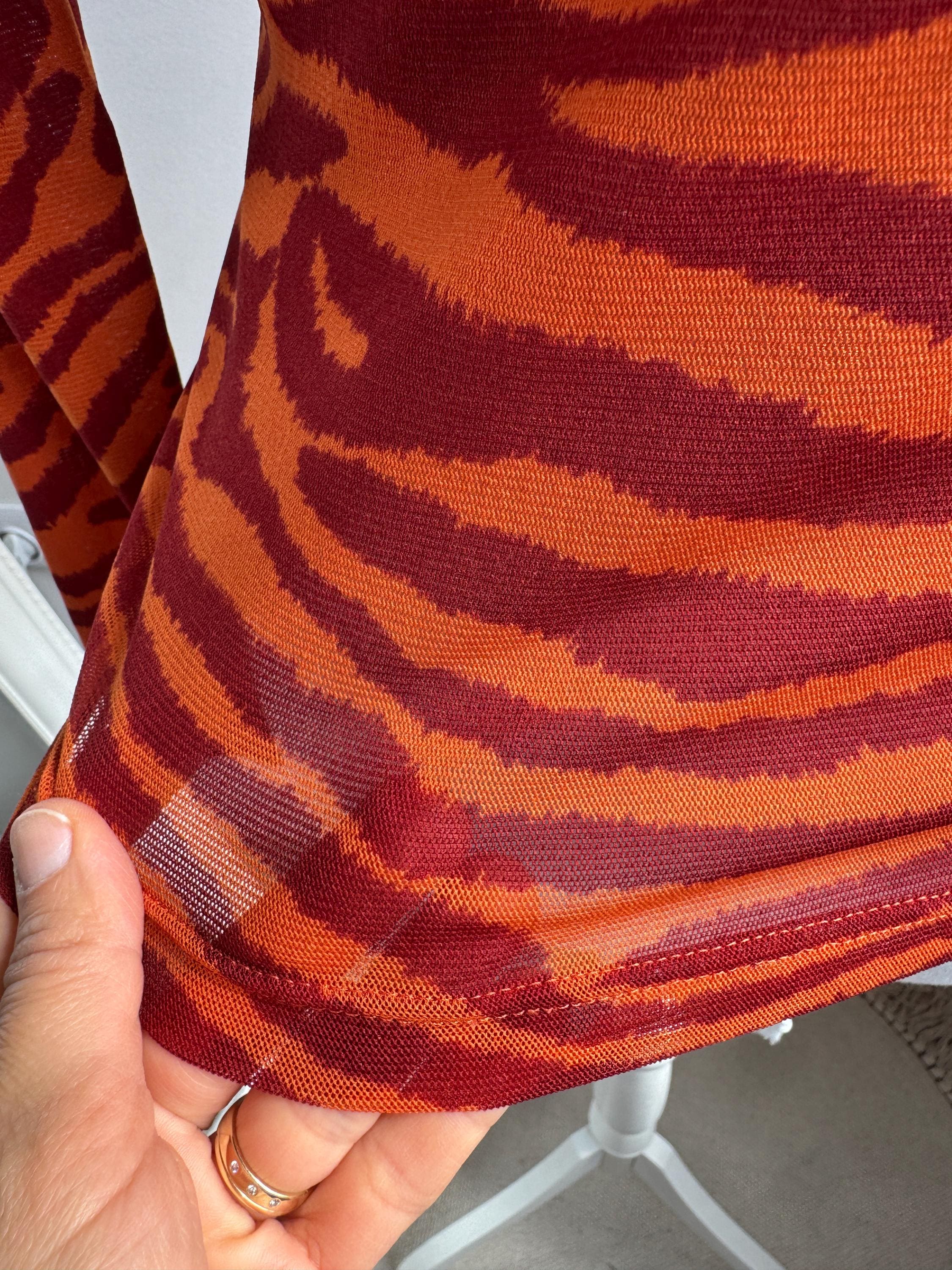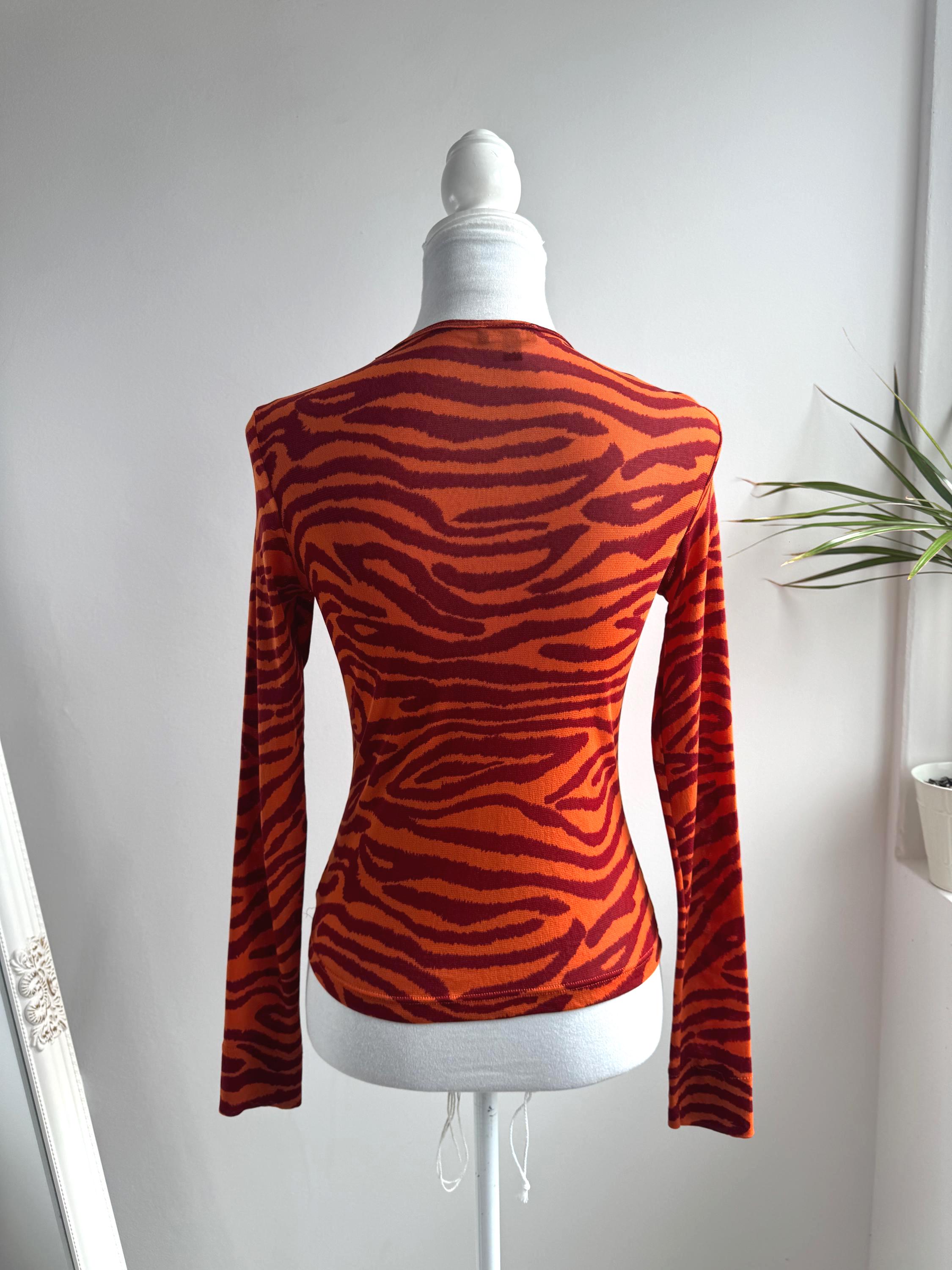 Step into the wild side of 90s and Y2K fashion with this striking Kookaï tiger print long sleeve top. Rendered in a vivid orange and deep burgundy red zebra-tiger stripe pattern, this eye-catching stretch mesh top is a true statement maker. The fabric hugs the body beautifully thanks to its stretchy 100% polyamide construction, making it ideal for tucking into high-waisted jeans, pairing with a tailored blazer, or layering under a slip dress for that classic Y2K aesthetic. Whether you're building a retro-inspired wardrobe or hunting for a rare French designer vintage find, this Kookaï top delivers on all fronts — bold colour, form-flattering silhouette, and that undeniable early 2000s energy that is very much back in style.