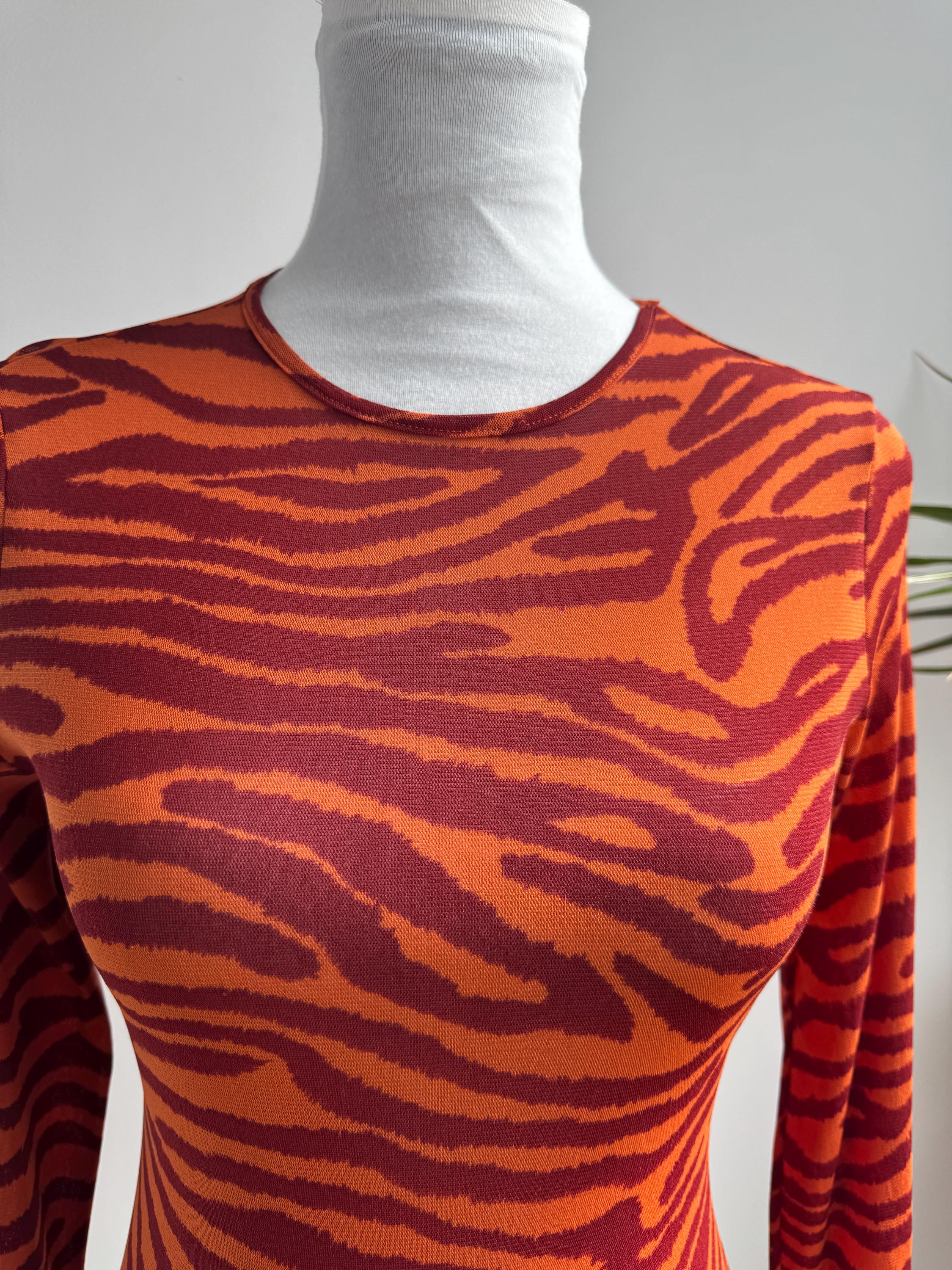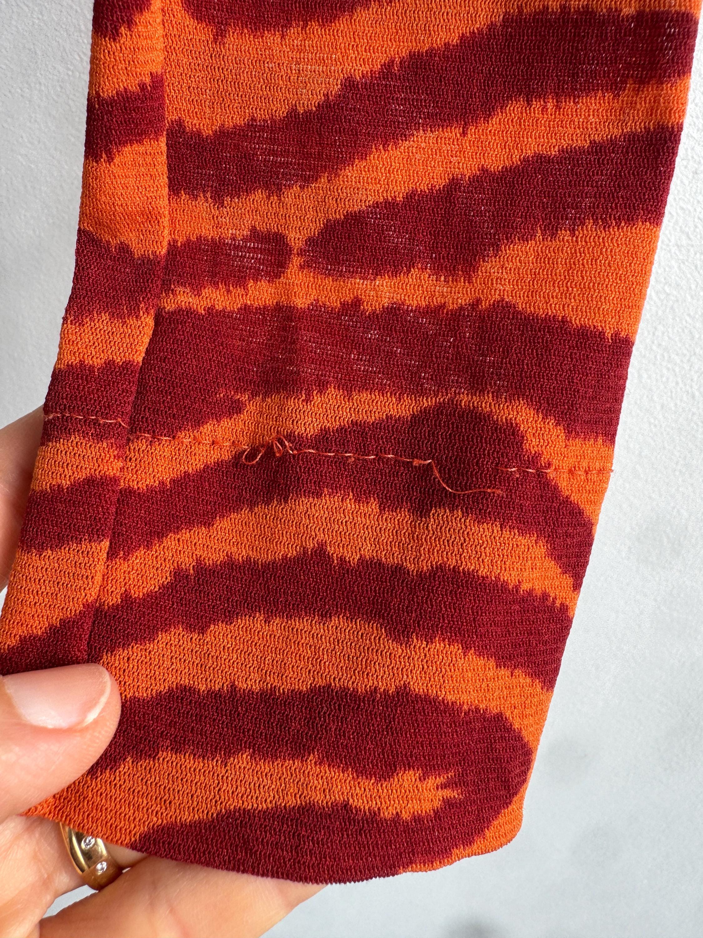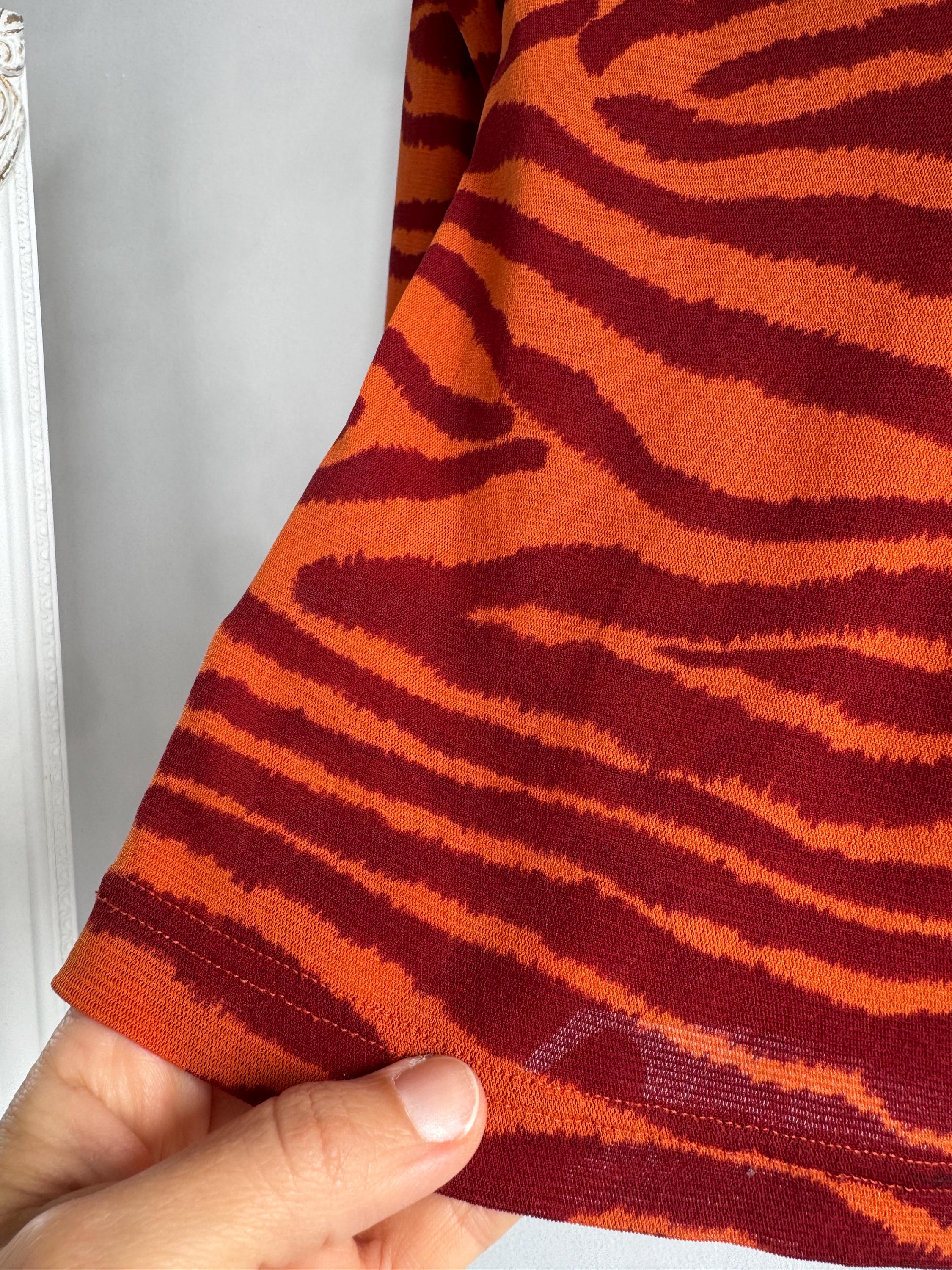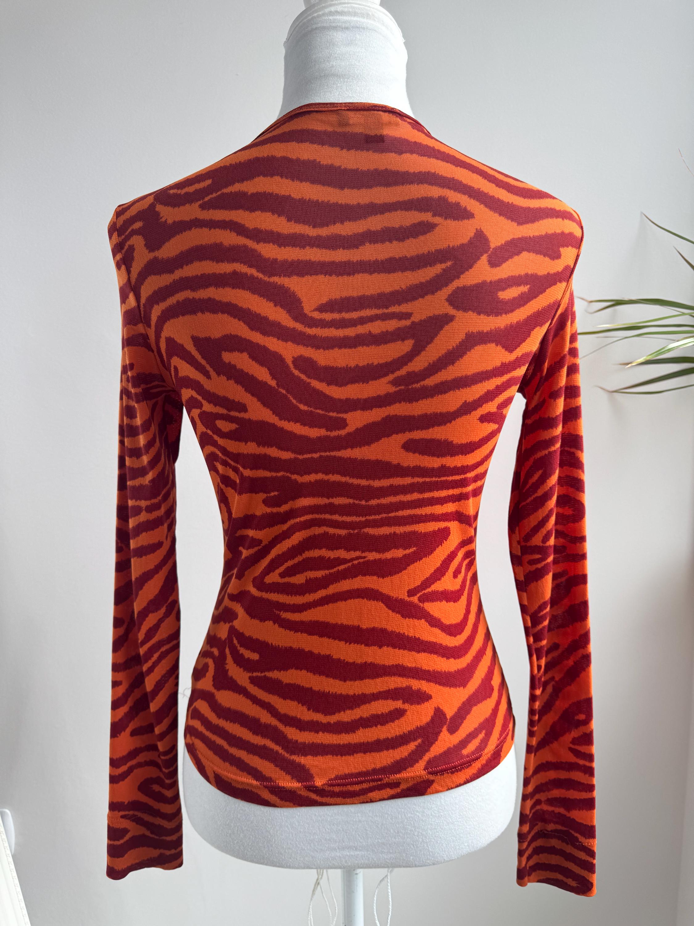 Step into the wild side of 90s and Y2K fashion with this striking Kookaï tiger print long sleeve top. Rendered in a vivid orange and deep burgundy red zebra-tiger stripe pattern, this eye-catching stretch mesh top is a true statement maker. The fabric hugs the body beautifully thanks to its stretchy 100% polyamide construction, making it ideal for tucking into high-waisted jeans, pairing with a tailored blazer, or layering under a slip dress for that classic Y2K aesthetic. Whether you're building a retro-inspired wardrobe or hunting for a rare French designer vintage find, this Kookaï top delivers on all fronts — bold colour, form-flattering silhouette, and that undeniable early 2000s energy that is very much back in style.