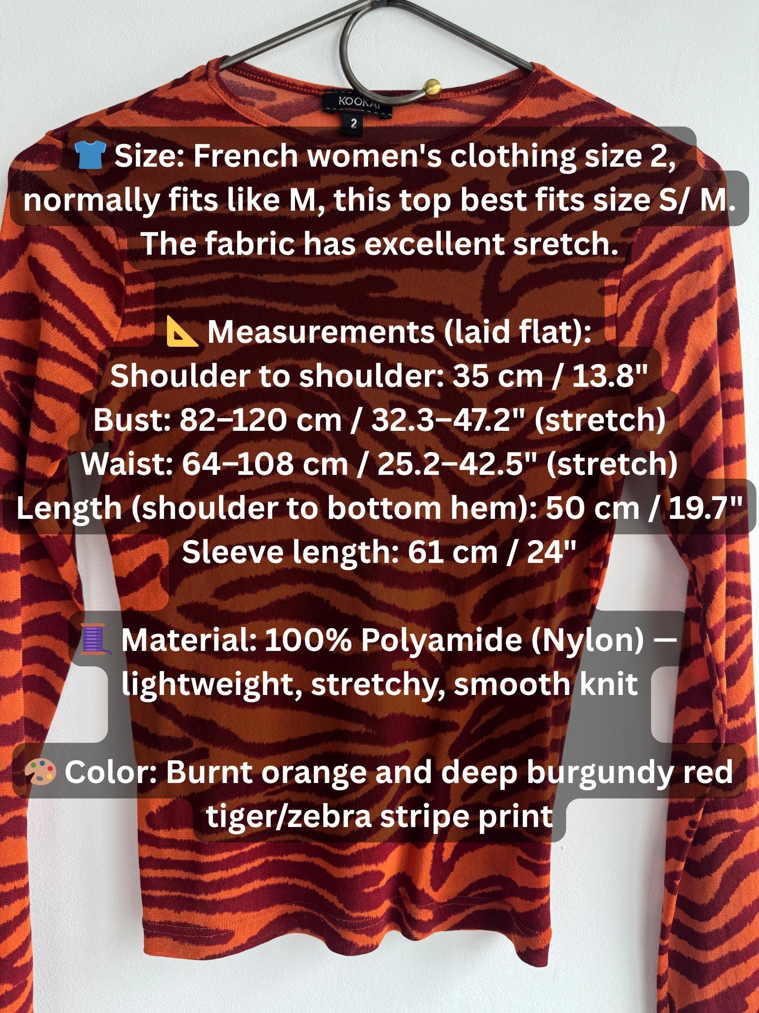 👕 Size: French women's clothing size 2, normally fits like M, this top best fits size S/ M. The fabric has excellent sretch.