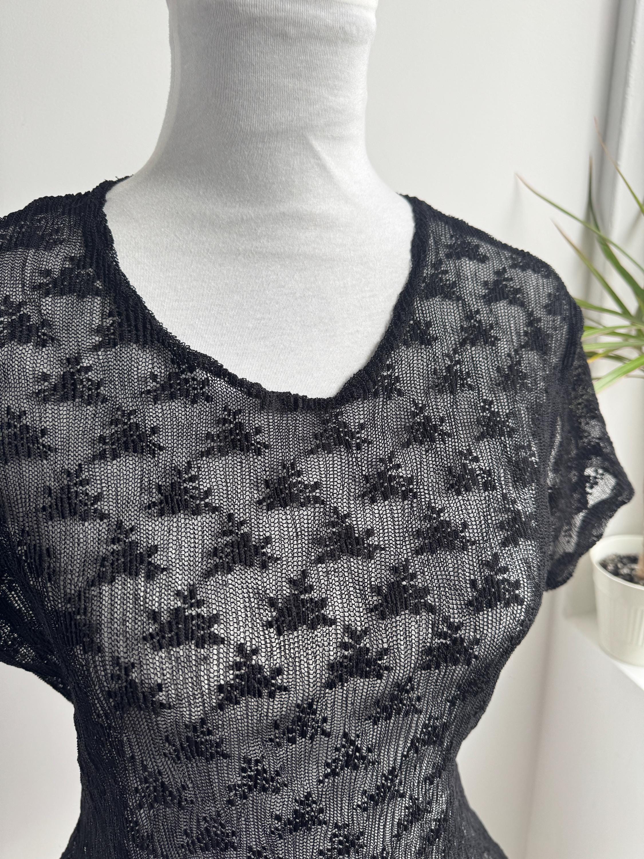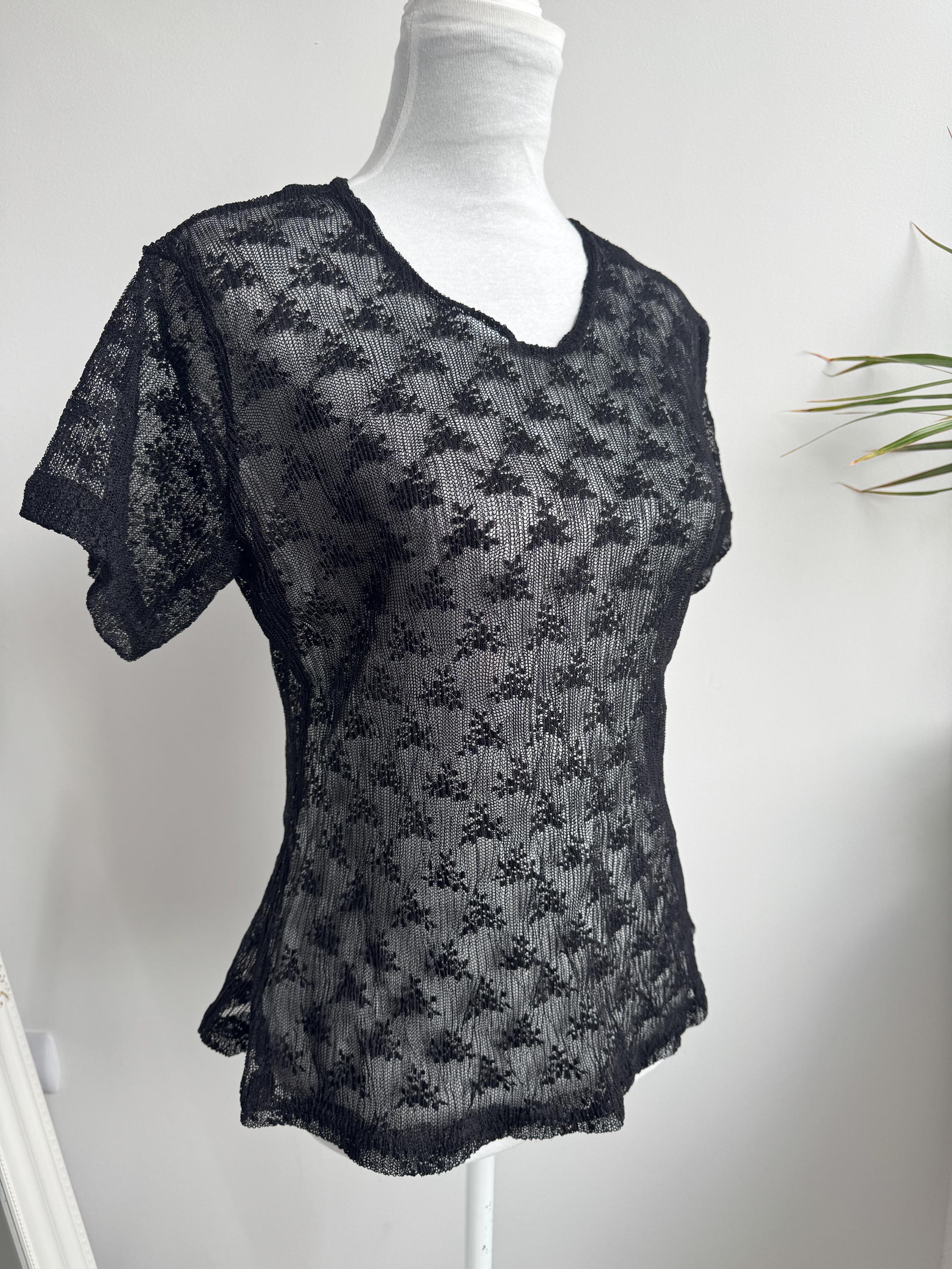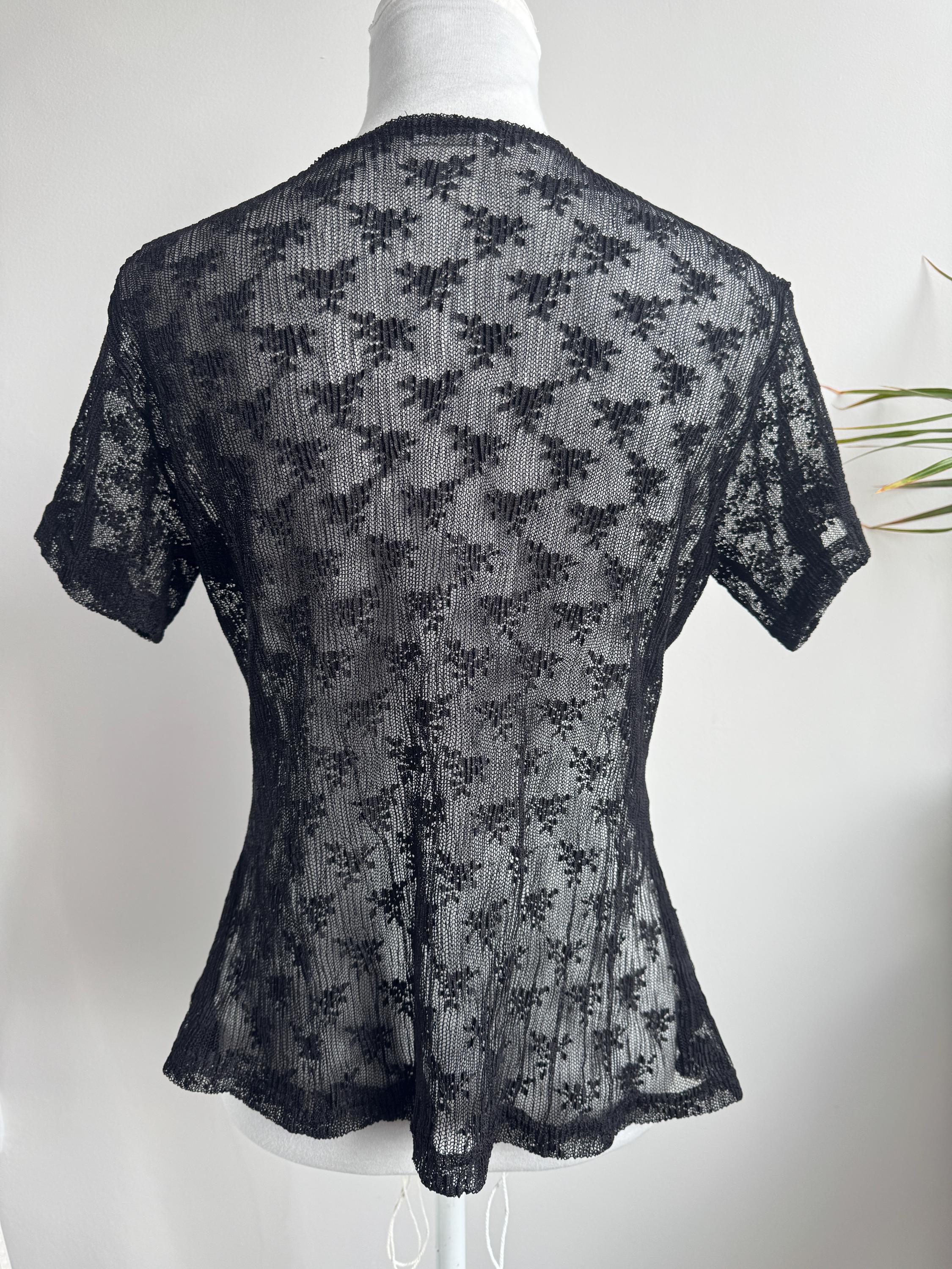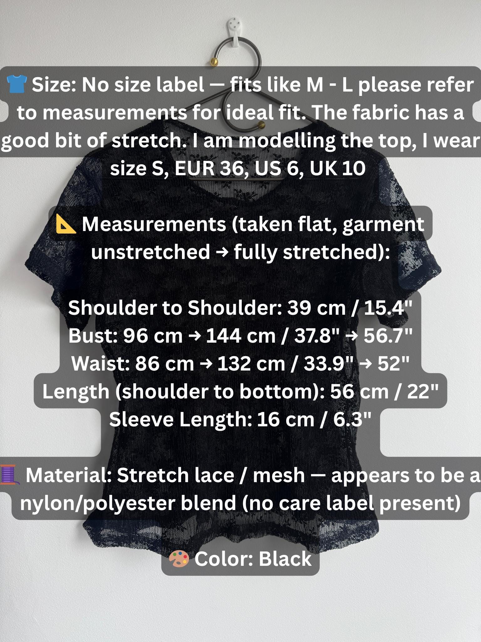 This gorgeous black lace top is the kind of piece that makes a whole outfit effortlessly. Featuring a delicate floral lace pattern throughout, sheer mesh sleeves and a sheer bodice with a beautiful textured, this top strikes the perfect balance between feminine and edgy. The slightly flared peplum-style hem gives it a flattering silhouette that works beautifully tucked into high-waisted jeans or layered over a slip dress or cami. A true 90s and Y2K fashion gem that feels completely at home in today's wardrobe.