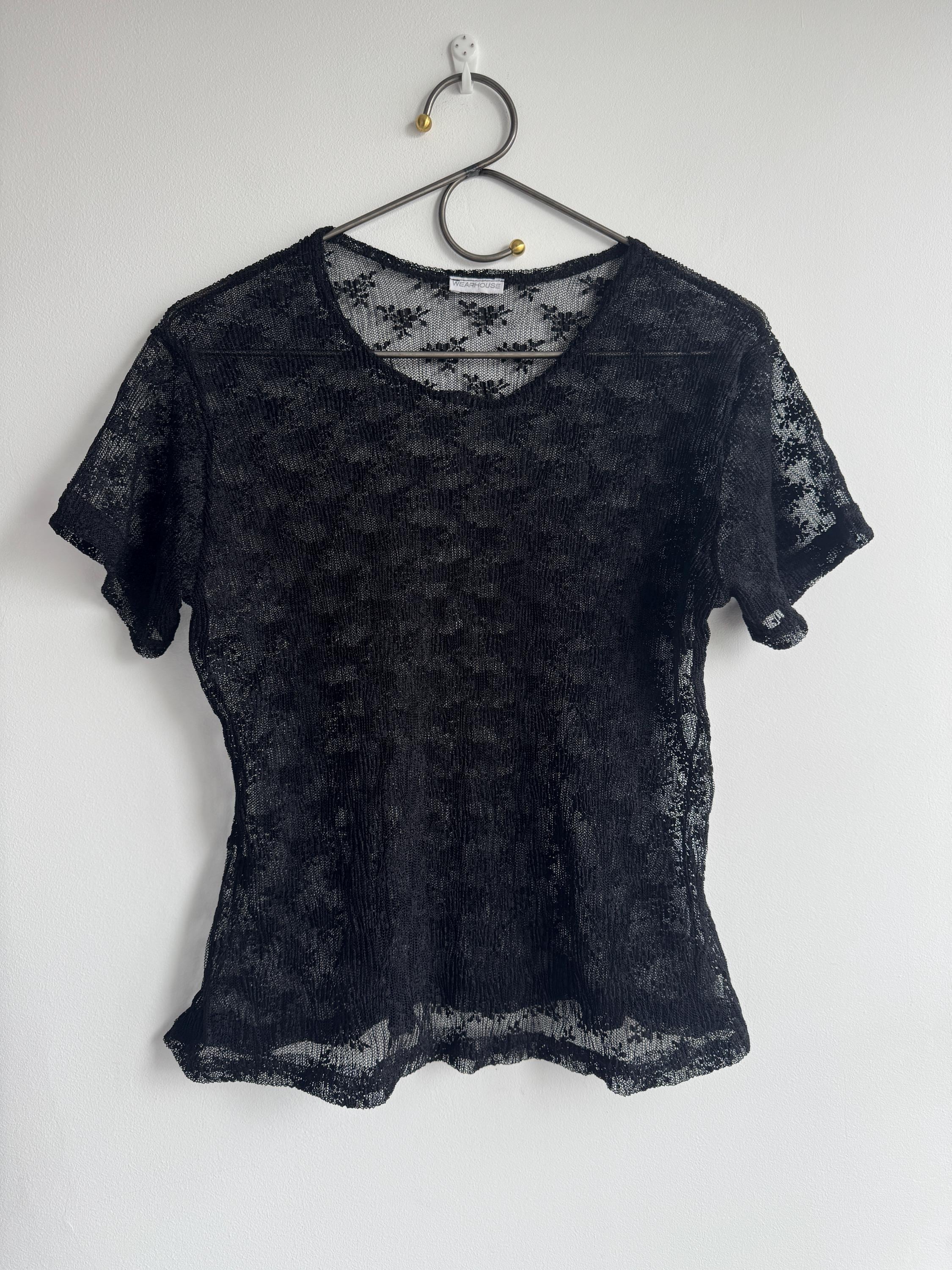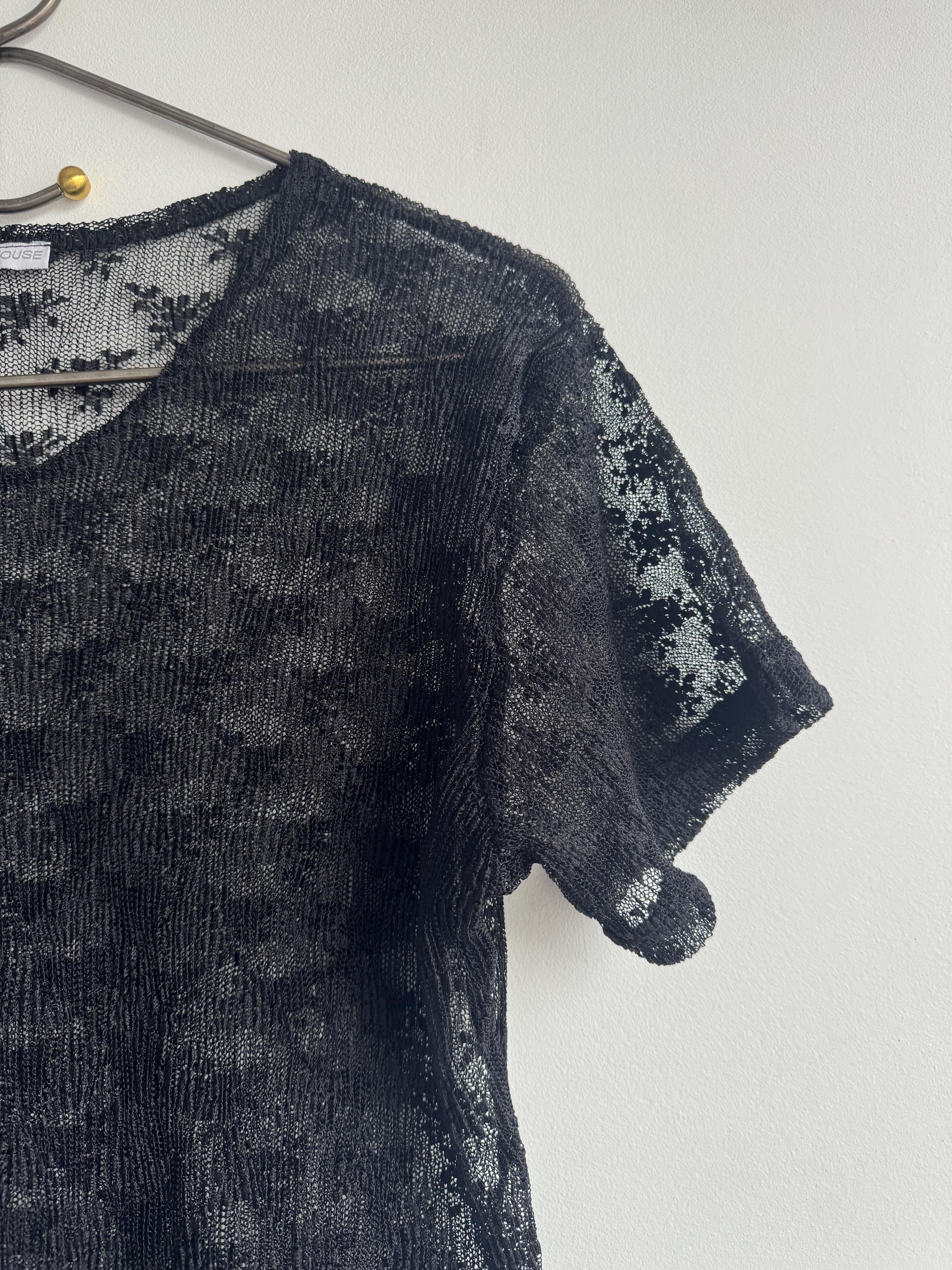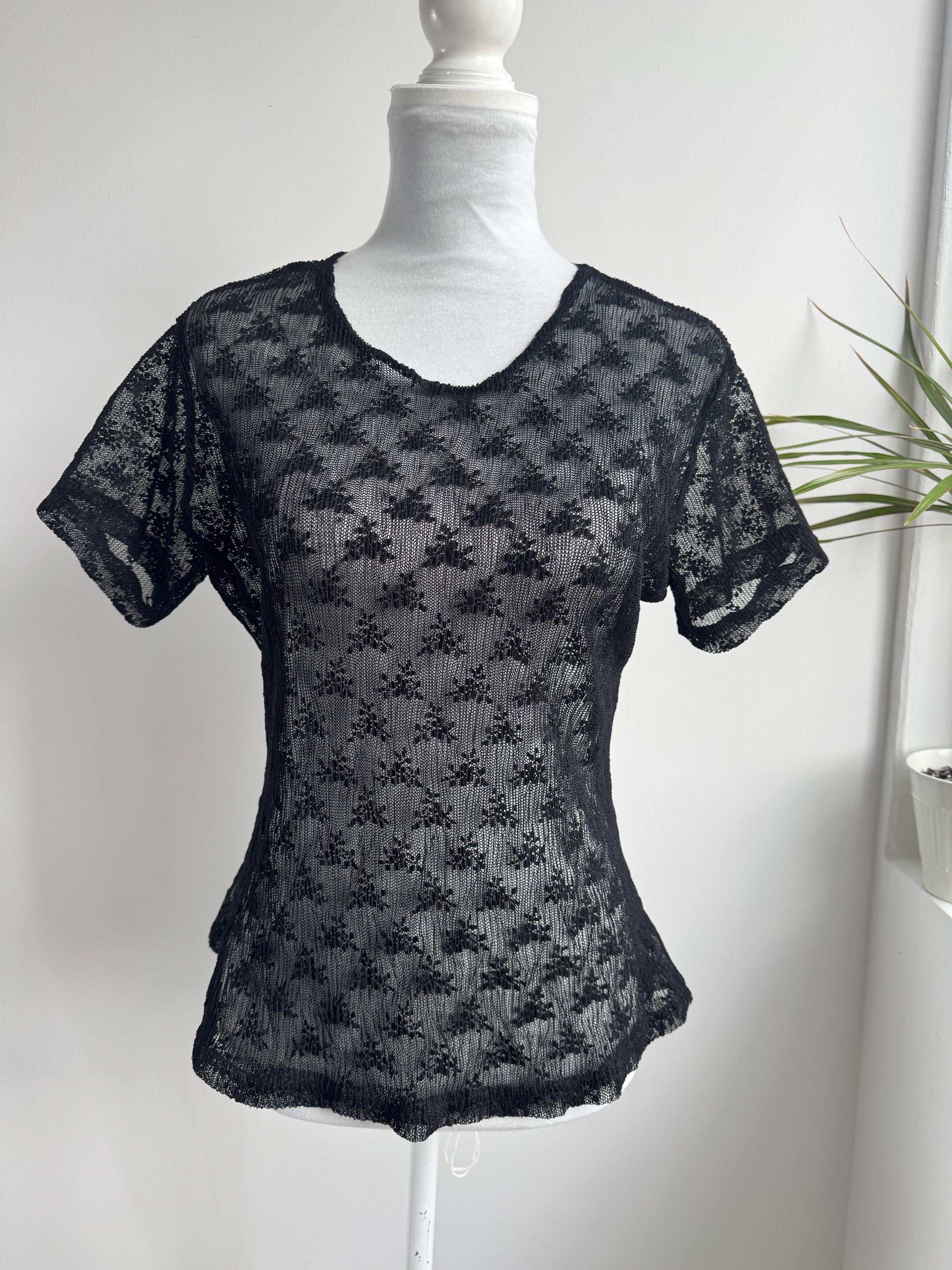 This gorgeous black lace top is the kind of piece that makes a whole outfit effortlessly. Featuring a delicate floral lace pattern throughout, sheer mesh sleeves and a sheer bodice with a beautiful textured, this top strikes the perfect balance between feminine and edgy. The slightly flared peplum-style hem gives it a flattering silhouette that works beautifully tucked into high-waisted jeans or layered over a slip dress or cami. A true 90s and Y2K fashion gem that feels completely at home in today's wardrobe.
