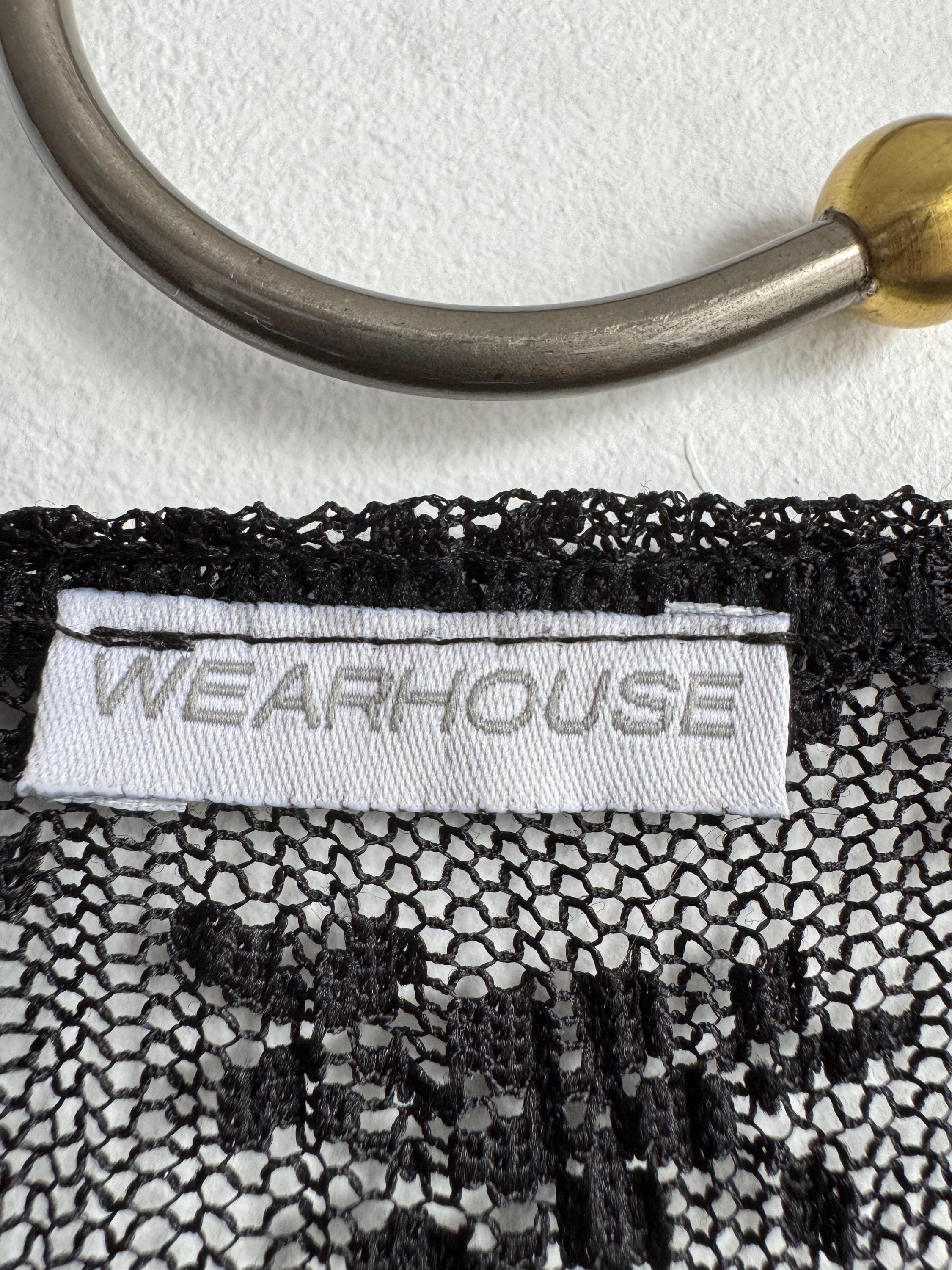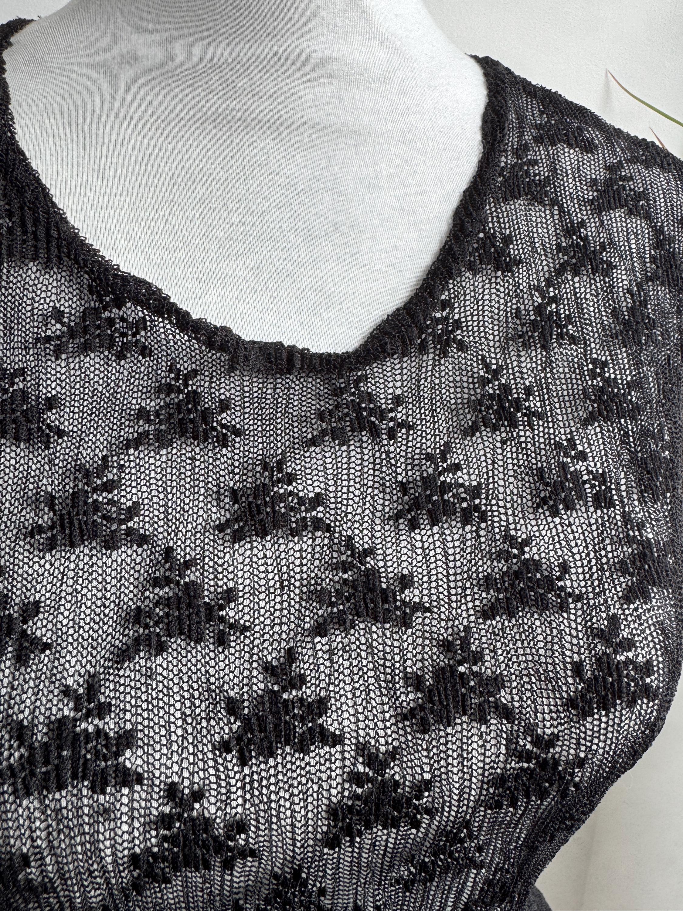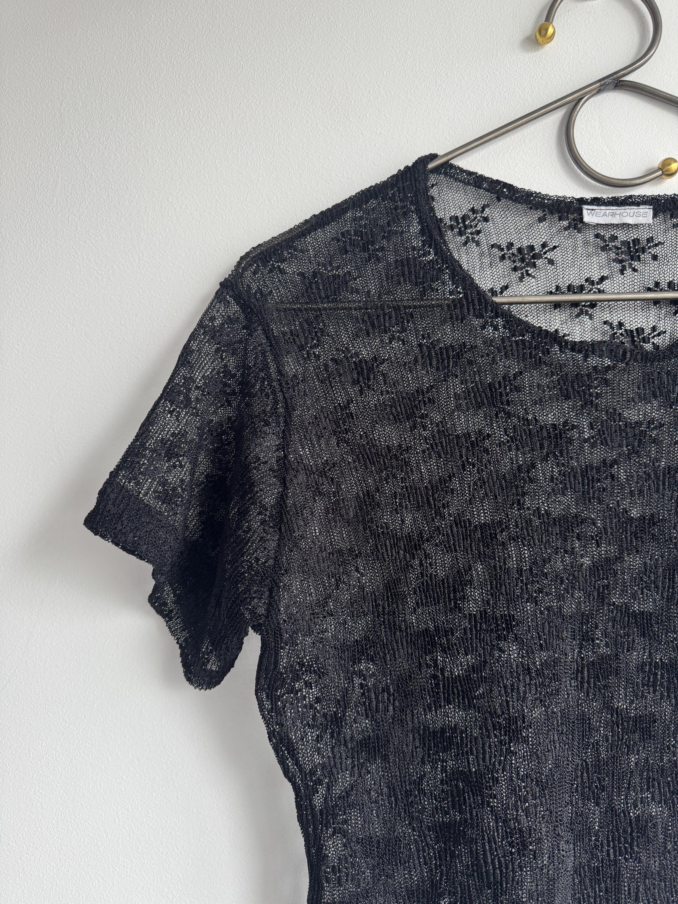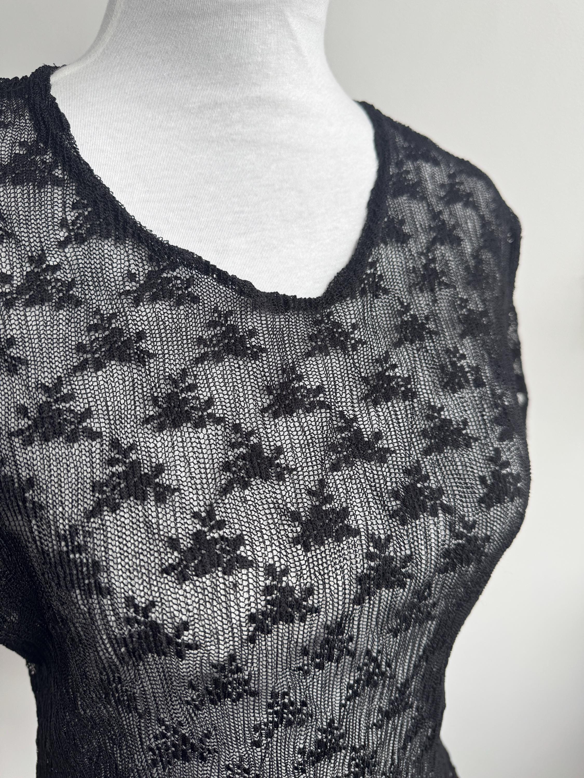This gorgeous black lace top is the kind of piece that makes a whole outfit effortlessly. Featuring a delicate floral lace pattern throughout, sheer mesh sleeves and a sheer bodice with a beautiful textured, this top strikes the perfect balance between feminine and edgy. The slightly flared peplum-style hem gives it a flattering silhouette that works beautifully tucked into high-waisted jeans or layered over a slip dress or cami. A true 90s and Y2K fashion gem that feels completely at home in today's wardrobe.