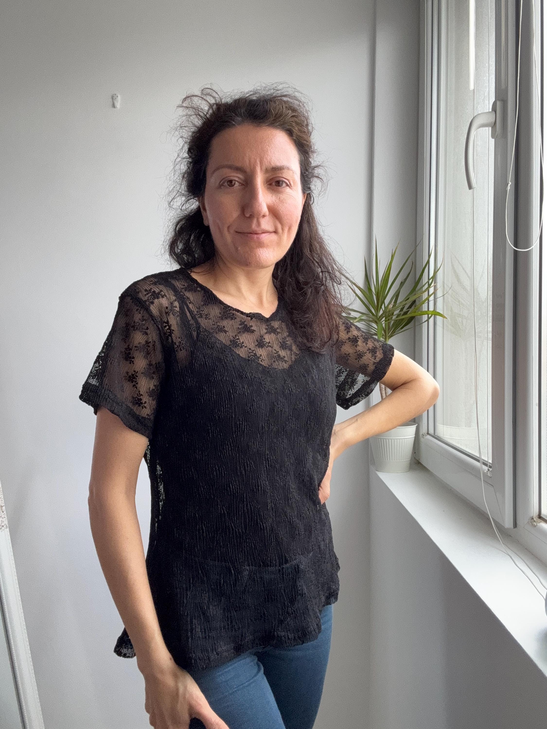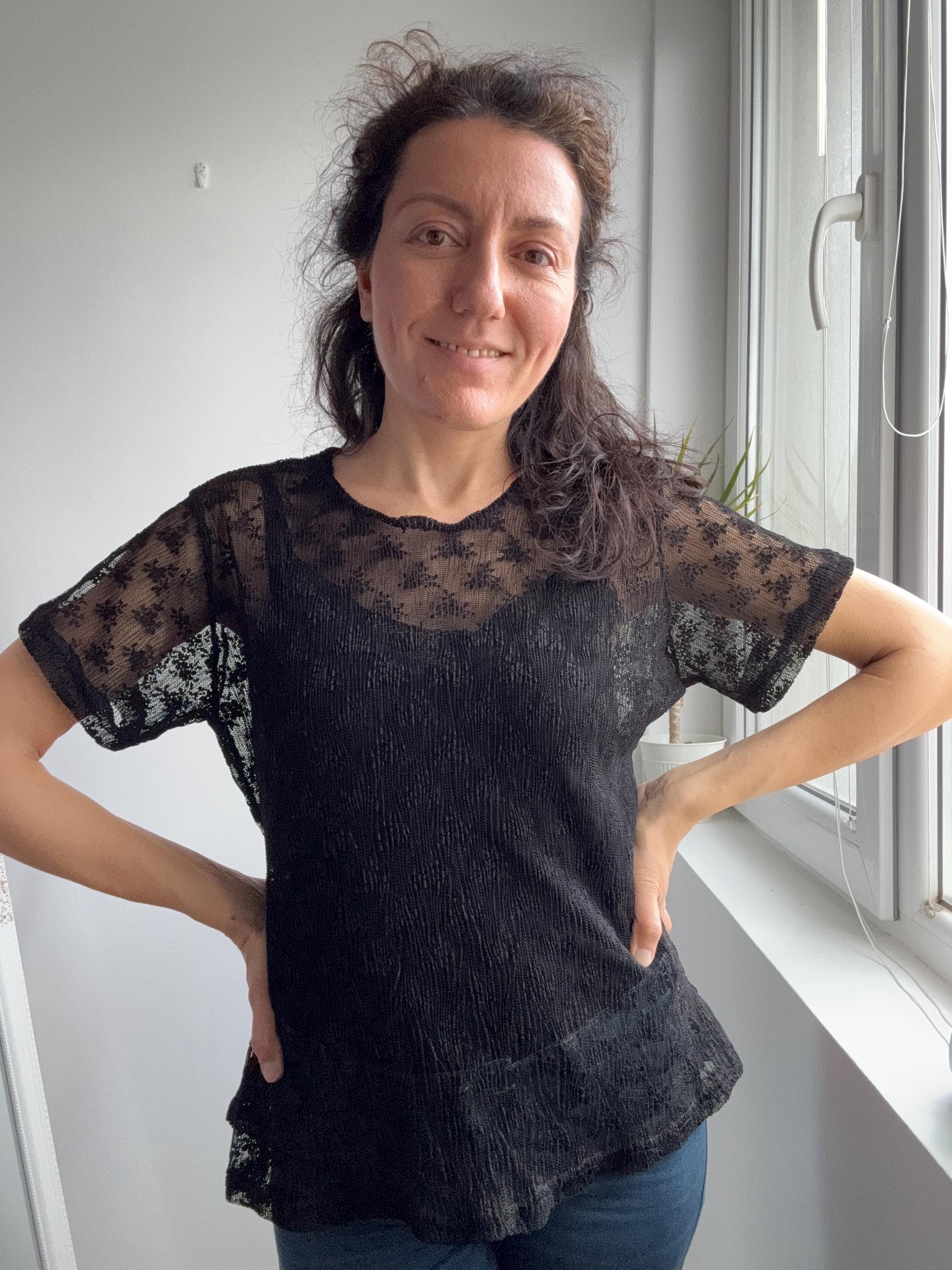 👕 Size: No size label — fits like M - L please refer to measurements for ideal fit. The fabric has a good bit of stretch. I am modelling the top, I wear size S, EUR 36, US 6, UK 10
