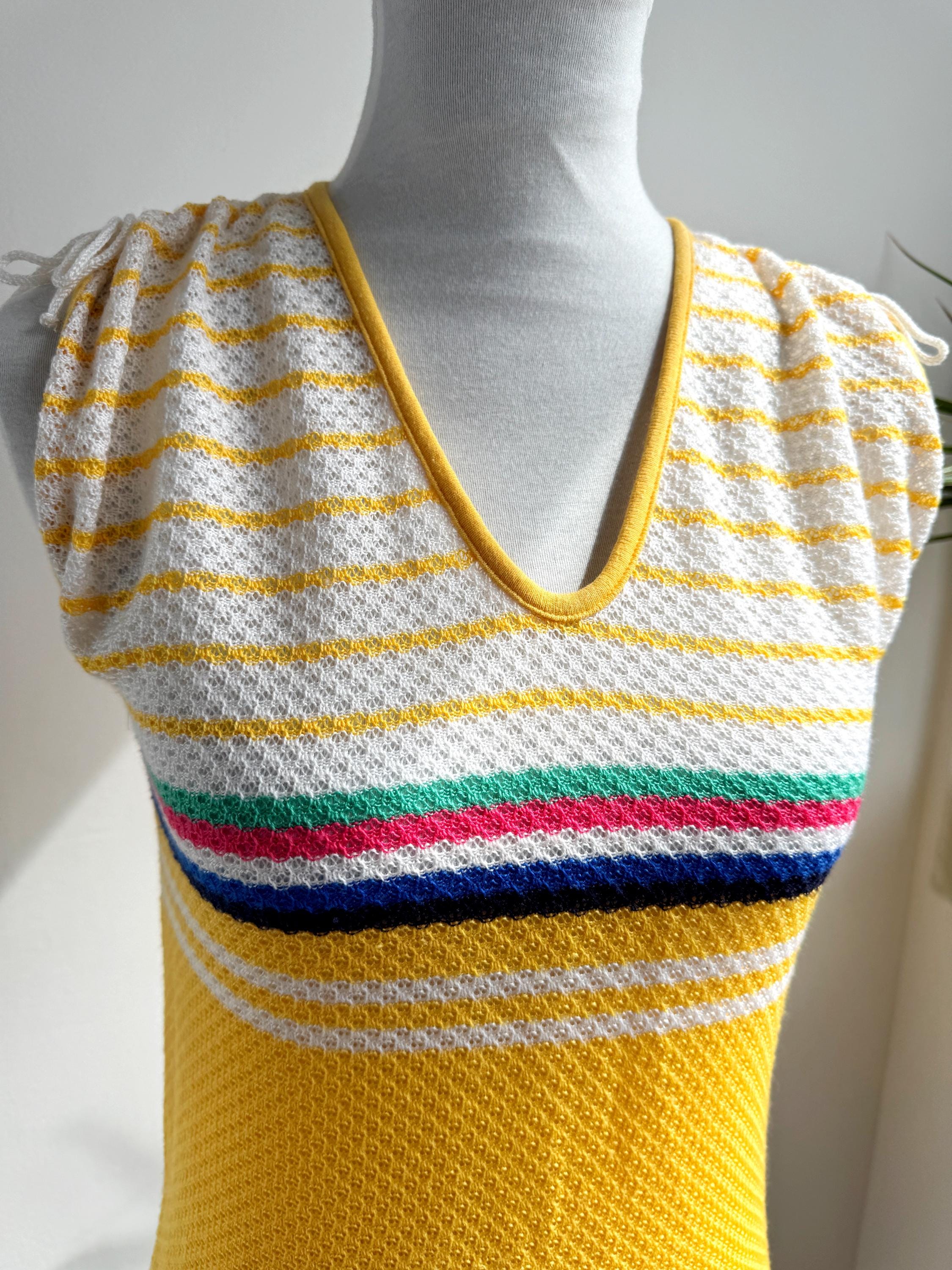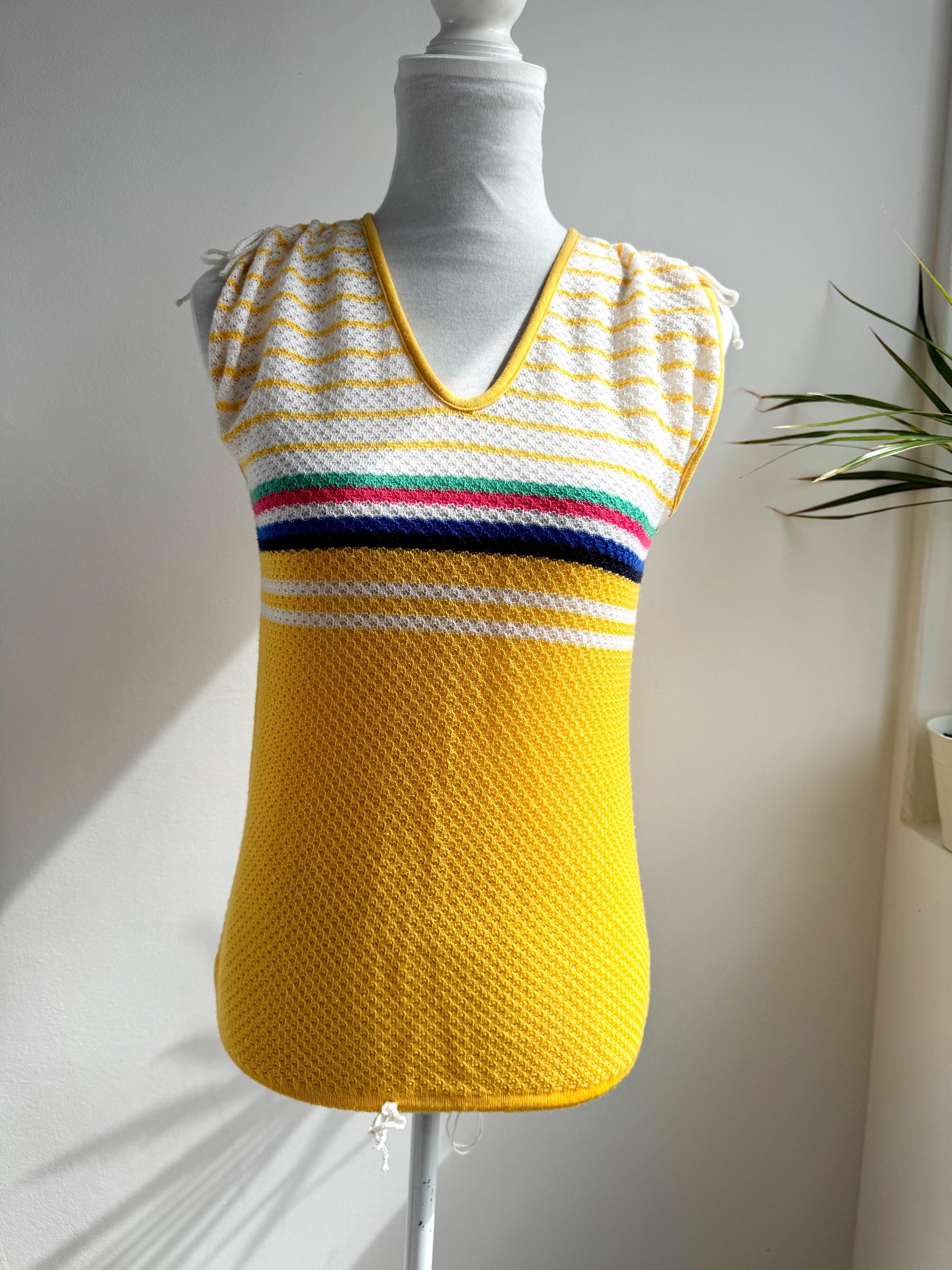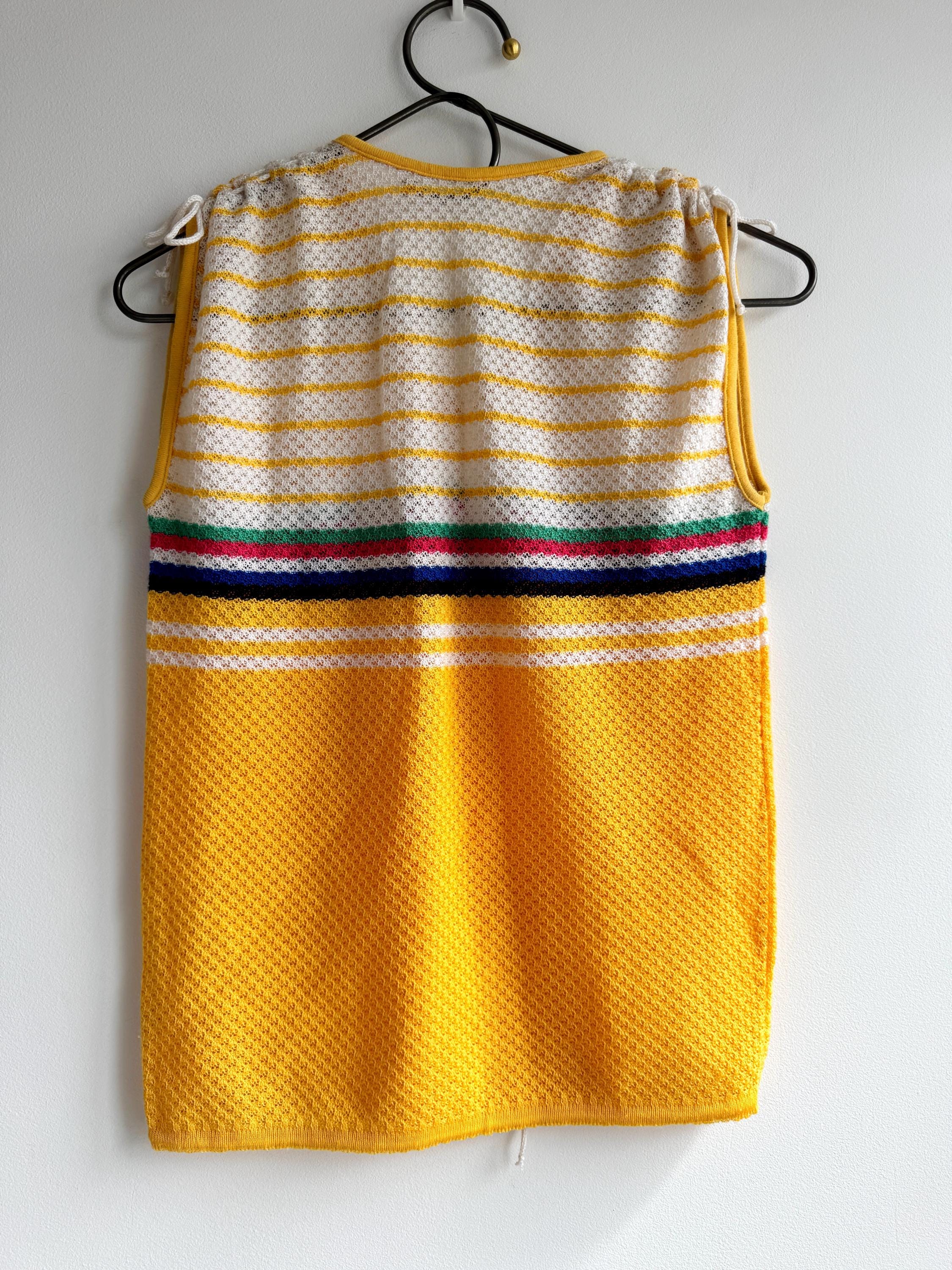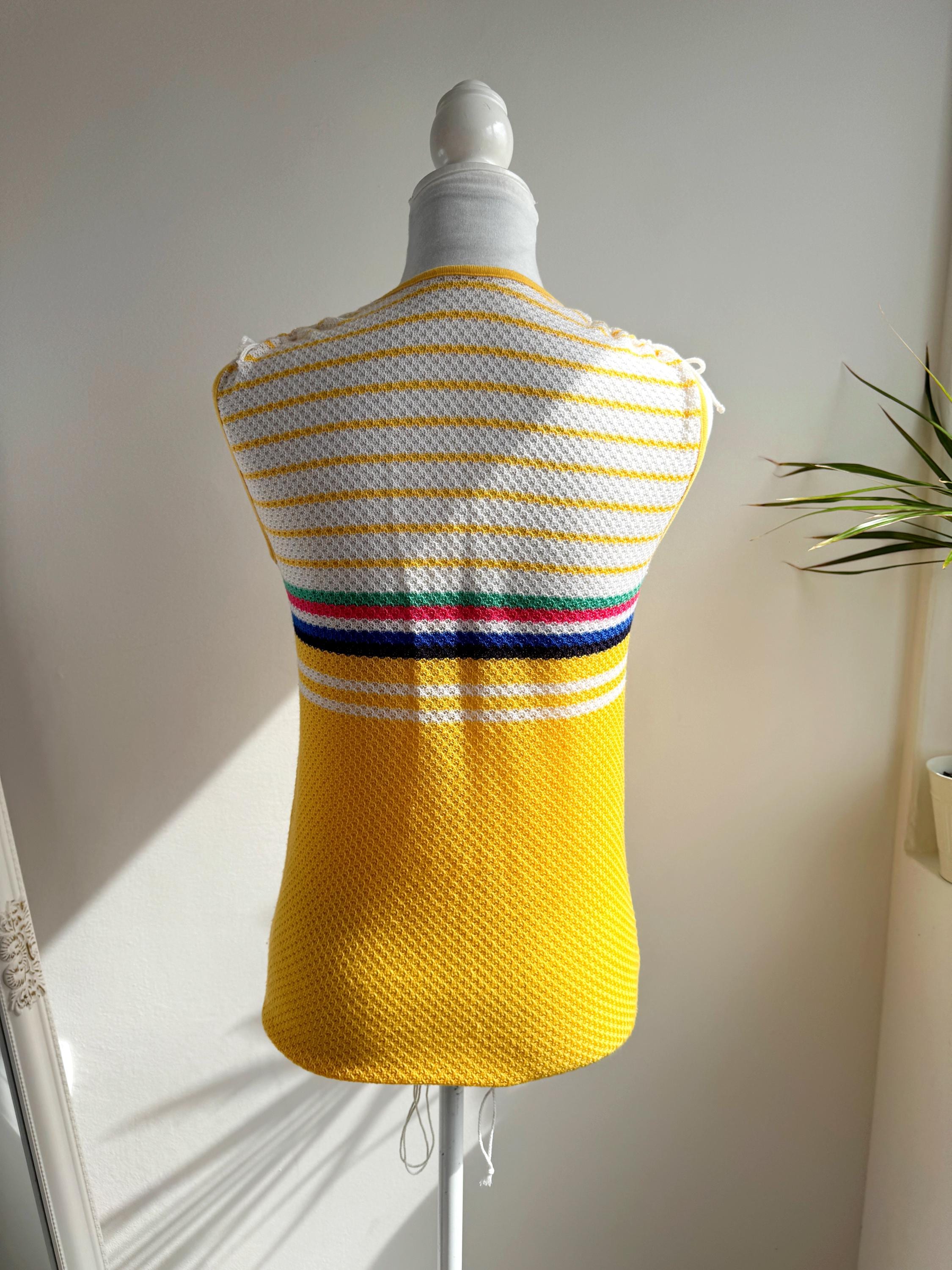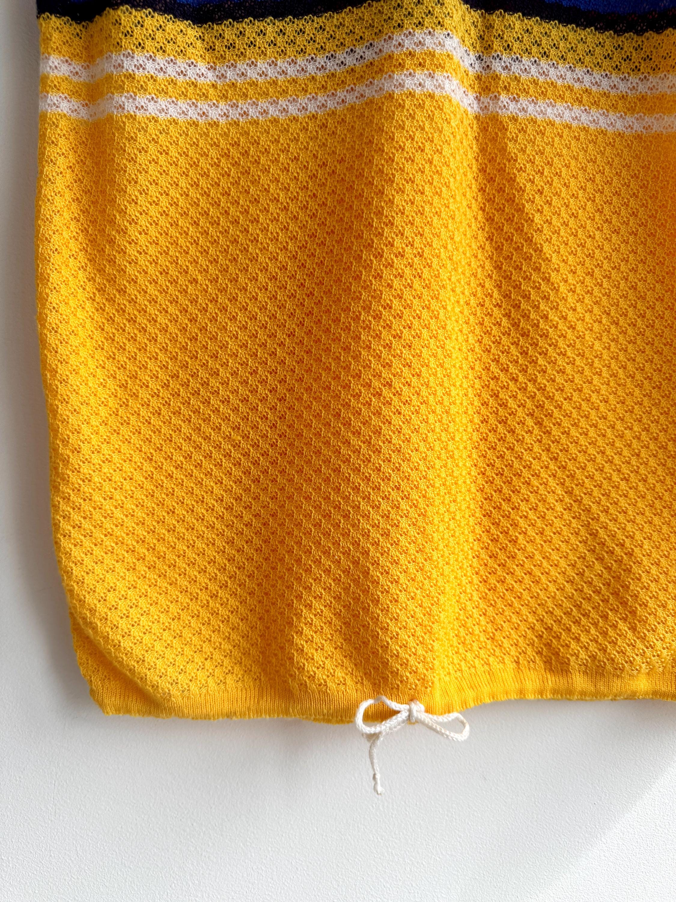 There's something about a sunshine yellow knit top that just makes you want to grab it immediately — and this one is a genuine vintage treasure from the 1970s. The colour alone is enough to stop the scroll, but look a little closer and you'll notice all the wonderful details that make this knitwear piece so special: a bold rainbow stripe band across the chest in green, pink, navy and white, a textured open-knit body, a neatly piped yellow V-neckline, and adjustable drawstring ties at each shoulder that let you customise the fit and silhouette. A matching drawstring at the hem adds a sporty-chic finishing touch that feels surprisingly modern.