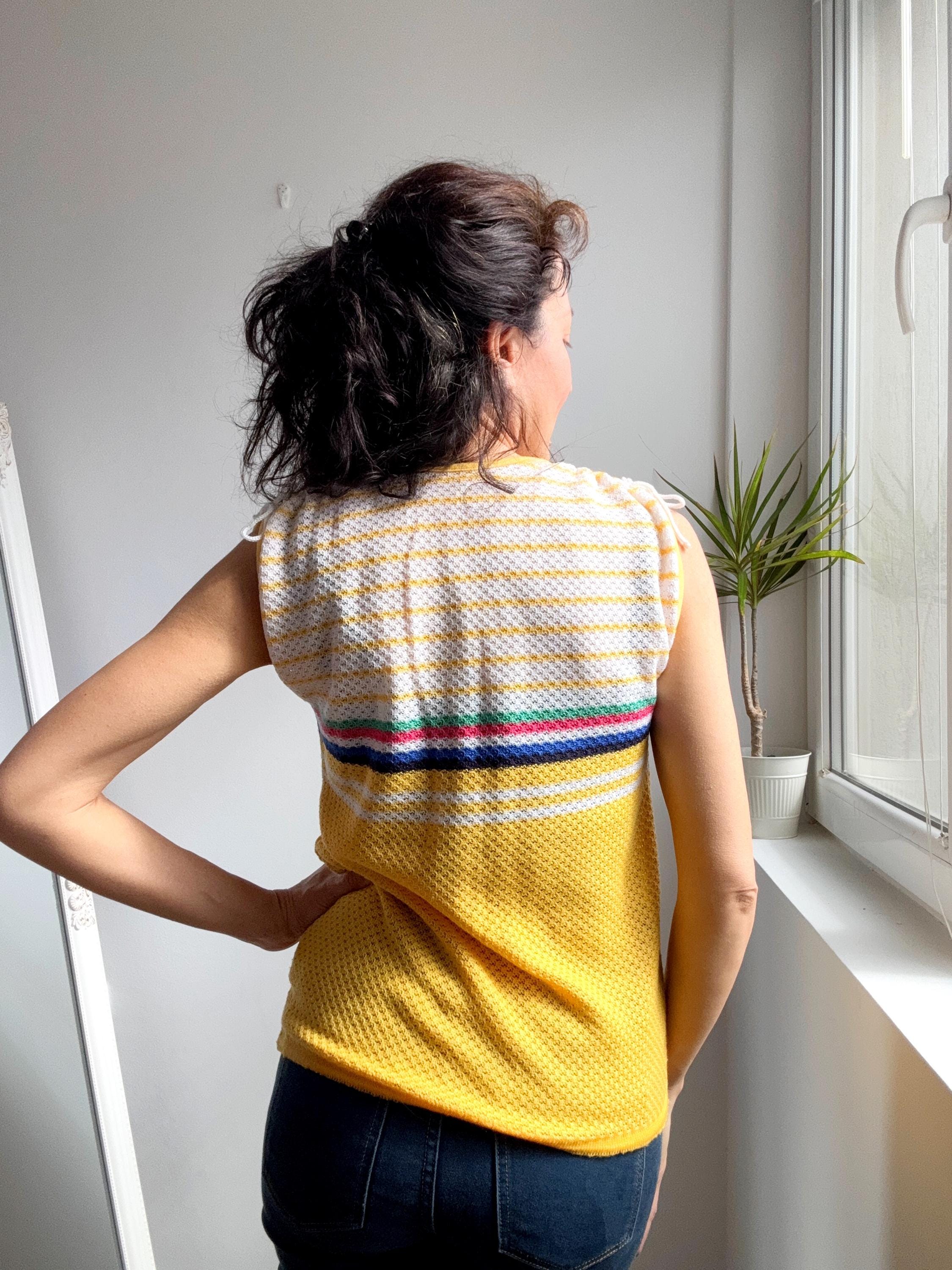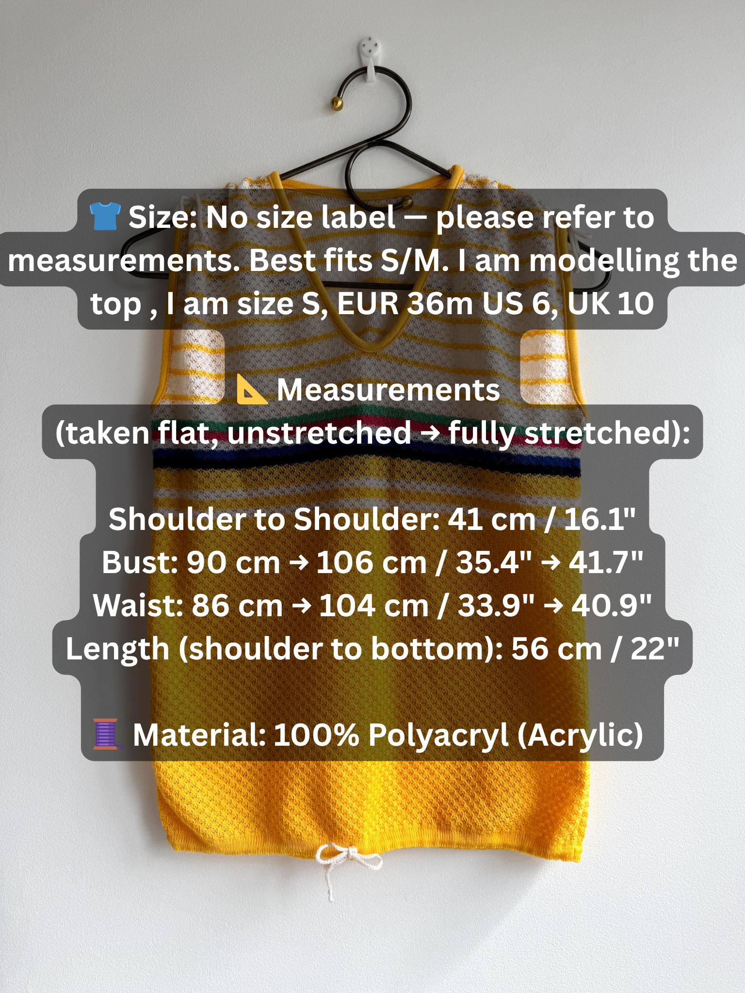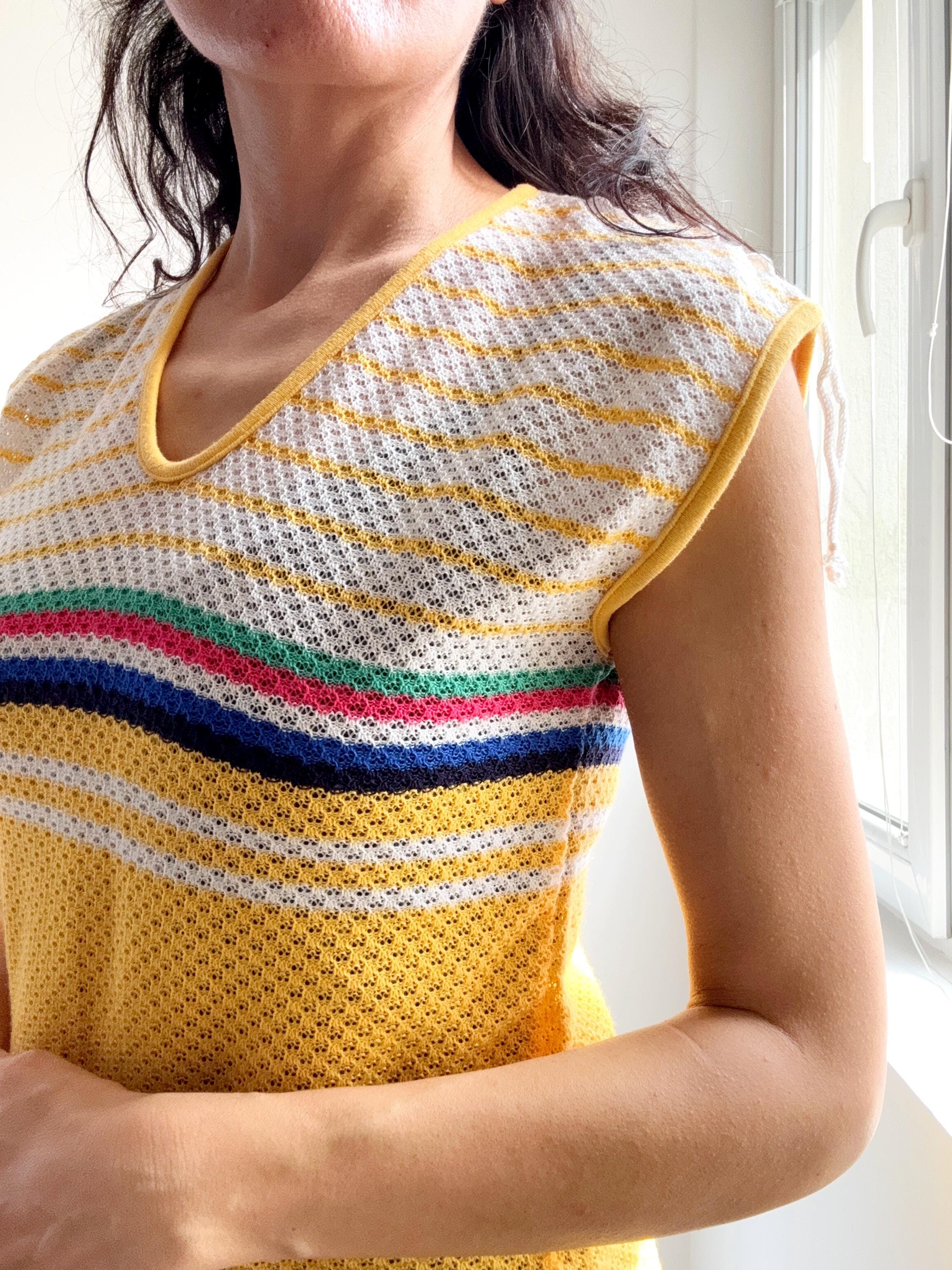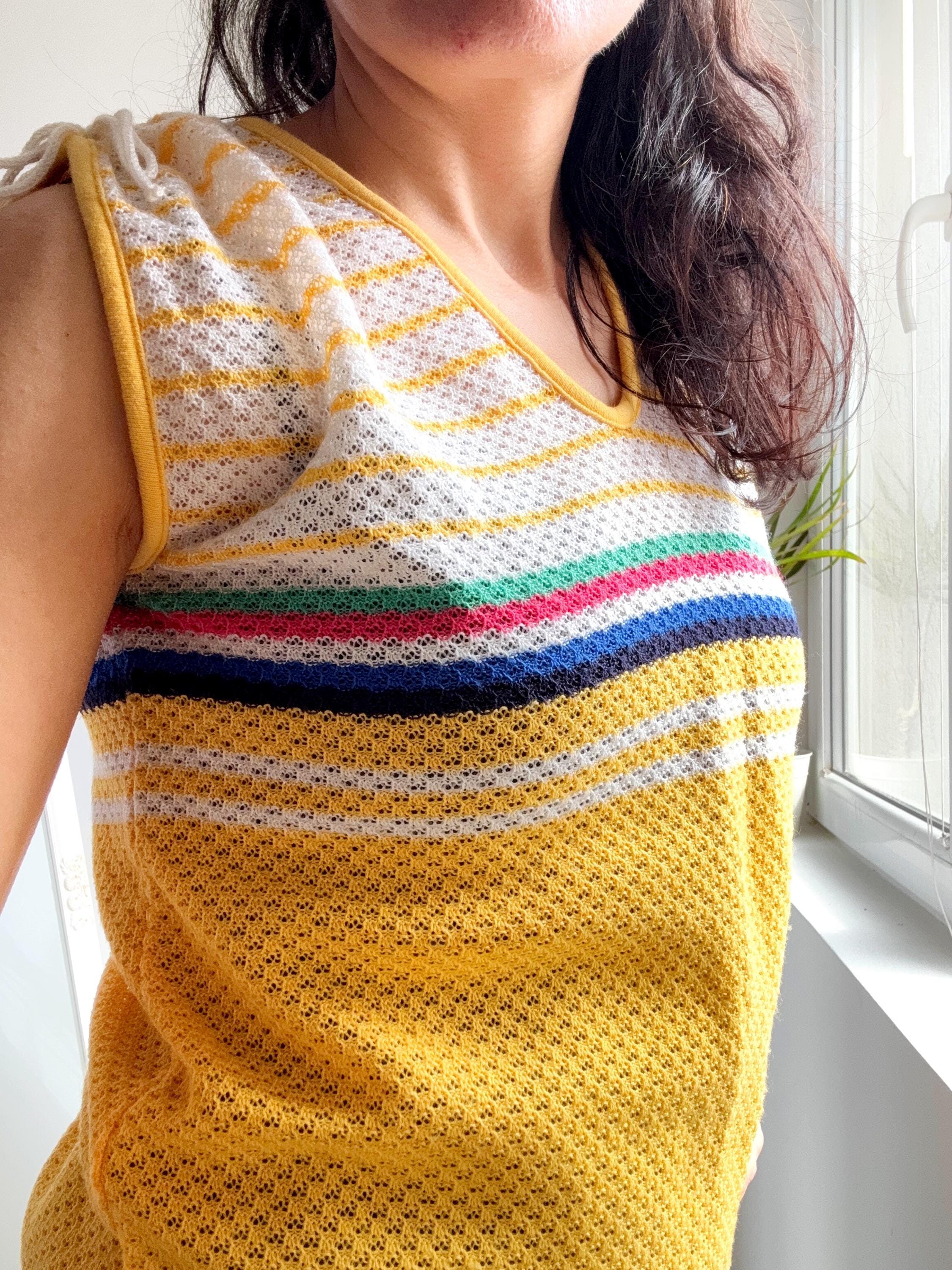 There's something about a sunshine yellow knit top that just makes you want to grab it immediately — and this one is a genuine vintage treasure from the 1970s. The colour alone is enough to stop the scroll, but look a little closer and you'll notice all the wonderful details that make this knitwear piece so special: a bold rainbow stripe band across the chest in green, pink, navy and white, a textured open-knit body, a neatly piped yellow V-neckline, and adjustable drawstring ties at each shoulder that let you customise the fit and silhouette. A matching drawstring at the hem adds a sporty-chic finishing touch that feels surprisingly modern.