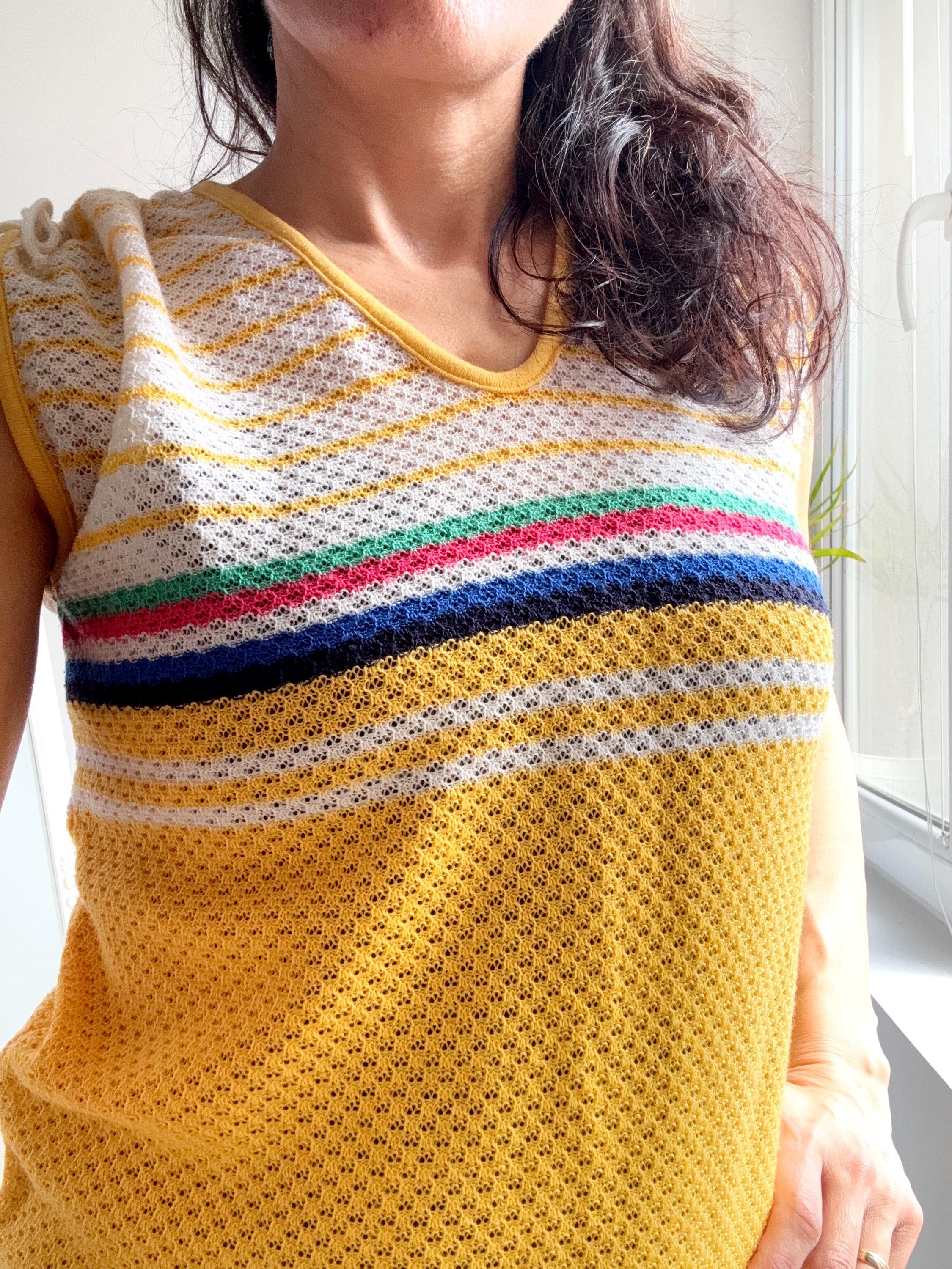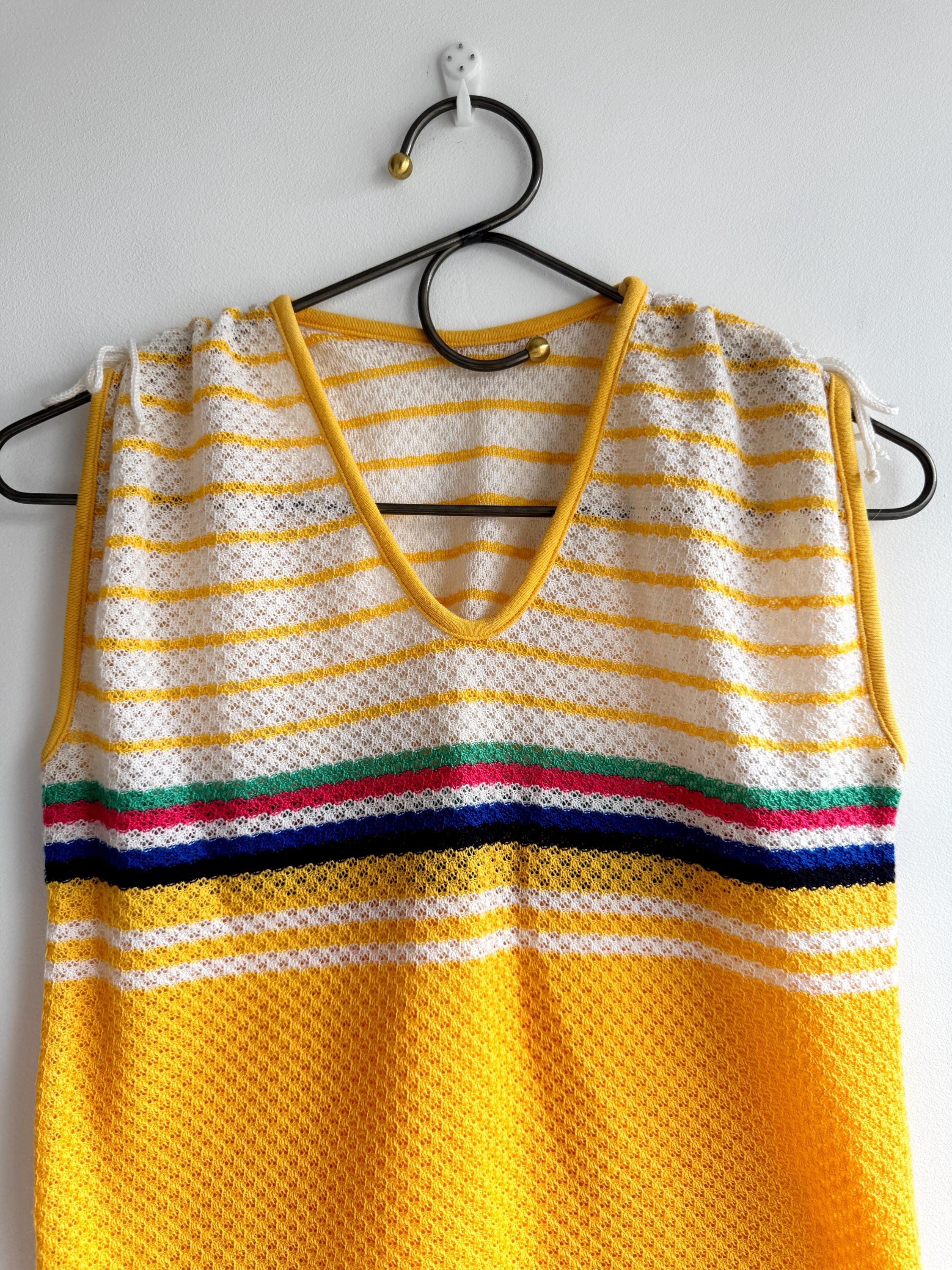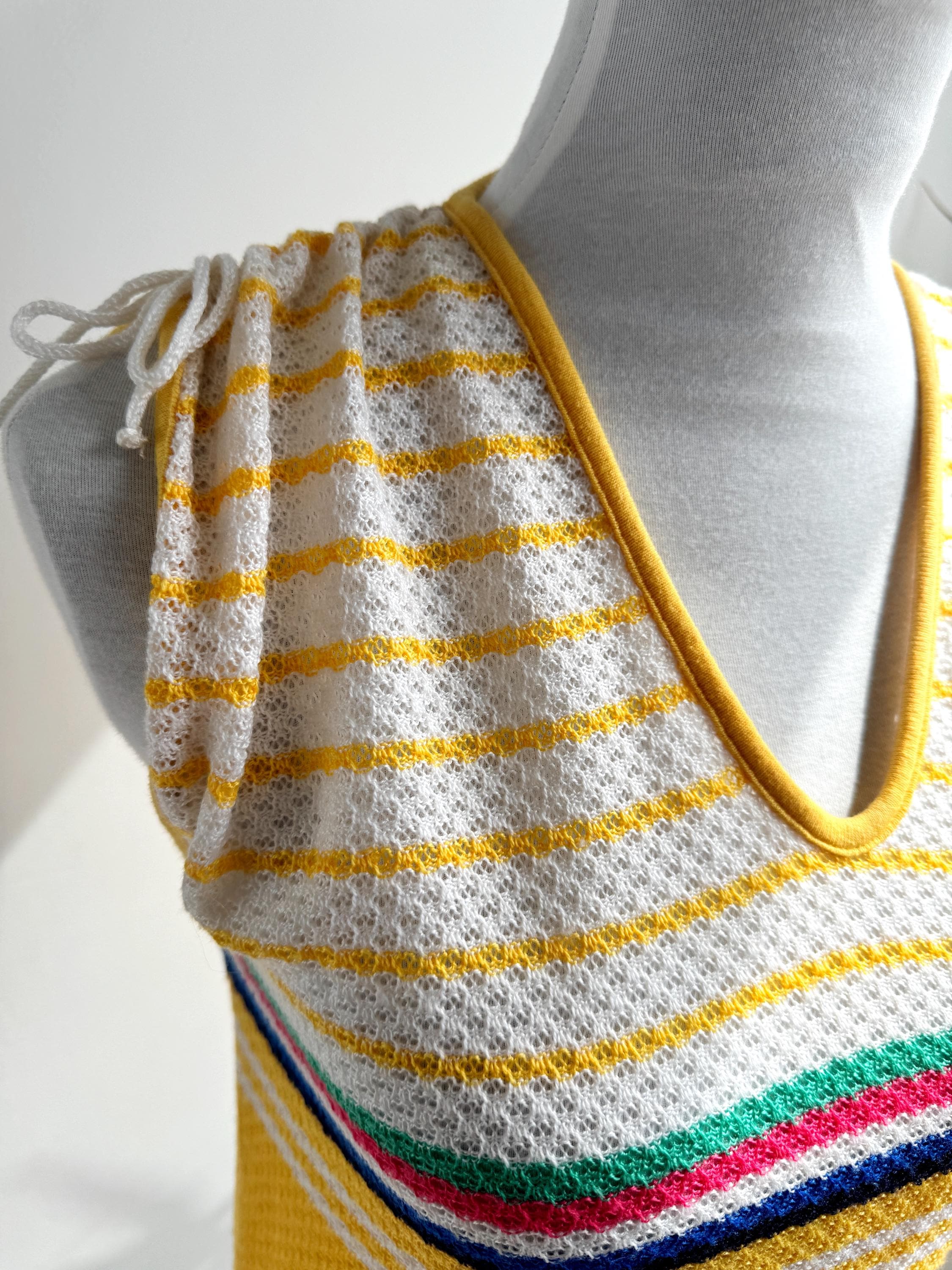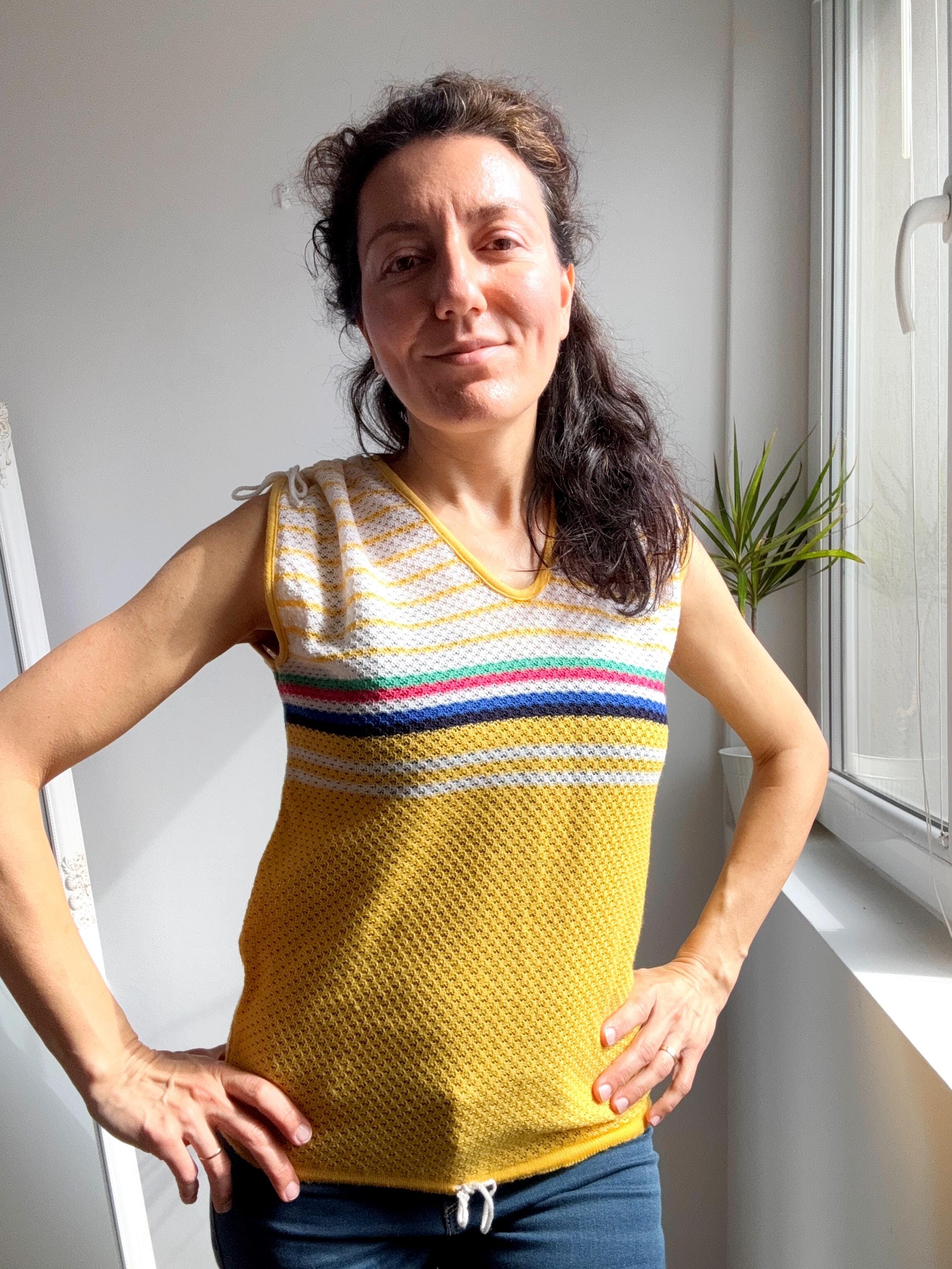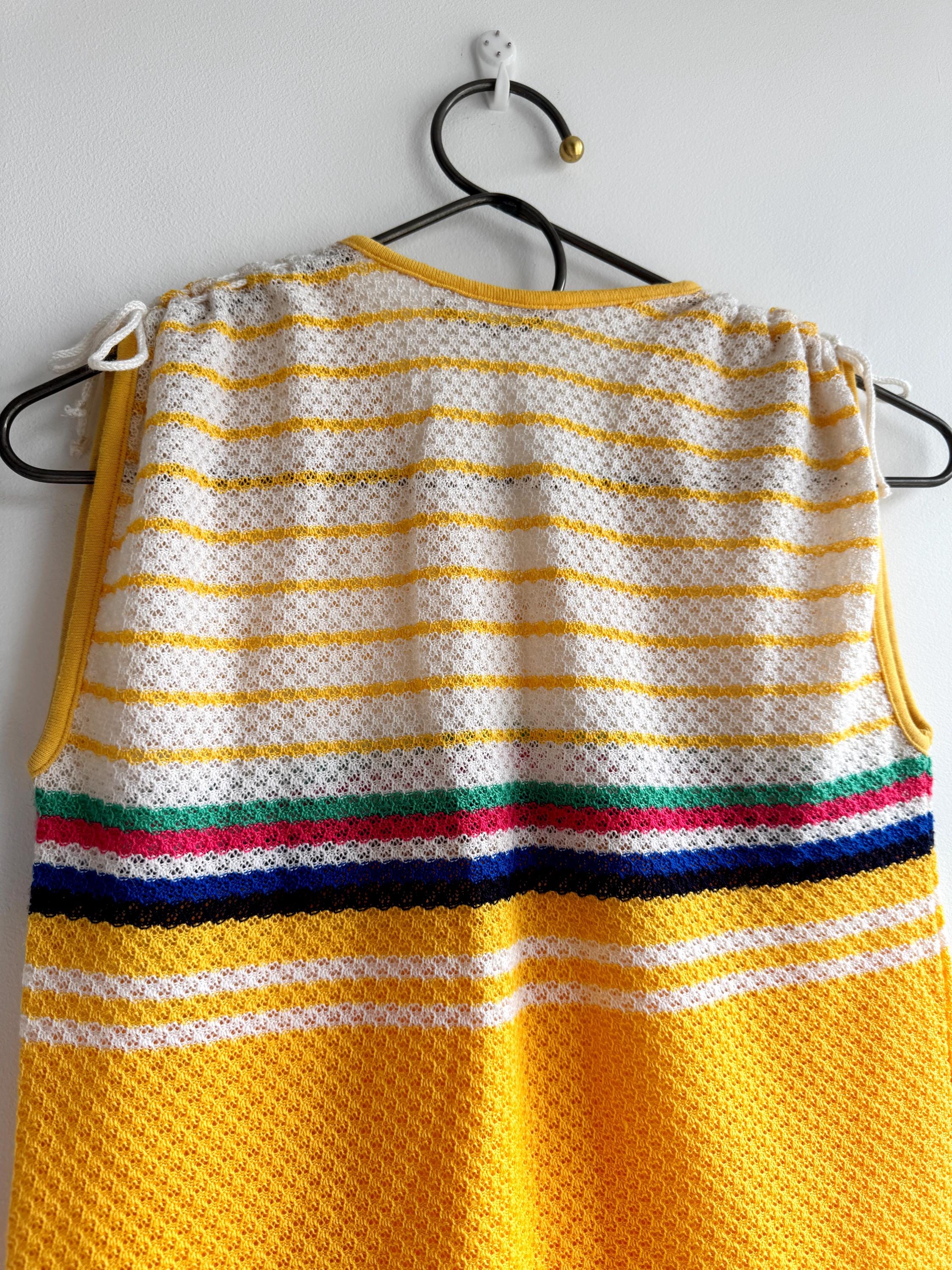 There's something about a sunshine yellow knit top that just makes you want to grab it immediately — and this one is a genuine vintage treasure from the 1970s. The colour alone is enough to stop the scroll, but look a little closer and you'll notice all the wonderful details that make this knitwear piece so special: a bold rainbow stripe band across the chest in green, pink, navy and white, a textured open-knit body, a neatly piped yellow V-neckline, and adjustable drawstring ties at each shoulder that let you customise the fit and silhouette. A matching drawstring at the hem adds a sporty-chic finishing touch that feels surprisingly modern.