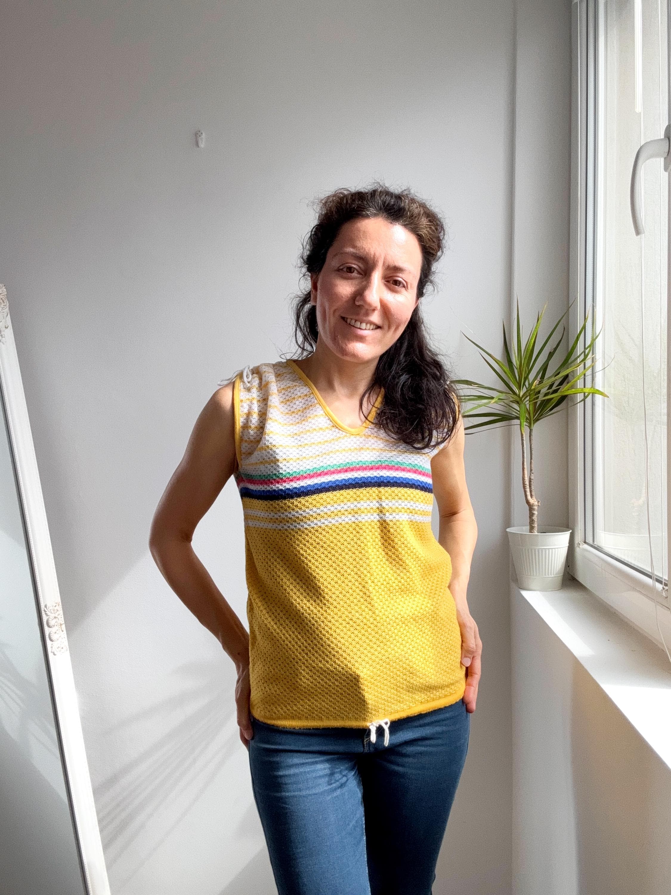 This is the kind of sleeveless sweater top that works equally well tucked into high-waisted vintage denim, layered over a white long-sleeve tee for festival season, or worn with wide-leg linen trousers for a relaxed summer look. The rich mustard-yellow openwork knit body has a lovely texture that photographs beautifully and gives the piece real depth. If you're building a 70s-inspired wardrobe, hunting for a standout Coachella outfit, or simply love colour-block retro fashion, this top is a genuine one-of-a-kind find.