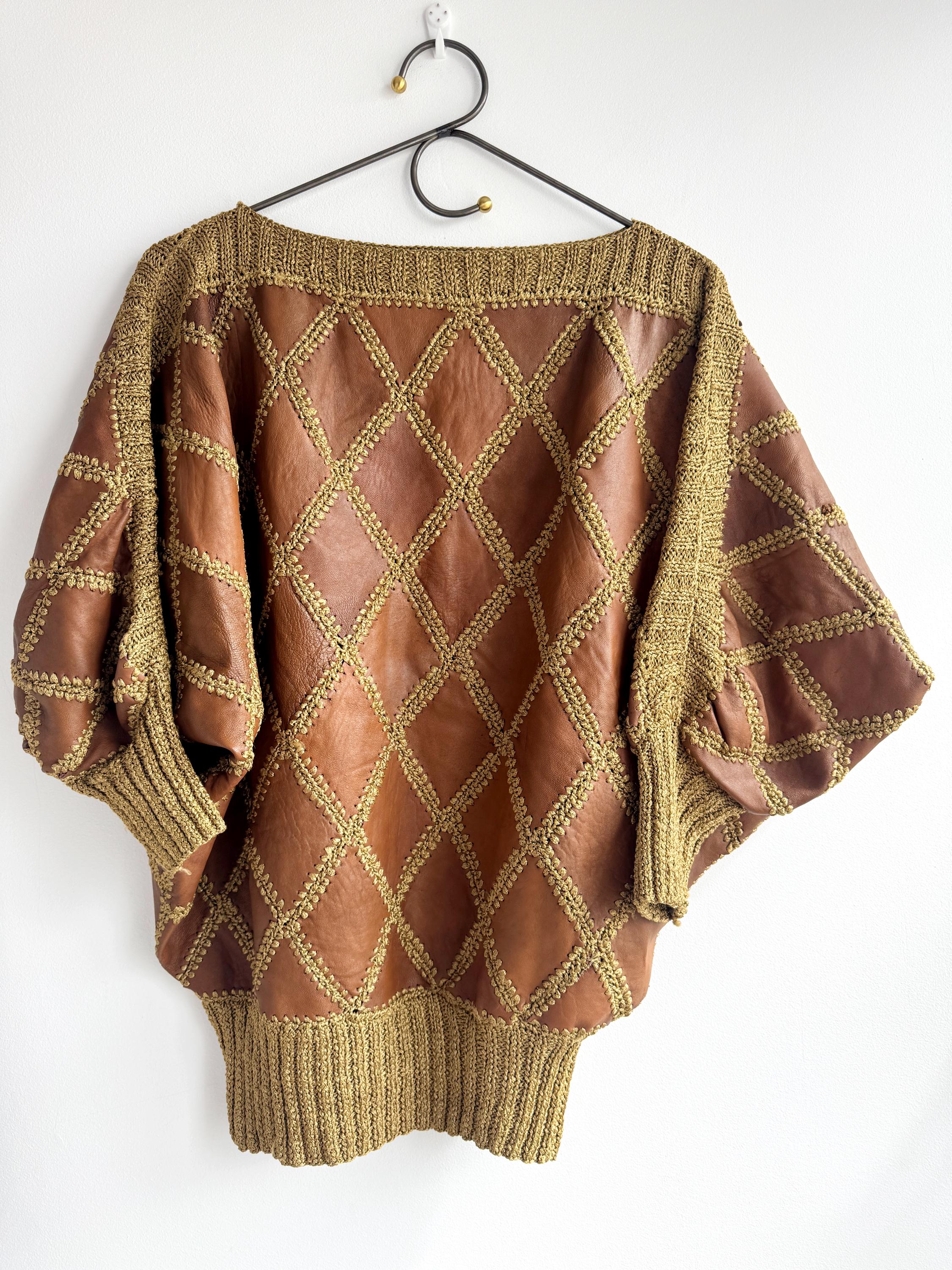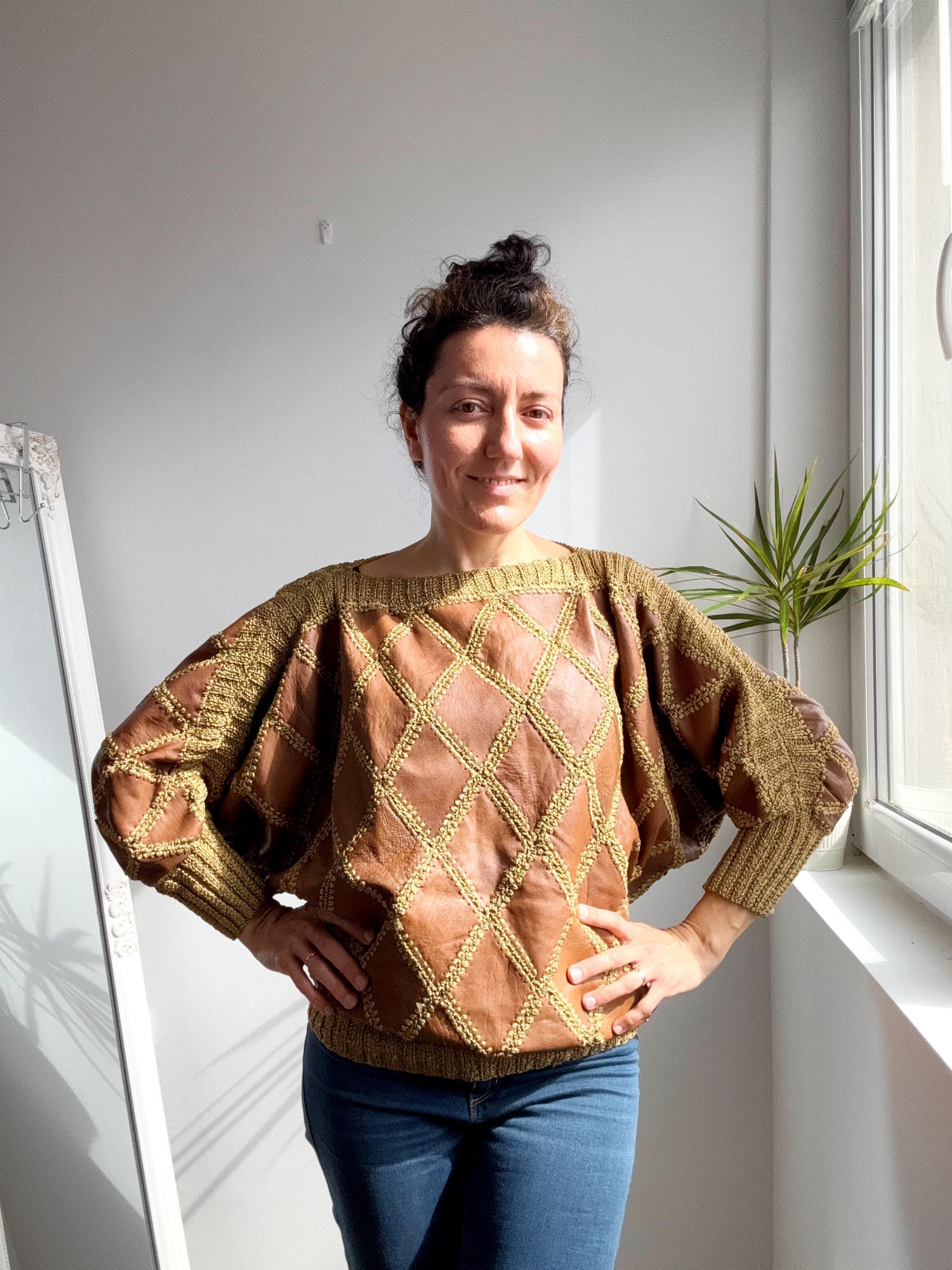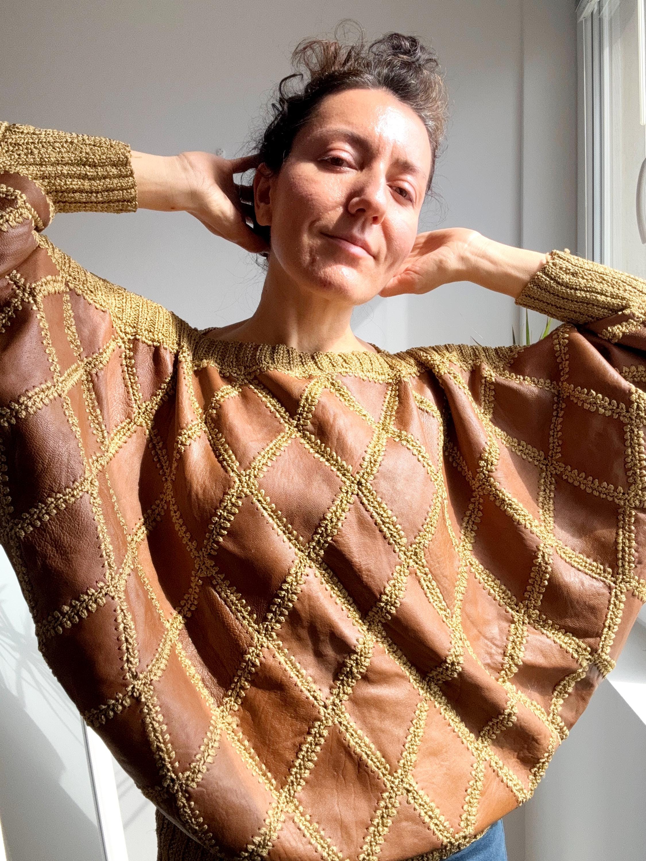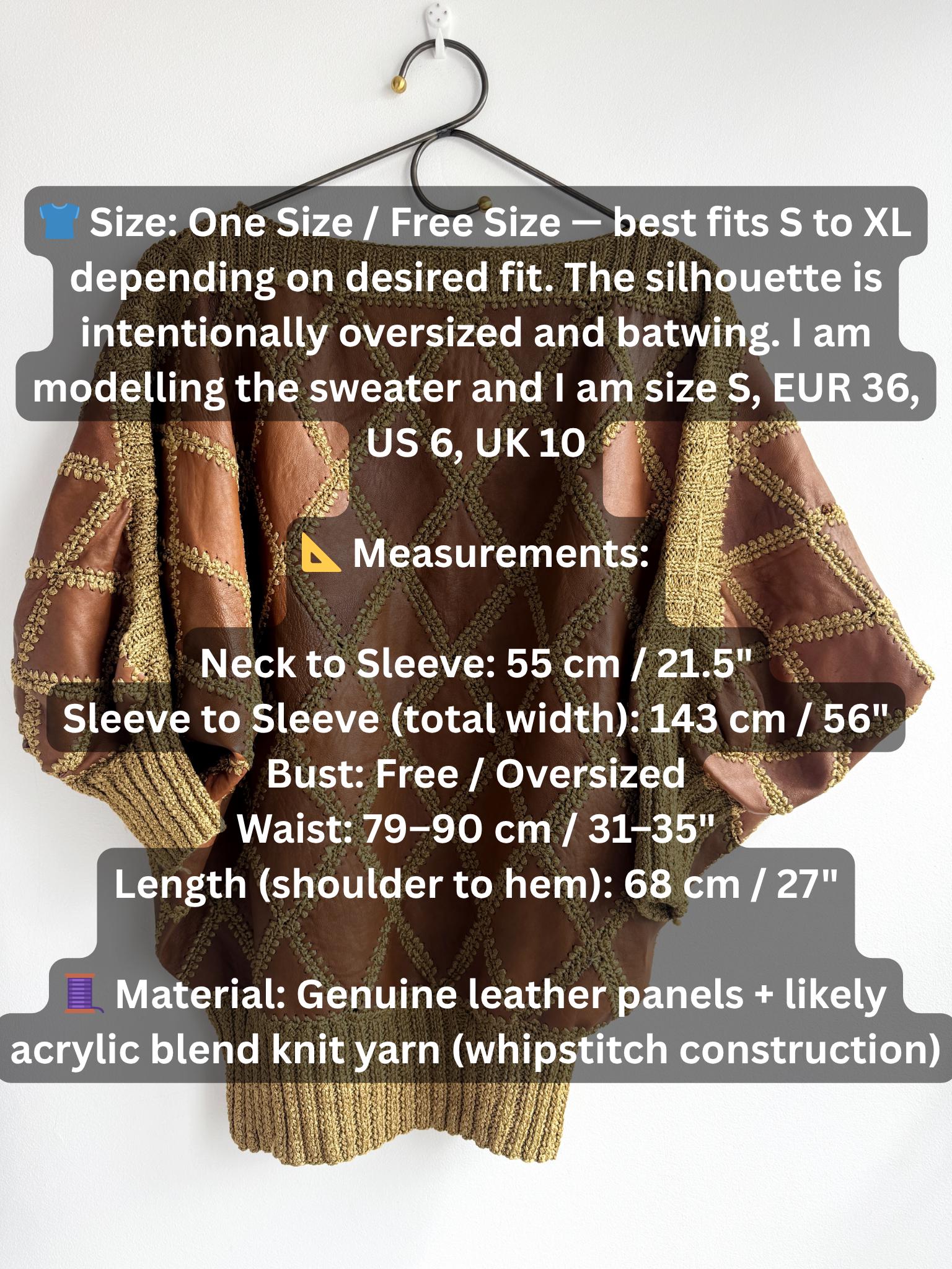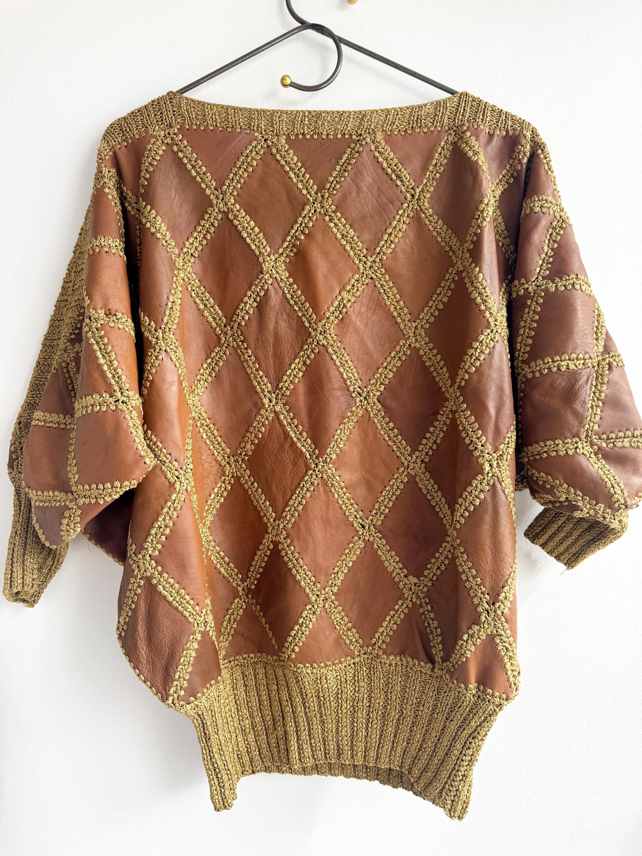 Step back into the golden era of bold, unapologetic fashion with this extraordinary vintage leather and knit patchwork sweater — a true collector's piece that blurs the line between craft and couture. Diamond-shaped cognac brown leather panels are hand-stitched together with chunky olive-gold yarn in a whipstitch technique, creating a striking argyle leather pattern that covers the entire body and sleeves. The result is something you simply won't find on any high street — rich texture, warm earth tones, and a silhouette that drapes beautifully on the body.
