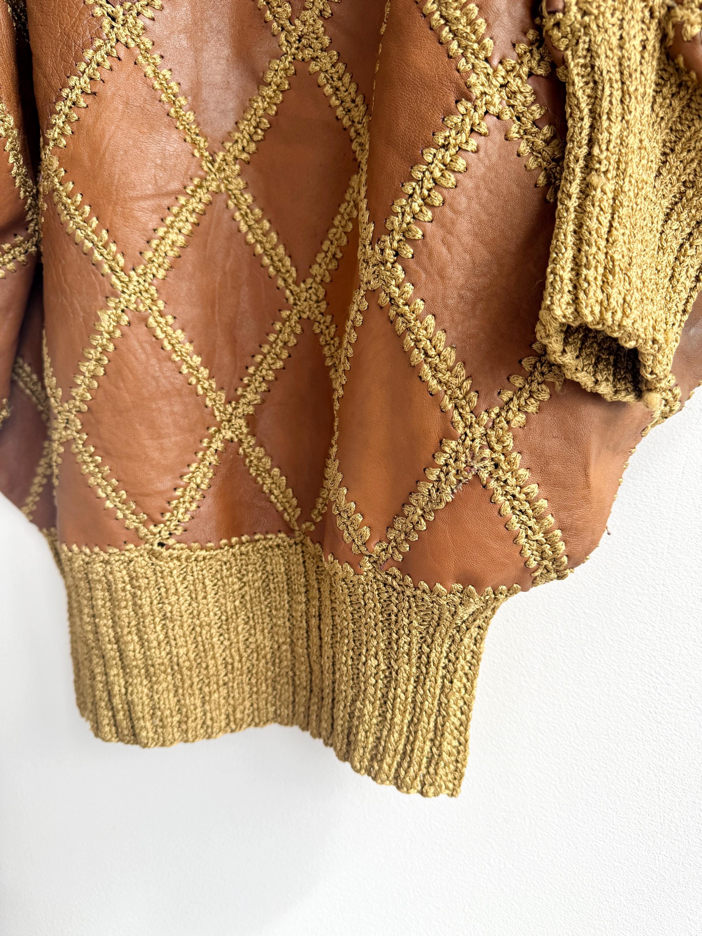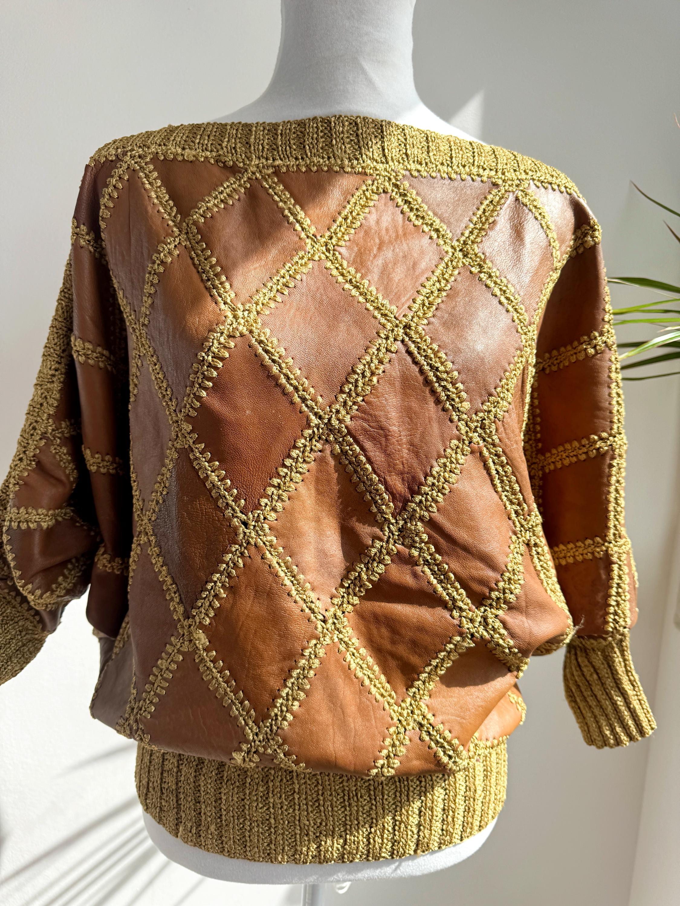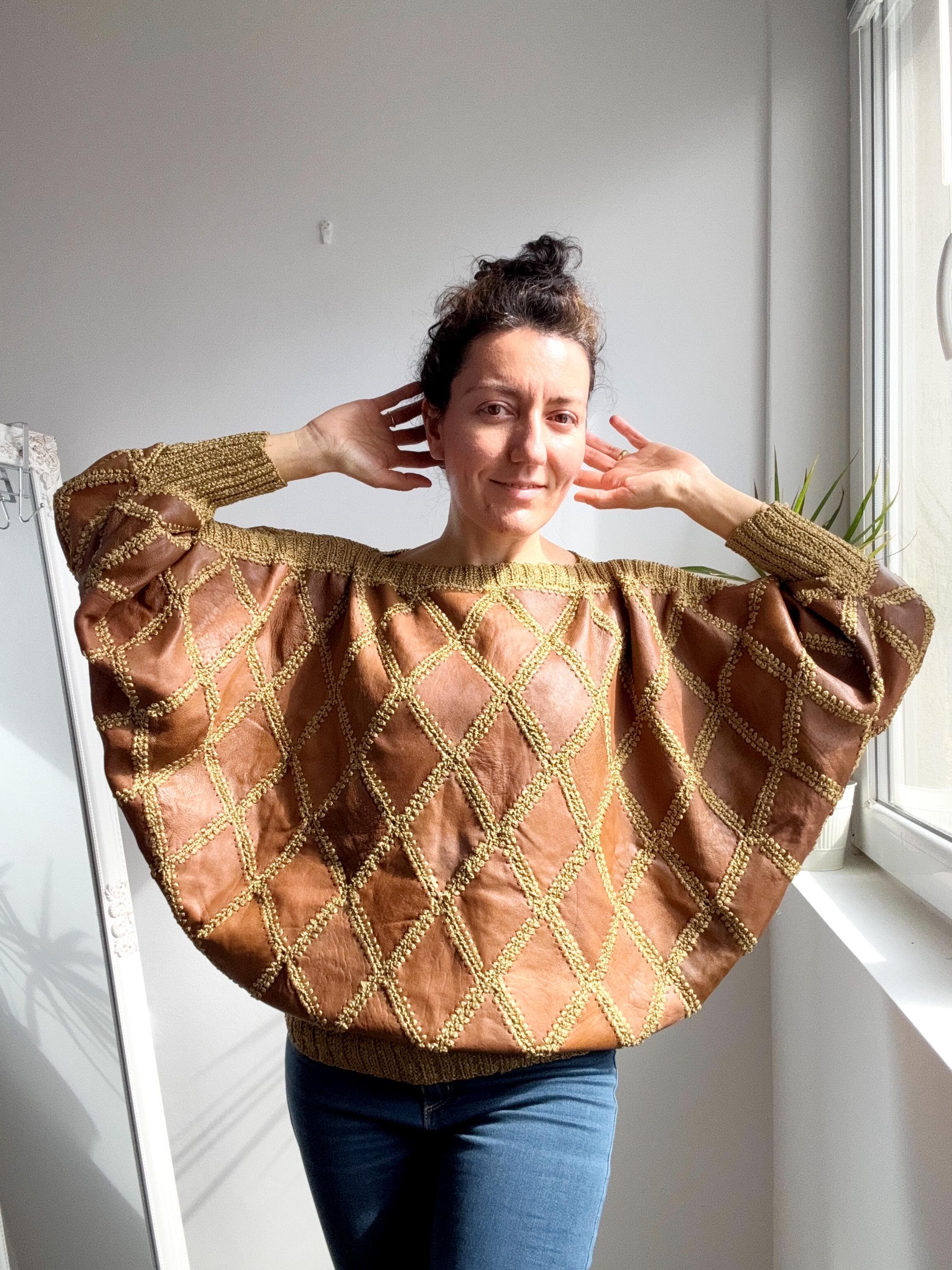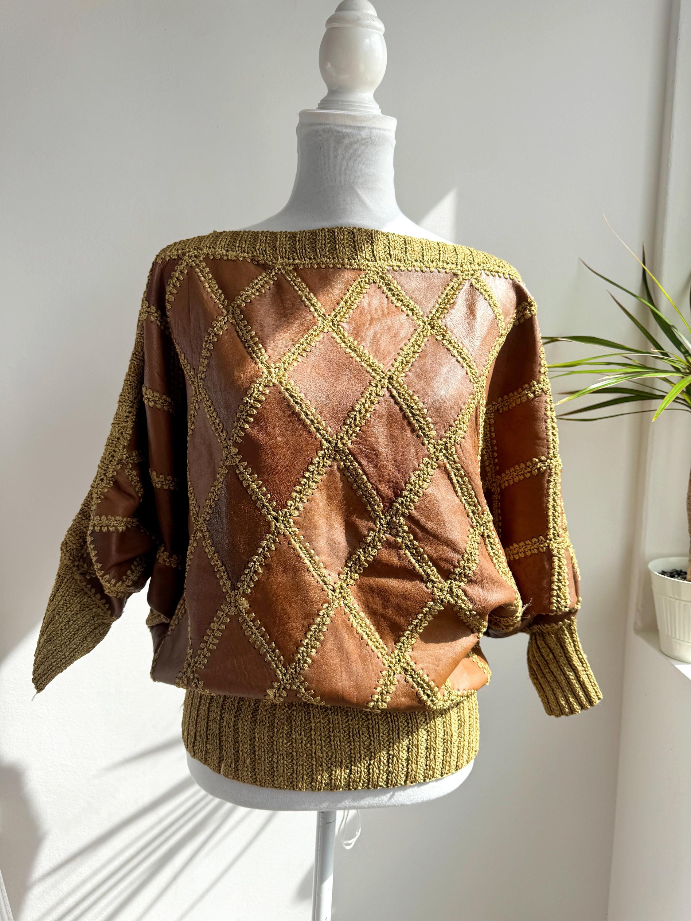 Step back into the golden era of bold, unapologetic fashion with this extraordinary vintage leather and knit patchwork sweater — a true collector's piece that blurs the line between craft and couture. Diamond-shaped cognac brown leather panels are hand-stitched together with chunky olive-gold yarn in a whipstitch technique, creating a striking argyle leather pattern that covers the entire body and sleeves. The result is something you simply won't find on any high street — rich texture, warm earth tones, and a silhouette that drapes beautifully on the body.