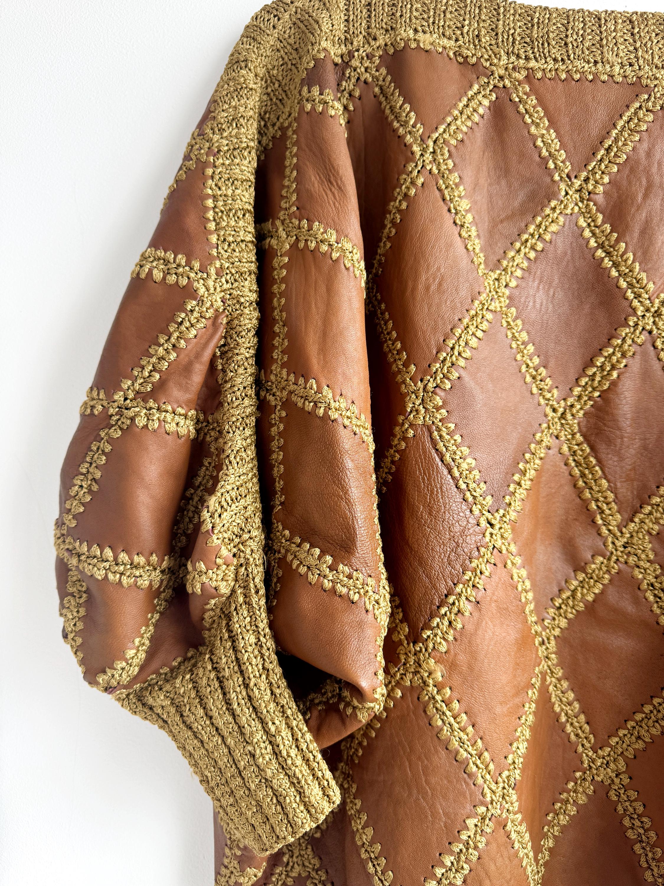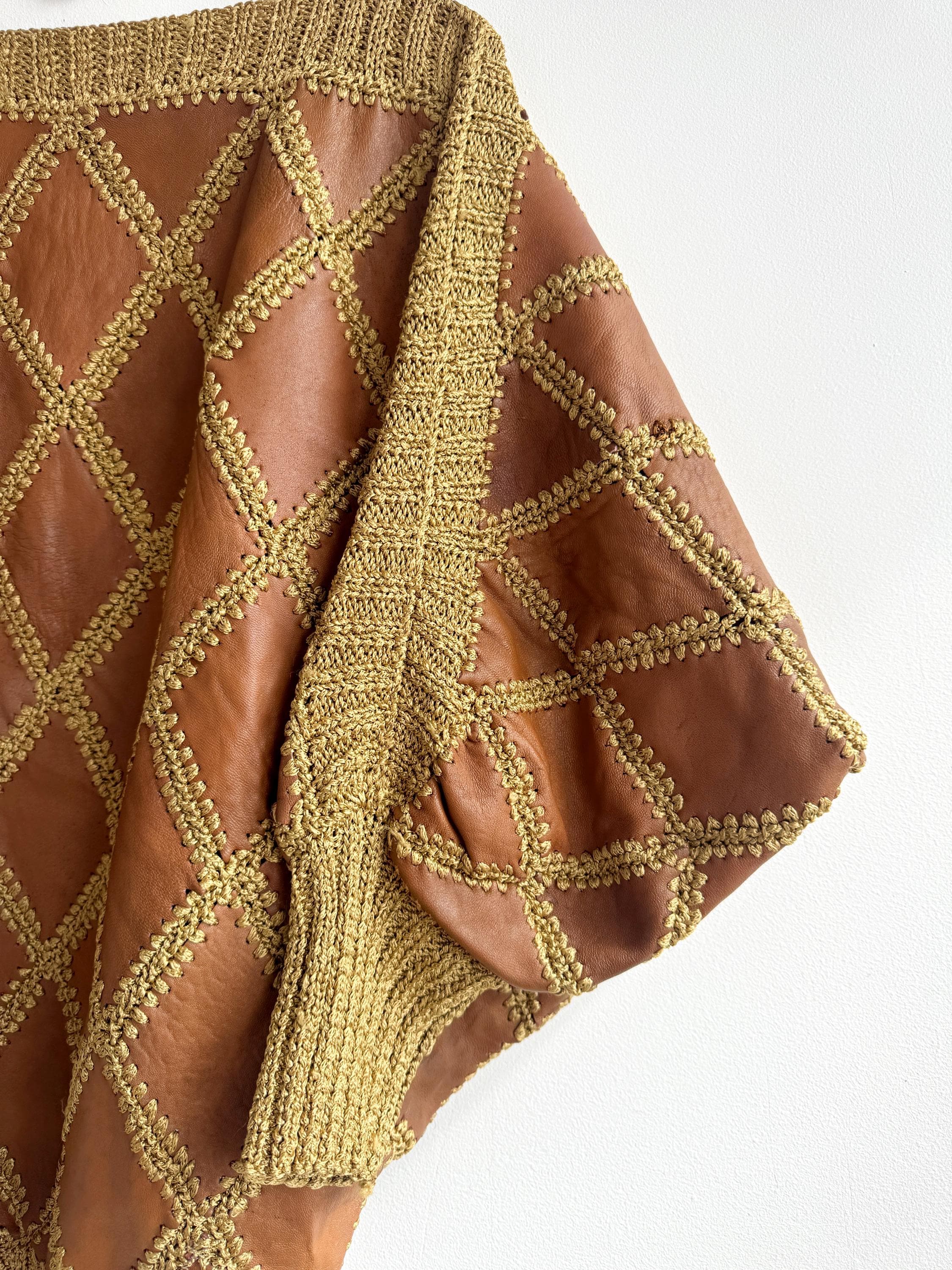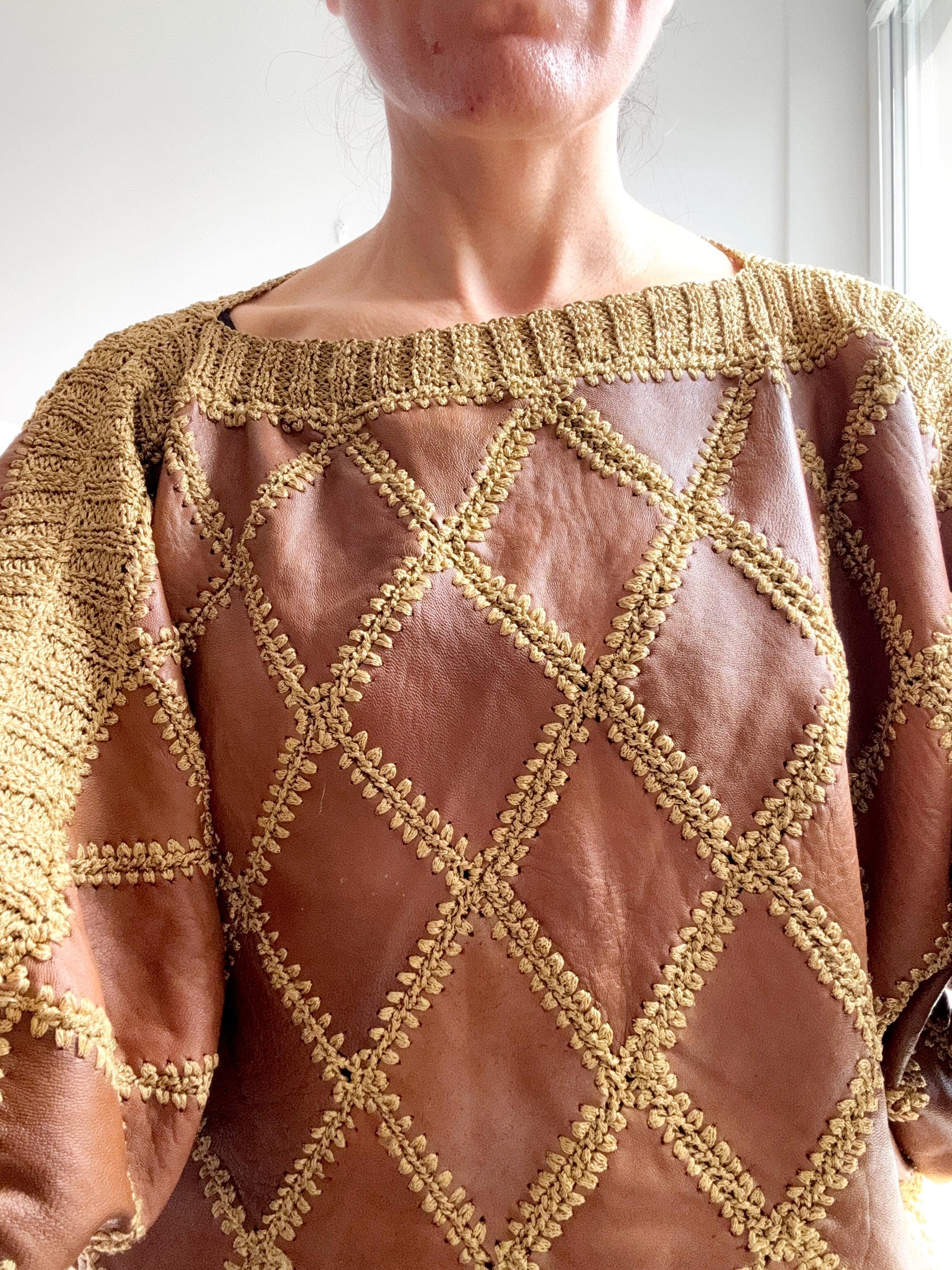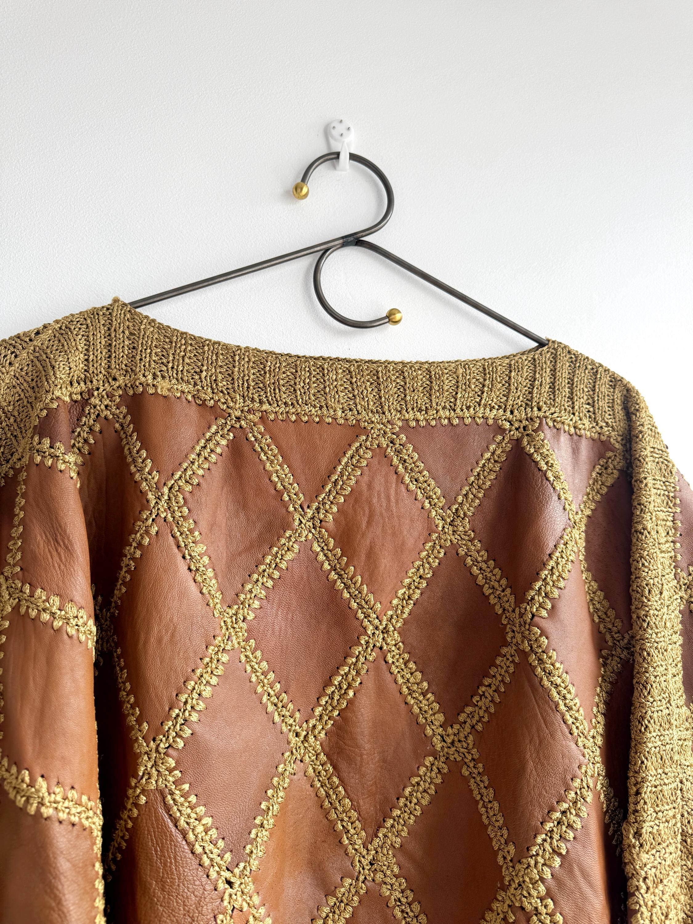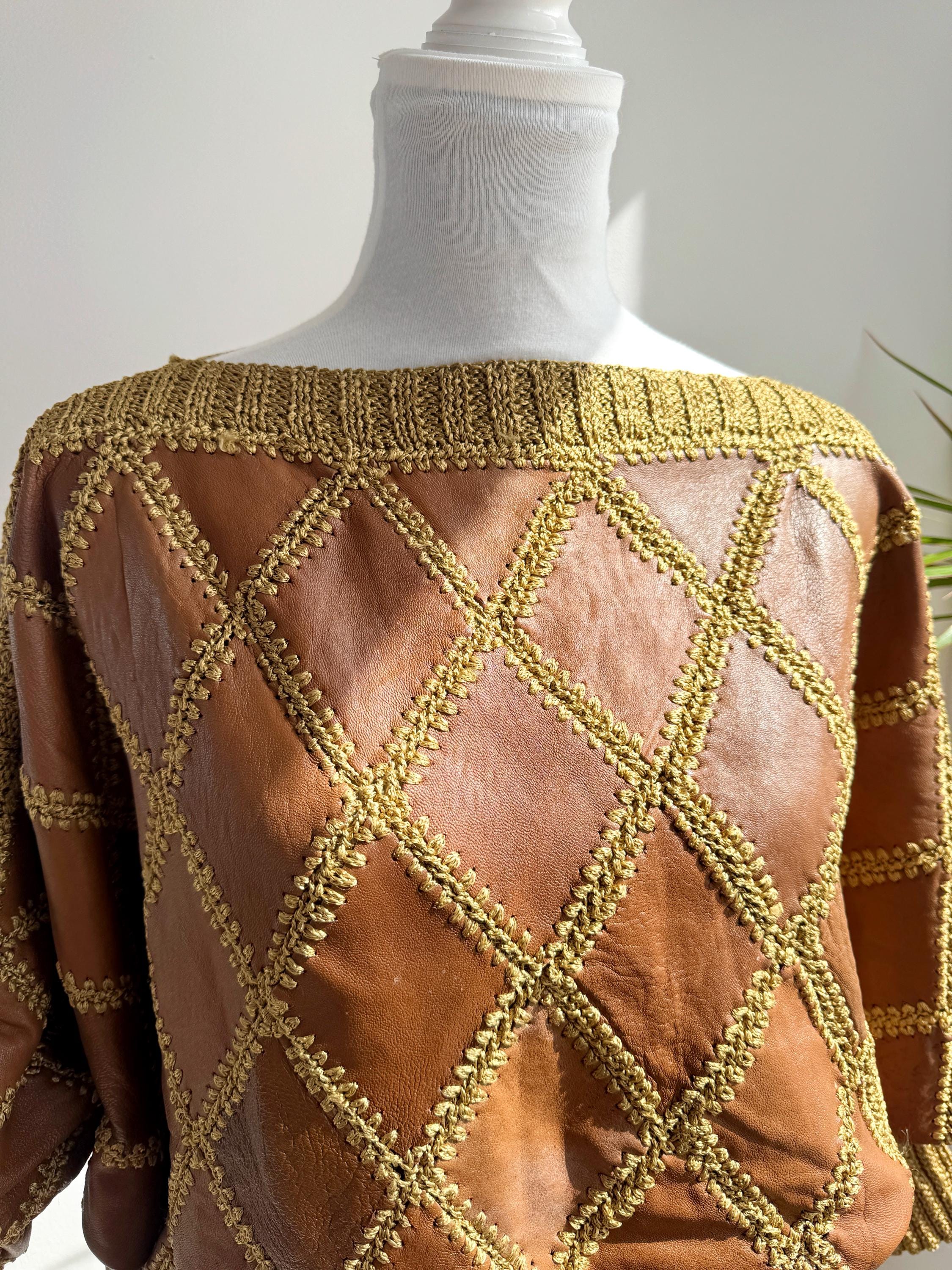 Step back into the golden era of bold, unapologetic fashion with this extraordinary vintage leather and knit patchwork sweater — a true collector's piece that blurs the line between craft and couture. Diamond-shaped cognac brown leather panels are hand-stitched together with chunky olive-gold yarn in a whipstitch technique, creating a striking argyle leather pattern that covers the entire body and sleeves. The result is something you simply won't find on any high street — rich texture, warm earth tones, and a silhouette that drapes beautifully on the body.