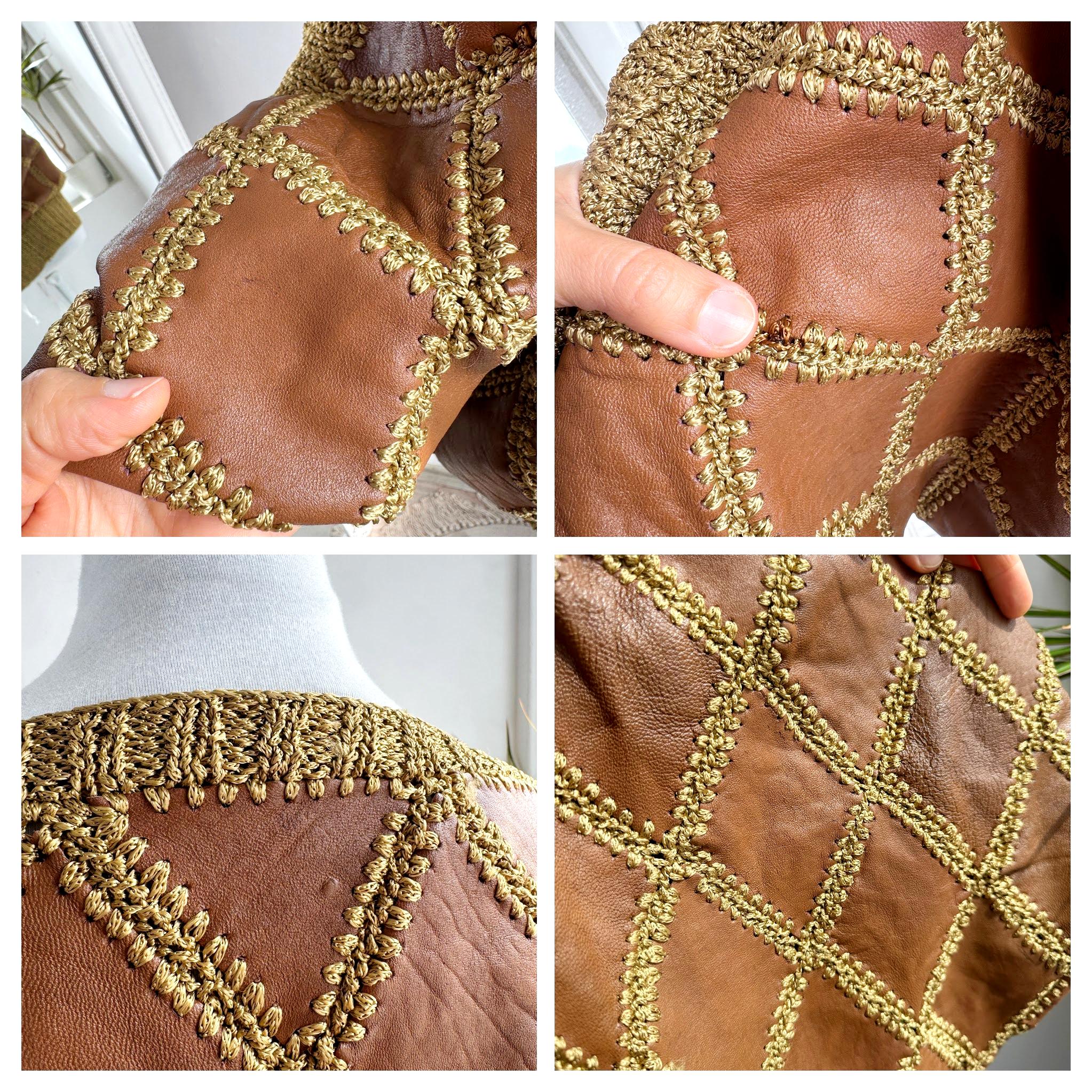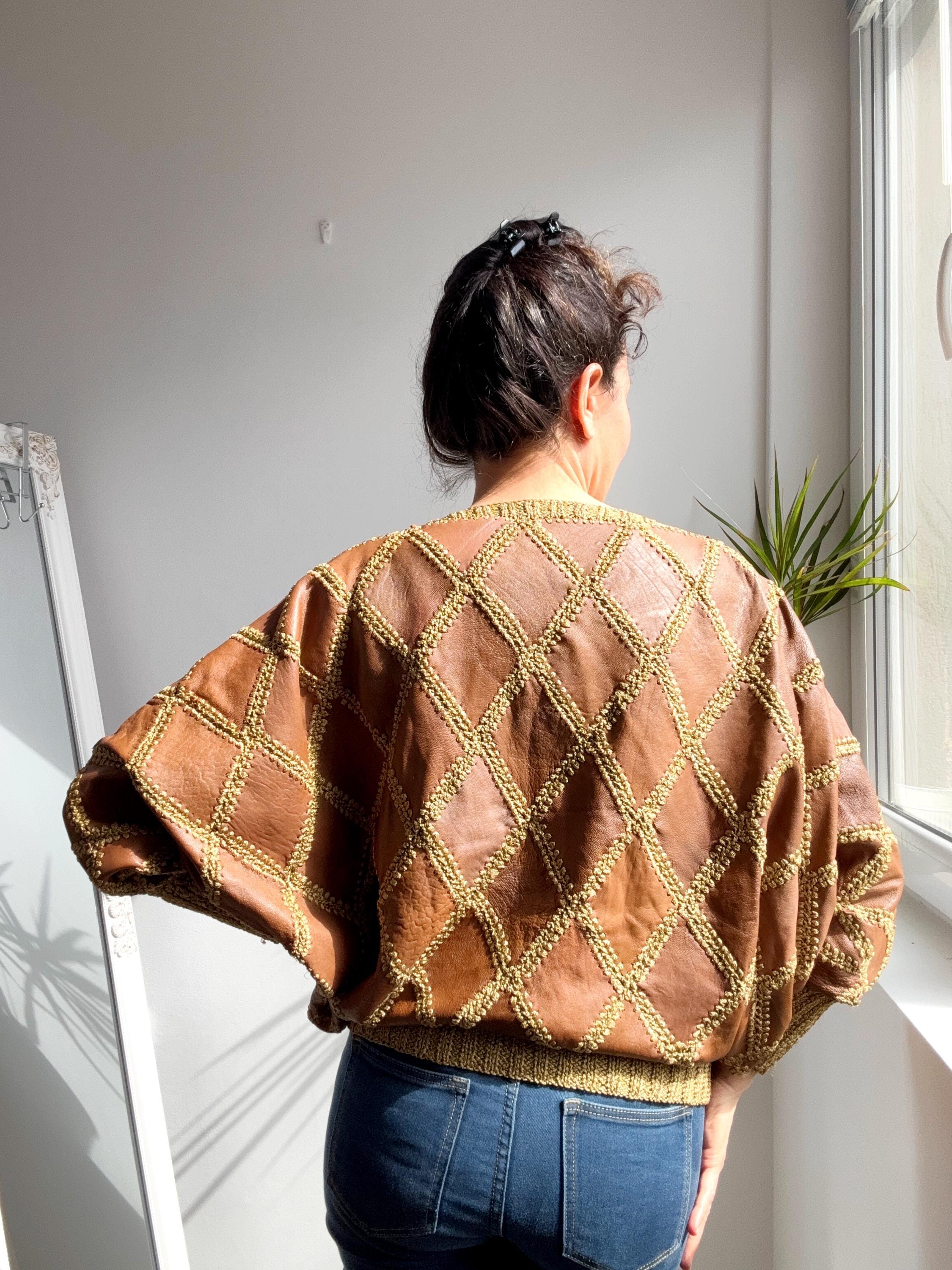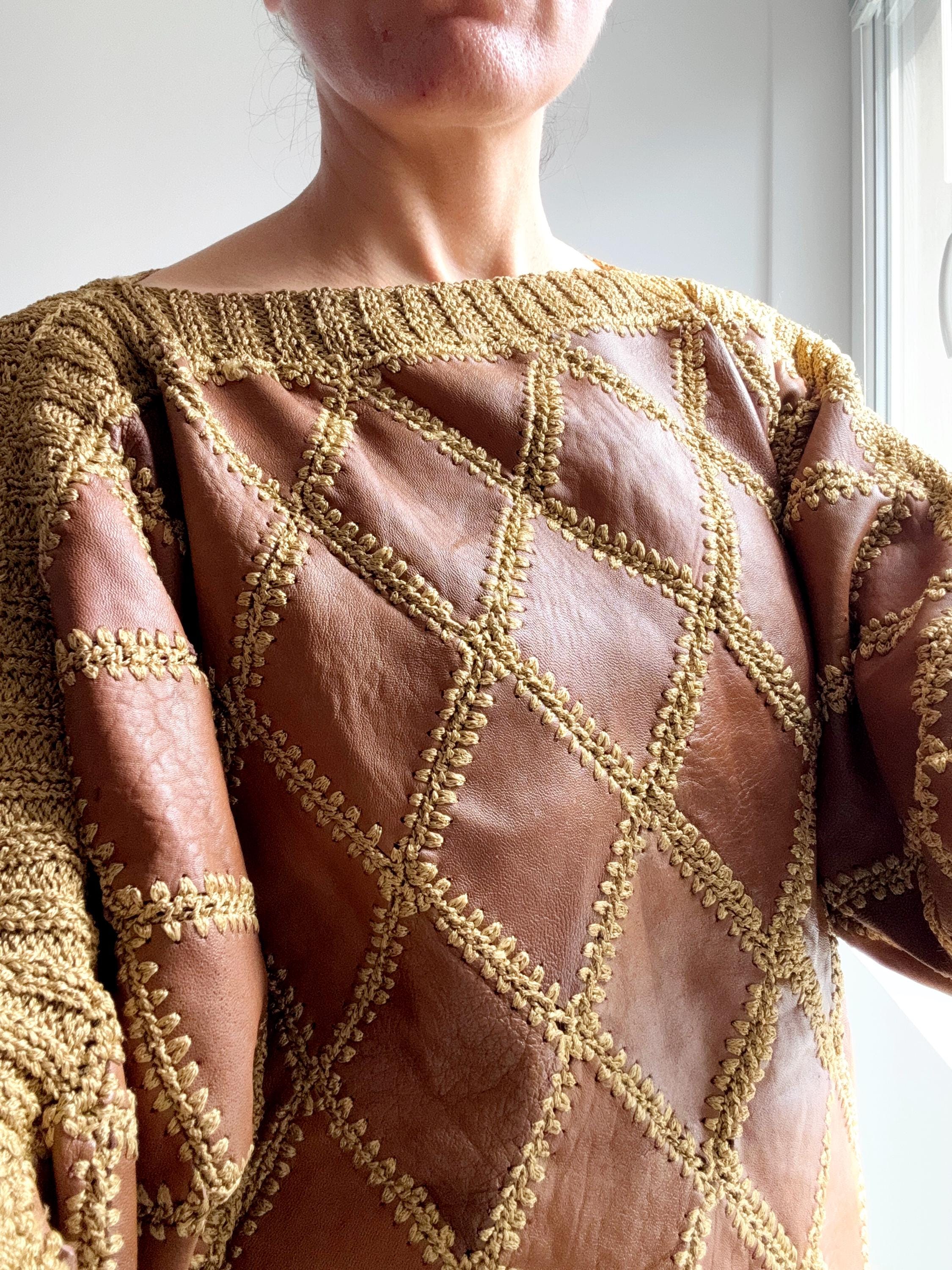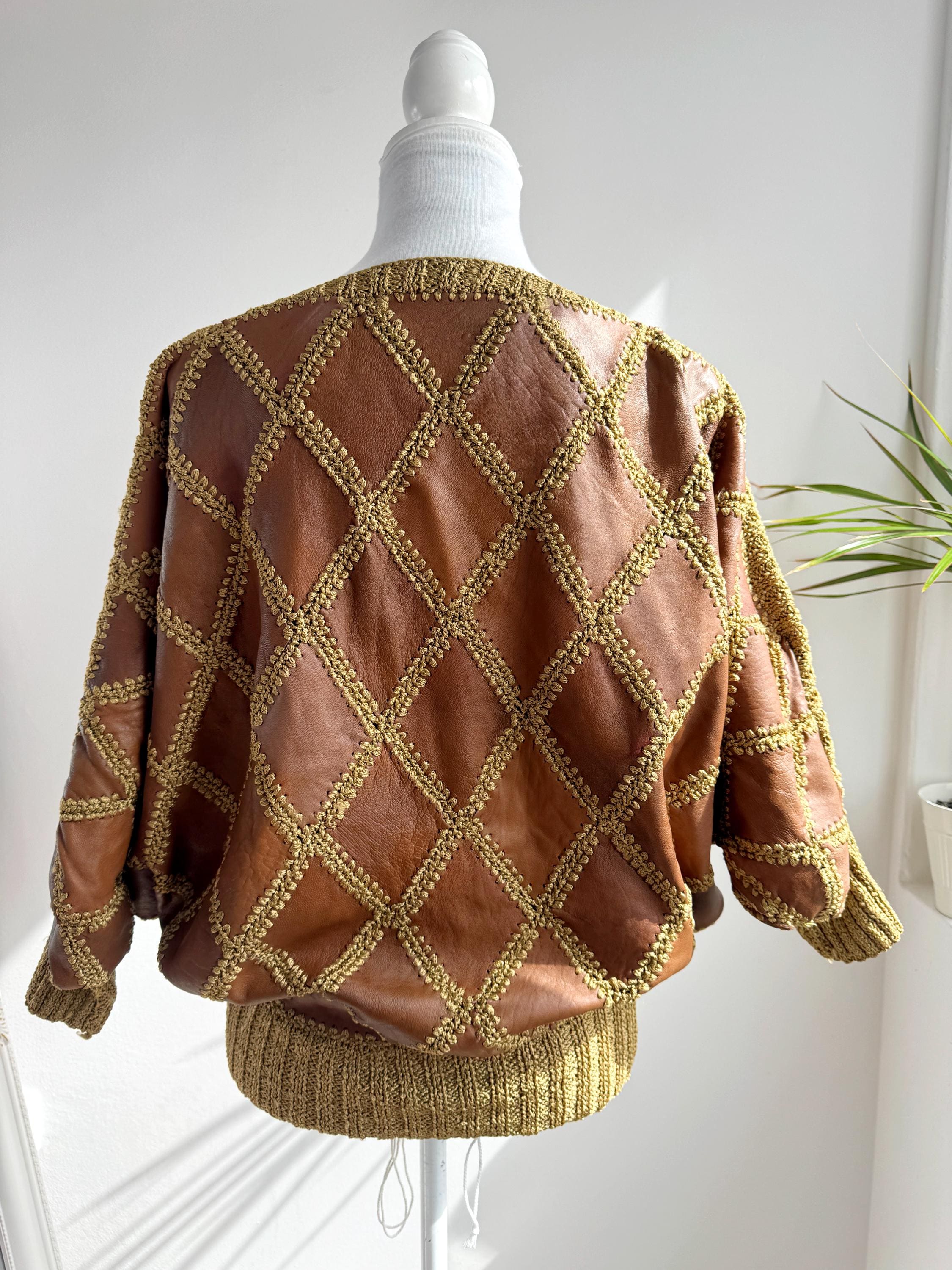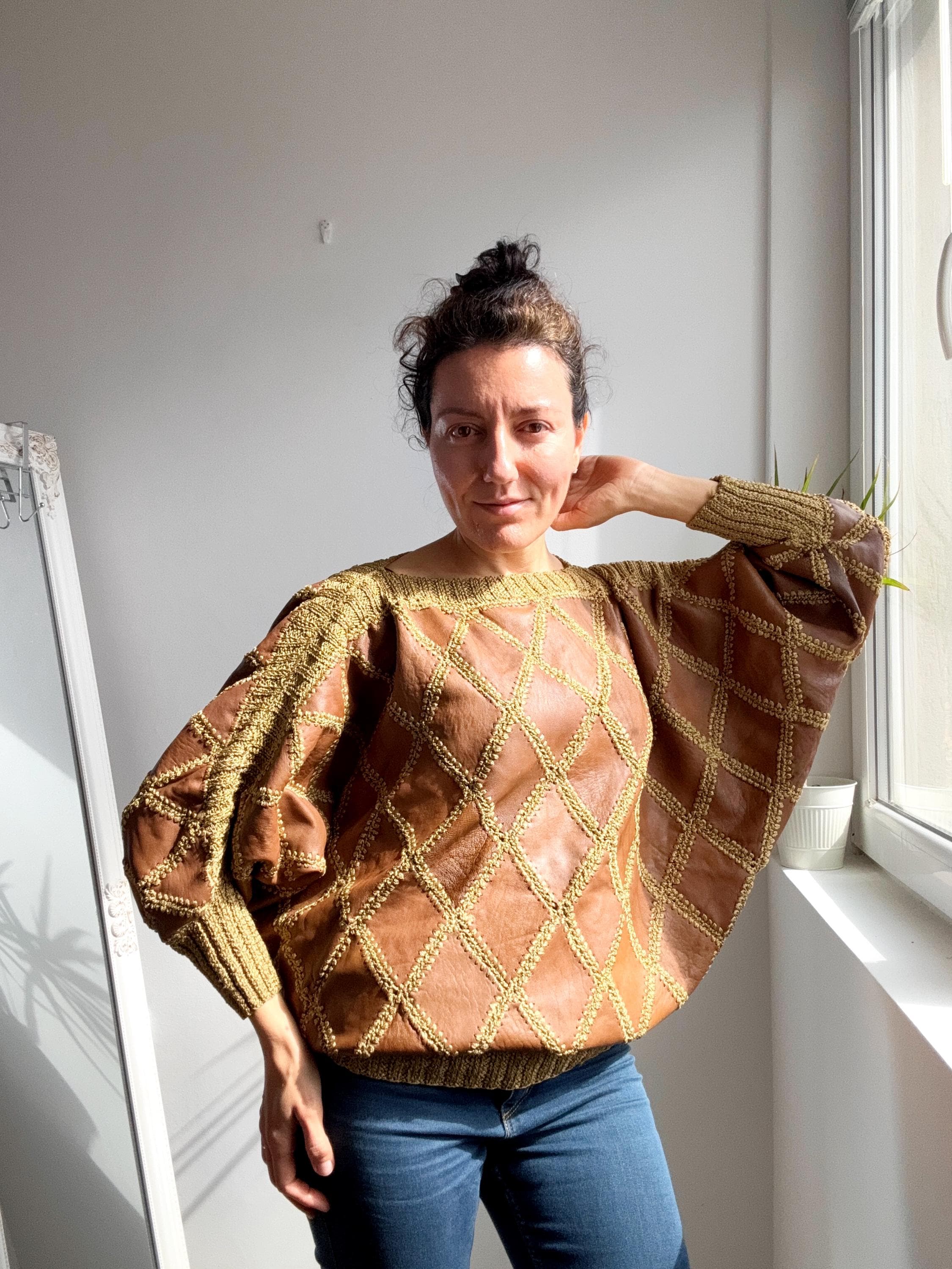 Step back into the golden era of bold, unapologetic fashion with this extraordinary vintage leather and knit patchwork sweater — a true collector's piece that blurs the line between craft and couture. Diamond-shaped cognac brown leather panels are hand-stitched together with chunky olive-gold yarn in a whipstitch technique, creating a striking argyle leather pattern that covers the entire body and sleeves. The result is something you simply won't find on any high street — rich texture, warm earth tones, and a silhouette that drapes beautifully on the body.