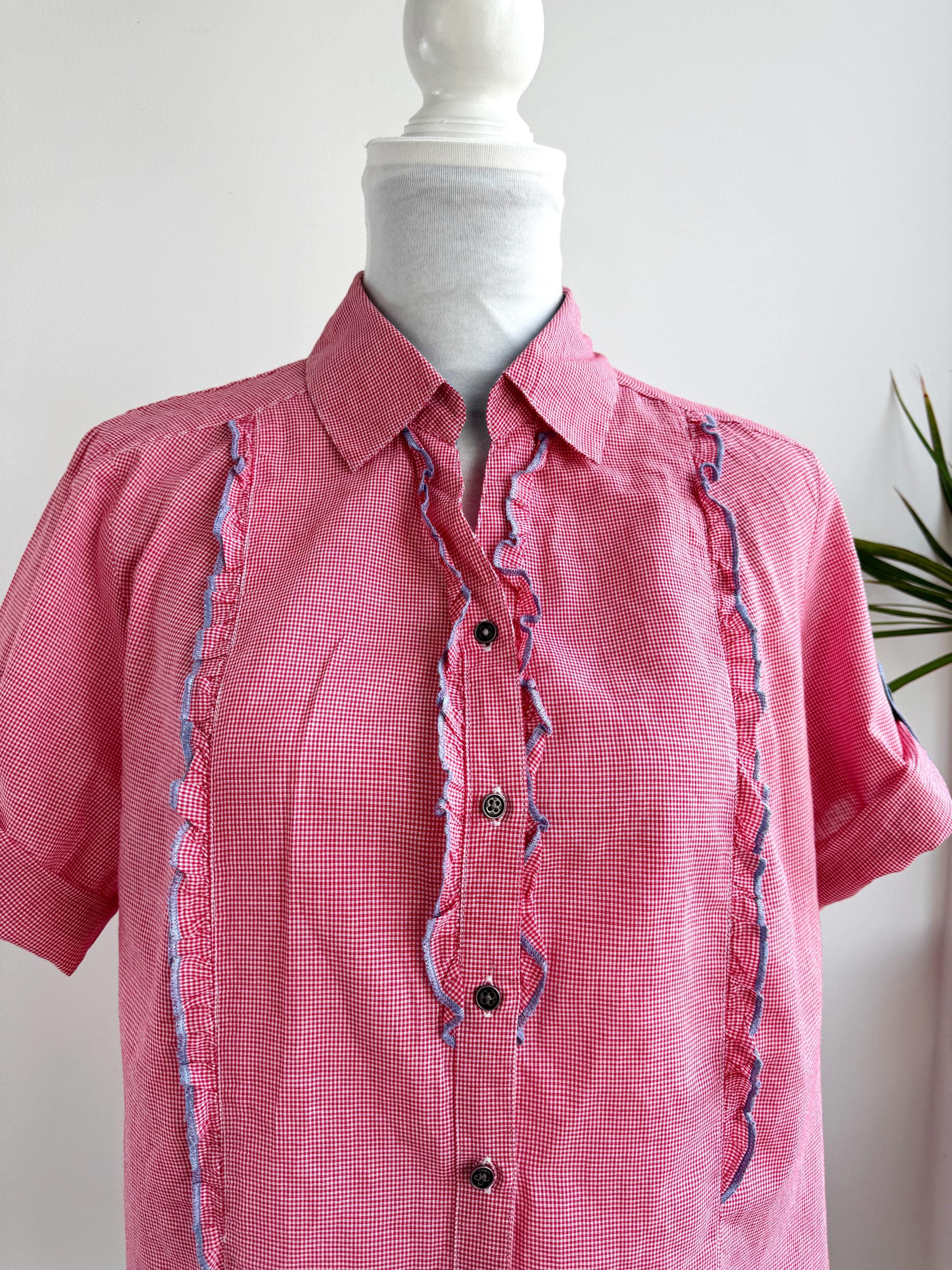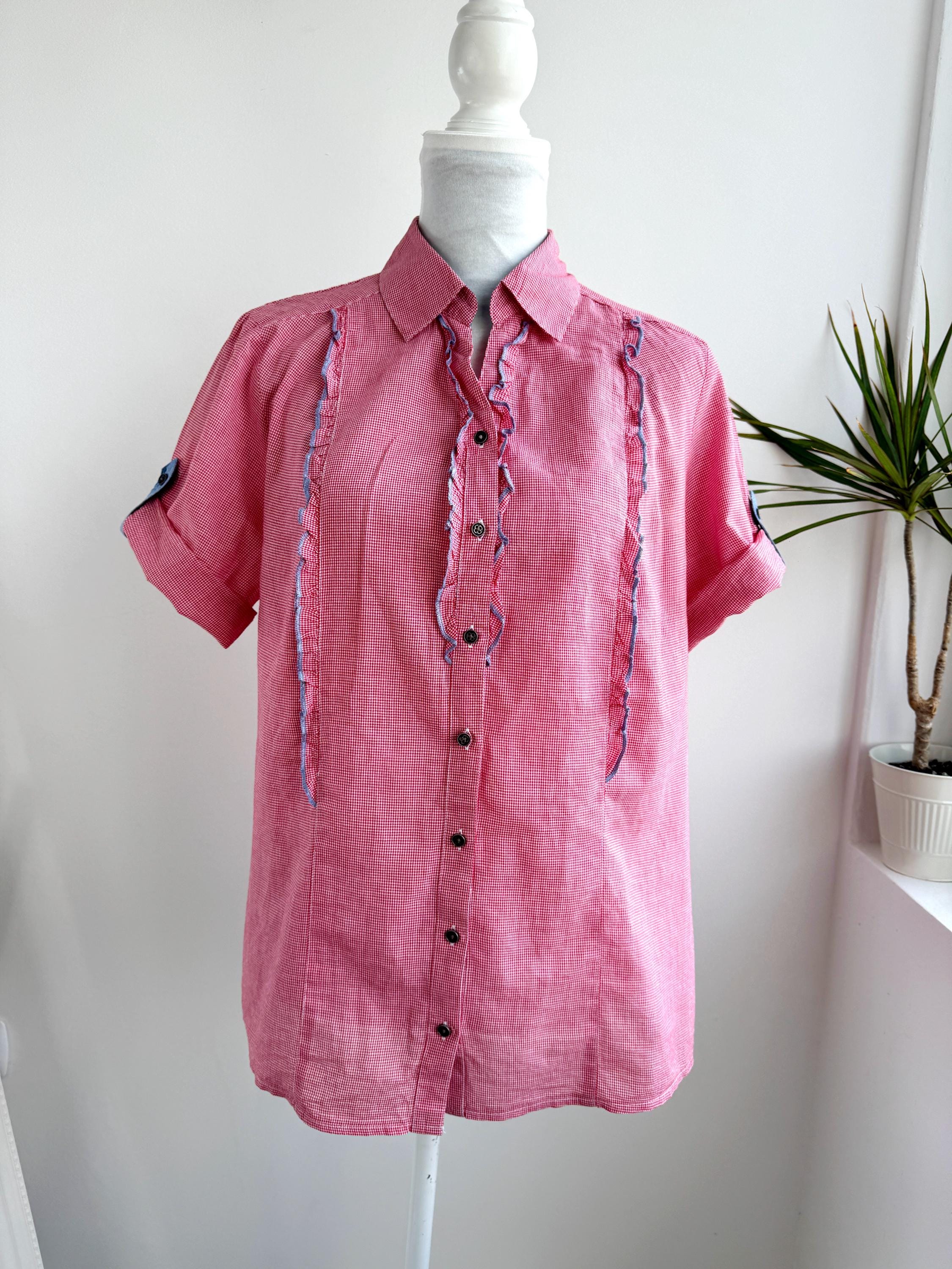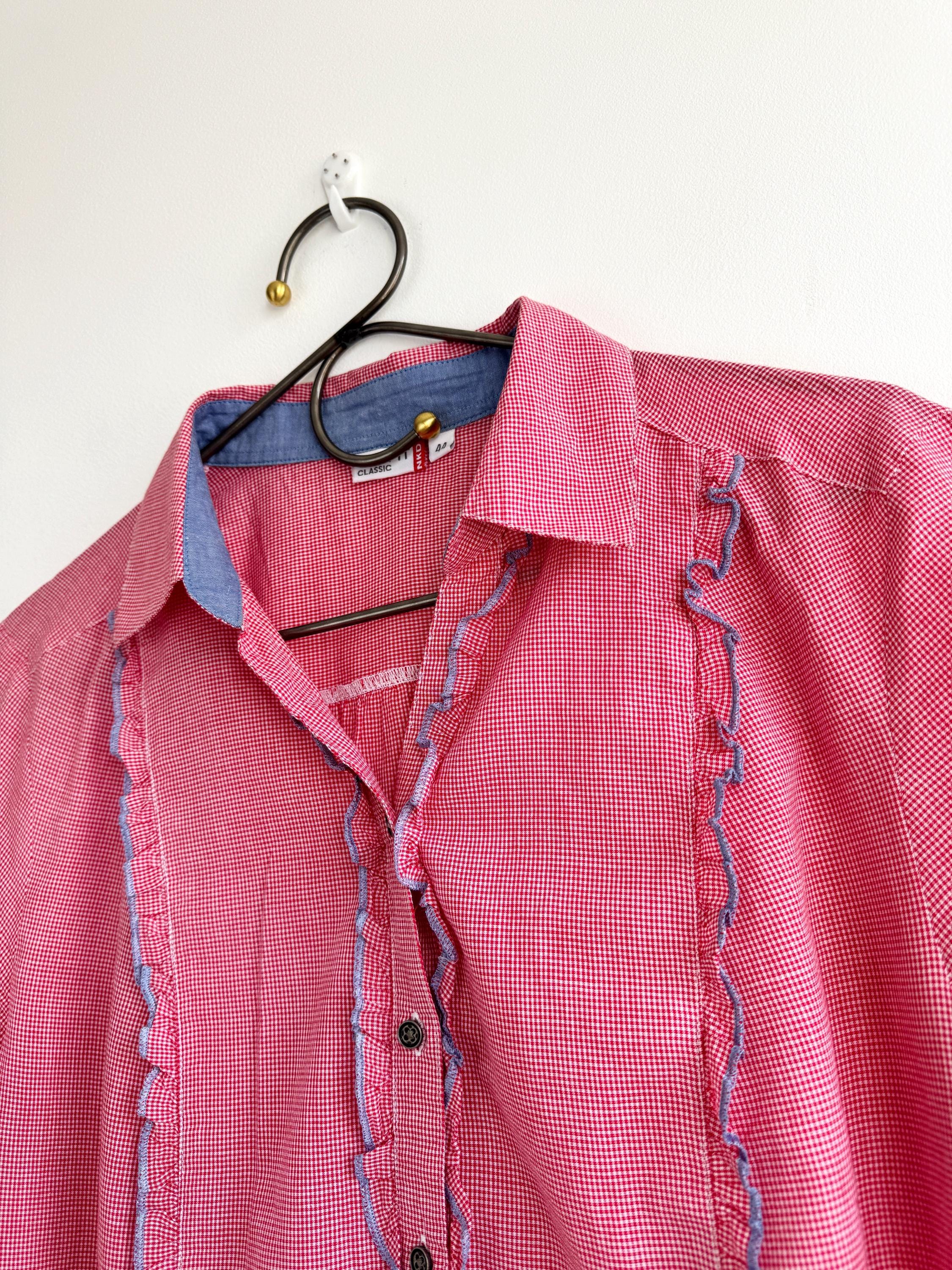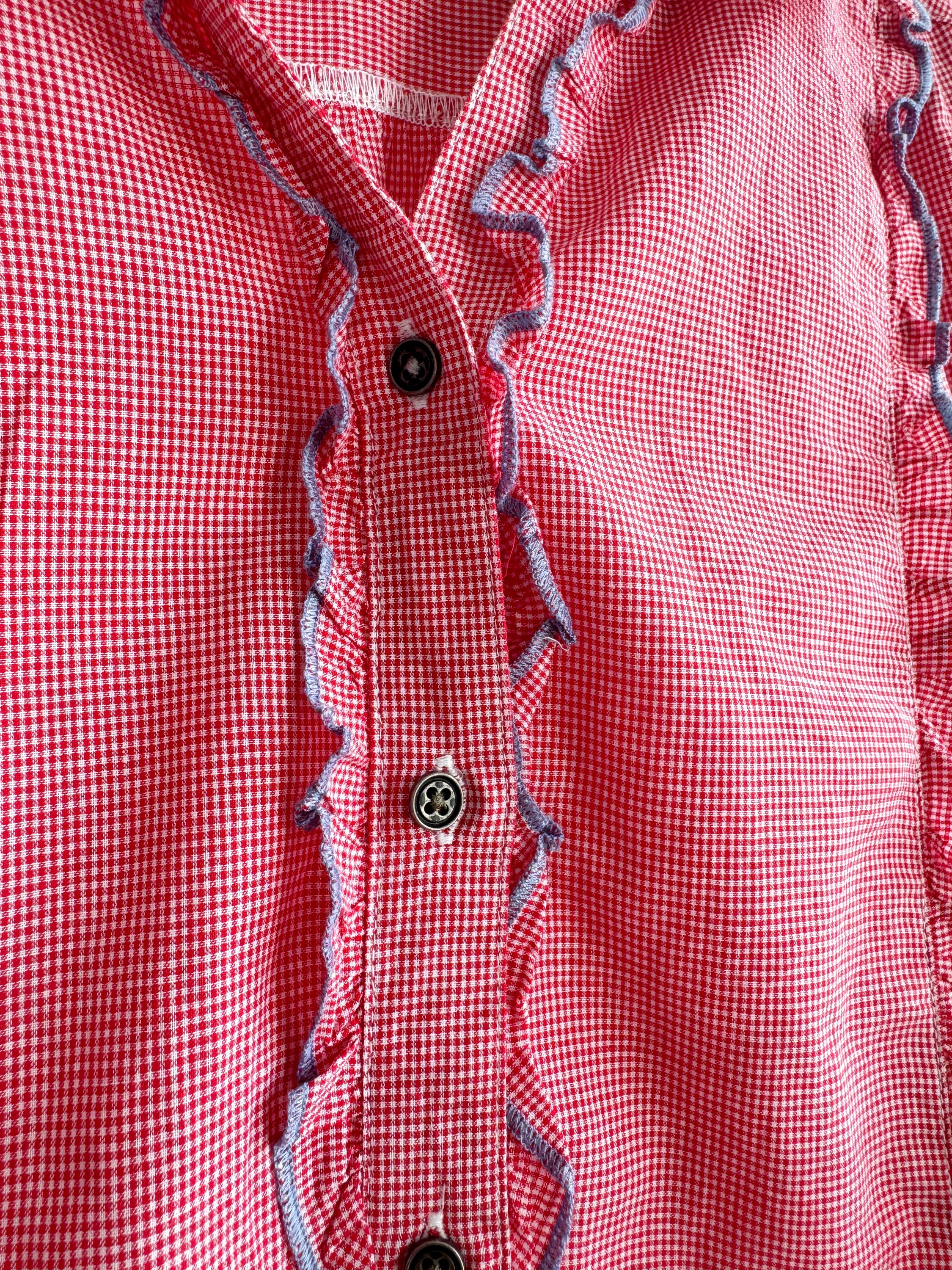 If you love a piece that feels like a sunny afternoon in the countryside, this charming red gingham ruffle blouse is calling your name. With its playful double ruffle placket edged in soft blue chambray, dark gunmetal buttons, and a relaxed short-sleeve silhouette, this shirt sits perfectly at the crossroads of cottage core, folk style, and vintage summer casual. The micro gingham check in classic red and white gives it that timeless picnic-ready energy, while the blue contrast trim on the collar lining, sleeve tab, and ruffles adds a thoughtful, considered detail you rarely find at this price point.