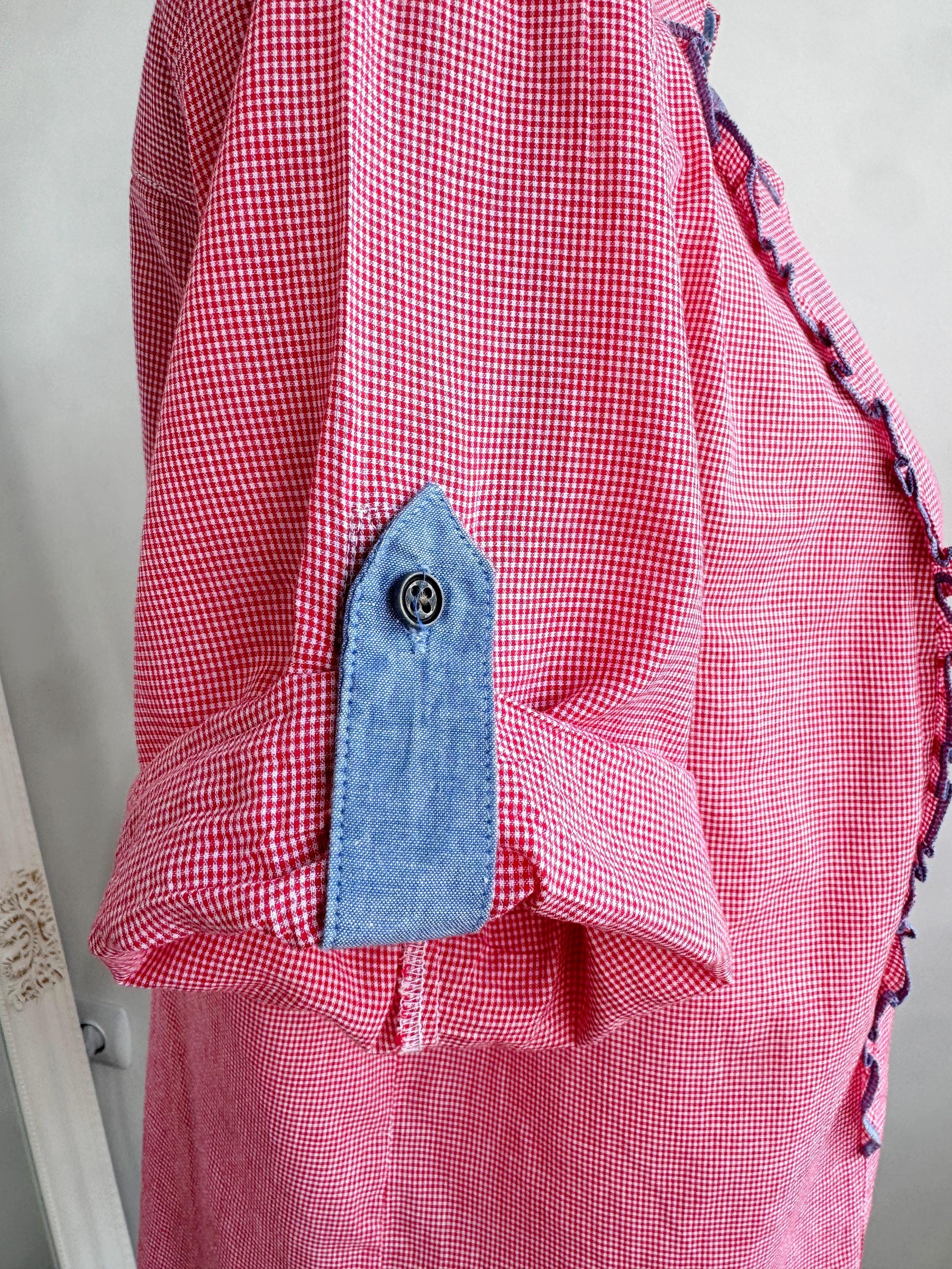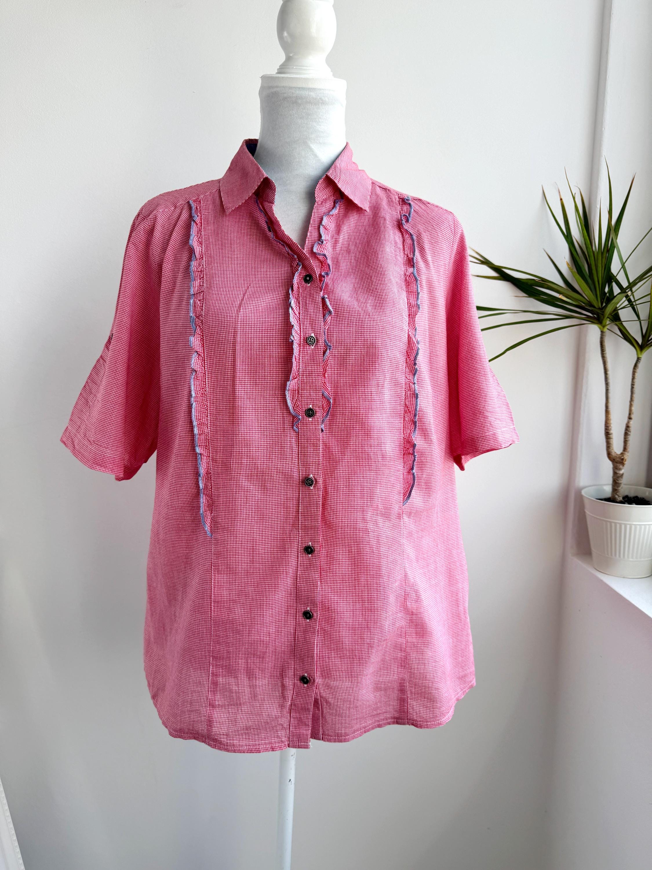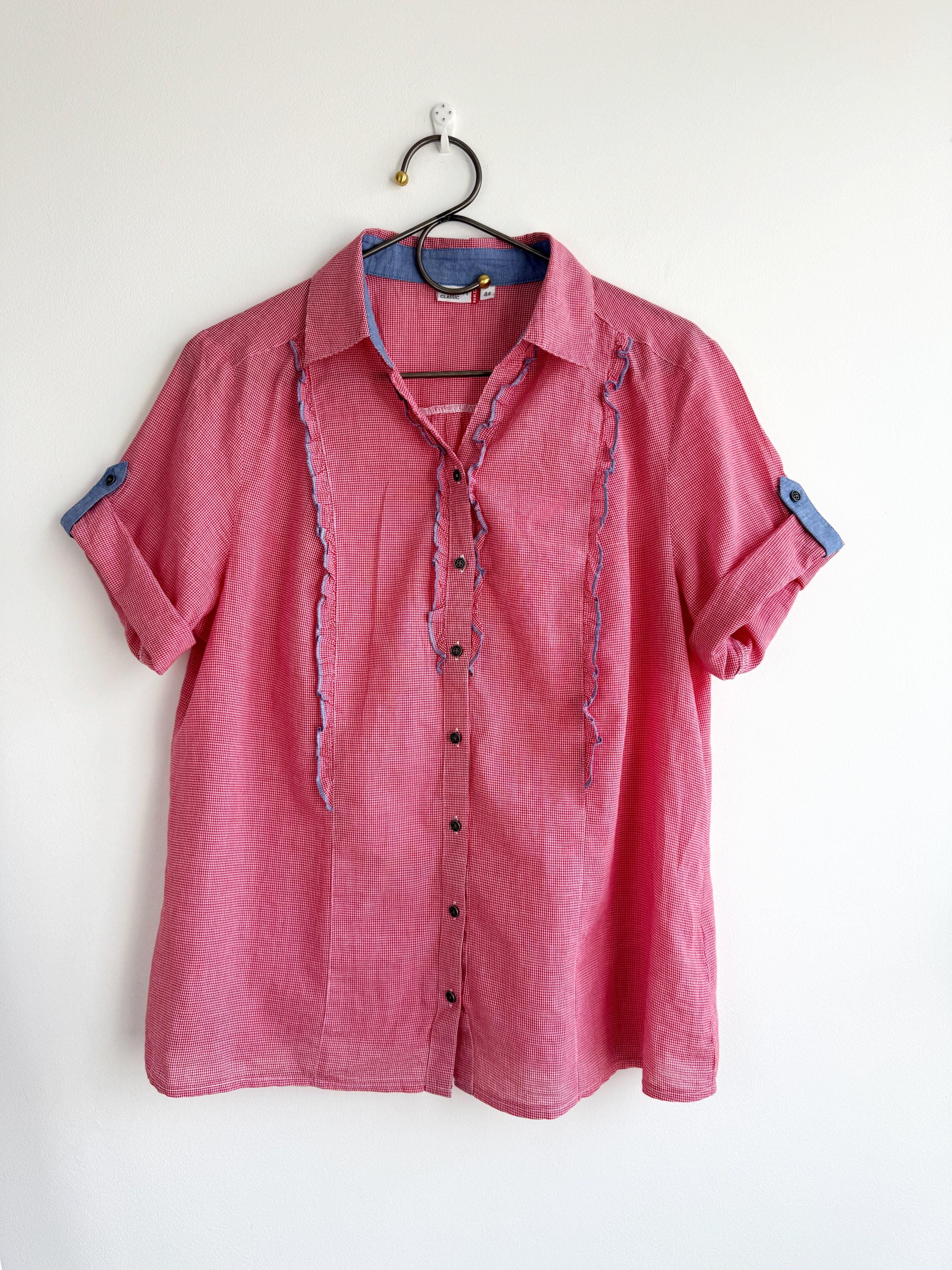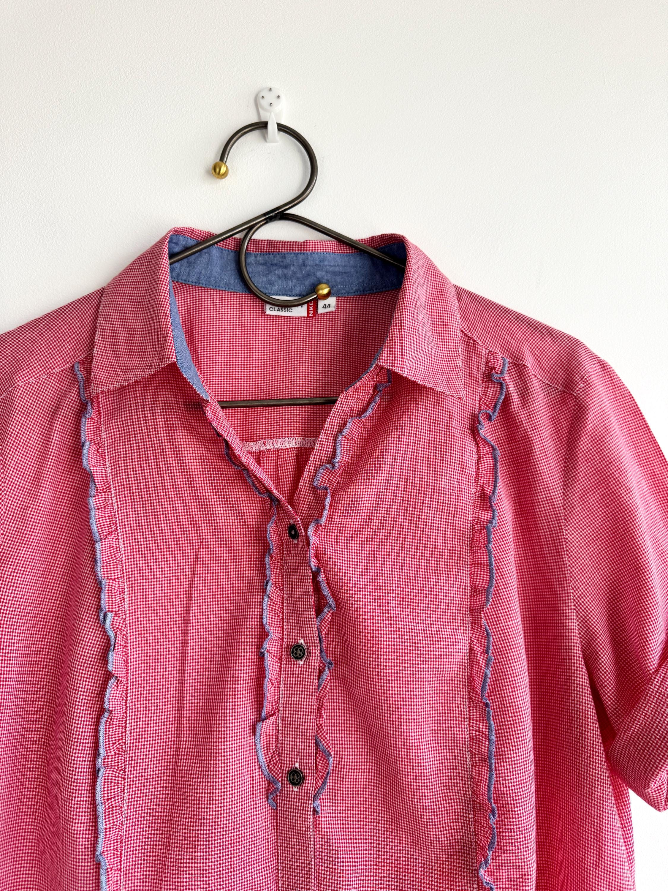 If you love a piece that feels like a sunny afternoon in the countryside, this charming red gingham ruffle blouse is calling your name. With its playful double ruffle placket edged in soft blue chambray, dark gunmetal buttons, and a relaxed short-sleeve silhouette, this shirt sits perfectly at the crossroads of cottage core, folk style, and vintage summer casual. The micro gingham check in classic red and white gives it that timeless picnic-ready energy, while the blue contrast trim on the collar lining, sleeve tab, and ruffles adds a thoughtful, considered detail you rarely find at this price point.
