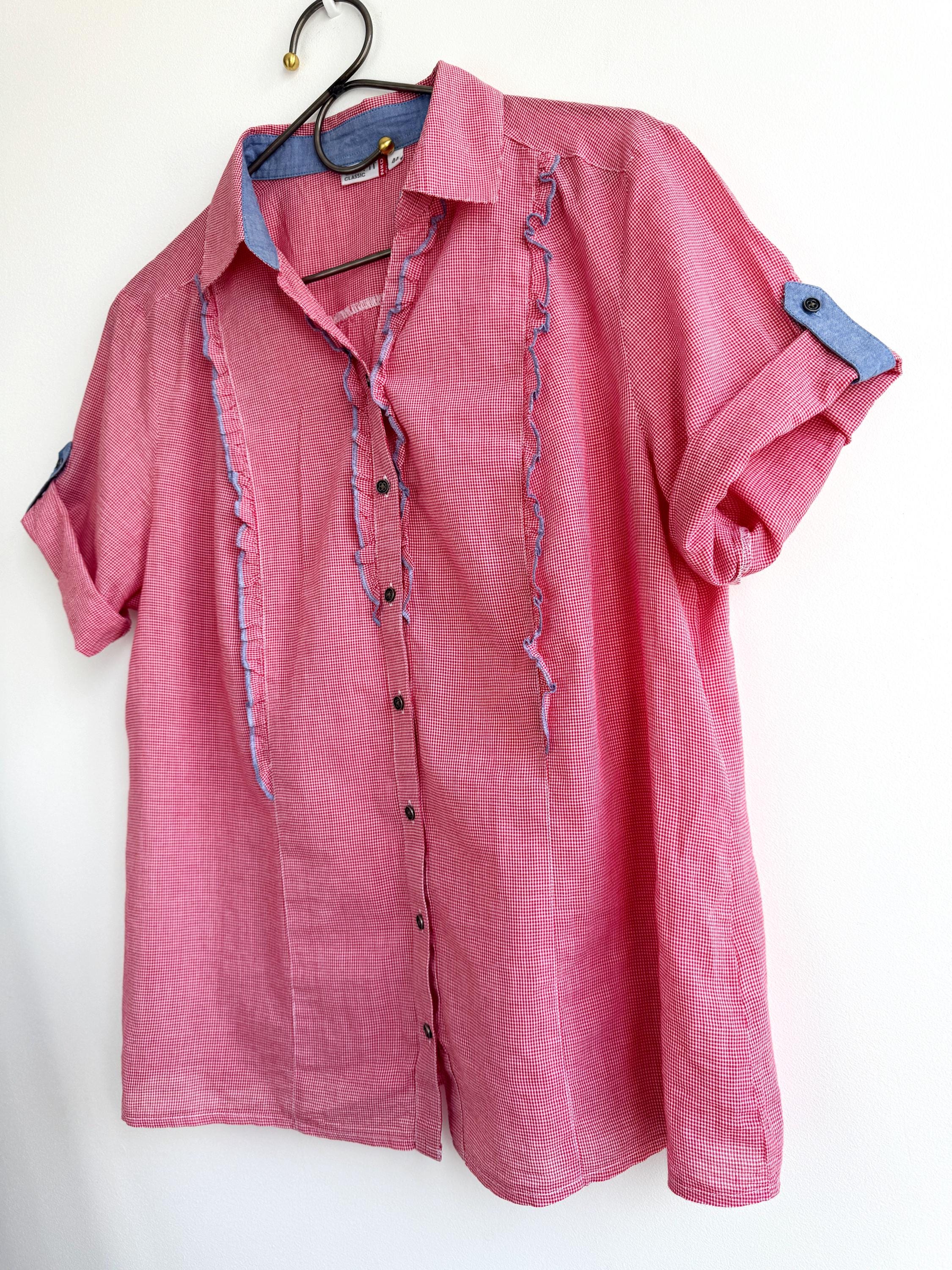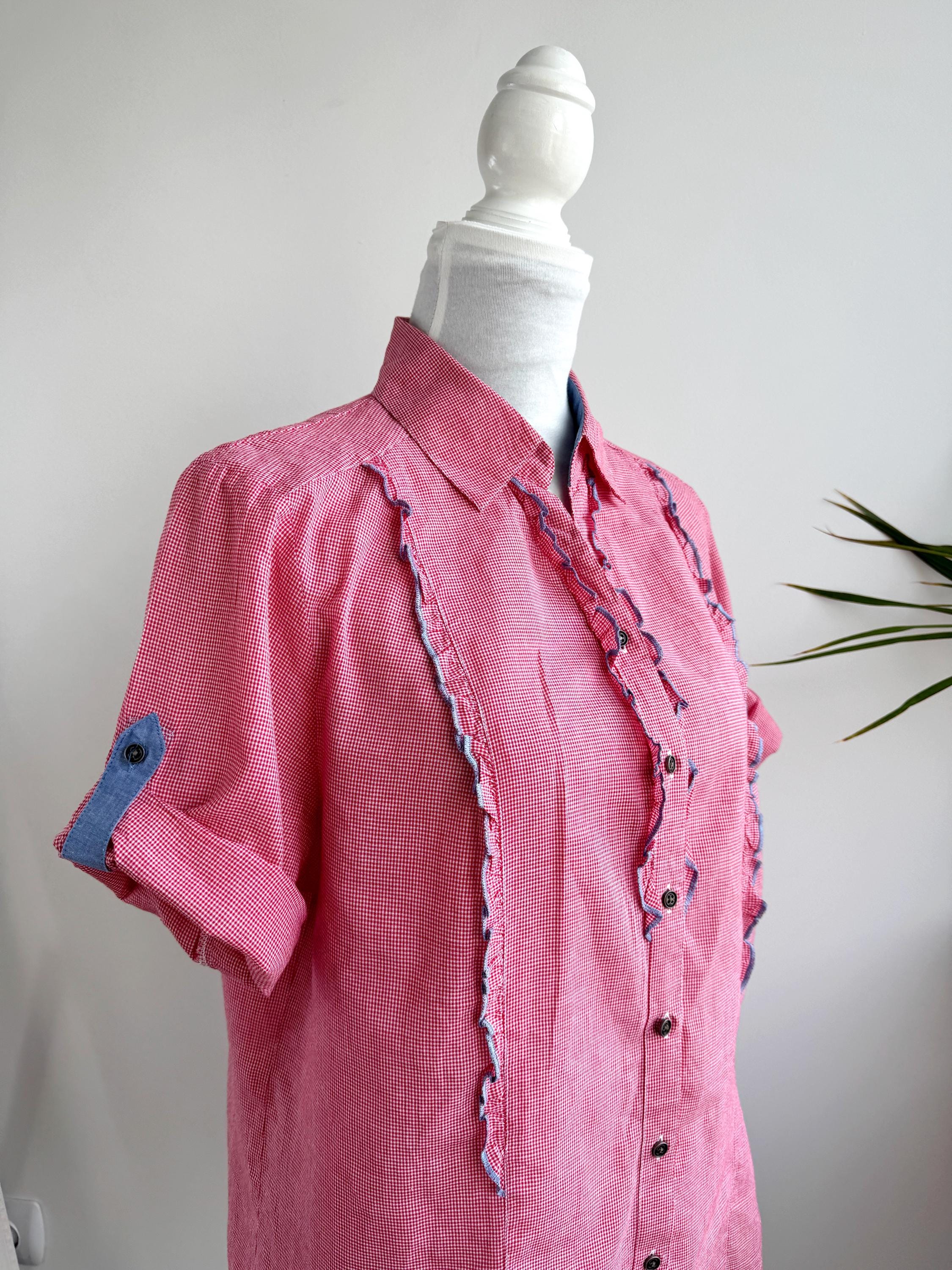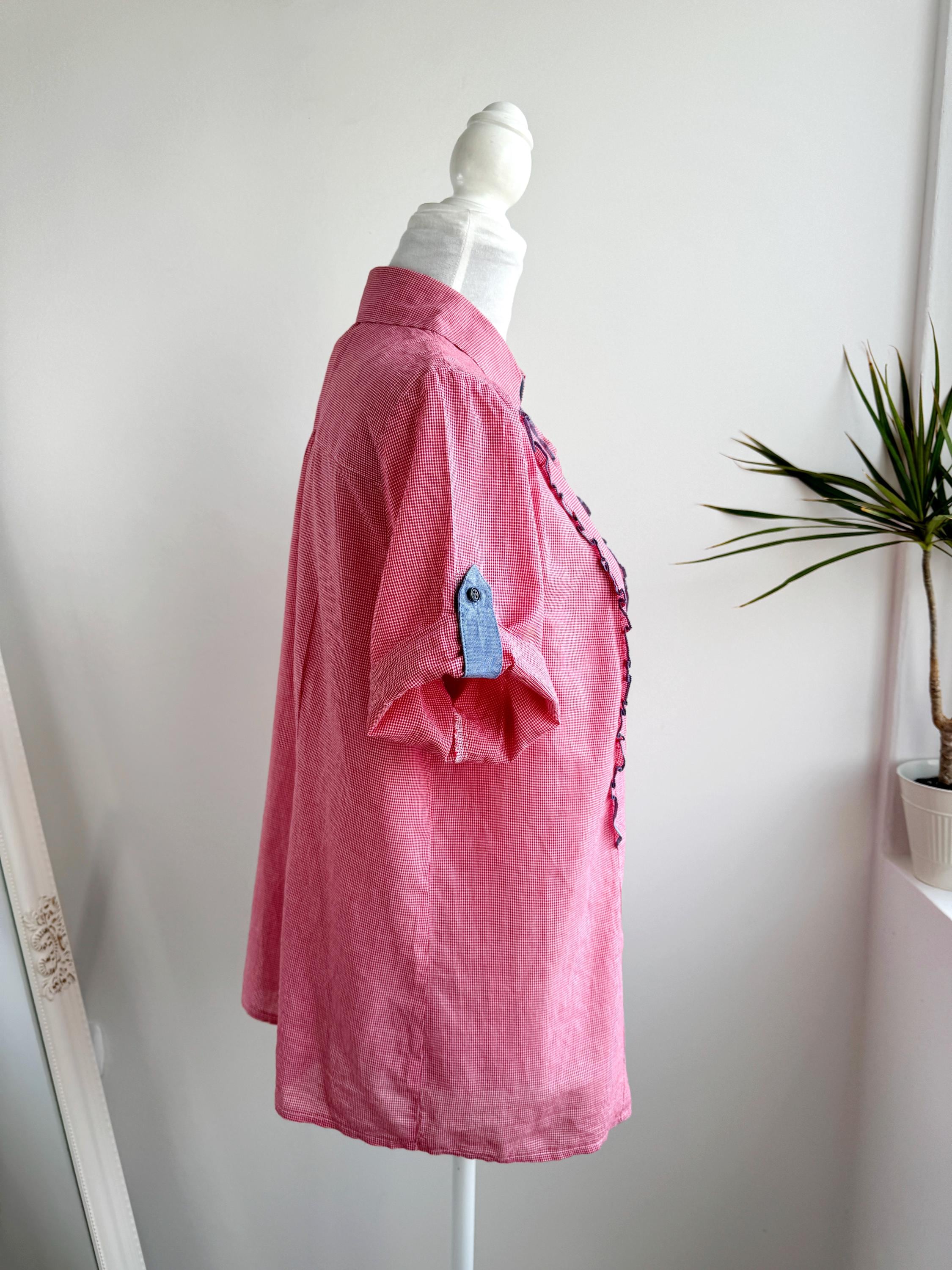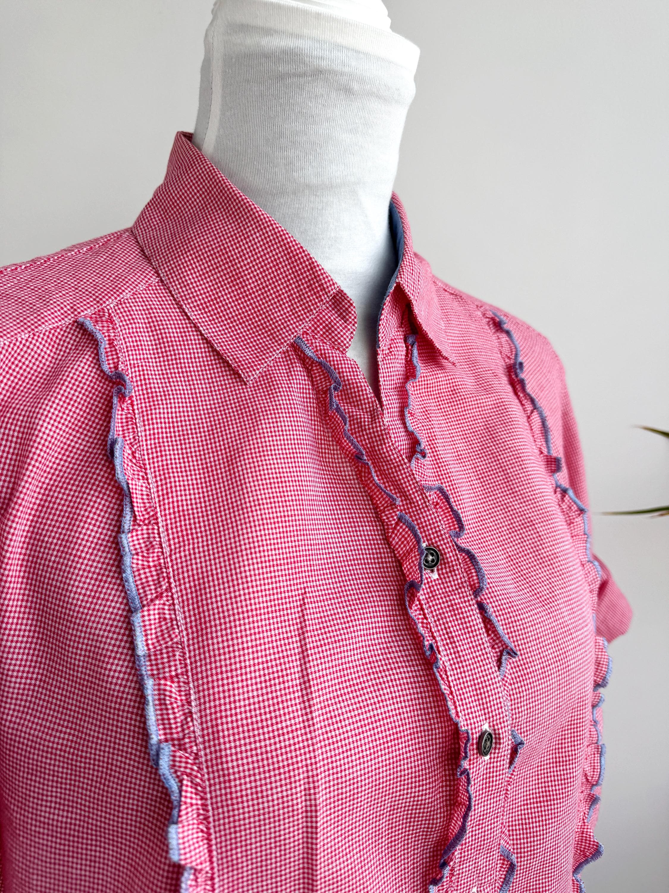 If you love a piece that feels like a sunny afternoon in the countryside, this charming red gingham ruffle blouse is calling your name. With its playful double ruffle placket edged in soft blue chambray, dark gunmetal buttons, and a relaxed short-sleeve silhouette, this shirt sits perfectly at the crossroads of cottage core, folk style, and vintage summer casual. The micro gingham check in classic red and white gives it that timeless picnic-ready energy, while the blue contrast trim on the collar lining, sleeve tab, and ruffles adds a thoughtful, considered detail you rarely find at this price point.