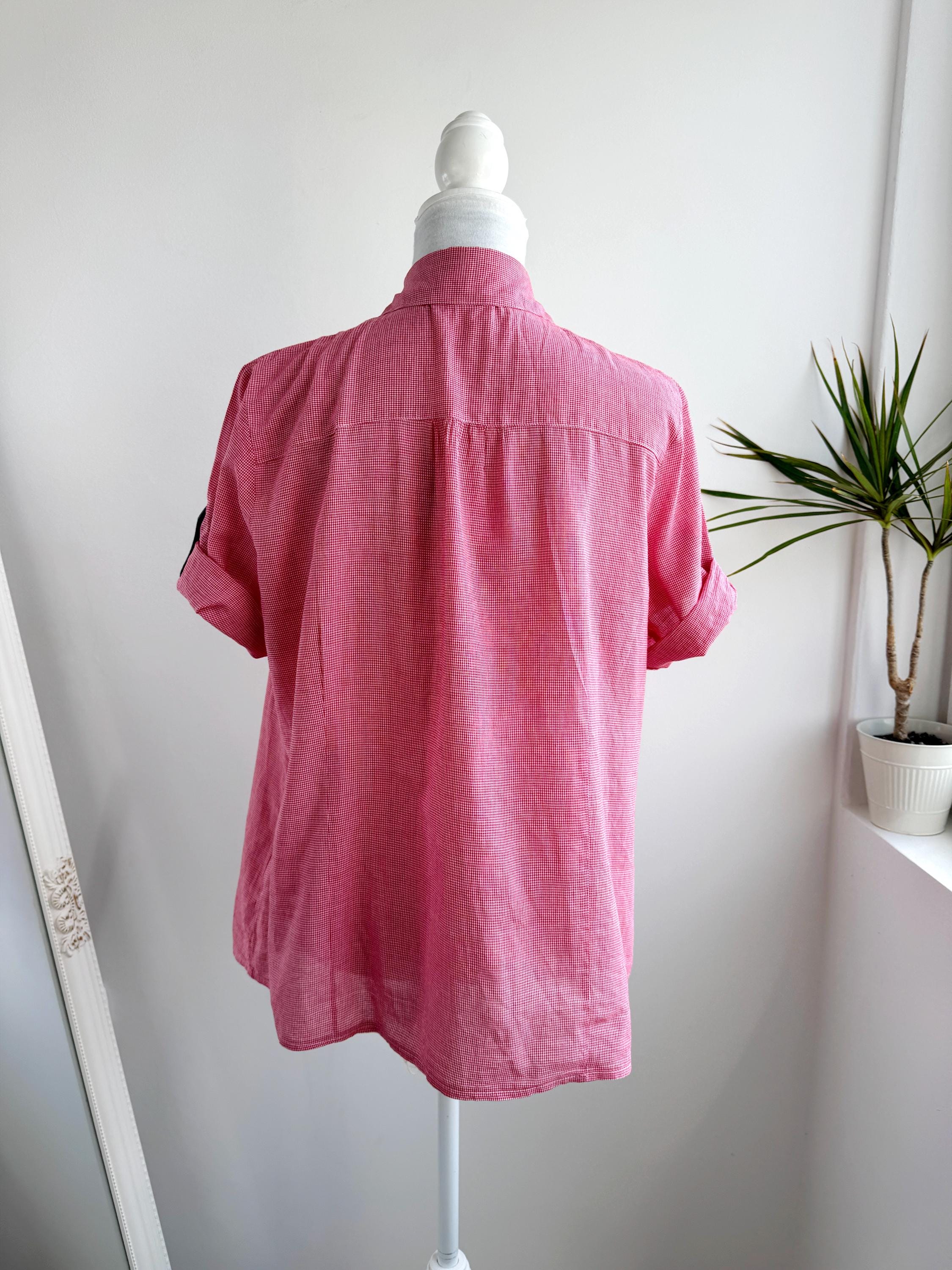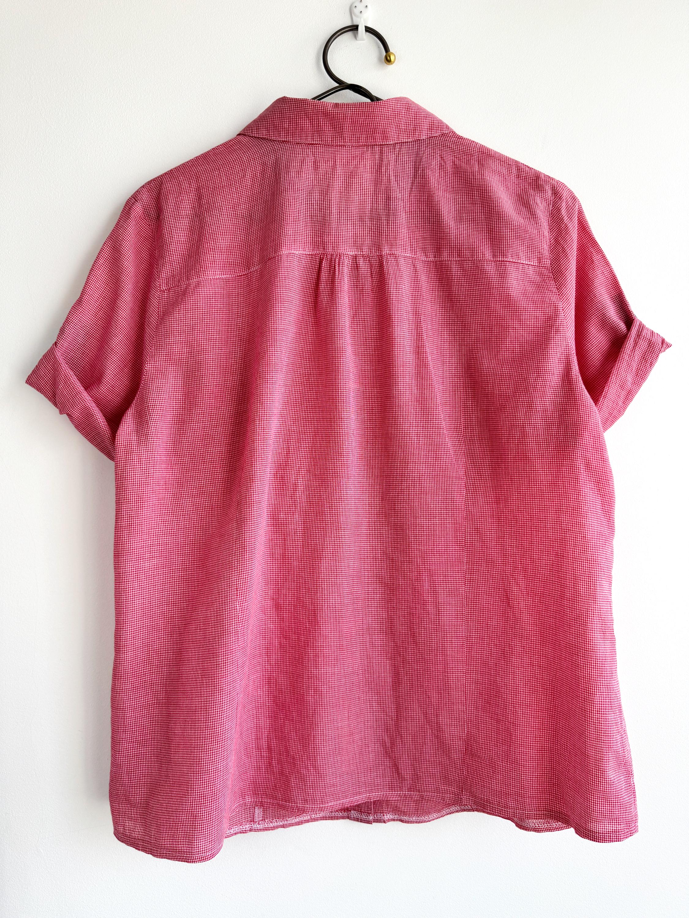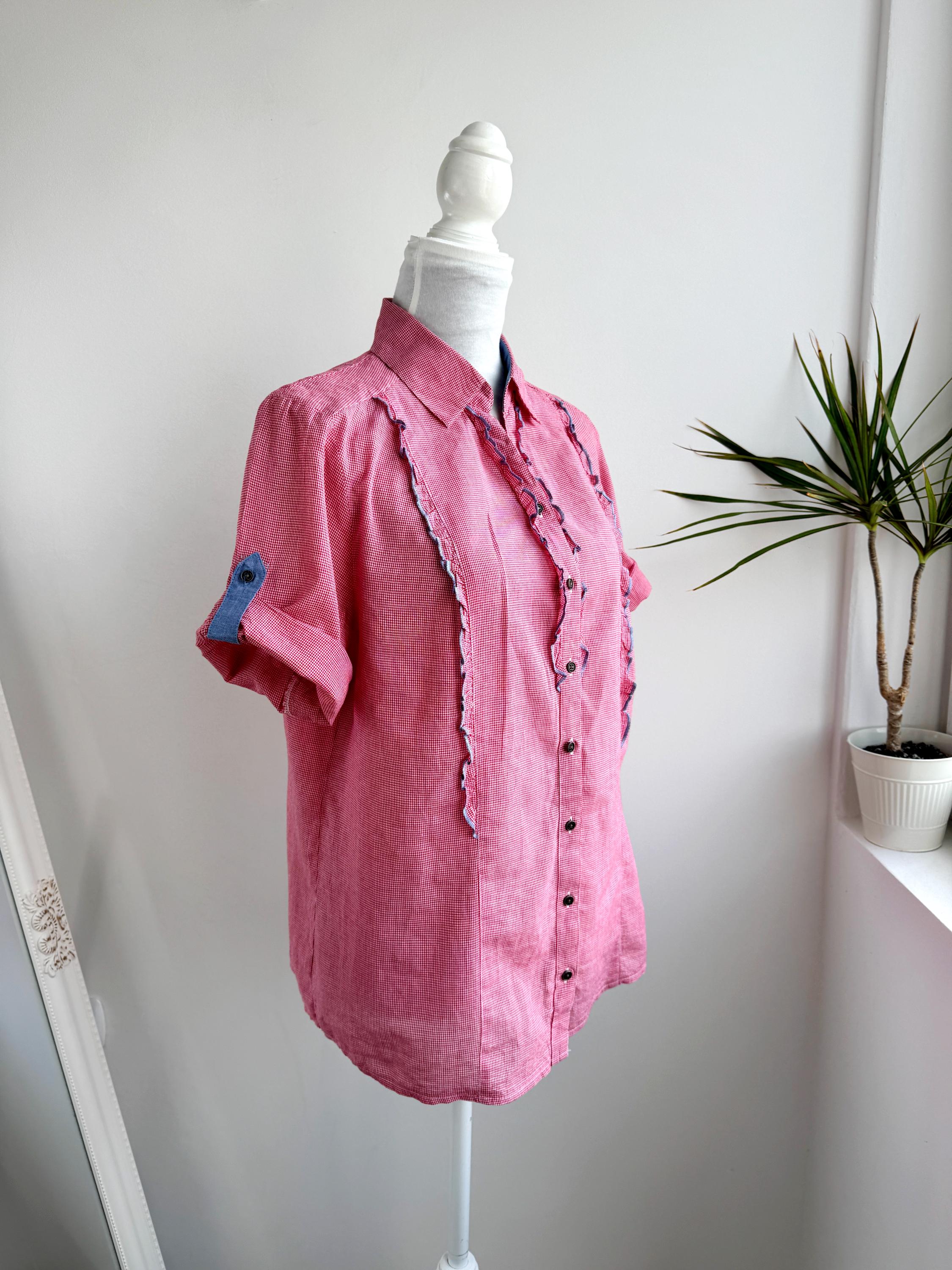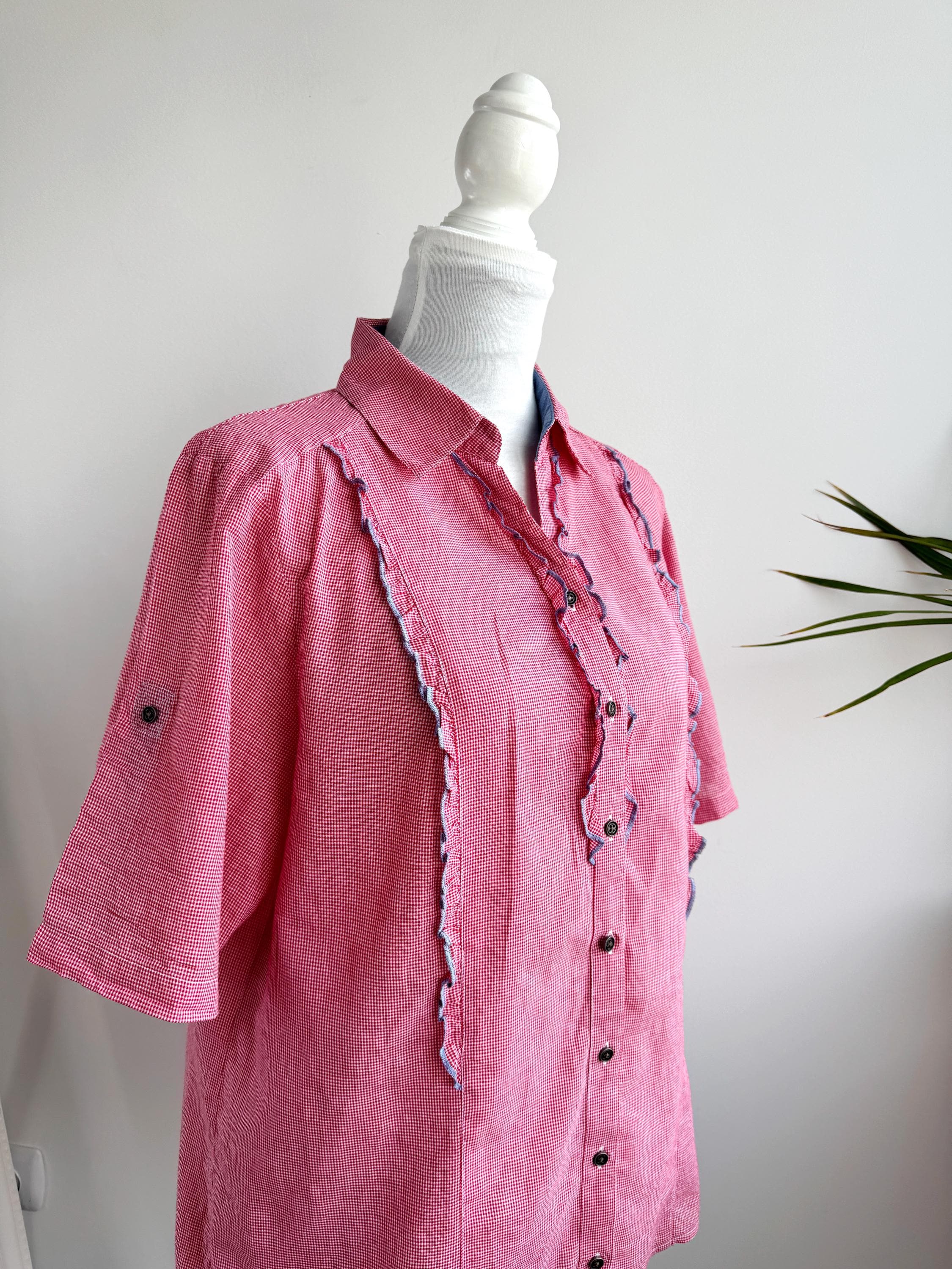 If you love a piece that feels like a sunny afternoon in the countryside, this charming red gingham ruffle blouse is calling your name. With its playful double ruffle placket edged in soft blue chambray, dark gunmetal buttons, and a relaxed short-sleeve silhouette, this shirt sits perfectly at the crossroads of cottage core, folk style, and vintage summer casual. The micro gingham check in classic red and white gives it that timeless picnic-ready energy, while the blue contrast trim on the collar lining, sleeve tab, and ruffles adds a thoughtful, considered detail you rarely find at this price point.