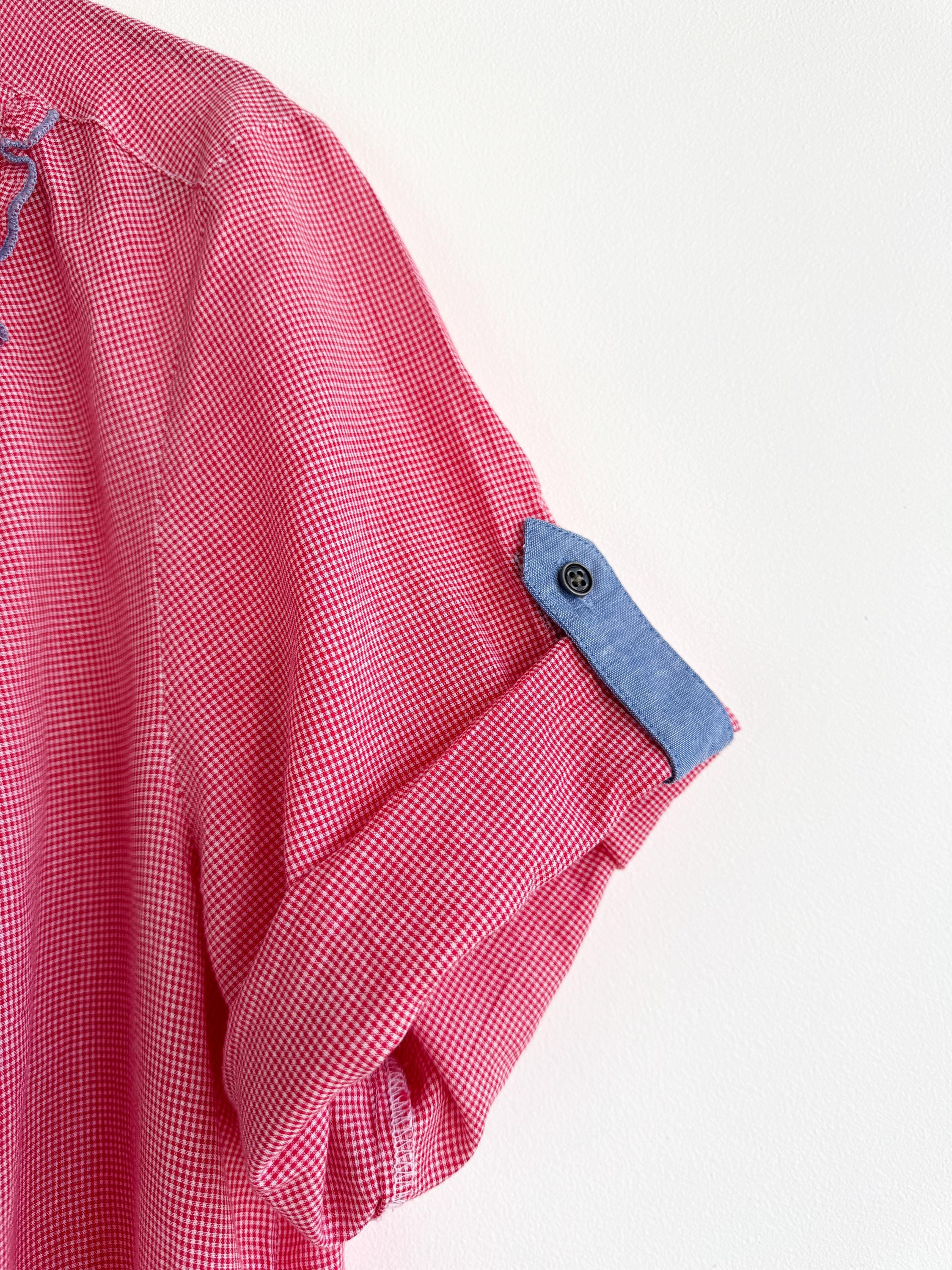 🎨 Color: Red and white micro gingham check with blue chambray contrast trim