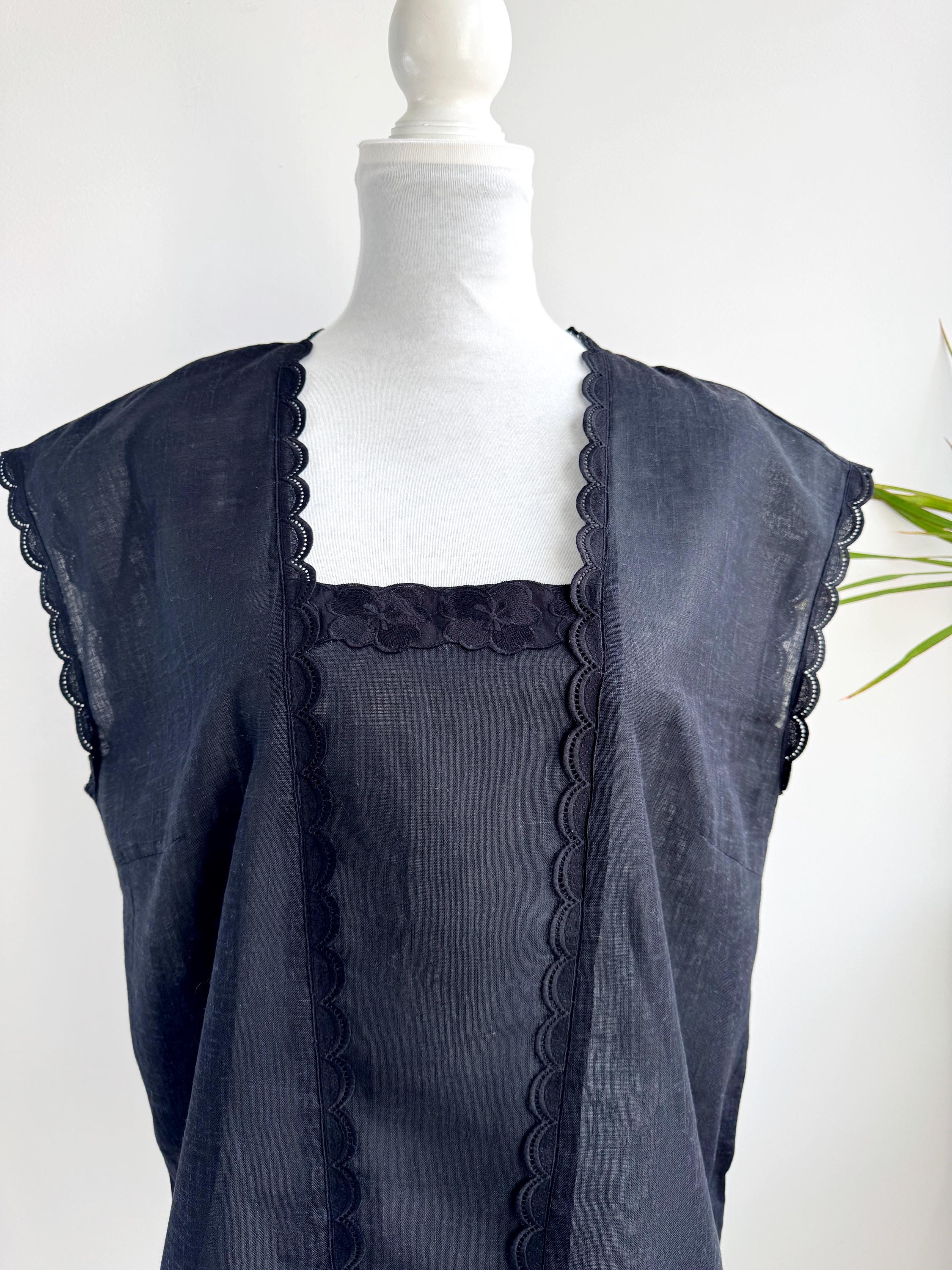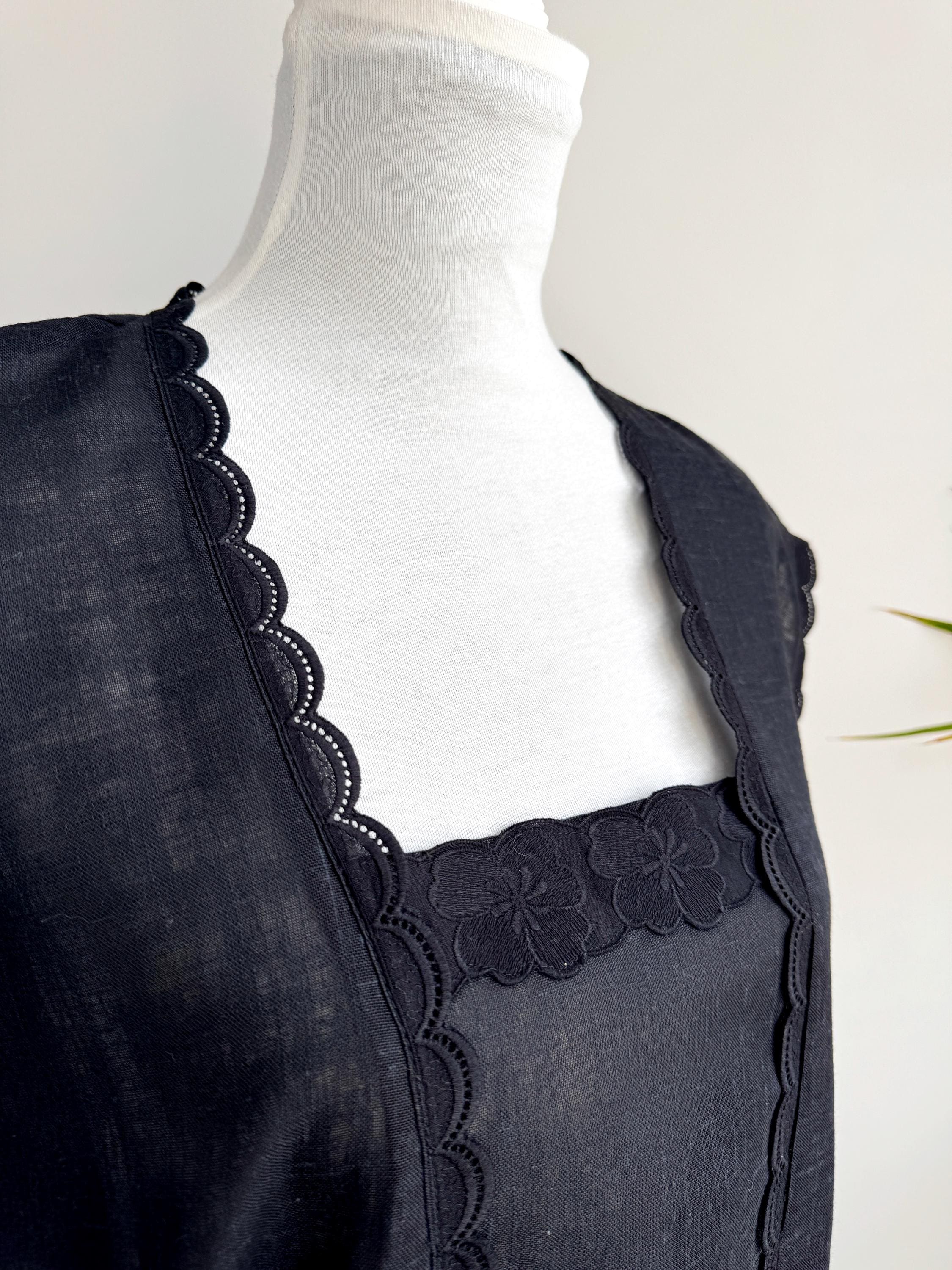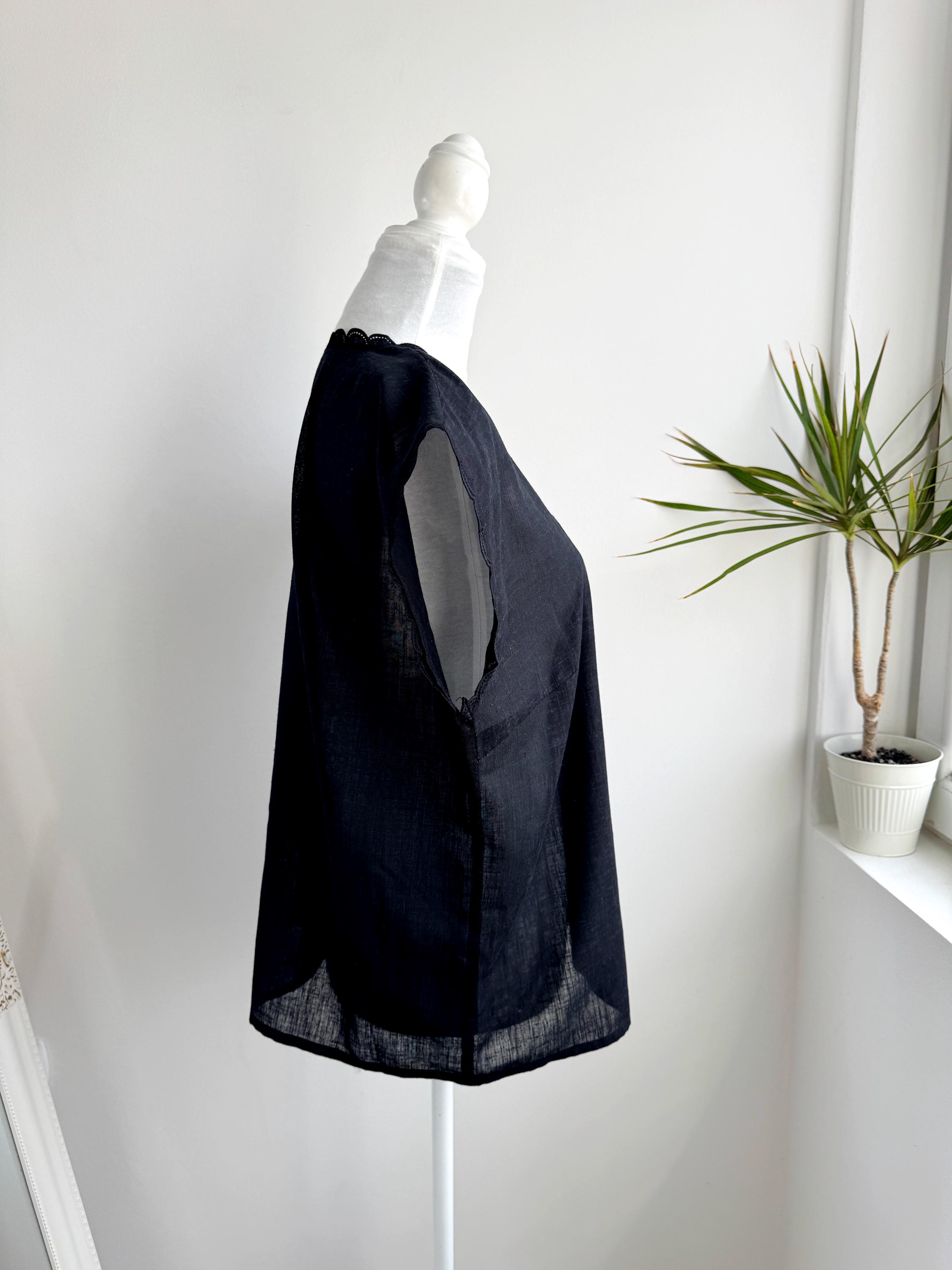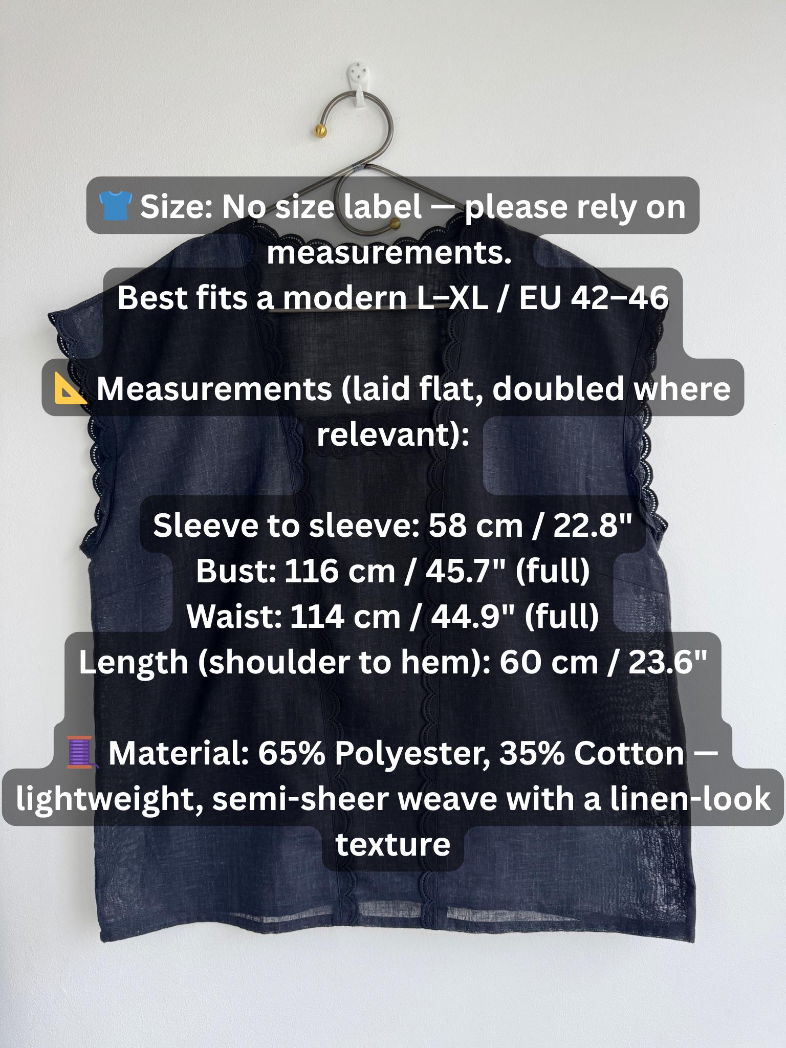 There's something undeniably romantic about a blouse with this much character. This gorgeous vintage black cotton blend top combines delicate scalloped lace trim with floral embroidery for a look that feels both effortlessly feminine and timelessly cool. The semi-sheer lightweight linen look fabric drapes beautifully, making it the kind of piece you'll reach for all summer long — whether you're layering it over a slip dress, tucking it into high-waisted trousers, or wearing it as a beach cover-up on a warm evening.
