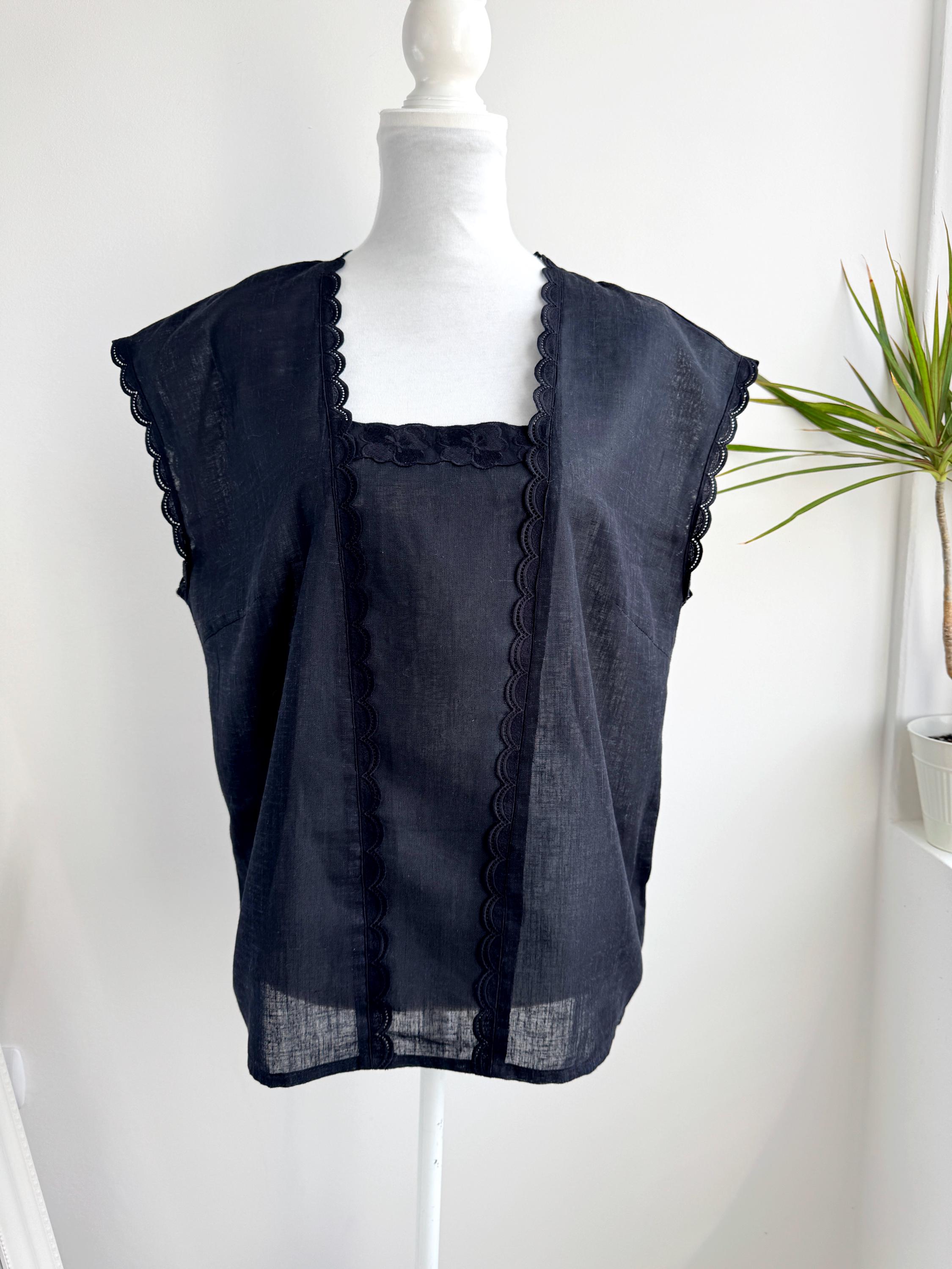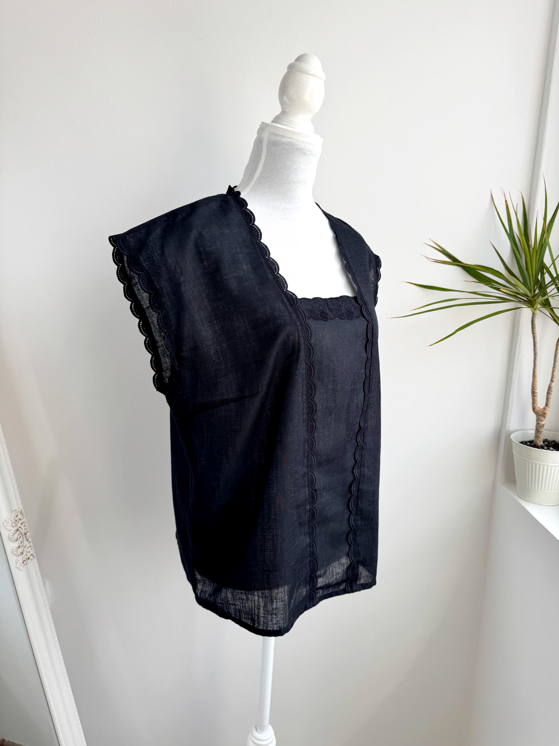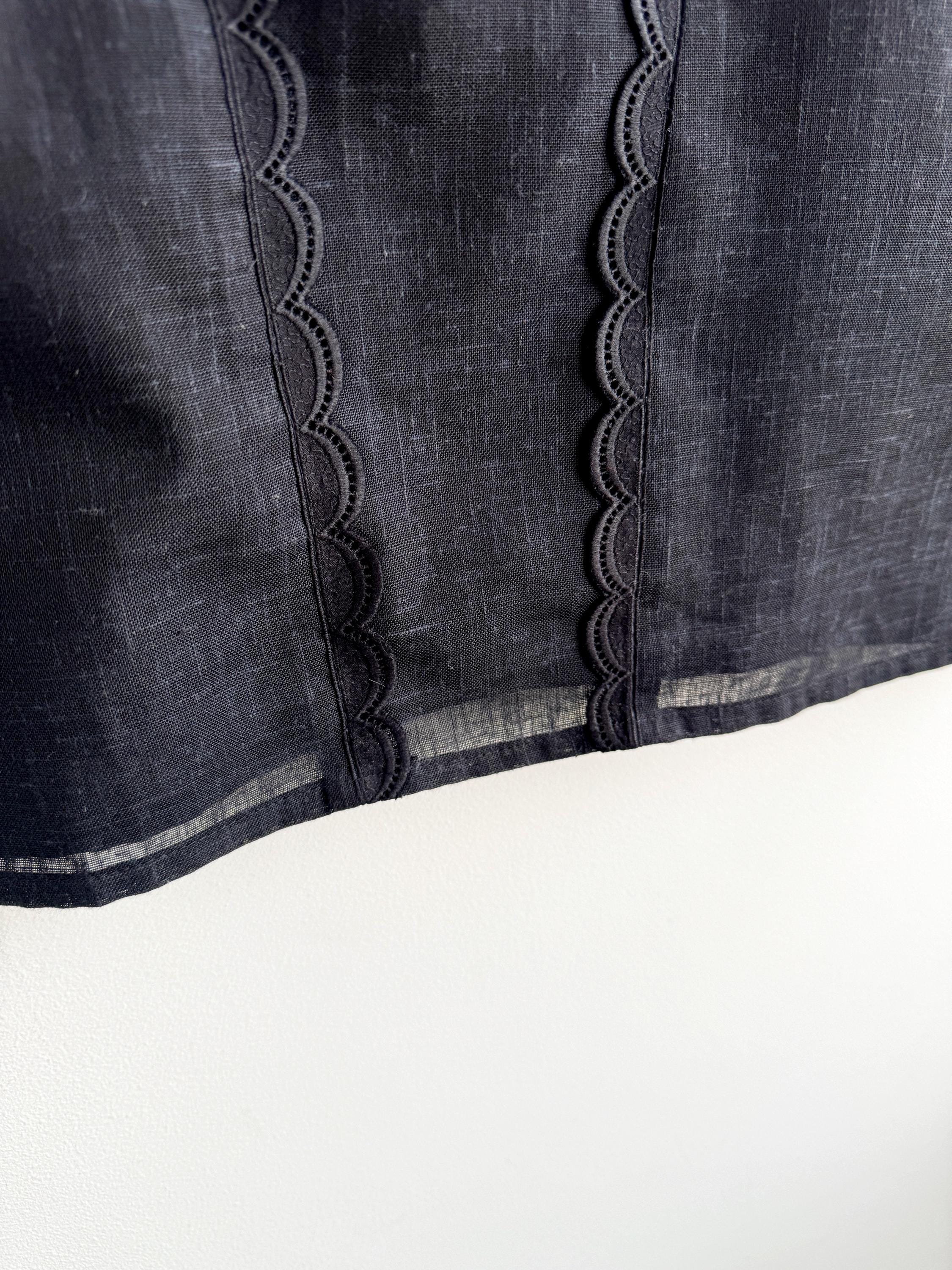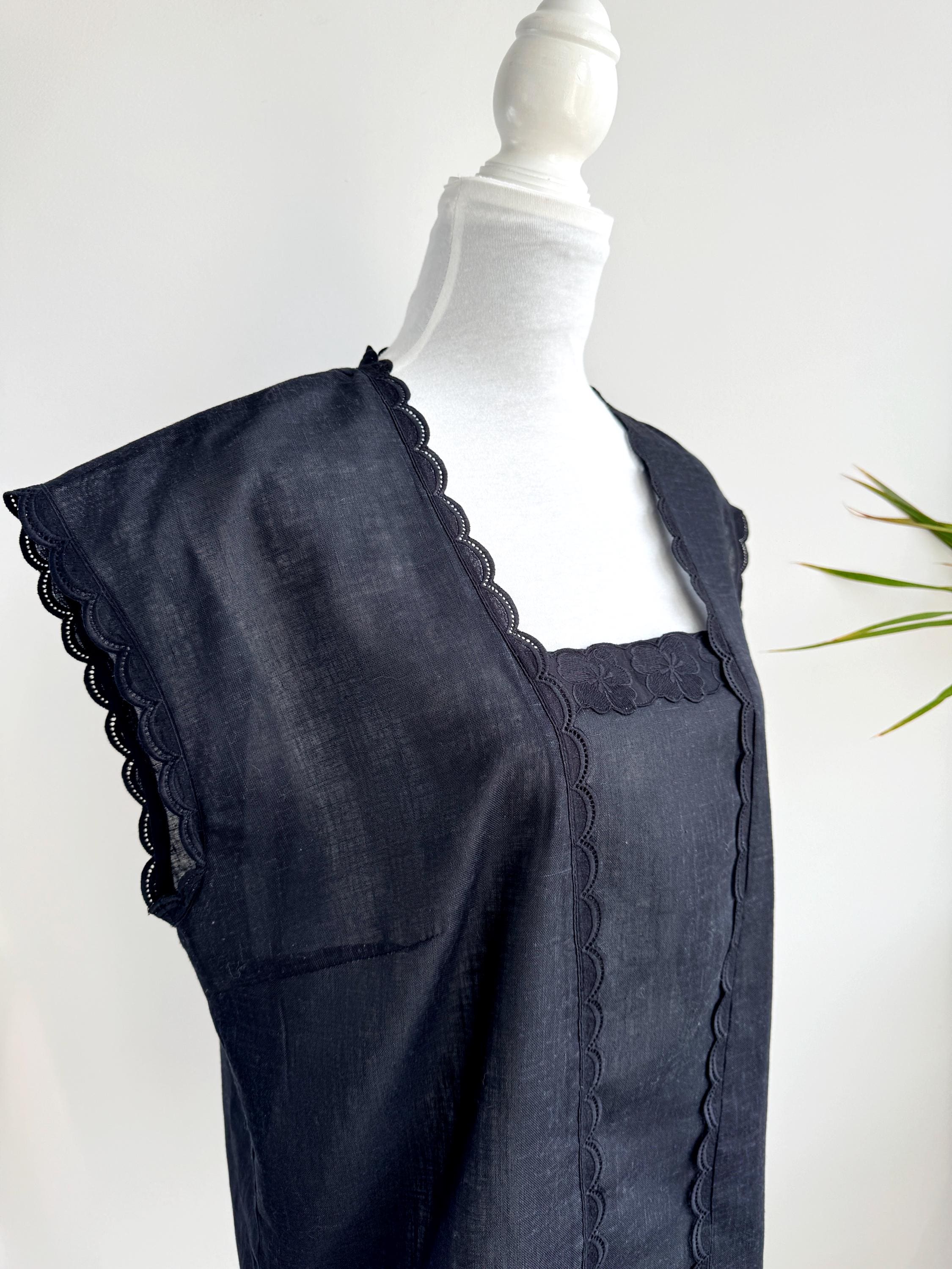There's something undeniably romantic about a blouse with this much character. This gorgeous vintage black cotton blend top combines delicate scalloped lace trim with floral embroidery for a look that feels both effortlessly feminine and timelessly cool. The semi-sheer lightweight linen look fabric drapes beautifully, making it the kind of piece you'll reach for all summer long — whether you're layering it over a slip dress, tucking it into high-waisted trousers, or wearing it as a beach cover-up on a warm evening.