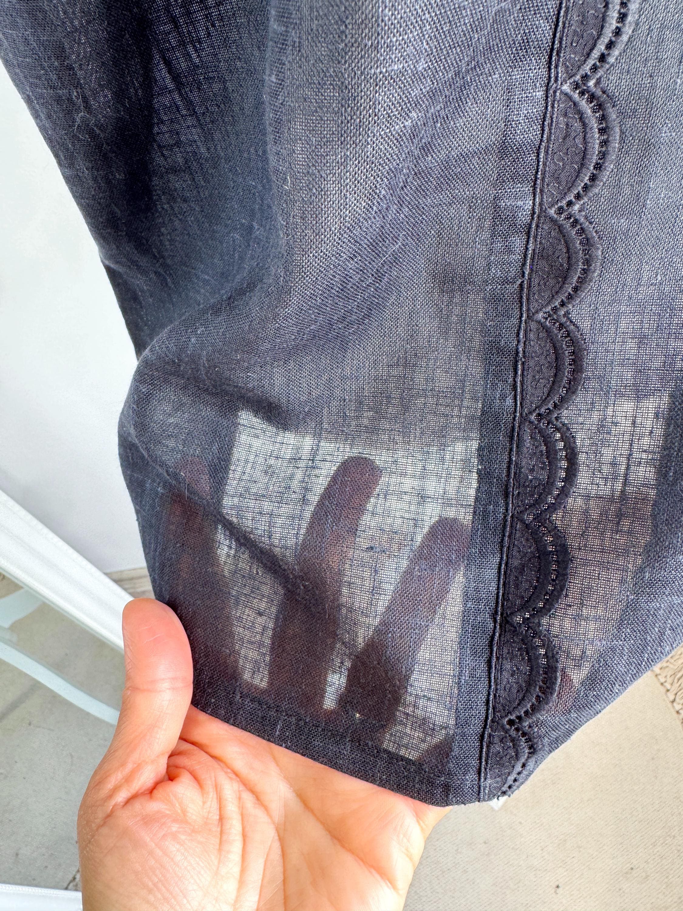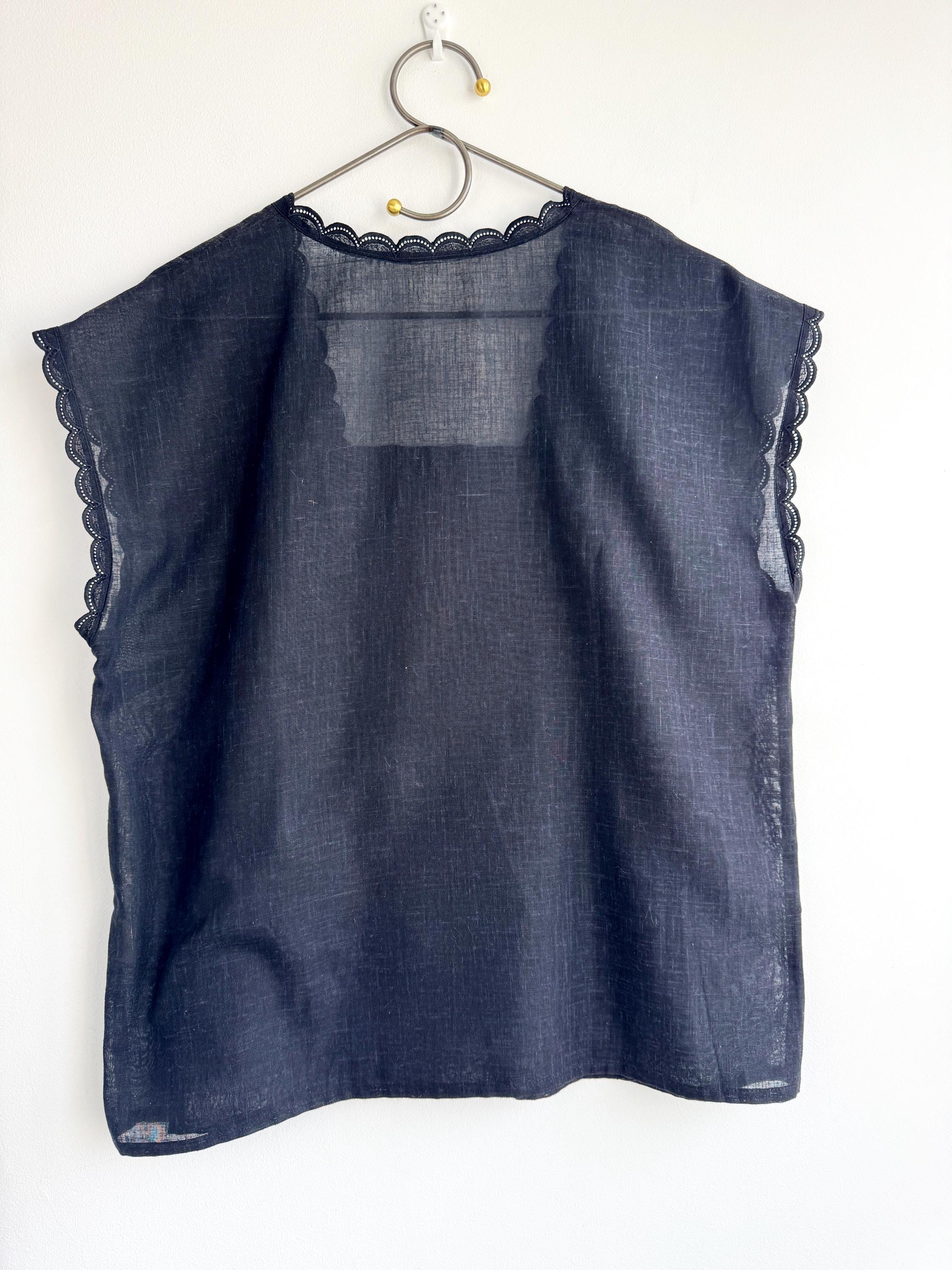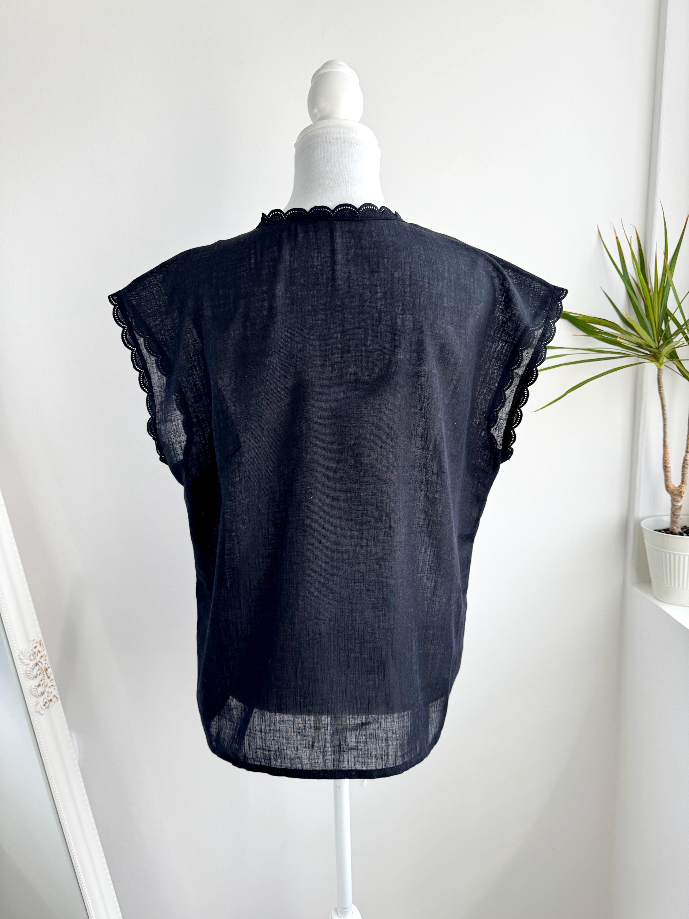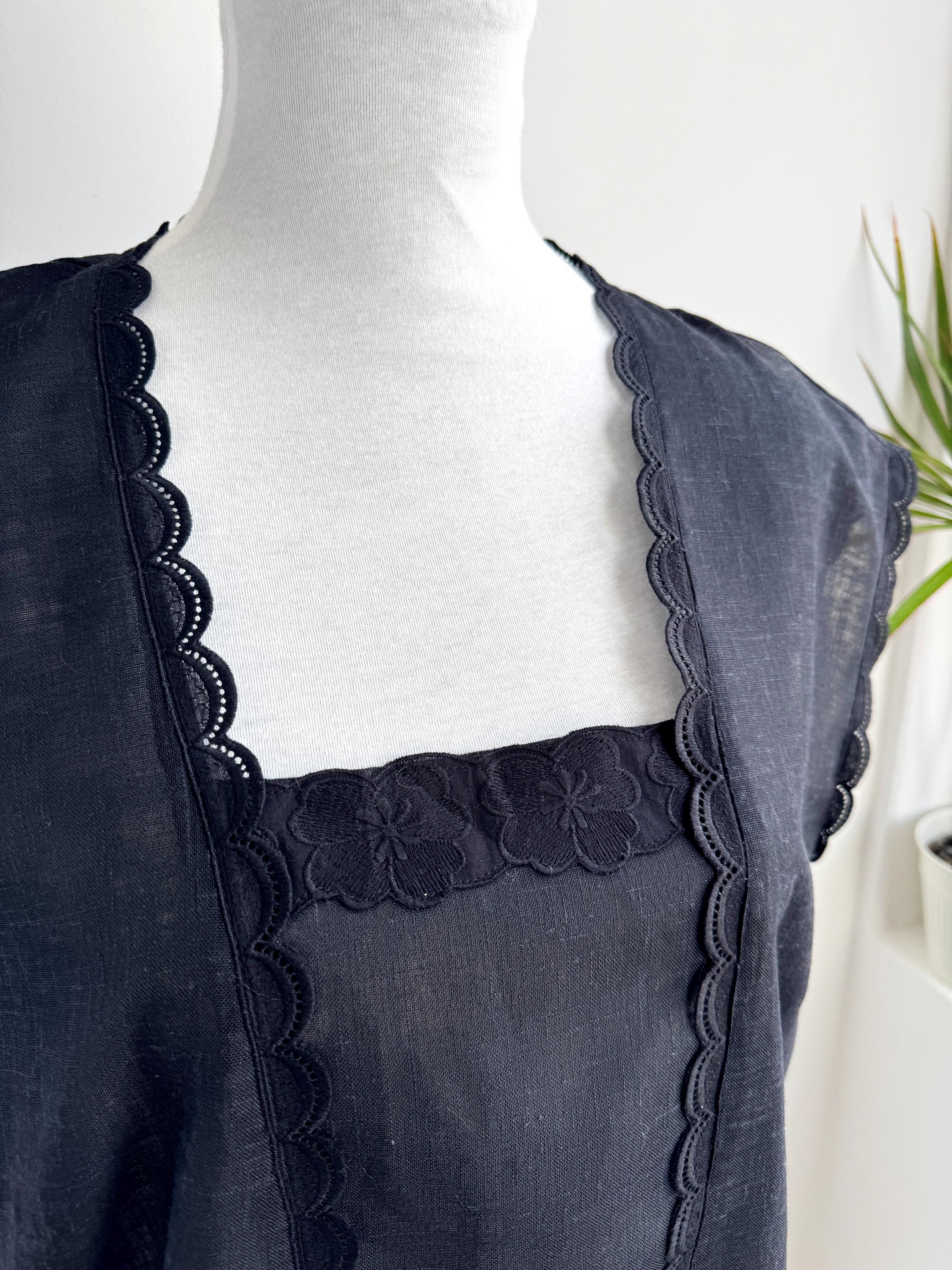 There's something undeniably romantic about a blouse with this much character. This gorgeous vintage black cotton blend top combines delicate scalloped lace trim with floral embroidery for a look that feels both effortlessly feminine and timelessly cool. The semi-sheer lightweight linen look fabric drapes beautifully, making it the kind of piece you'll reach for all summer long — whether you're layering it over a slip dress, tucking it into high-waisted trousers, or wearing it as a beach cover-up on a warm evening.
