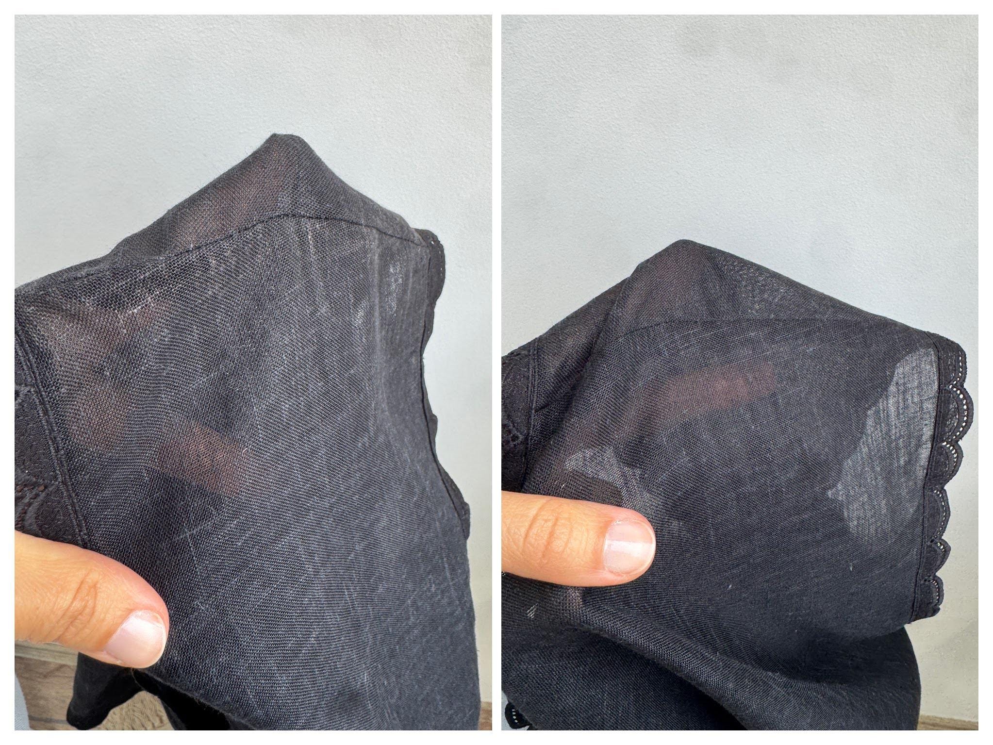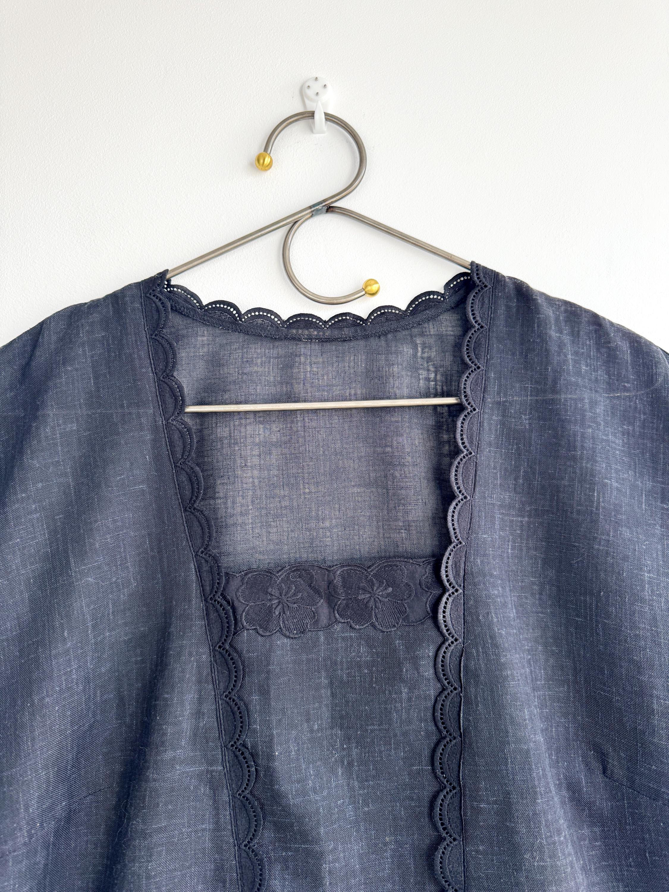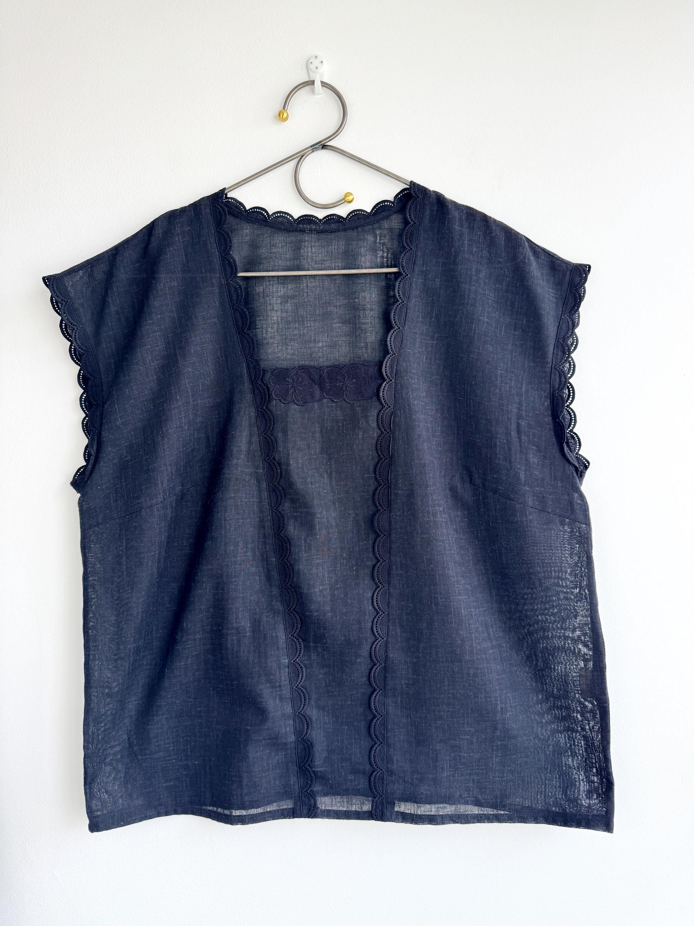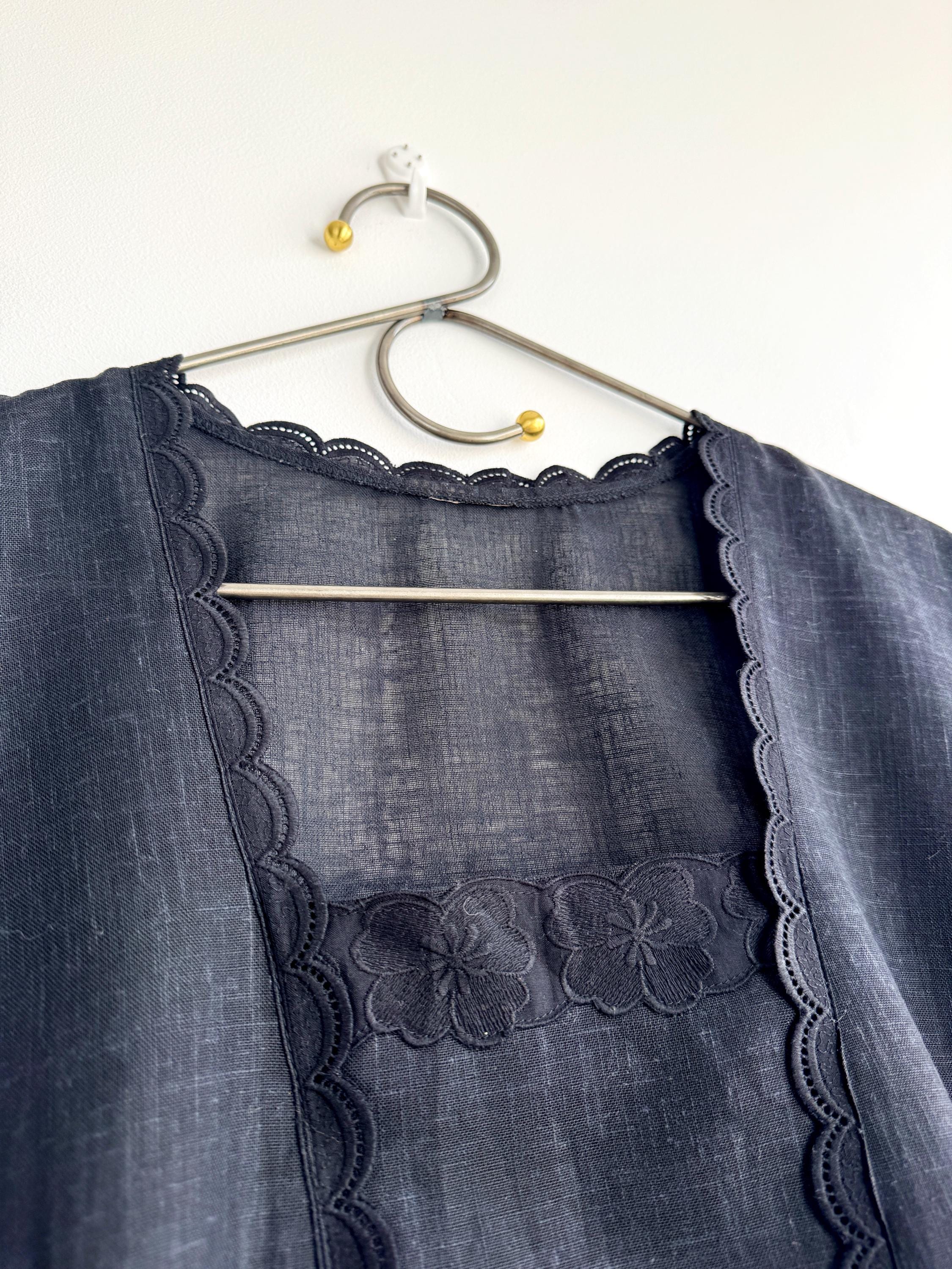 There's something undeniably romantic about a blouse with this much character. This gorgeous vintage black cotton blend top combines delicate scalloped lace trim with floral embroidery for a look that feels both effortlessly feminine and timelessly cool. The semi-sheer lightweight linen look fabric drapes beautifully, making it the kind of piece you'll reach for all summer long — whether you're layering it over a slip dress, tucking it into high-waisted trousers, or wearing it as a beach cover-up on a warm evening.