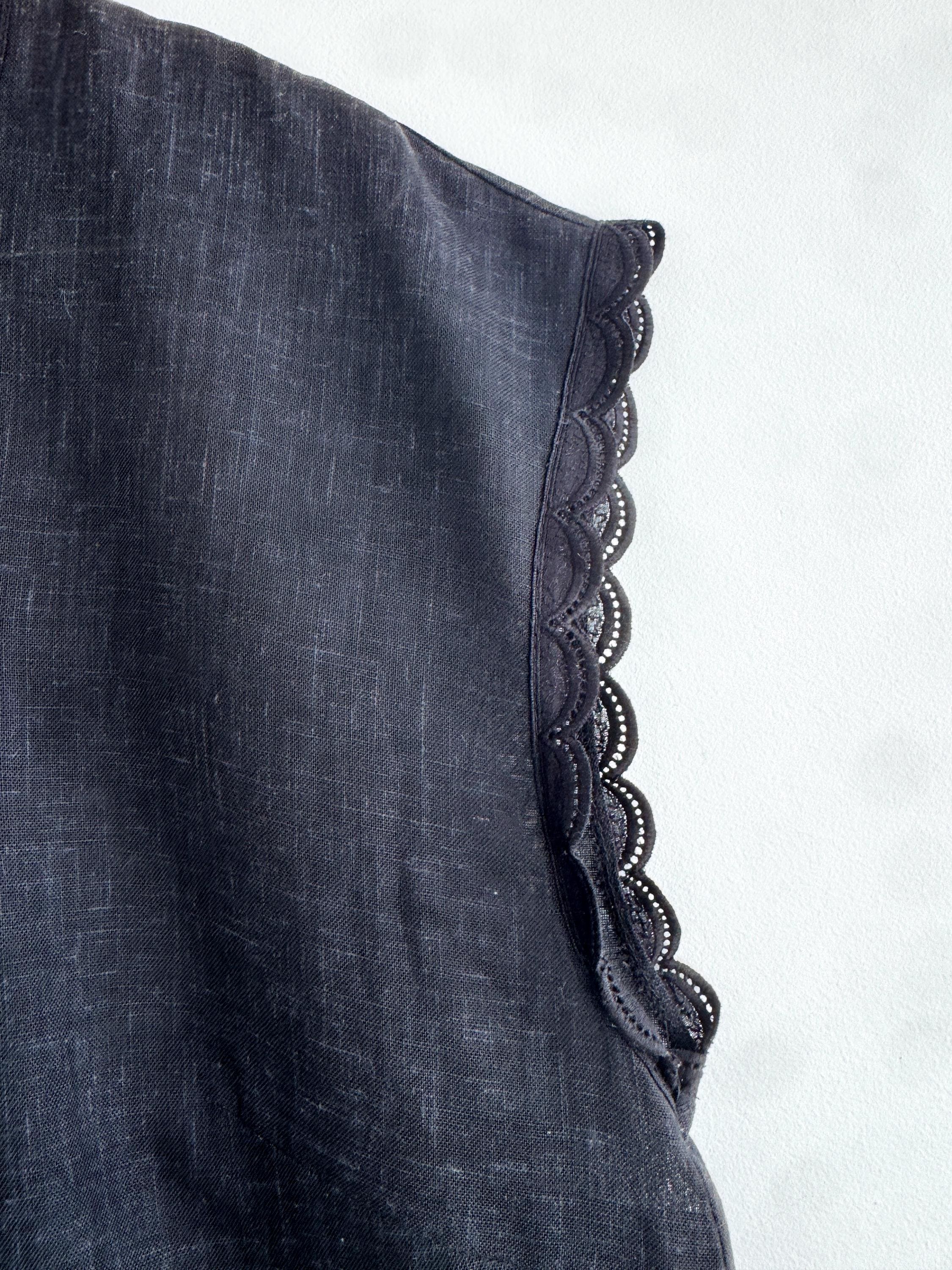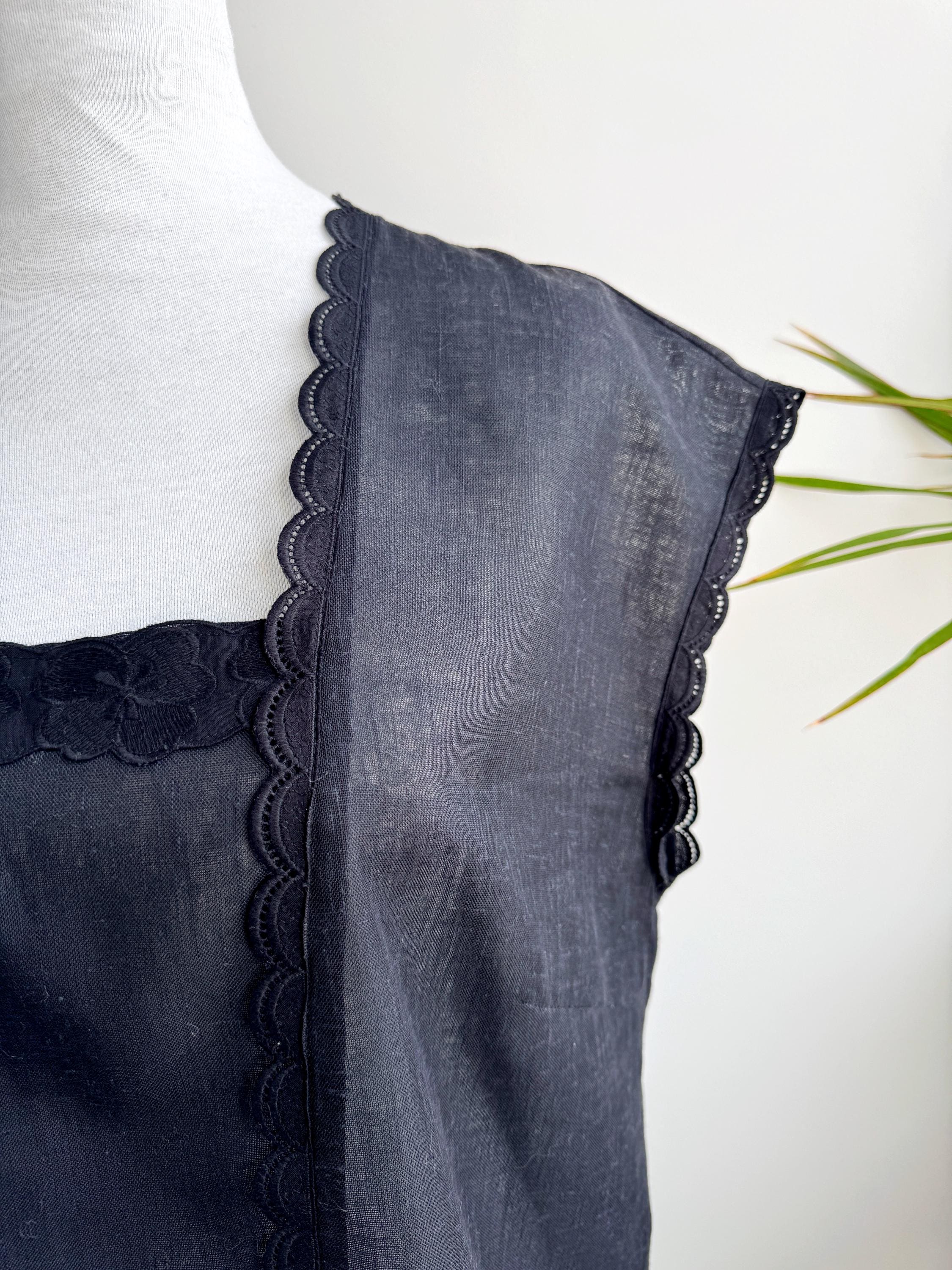 The scalloped edges run along the neckline, sleeves, and front panel, giving this black lace trim blouse a distinctly vintage-romantic feel that sits perfectly within the cottagecore, dark academia, and boho aesthetics. A horizontal band of tonal embroidered flowers sits just below the square neckline, adding an artisanal handcrafted quality to this sleeveless summer top. The relaxed boxy silhouette offers generous, flattering coverage across a range of body types.