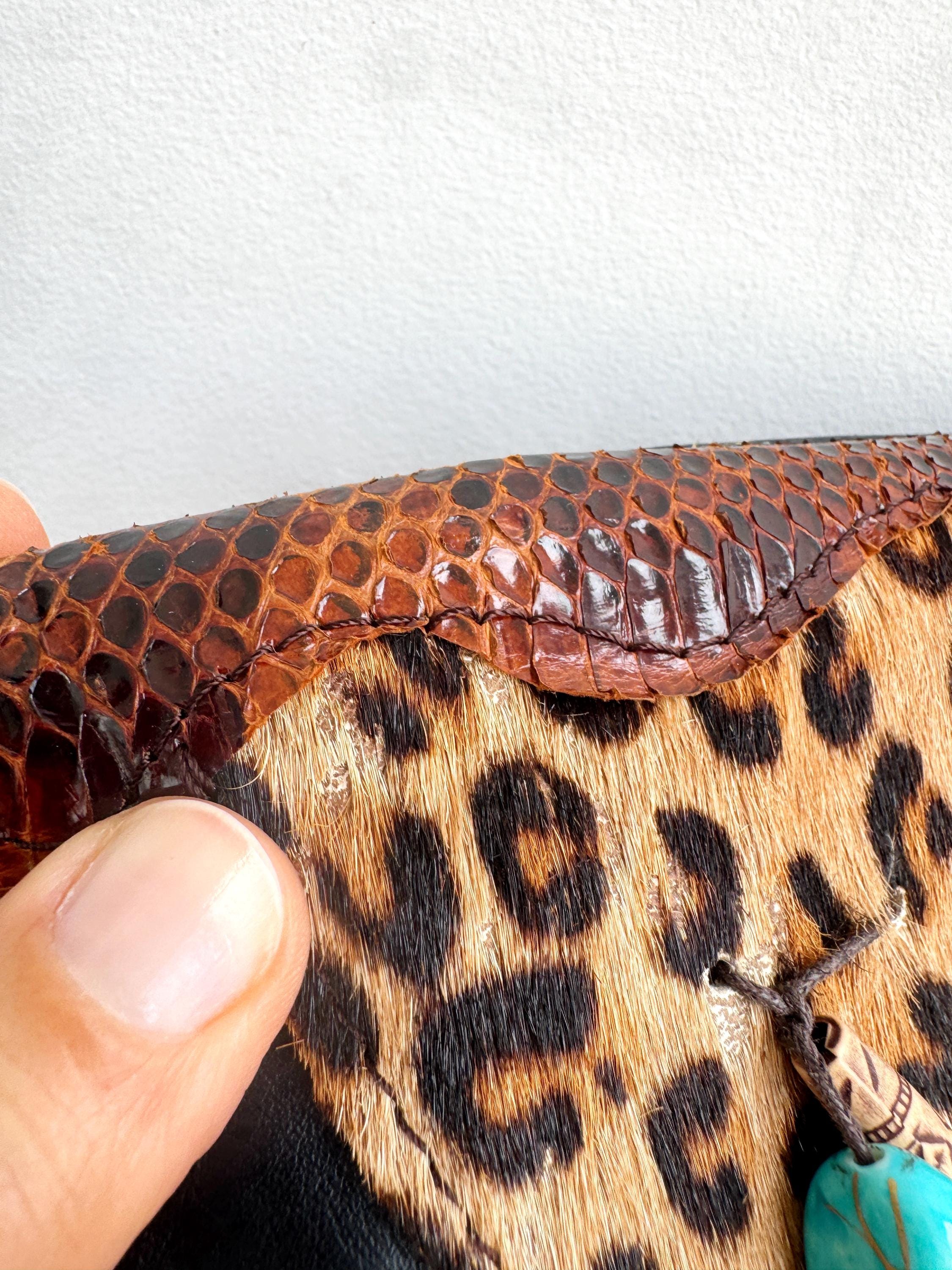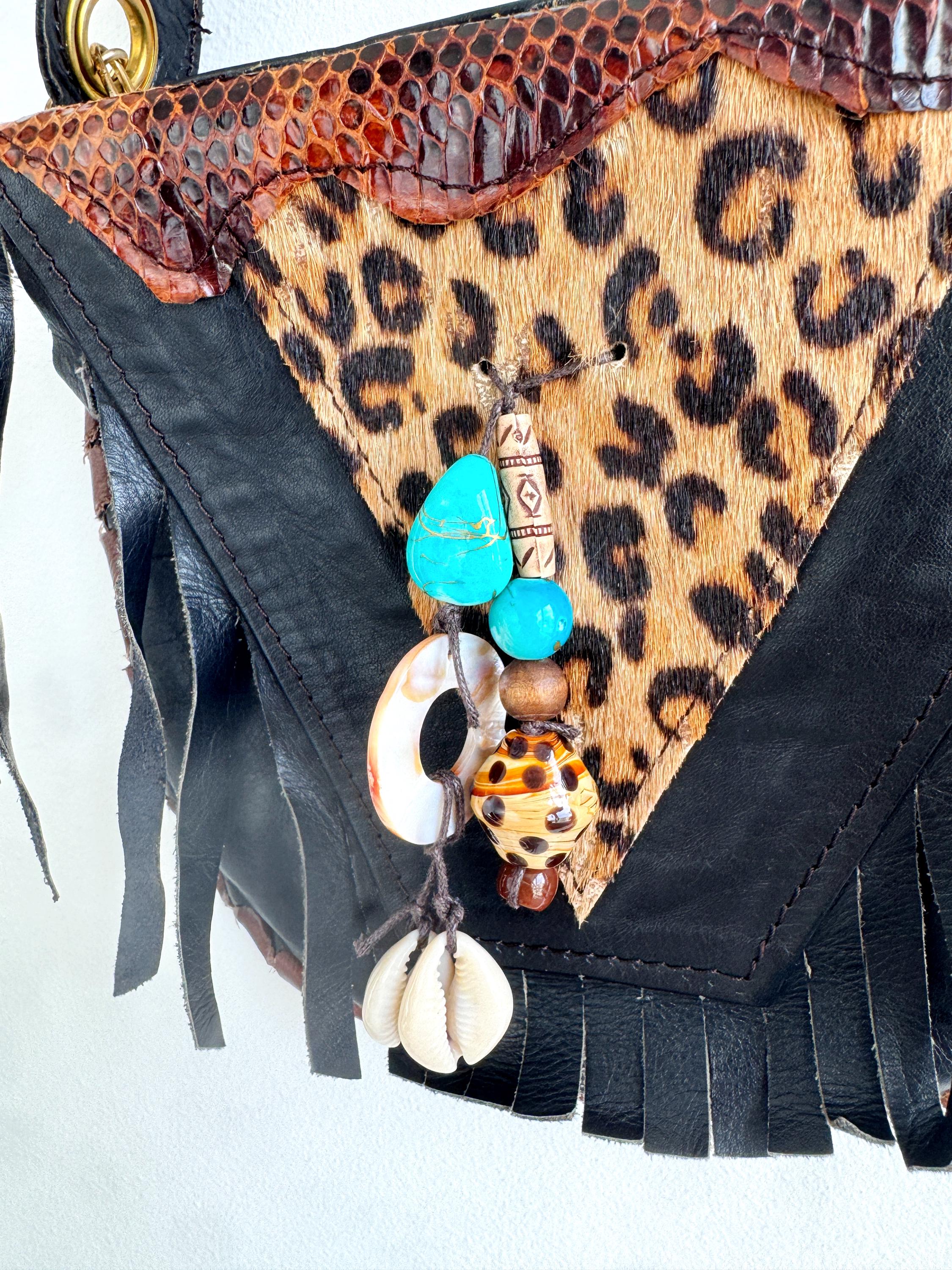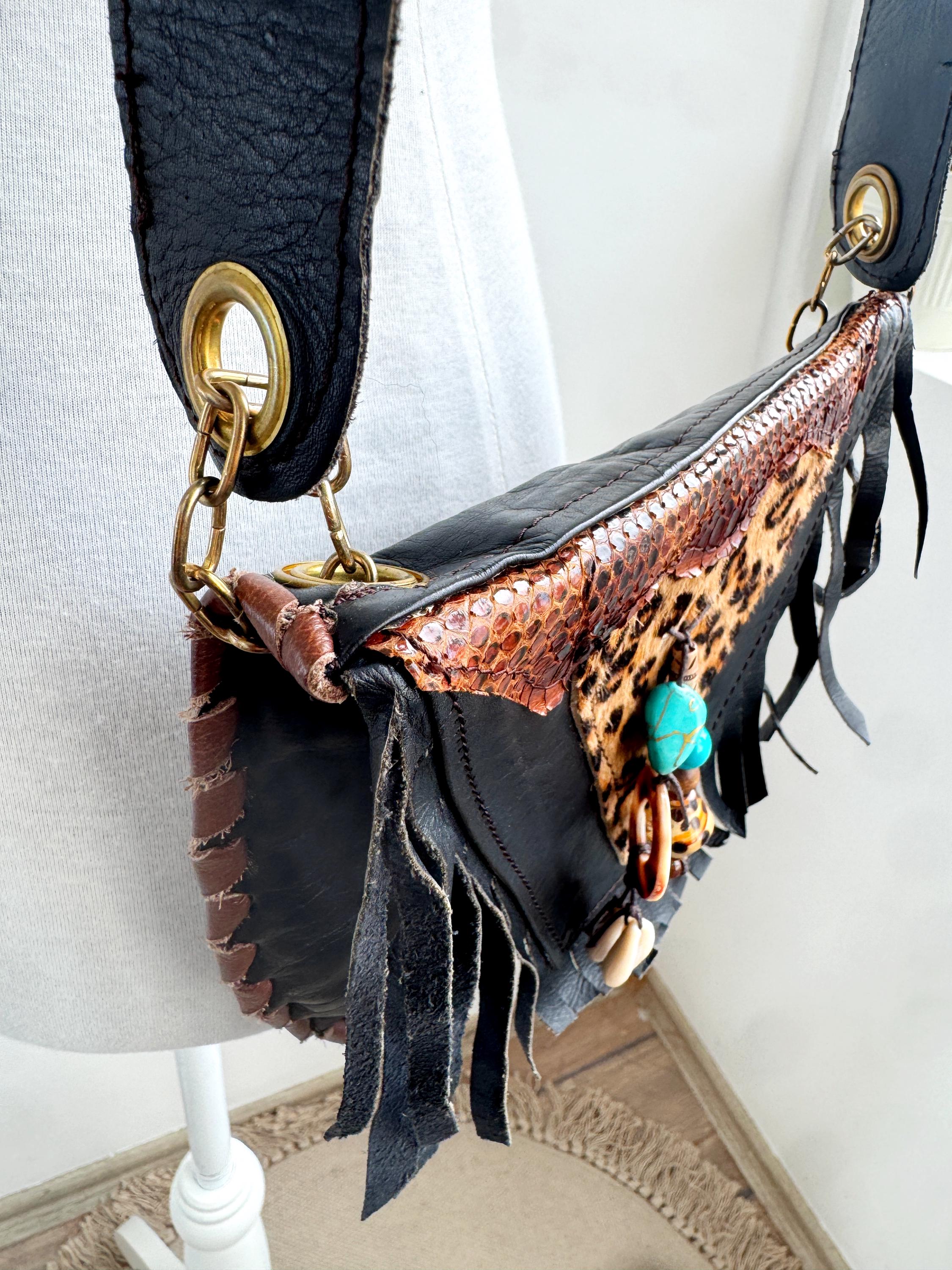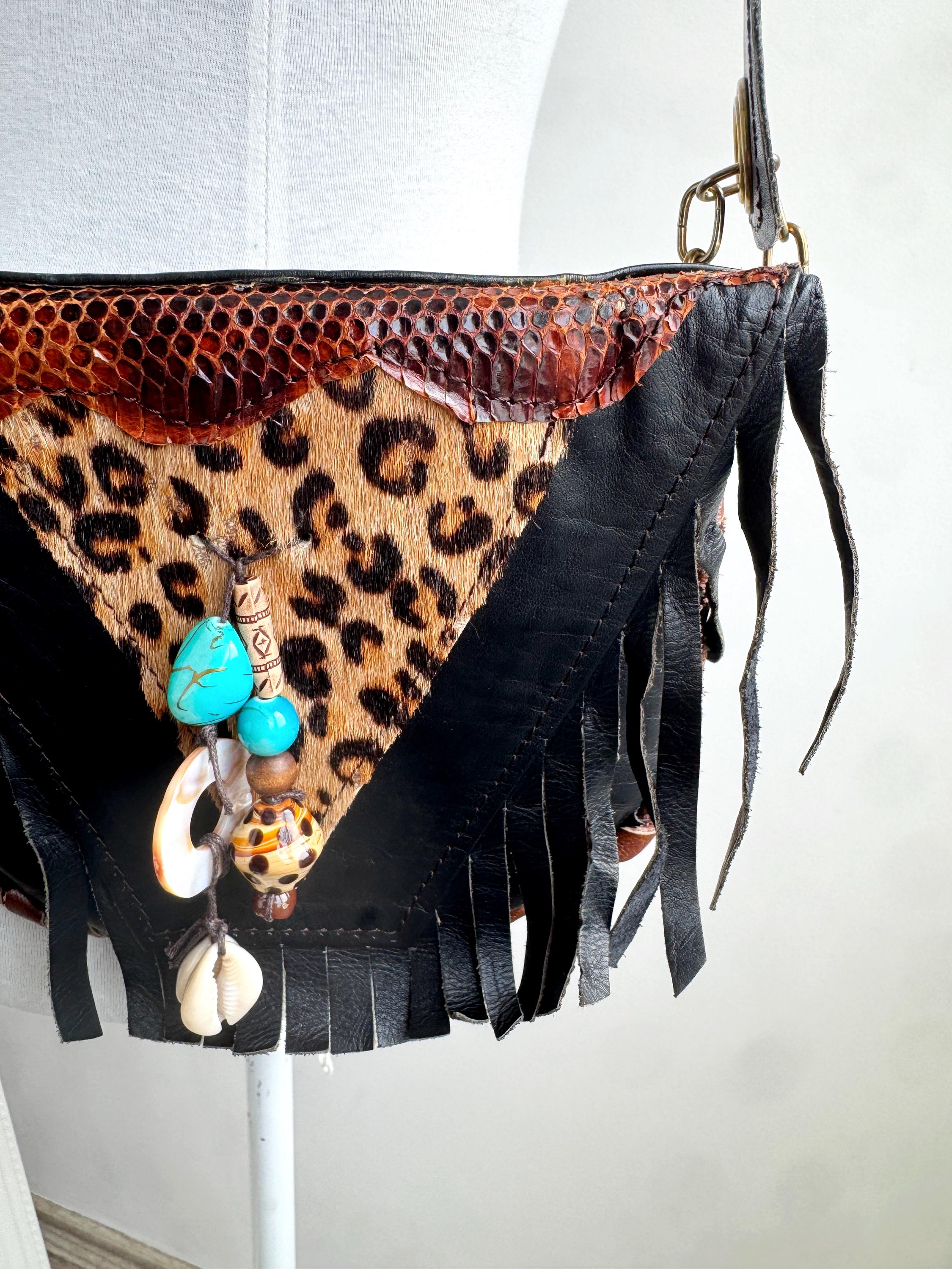 This stunning handmade vintage leather shoulder bag is a true bohemian masterpiece, blending rugged western vibes with high-fashion textures. The front features a striking combination of genuine leopard print cowhide and rich, textured snakeskin leather accents. Framed by deep black leather and accented with playful fringe, this boho bag captures a wild, free-spirited aesthetic.