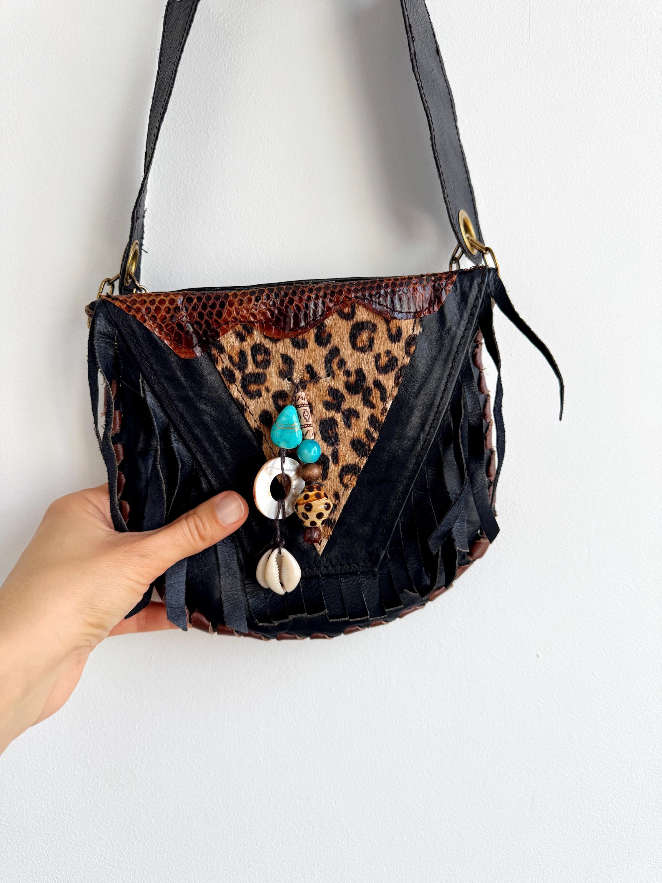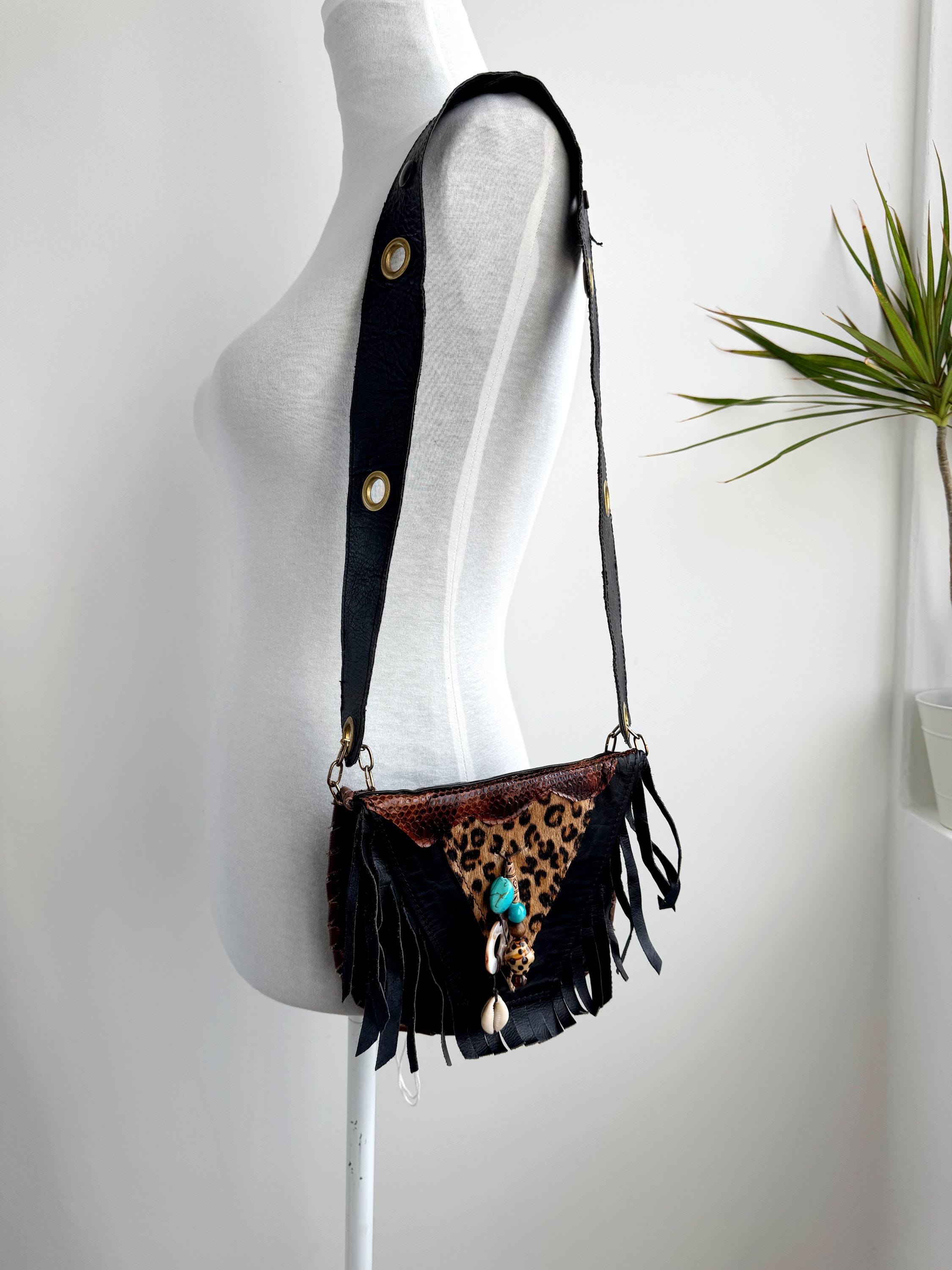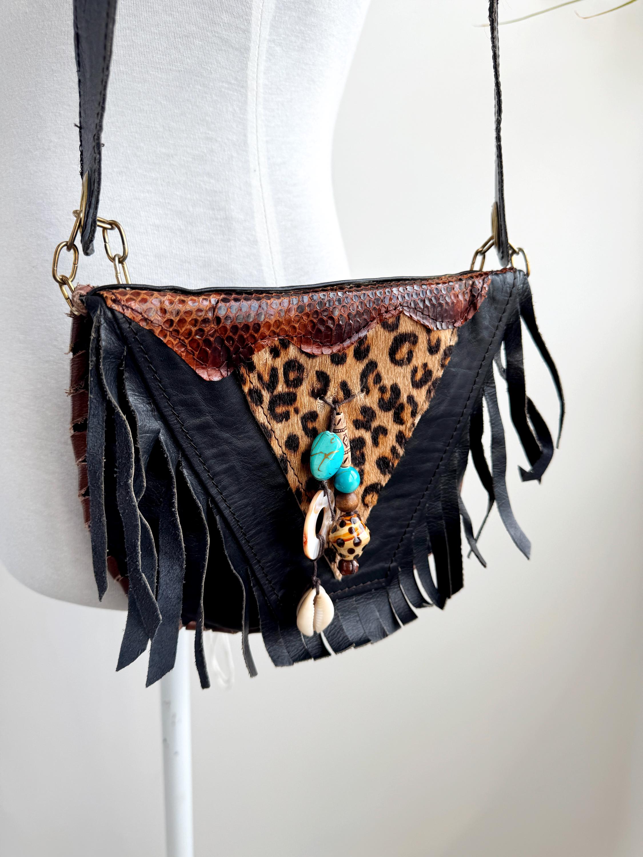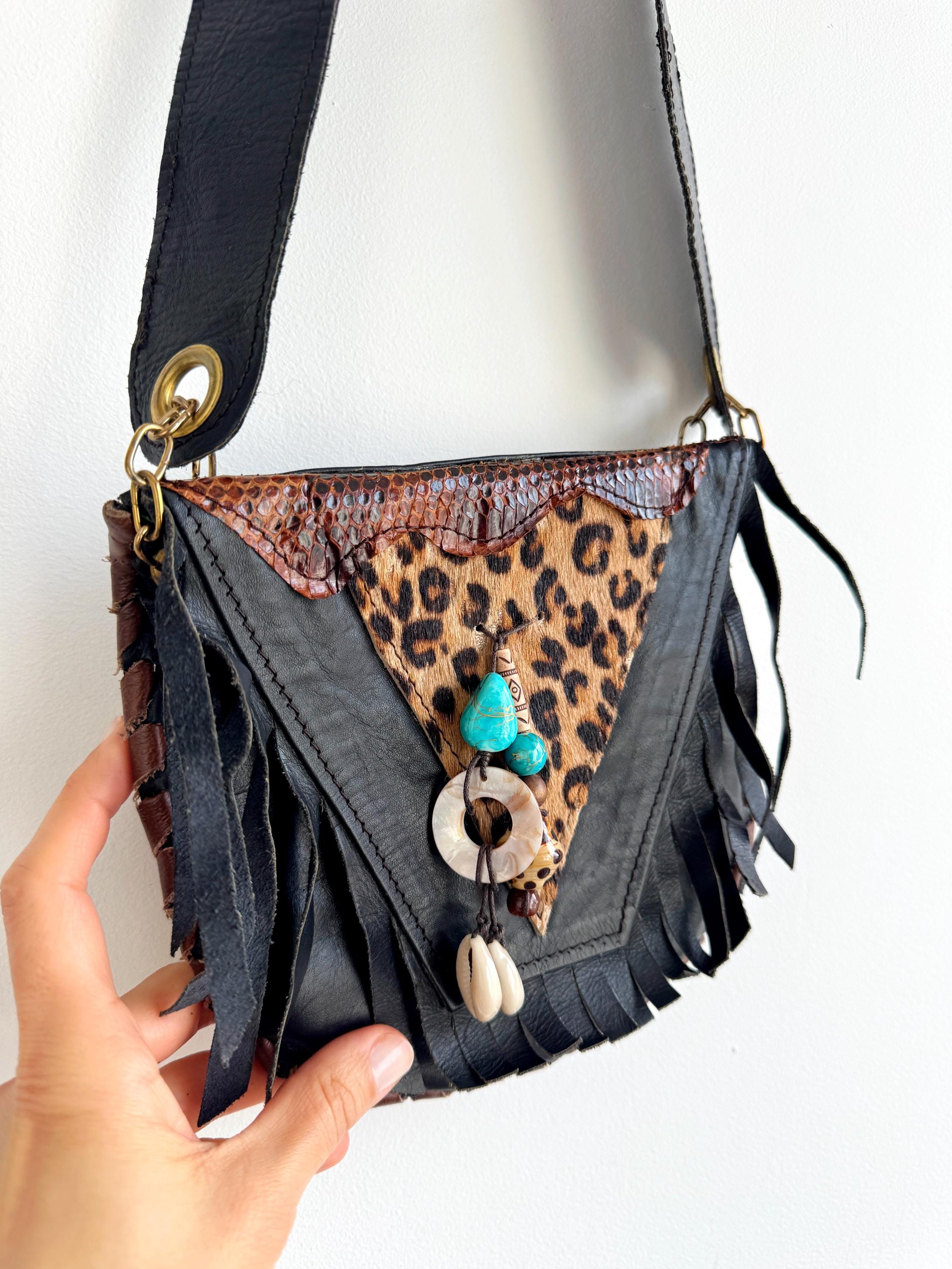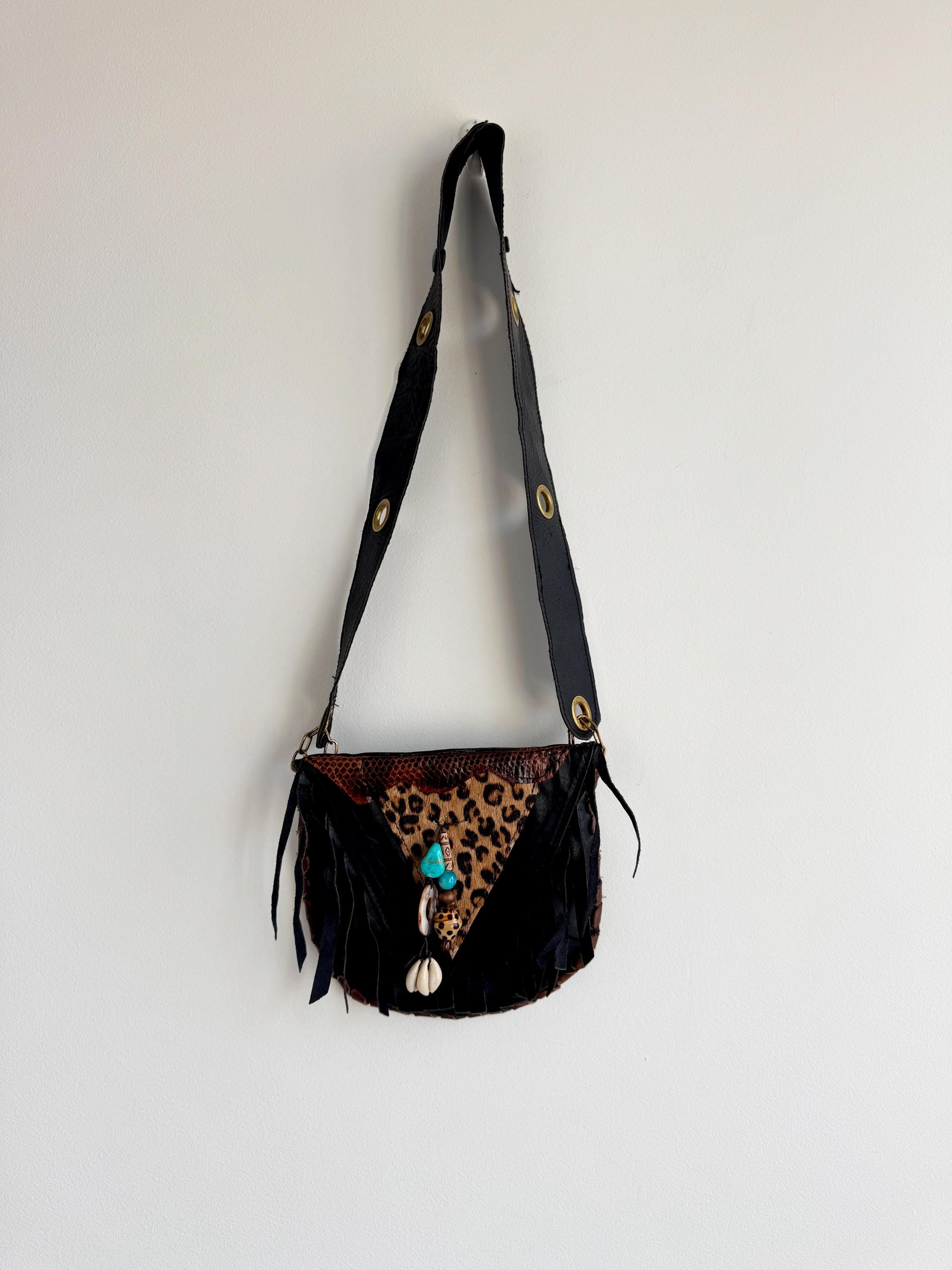 This stunning handmade vintage leather shoulder bag is a true bohemian masterpiece, blending rugged western vibes with high-fashion textures. The front features a striking combination of genuine leopard print cowhide and rich, textured snakeskin leather accents. Framed by deep black leather and accented with playful fringe, this boho bag captures a wild, free-spirited aesthetic.