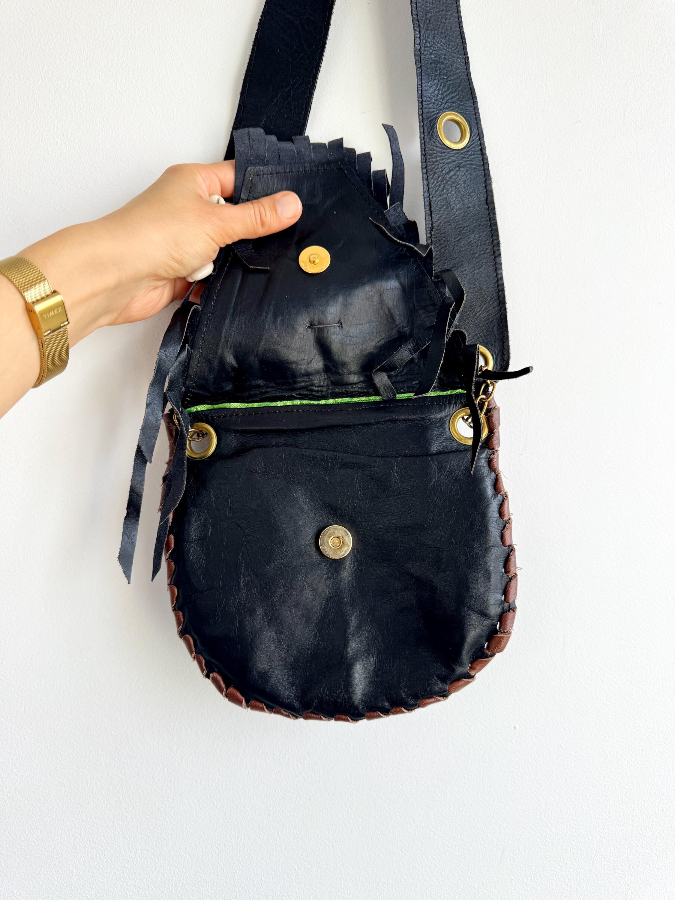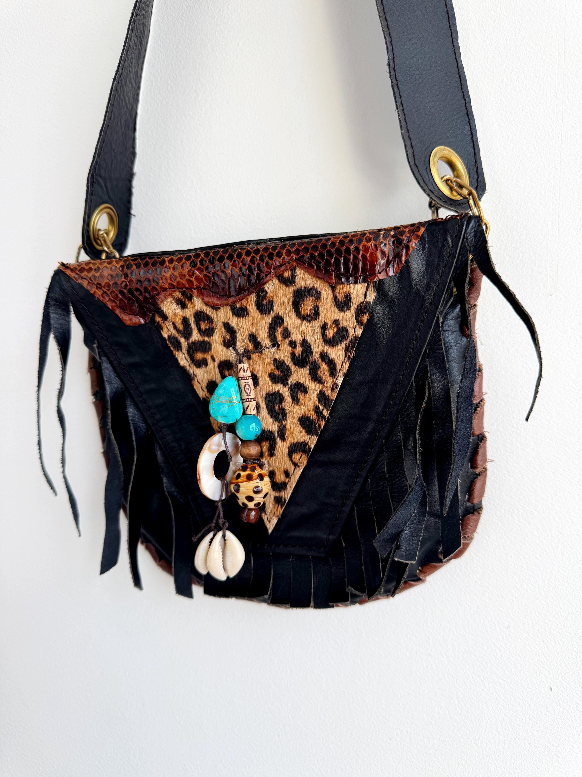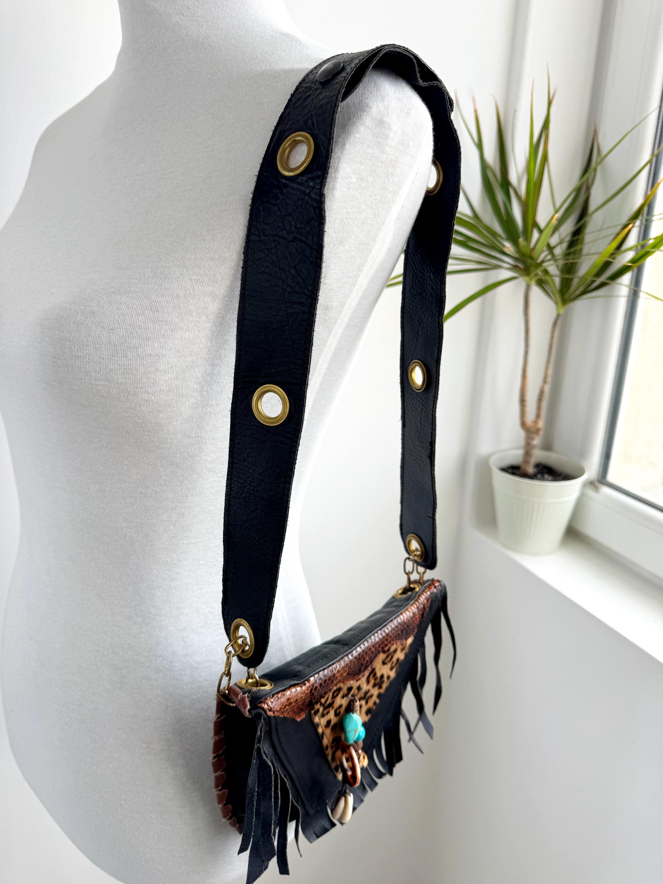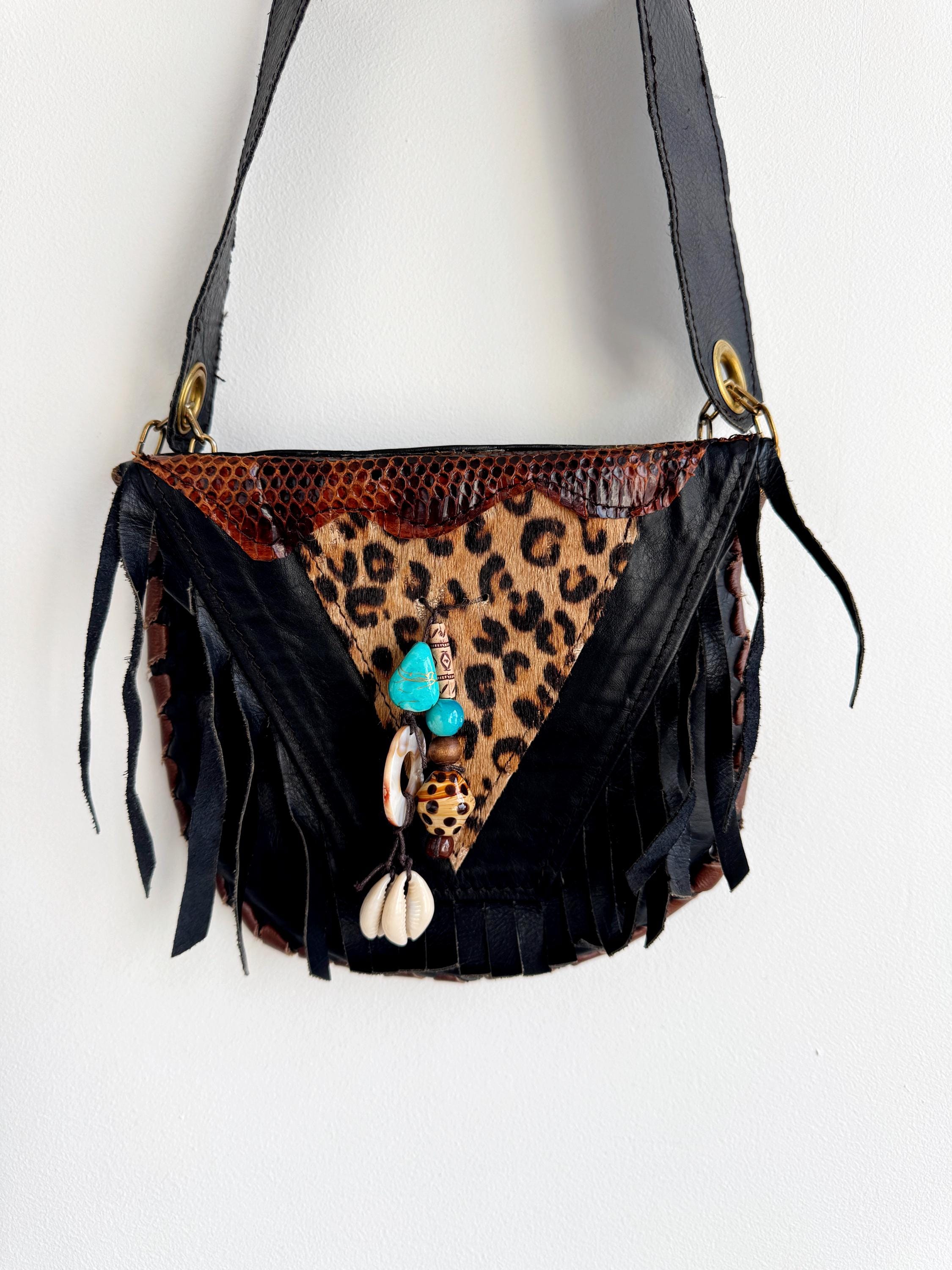 This stunning handmade vintage leather shoulder bag is a true bohemian masterpiece, blending rugged western vibes with high-fashion textures. The front features a striking combination of genuine leopard print cowhide and rich, textured snakeskin leather accents. Framed by deep black leather and accented with playful fringe, this boho bag captures a wild, free-spirited aesthetic.