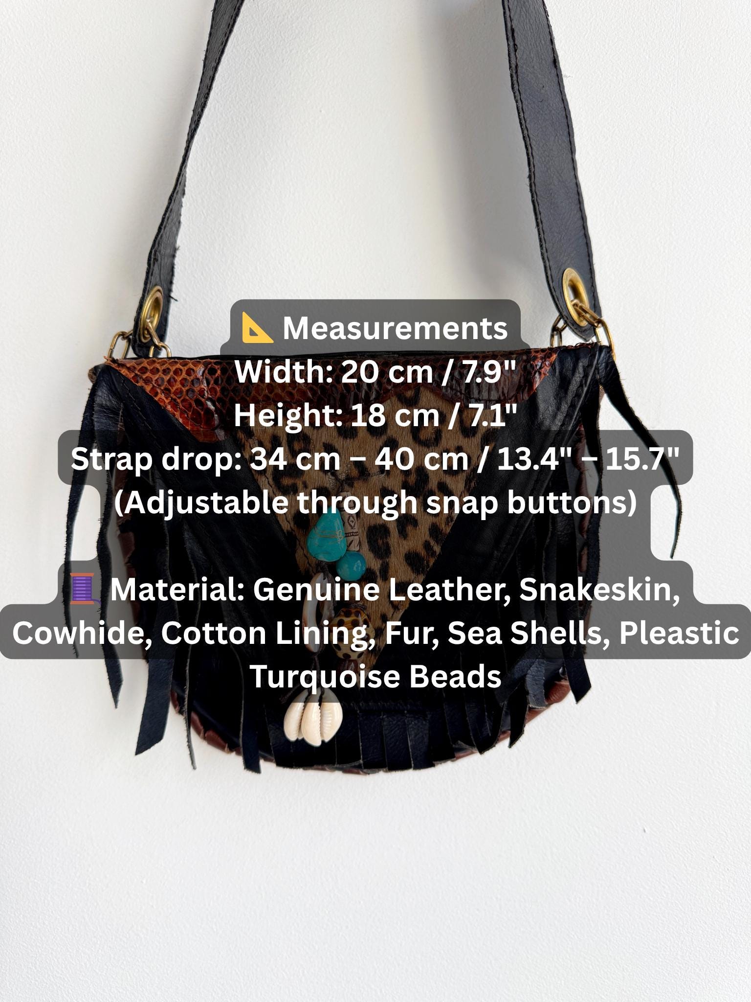 🧵 Material: Genuine Leather, Snakeskin, Cowhide, Cotton Lining, Fur, Sea Shells, Pleastic Turquoise Beads