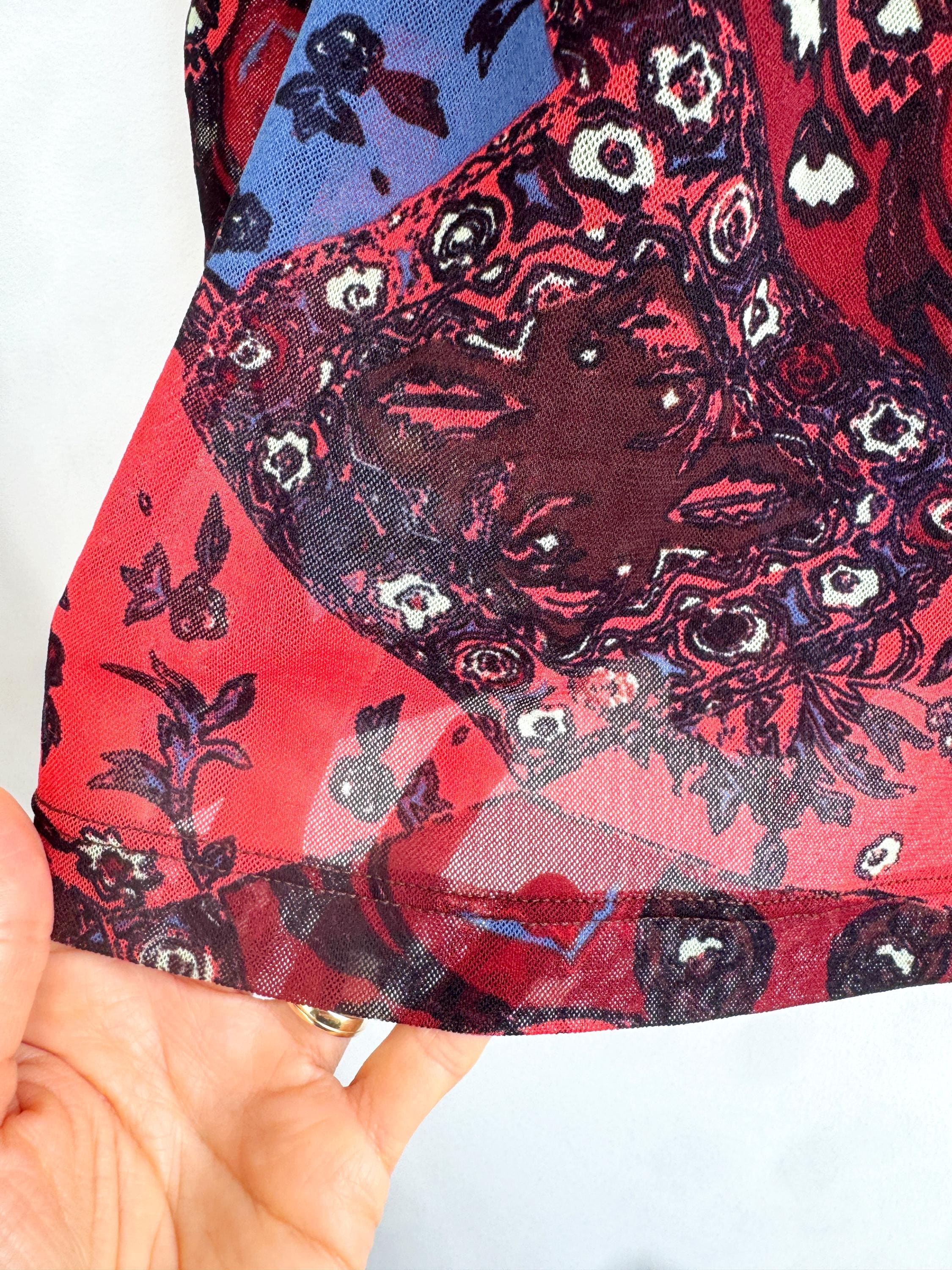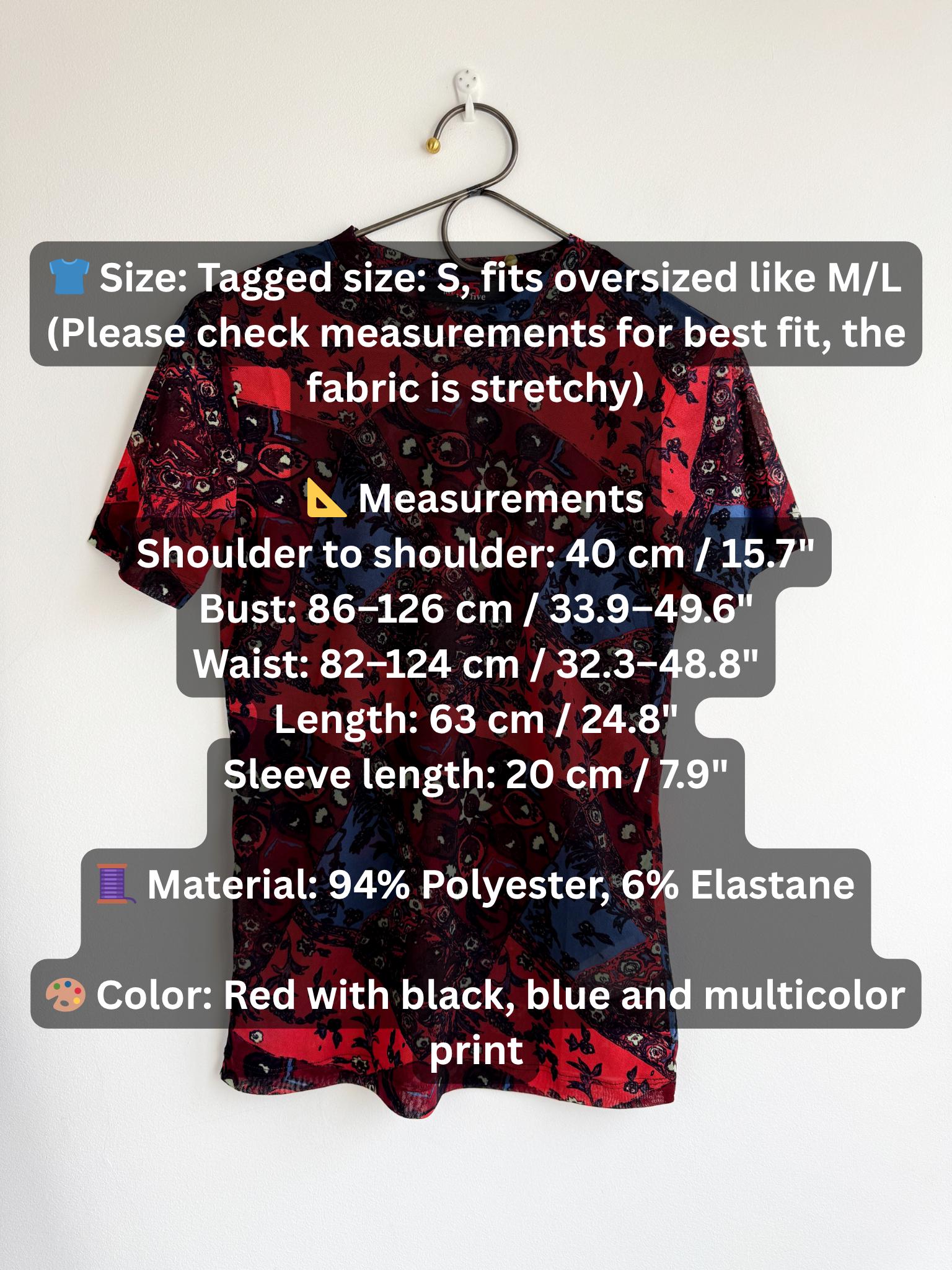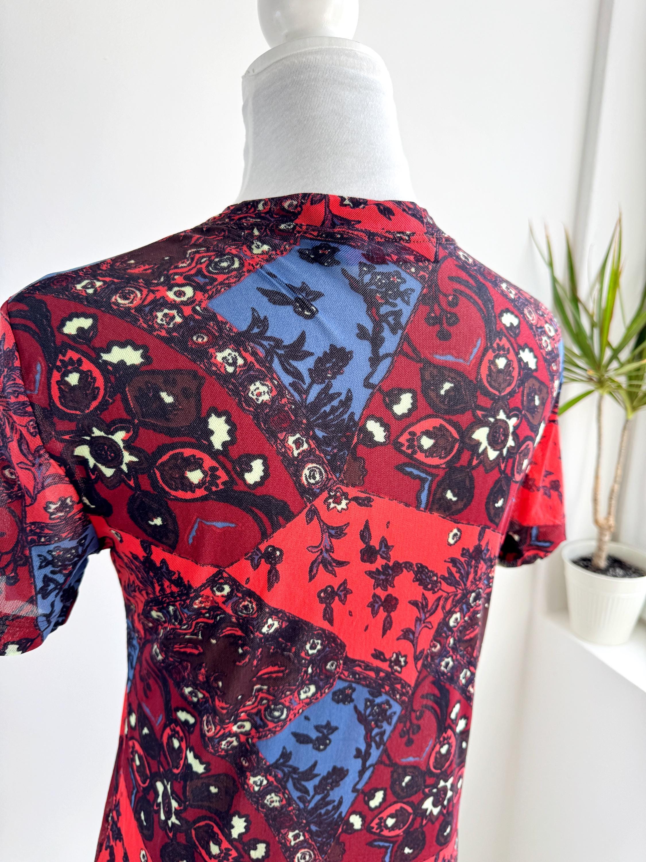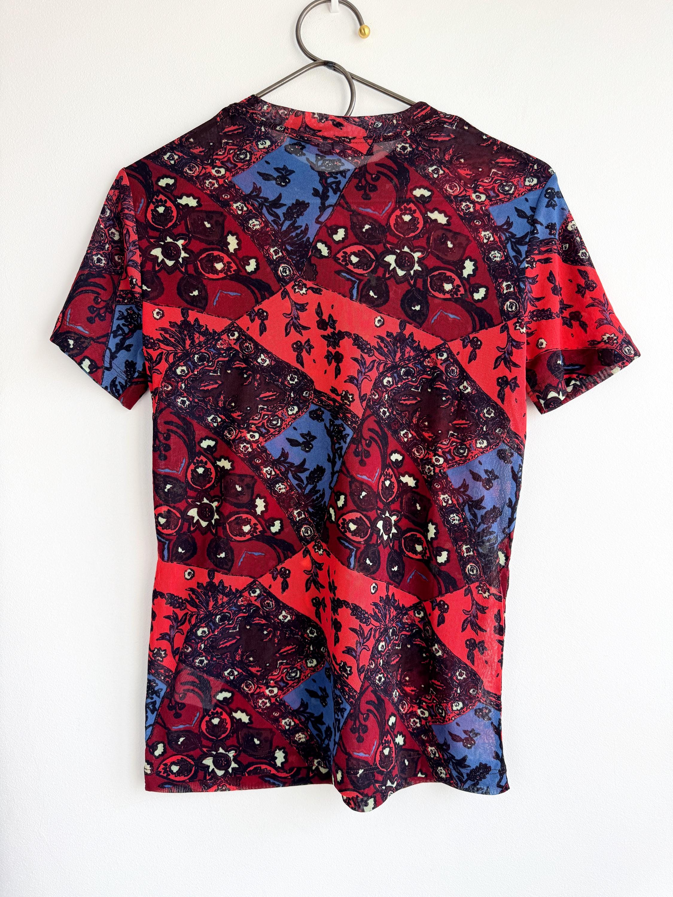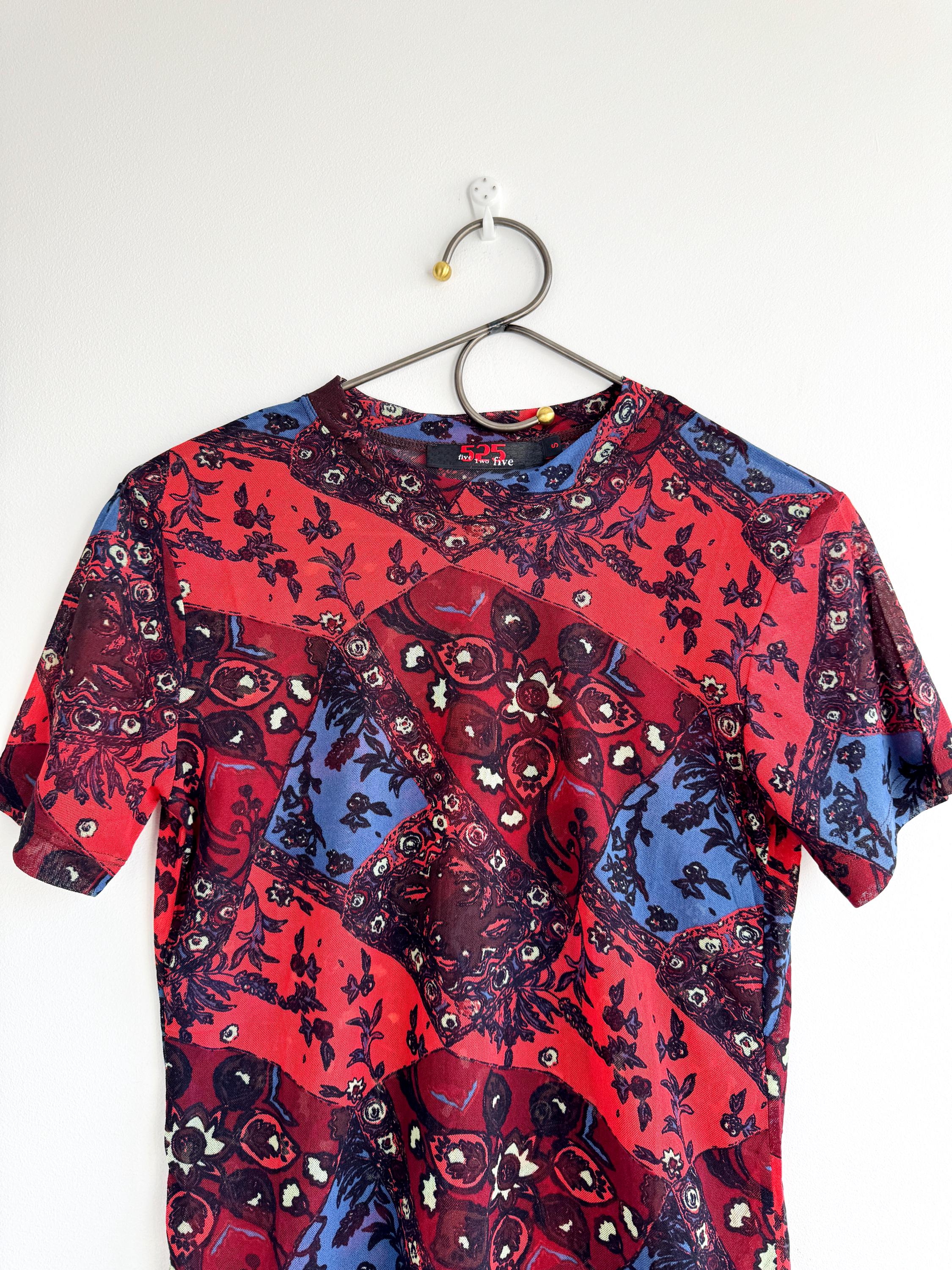 Step into effortless Y2K style with this eye-catching vintage mesh top by 525 Five Two Five. Featuring a bold red patchwork-inspired print with intricate floral and scarf motifs, this semi-sheer top is perfect for layering or making a statement on its own. The lightweight stretch fabric hugs the body comfortably, giving you that flattering slim-fit silhouette that defined early 2000s fashion.