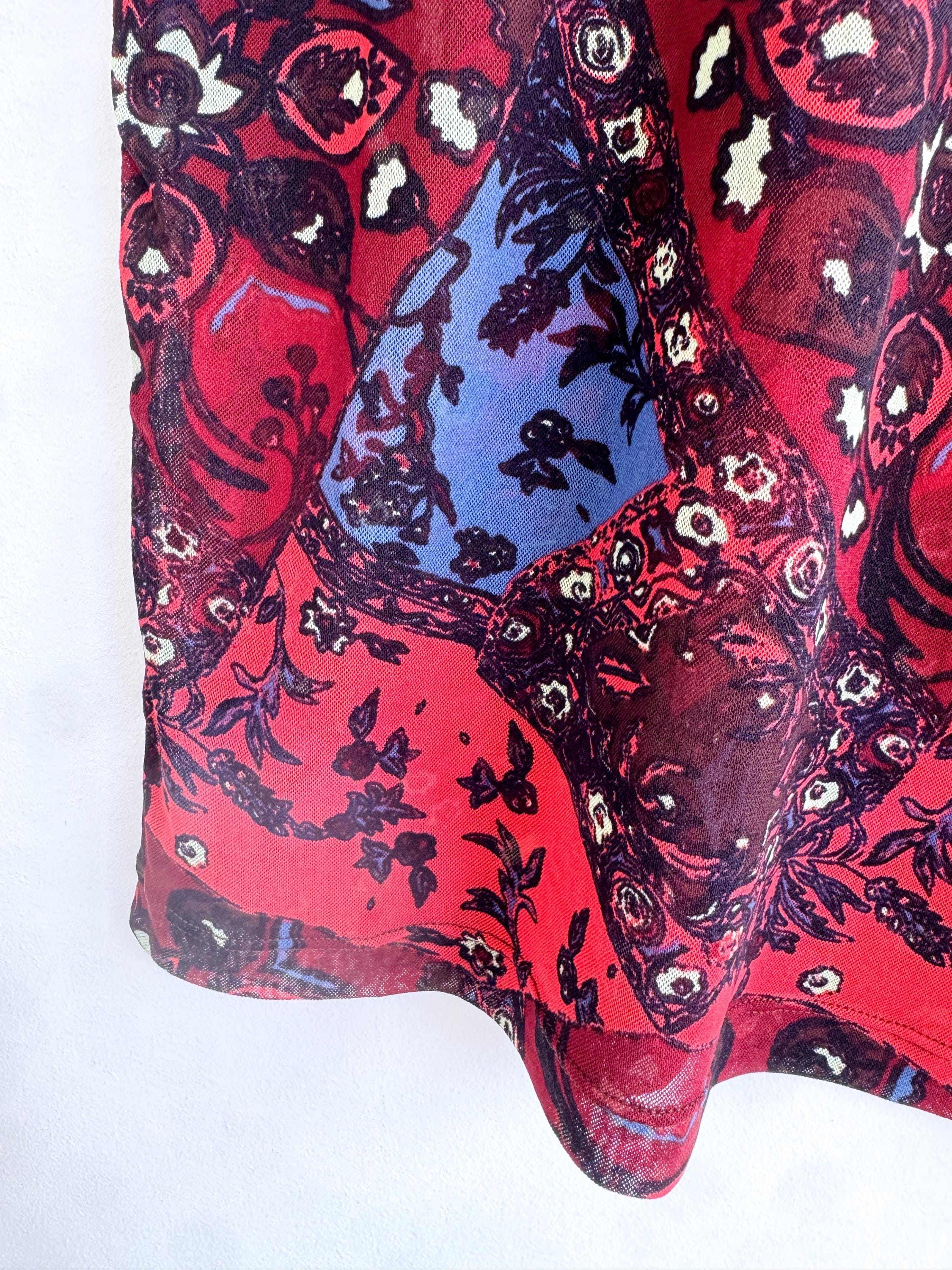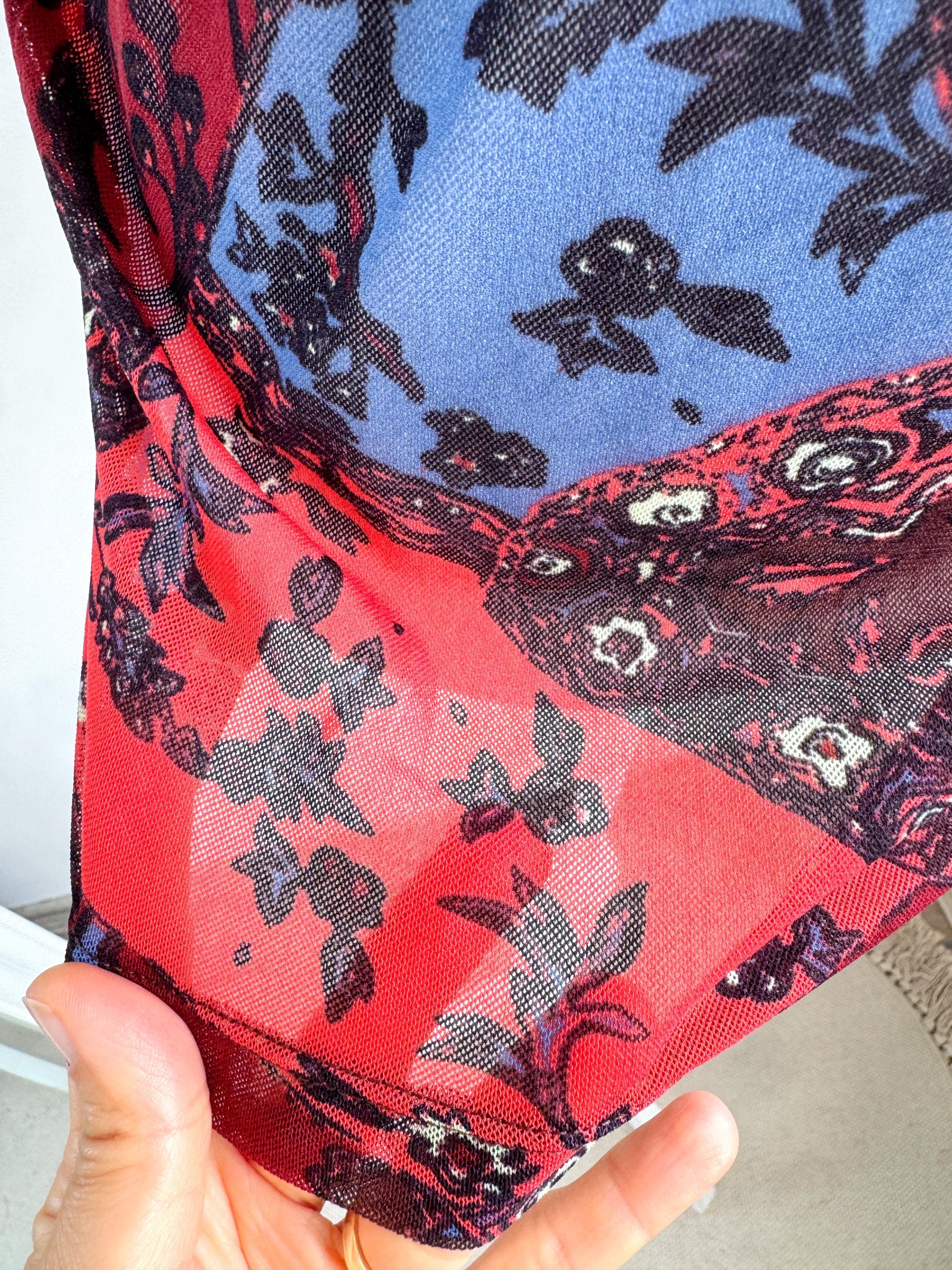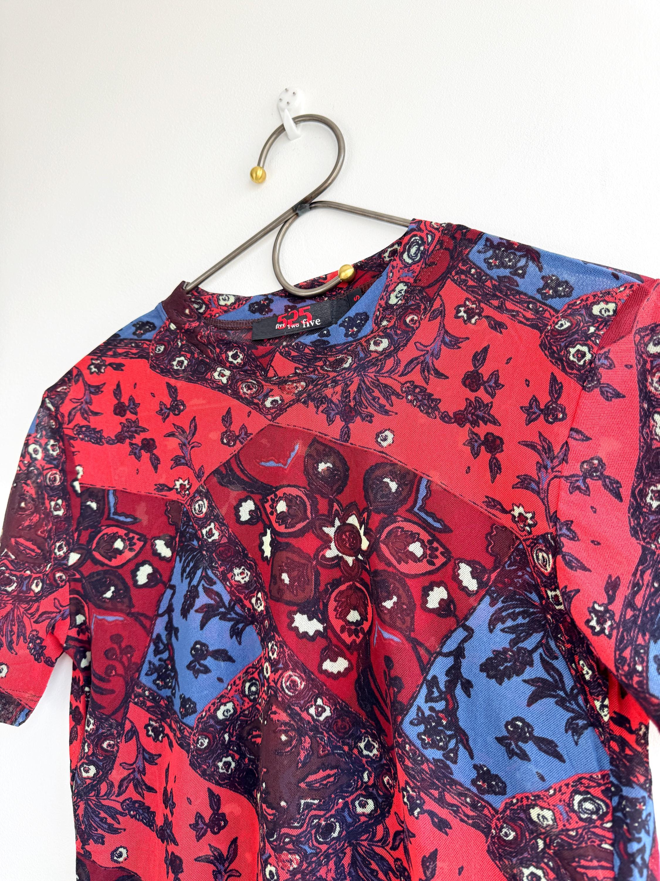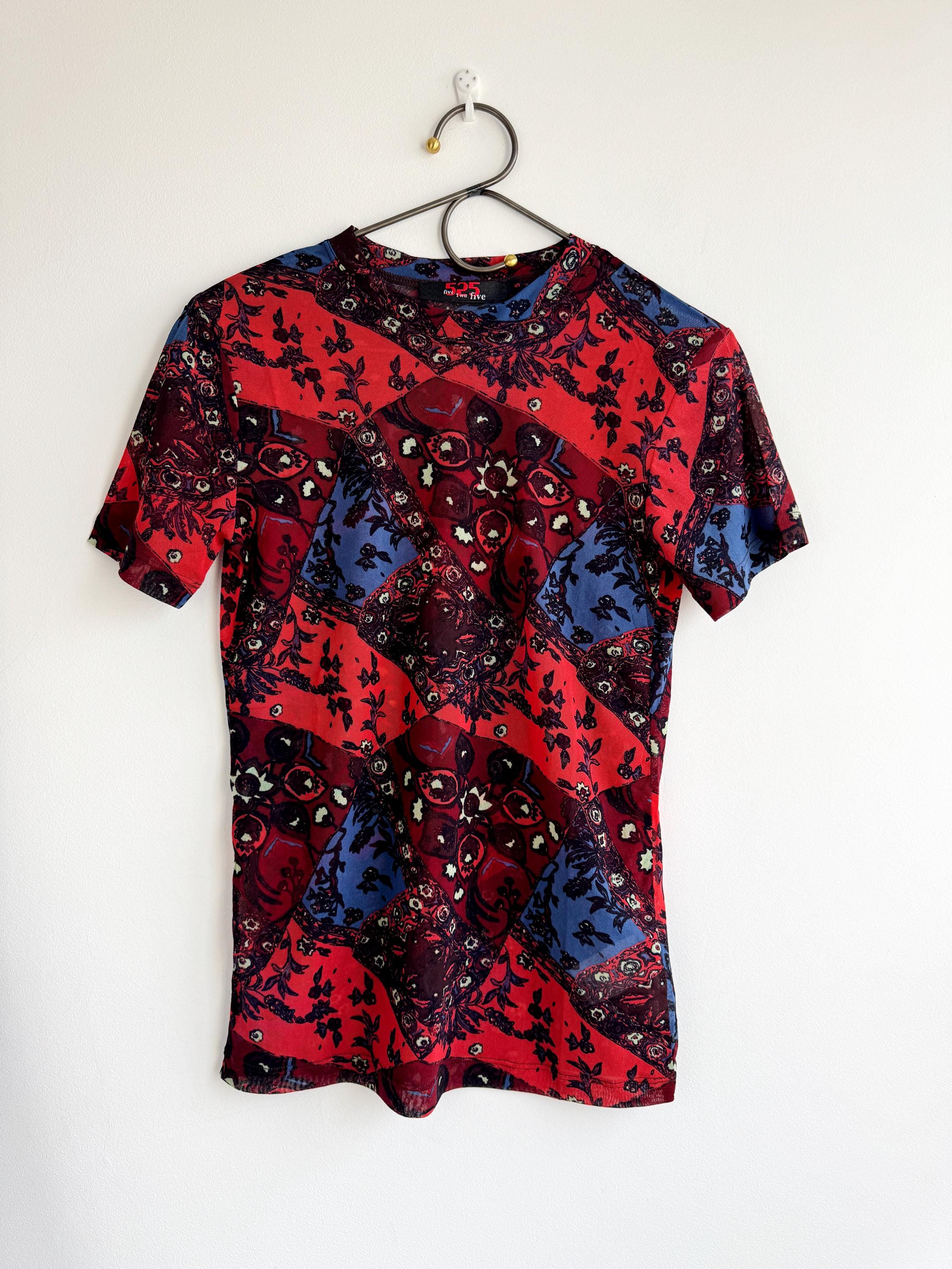 Step into effortless Y2K style with this eye-catching vintage mesh top by 525 Five Two Five. Featuring a bold red patchwork-inspired print with intricate floral and scarf motifs, this semi-sheer top is perfect for layering or making a statement on its own. The lightweight stretch fabric hugs the body comfortably, giving you that flattering slim-fit silhouette that defined early 2000s fashion.