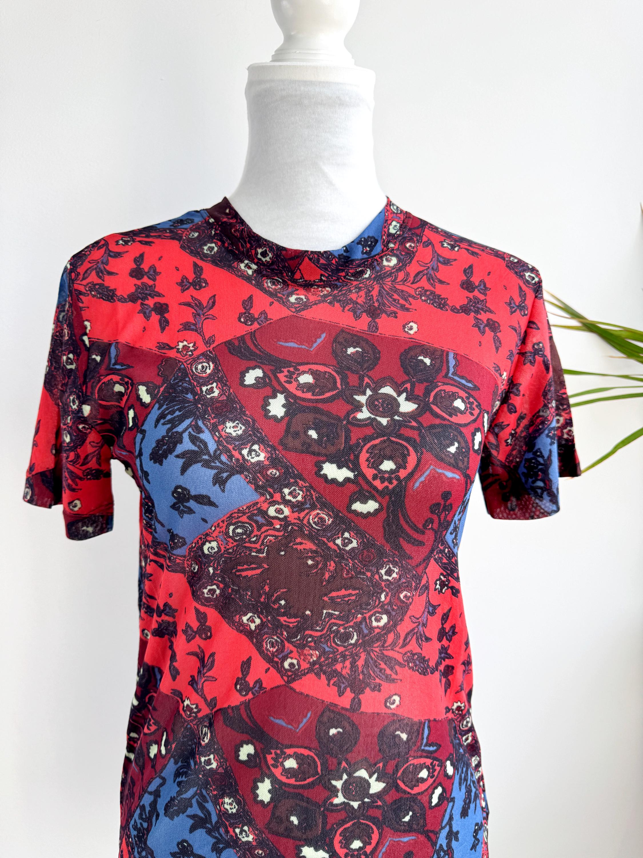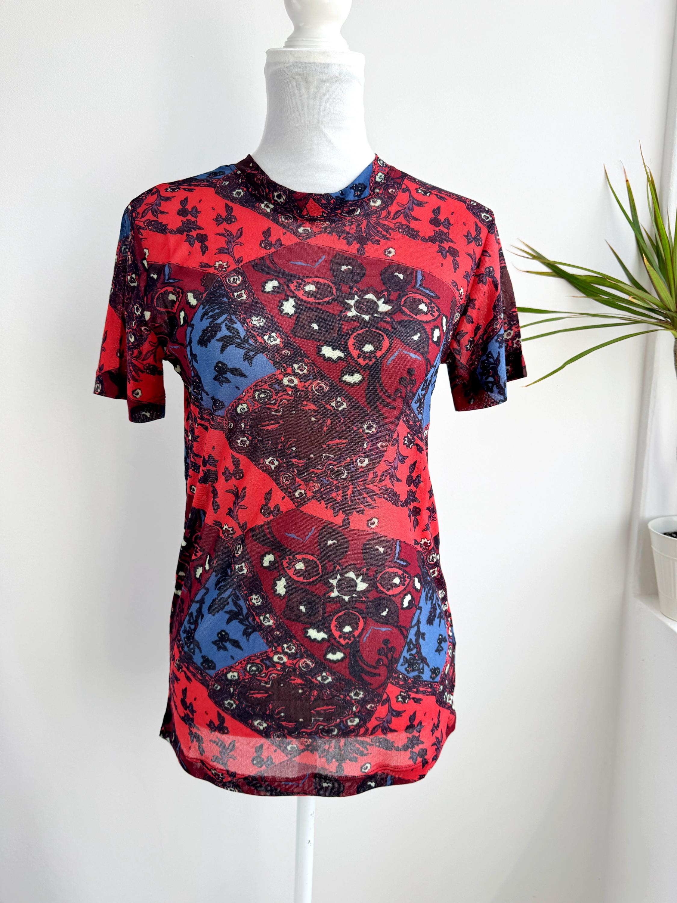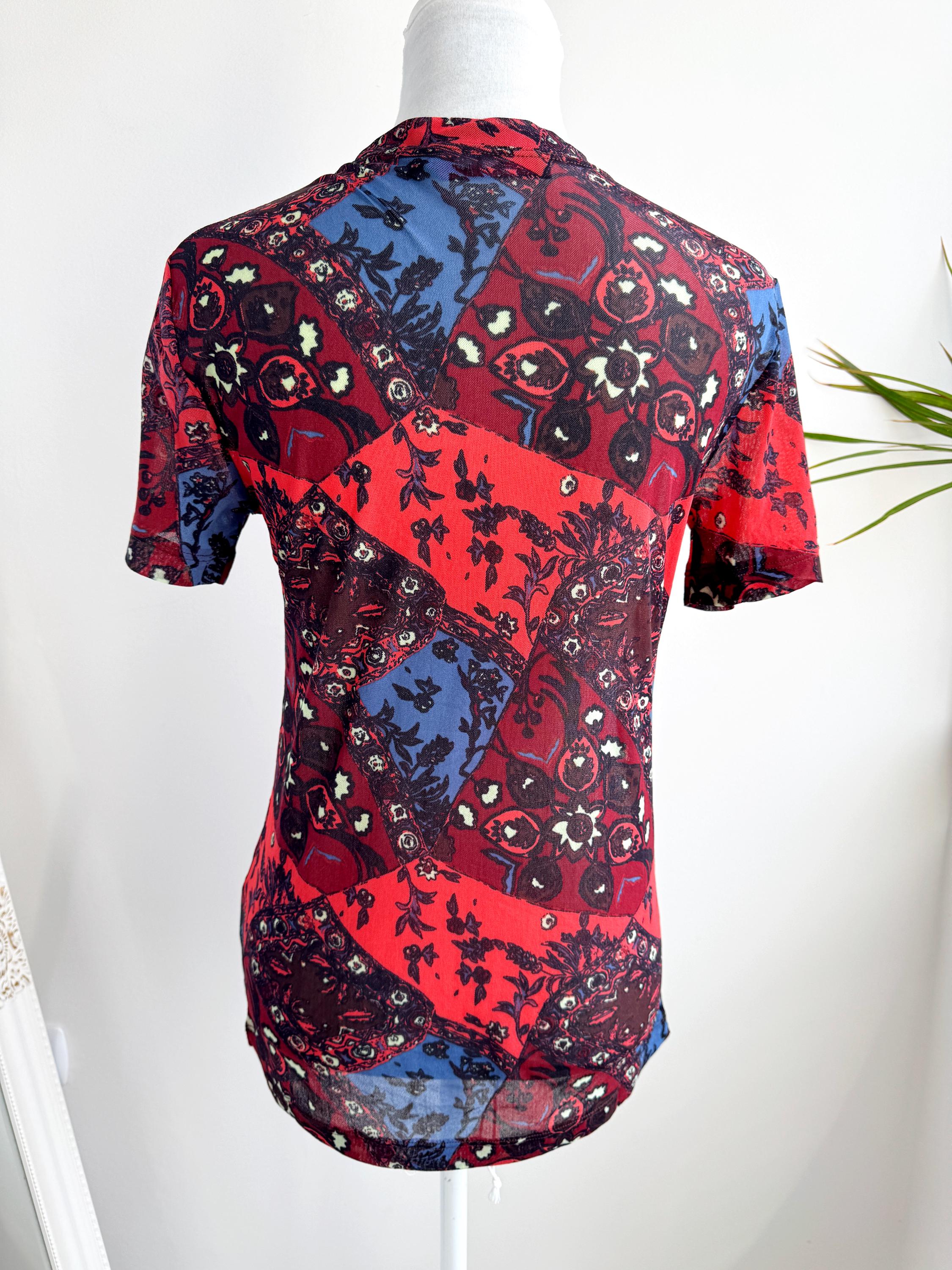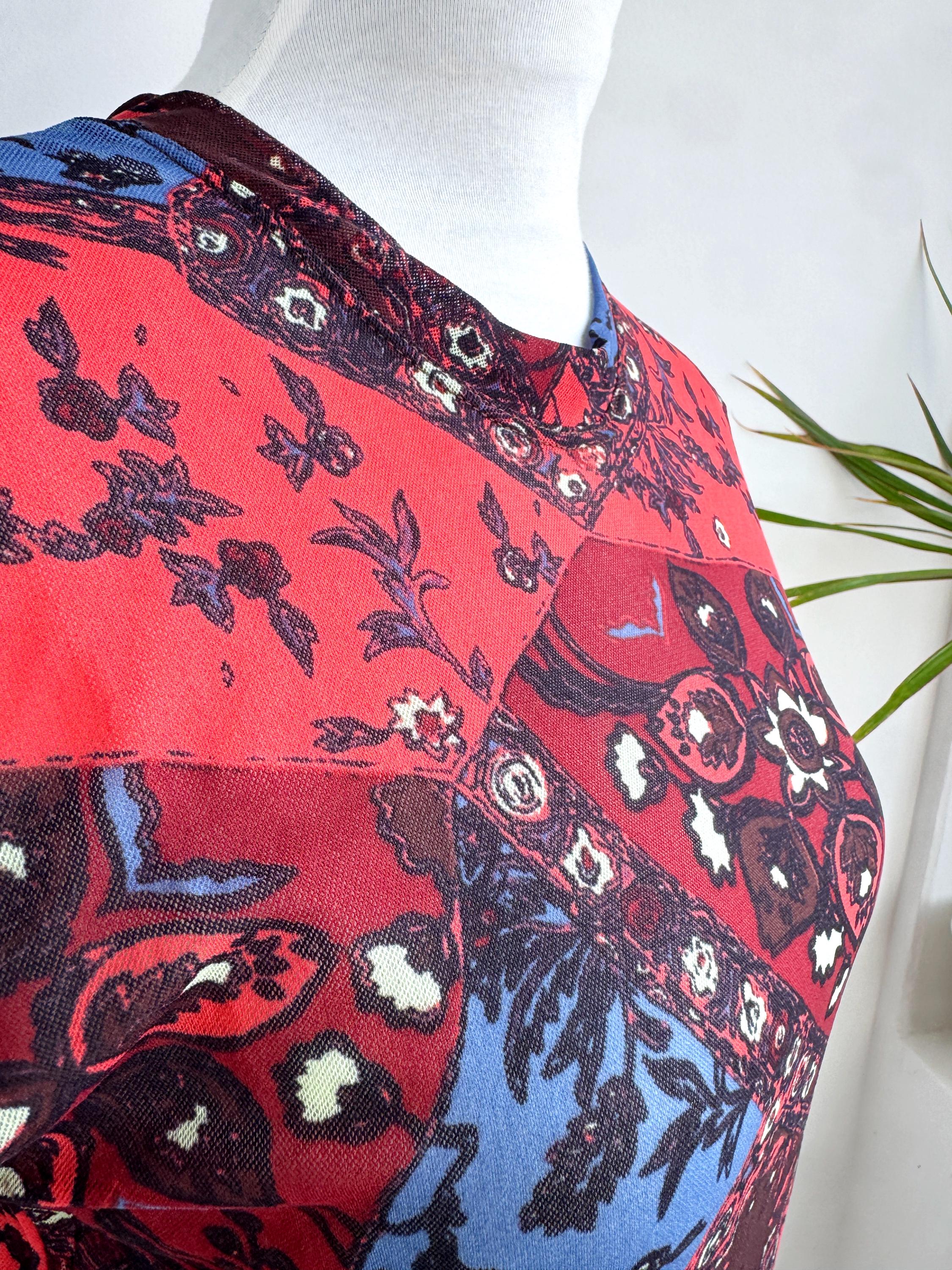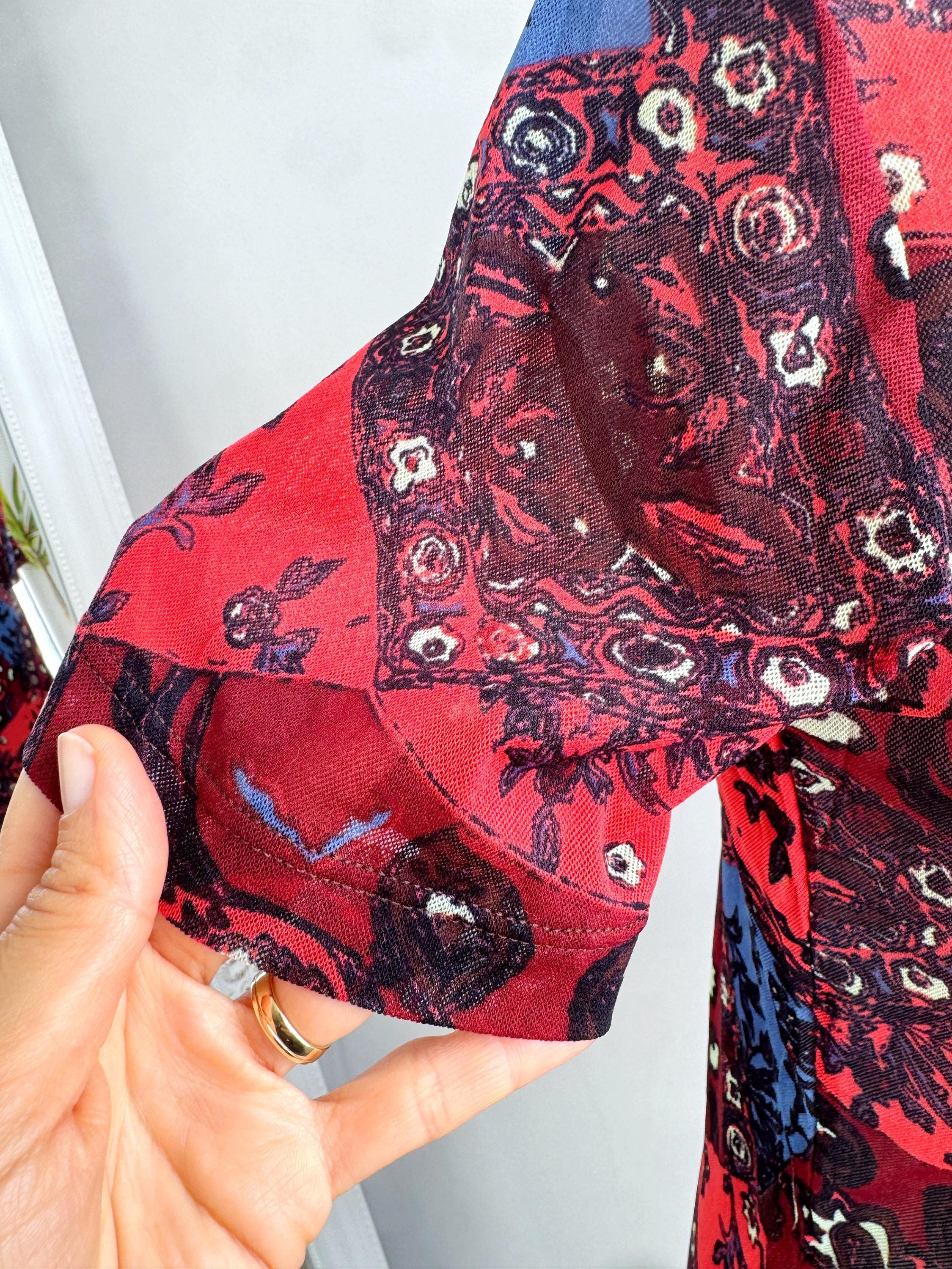 Step into effortless Y2K style with this eye-catching vintage mesh top by 525 Five Two Five. Featuring a bold red patchwork-inspired print with intricate floral and scarf motifs, this semi-sheer top is perfect for layering or making a statement on its own. The lightweight stretch fabric hugs the body comfortably, giving you that flattering slim-fit silhouette that defined early 2000s fashion.