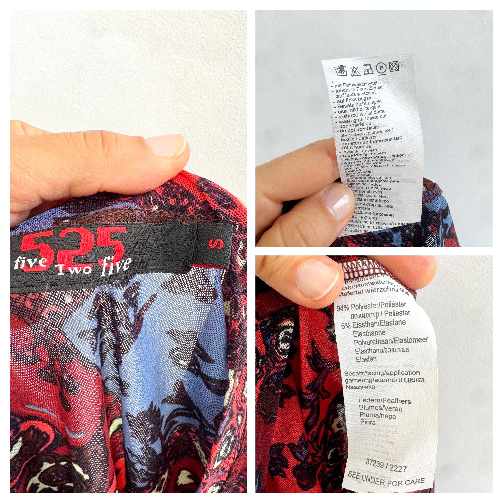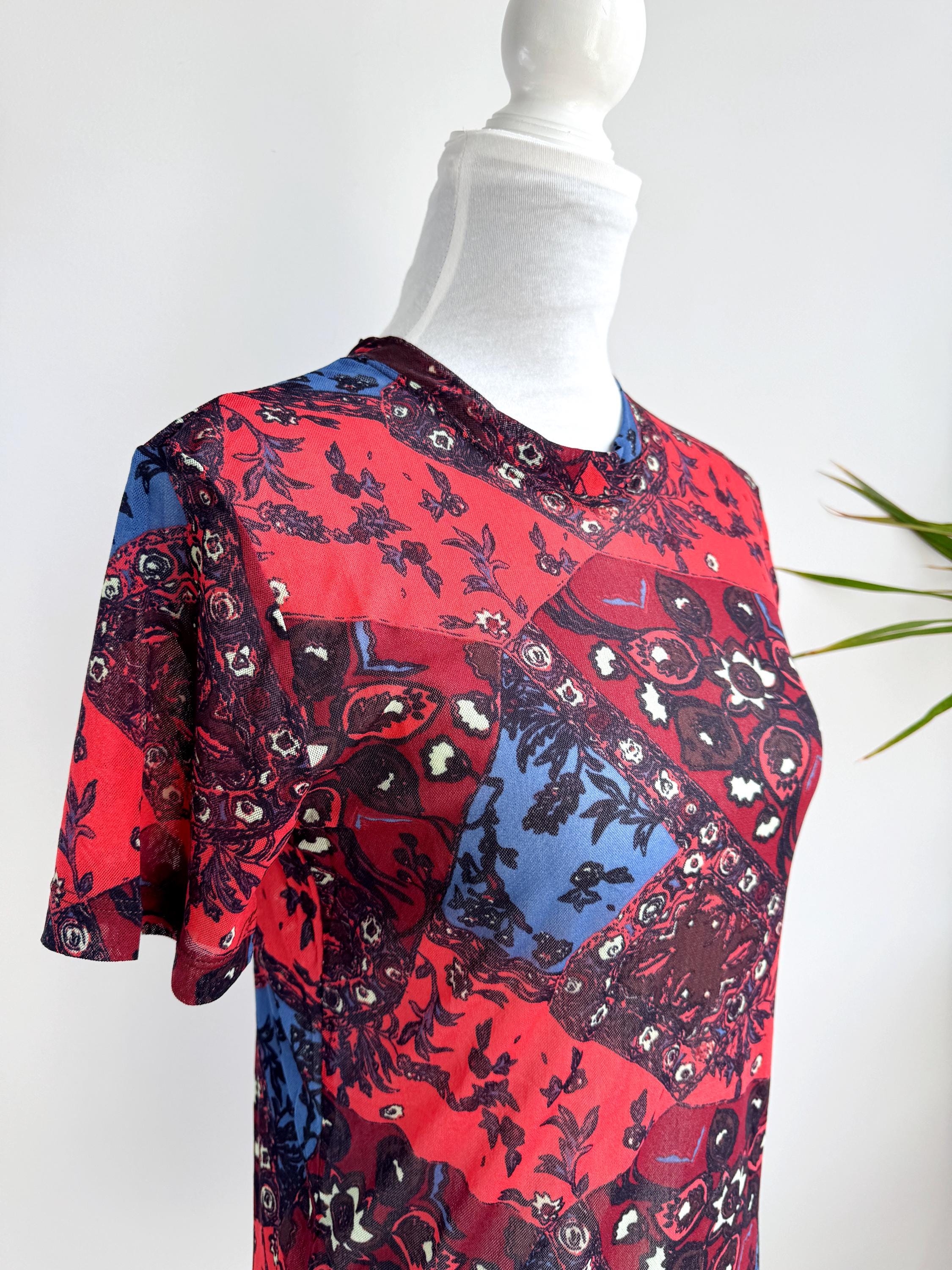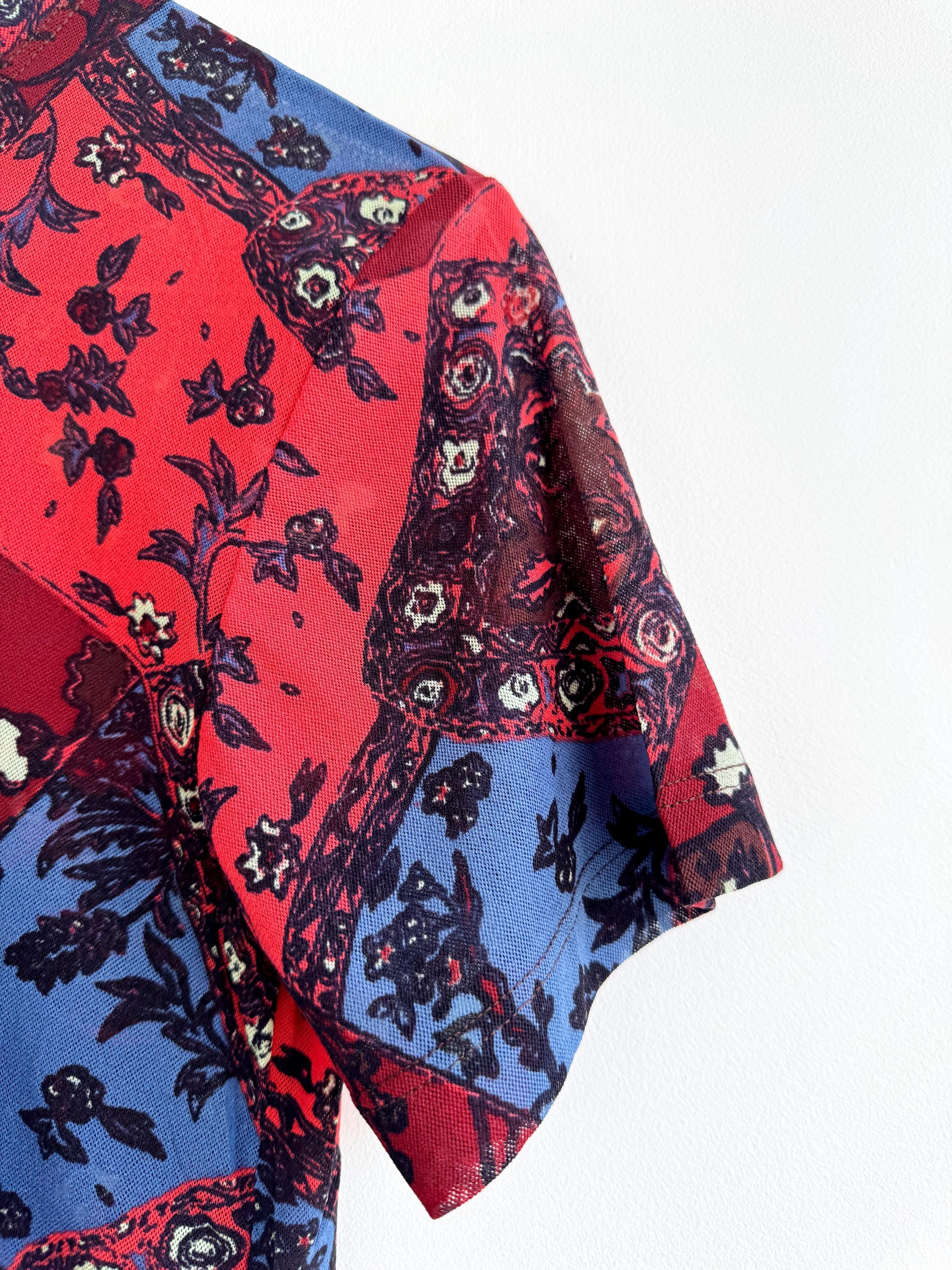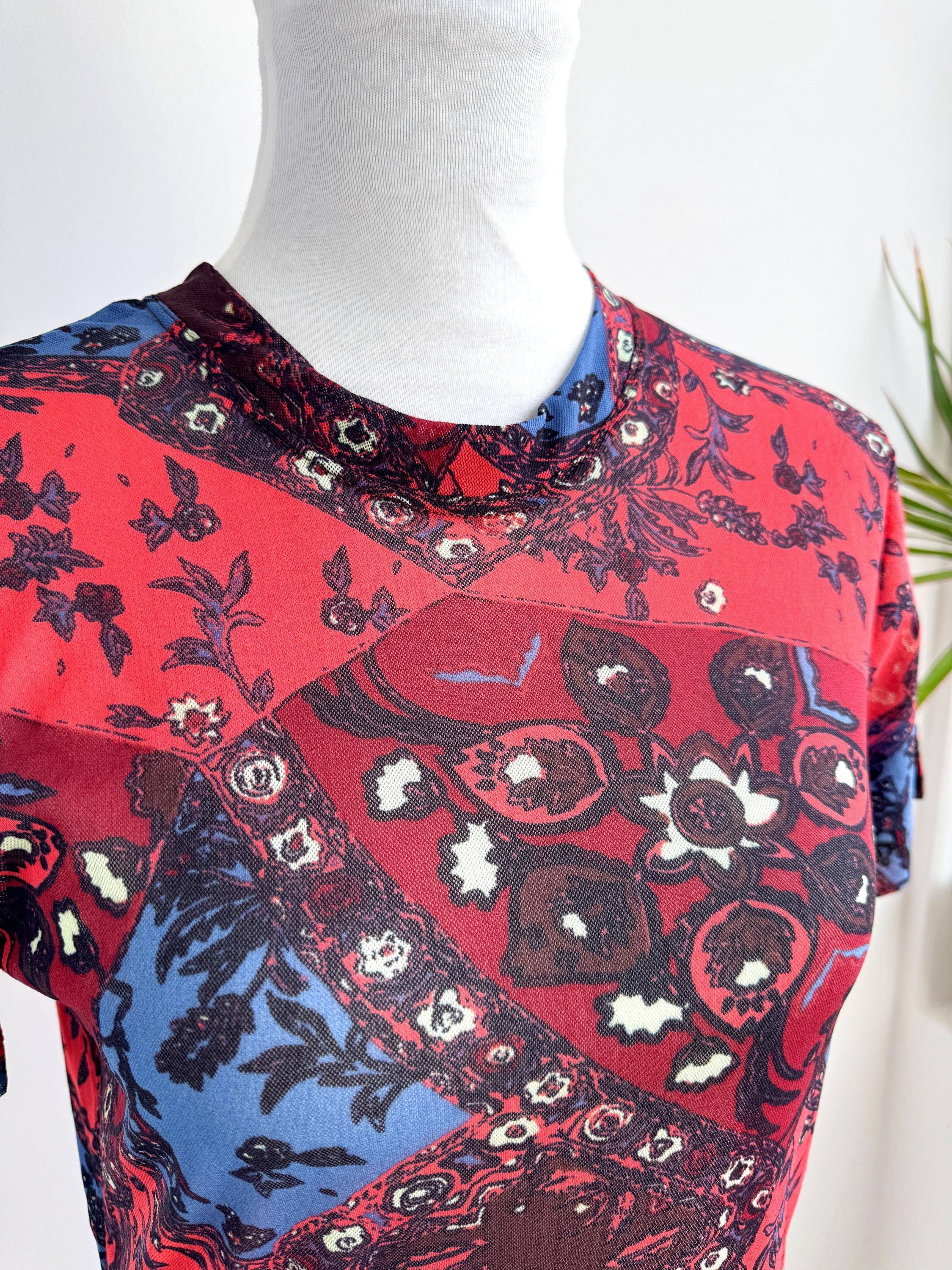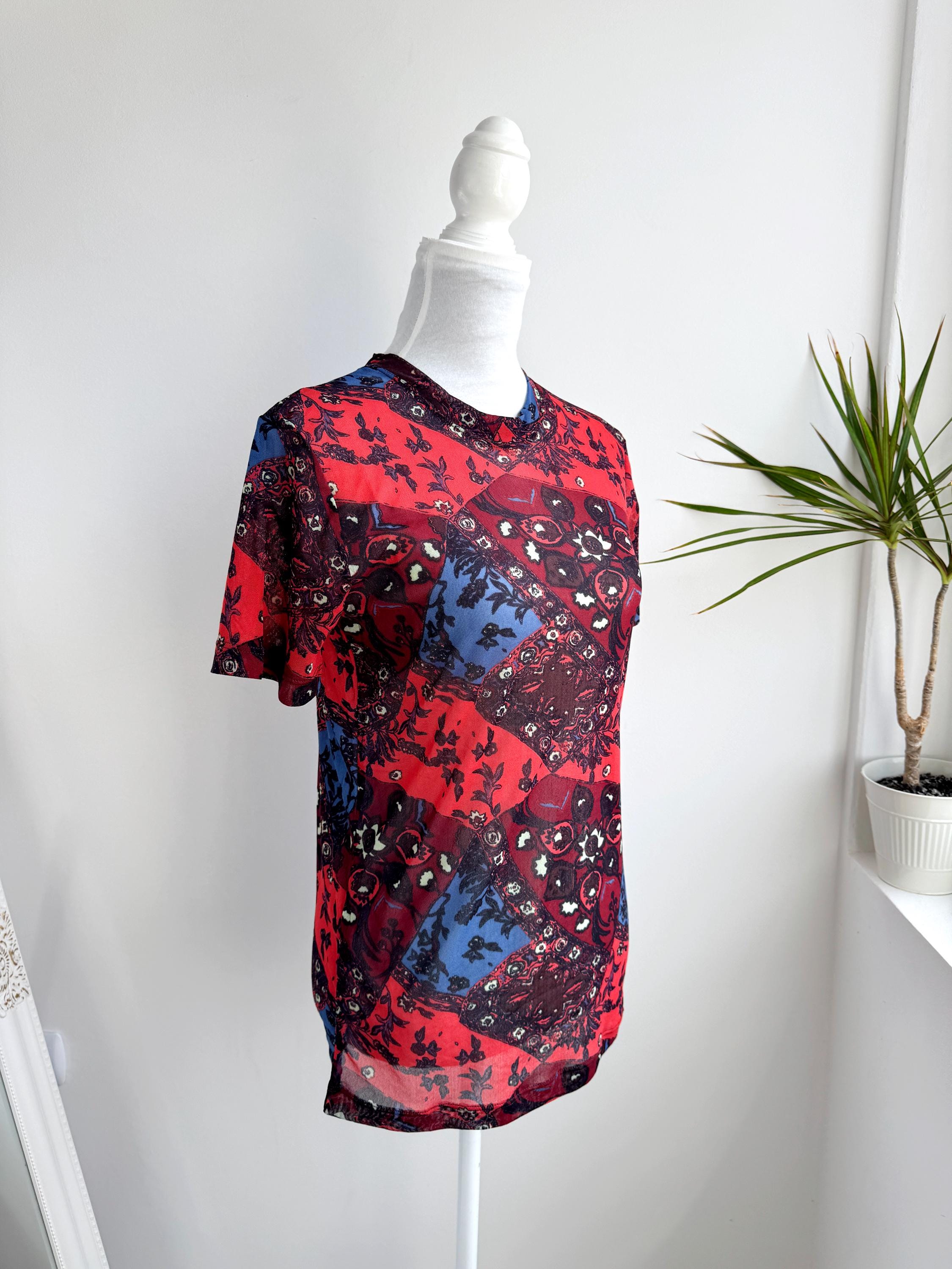 Step into effortless Y2K style with this eye-catching vintage mesh top by 525 Five Two Five. Featuring a bold red patchwork-inspired print with intricate floral and scarf motifs, this semi-sheer top is perfect for layering or making a statement on its own. The lightweight stretch fabric hugs the body comfortably, giving you that flattering slim-fit silhouette that defined early 2000s fashion.
